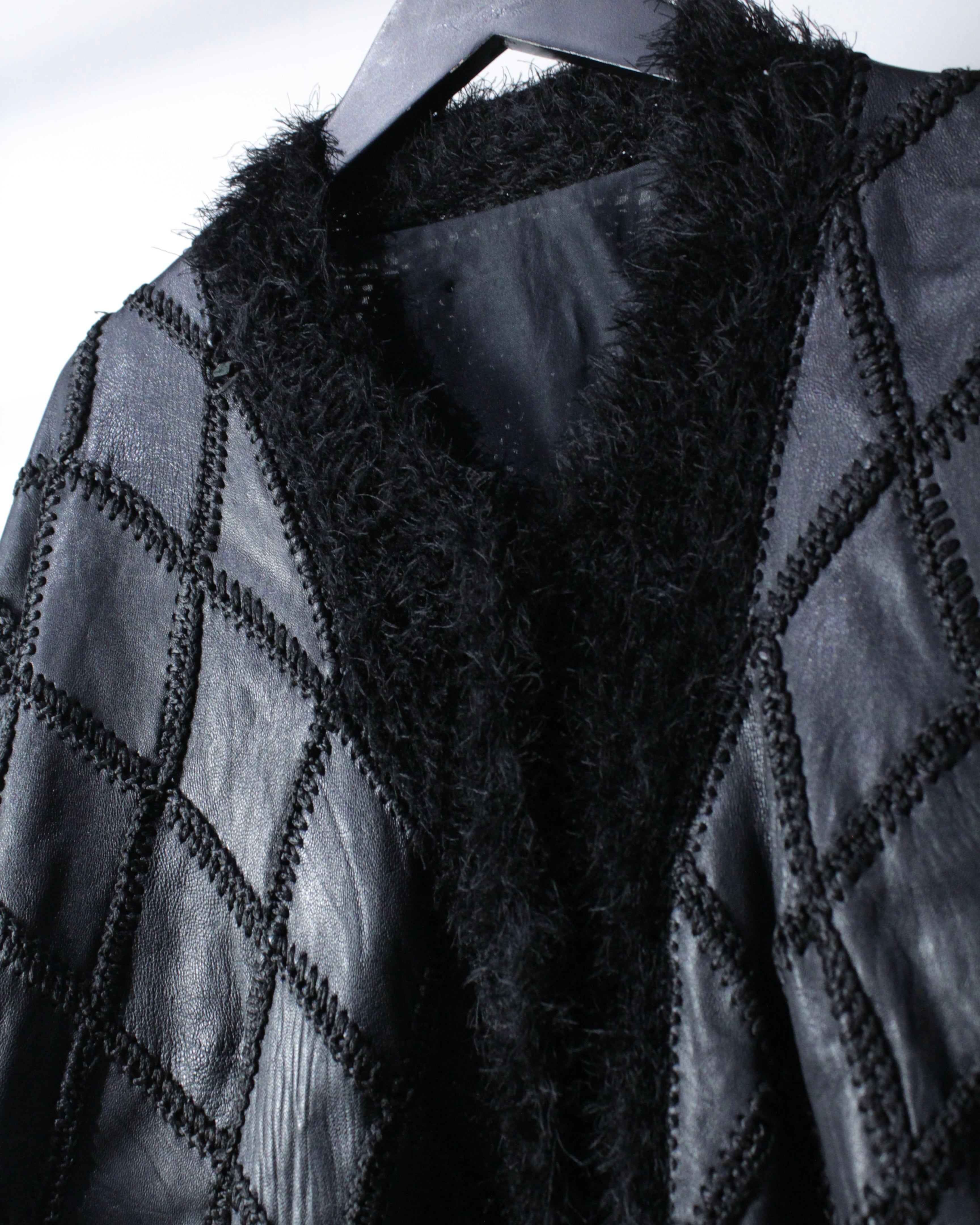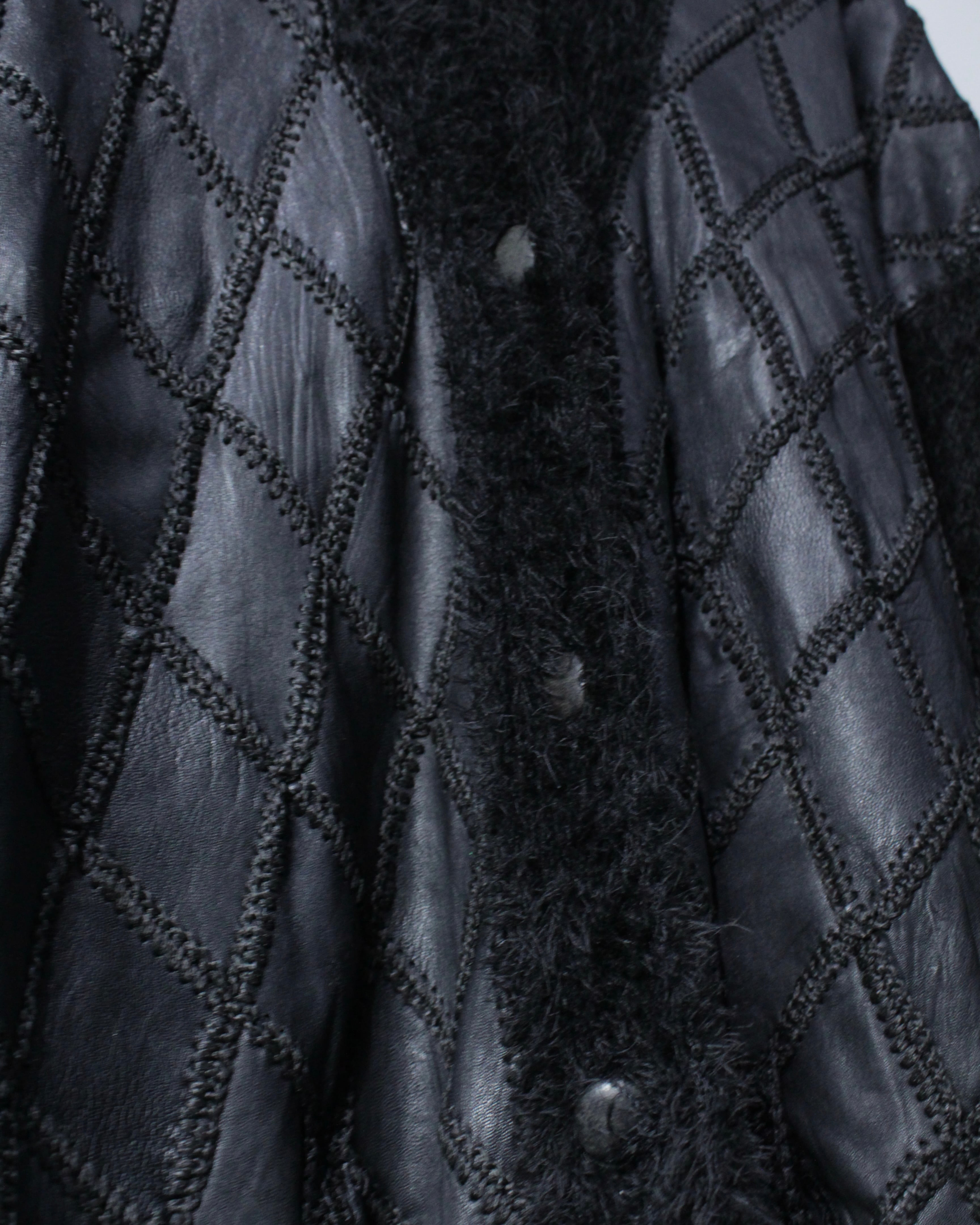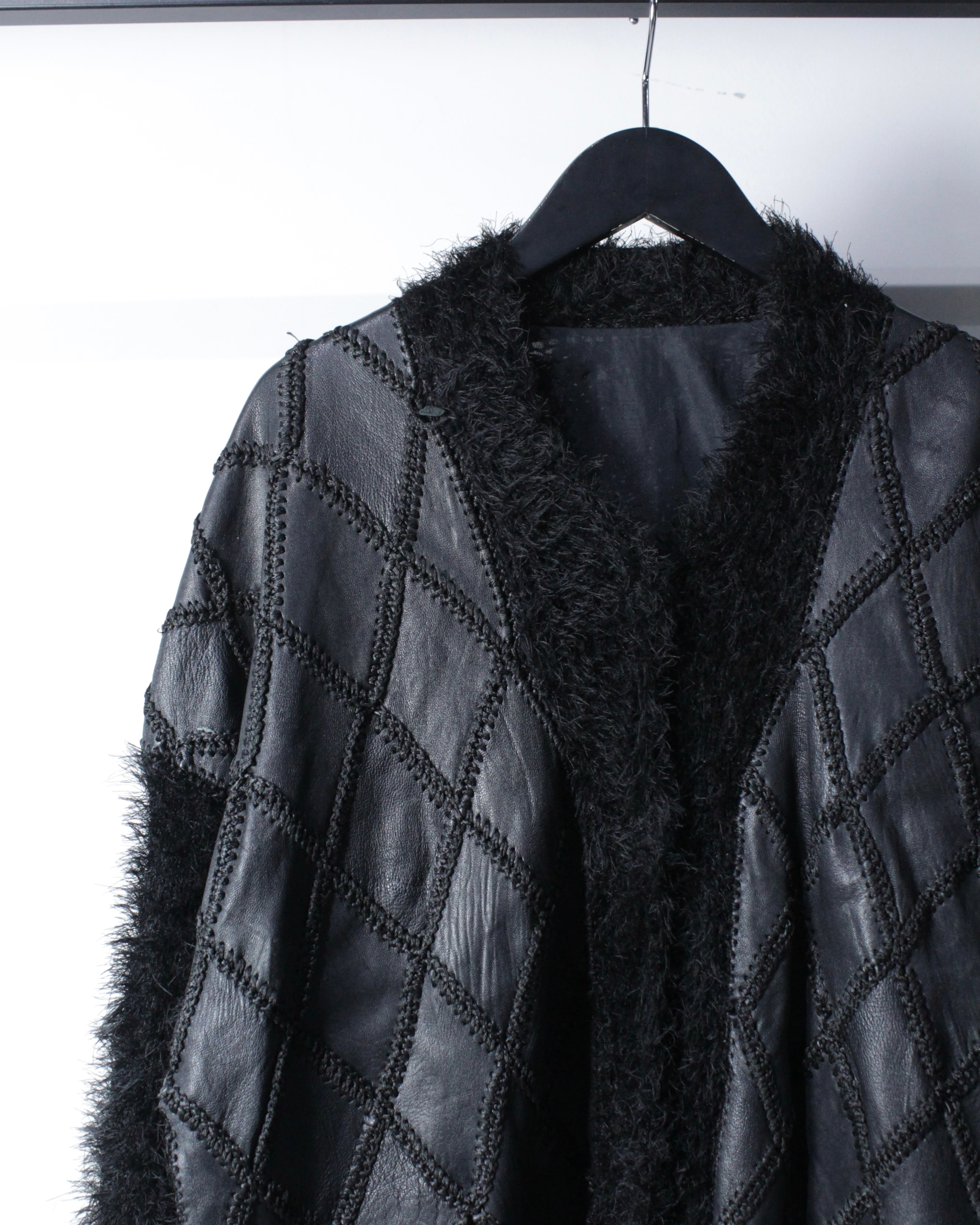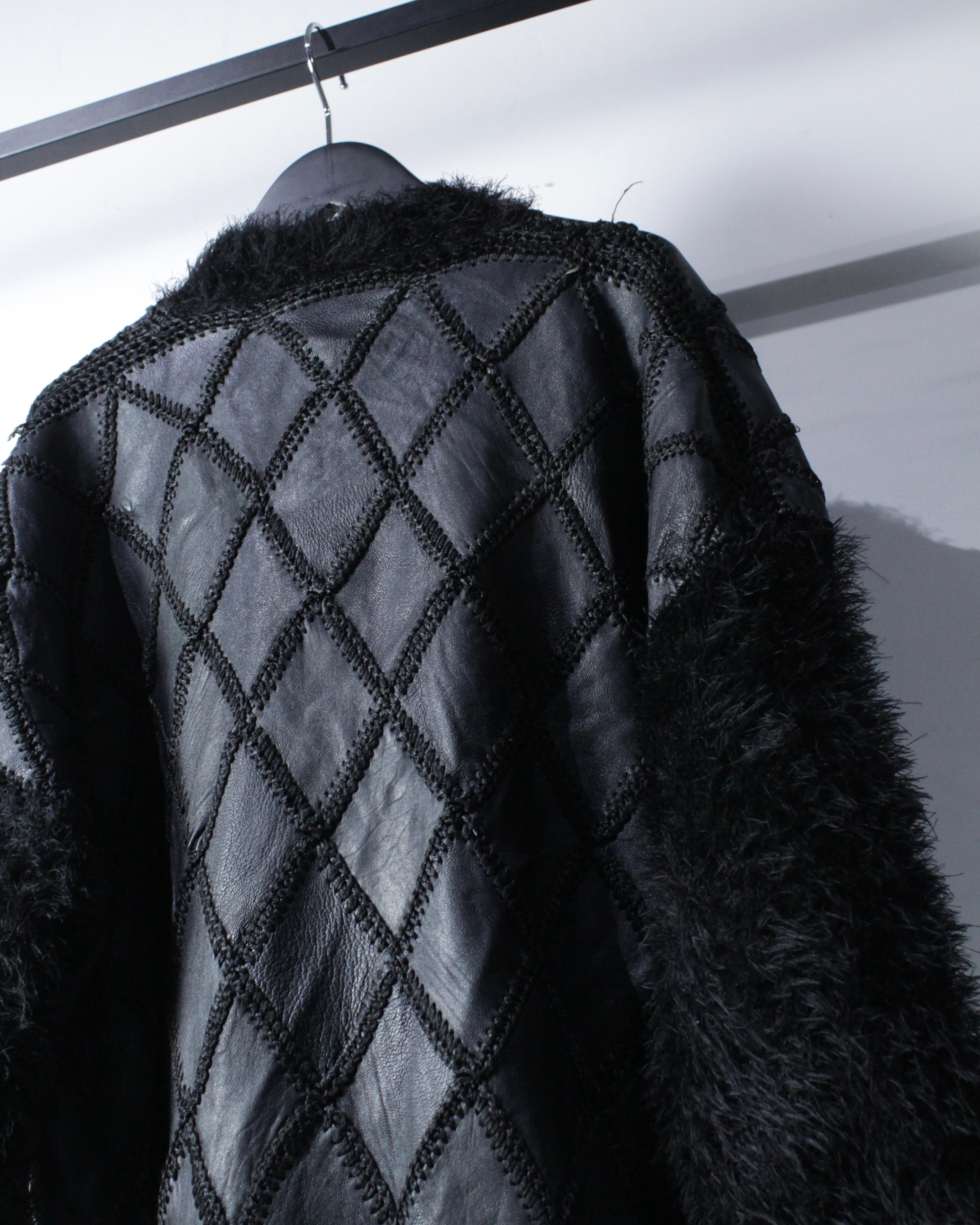 対して袖やフロント縁、裾には毛足の長いシャギーニットを用いており、レザーの滑らかさとふわりとした起毛感とのコントラストが秀逸で、素材同士の対比がそのままデザインへと昇華されています。