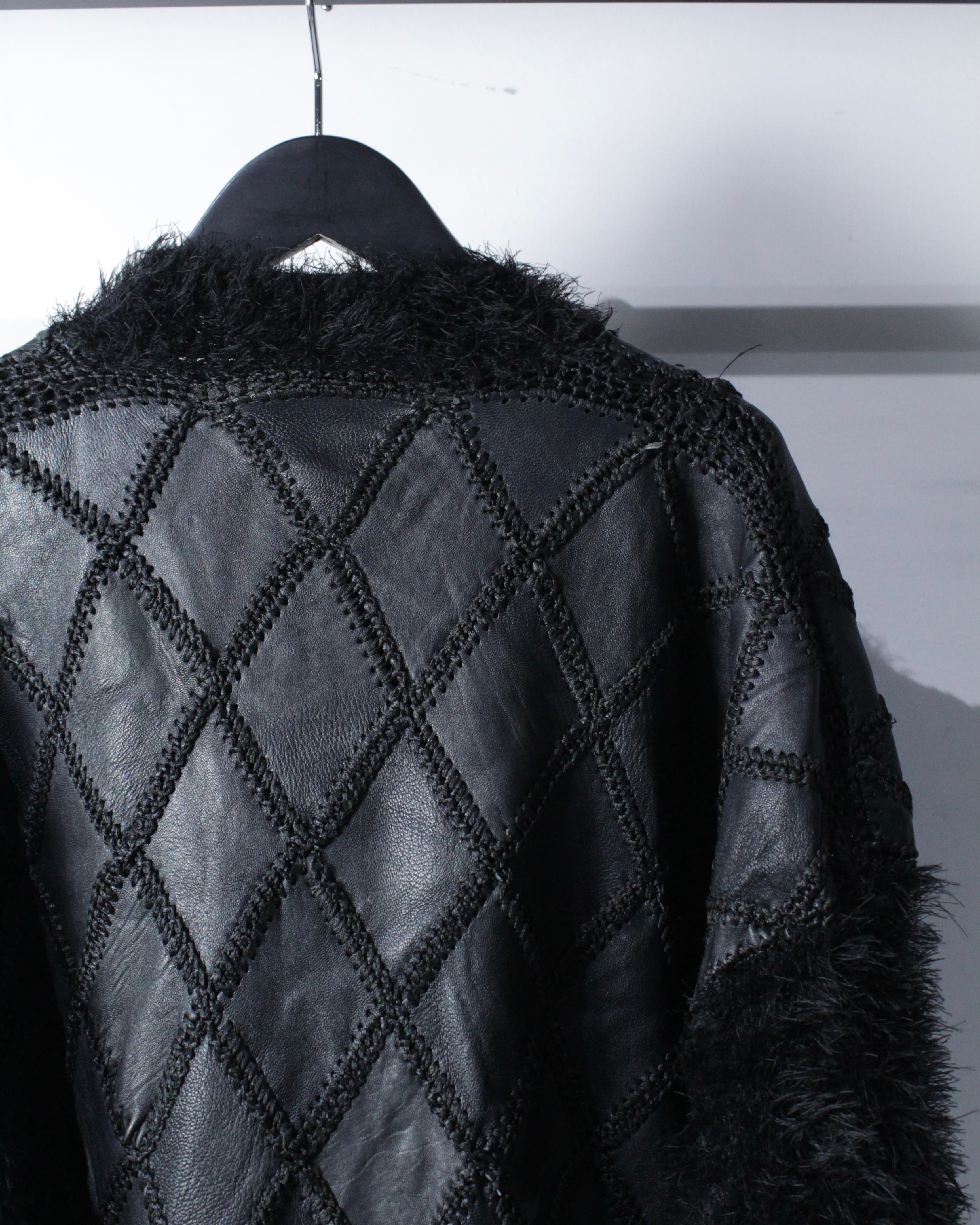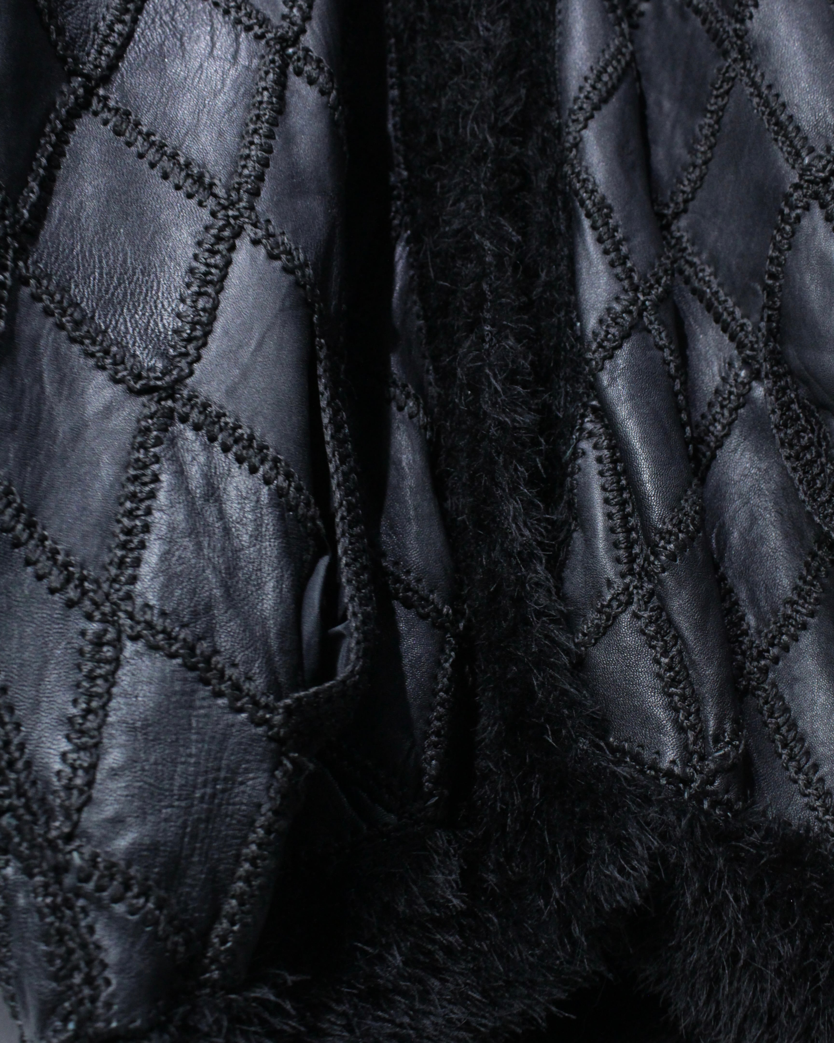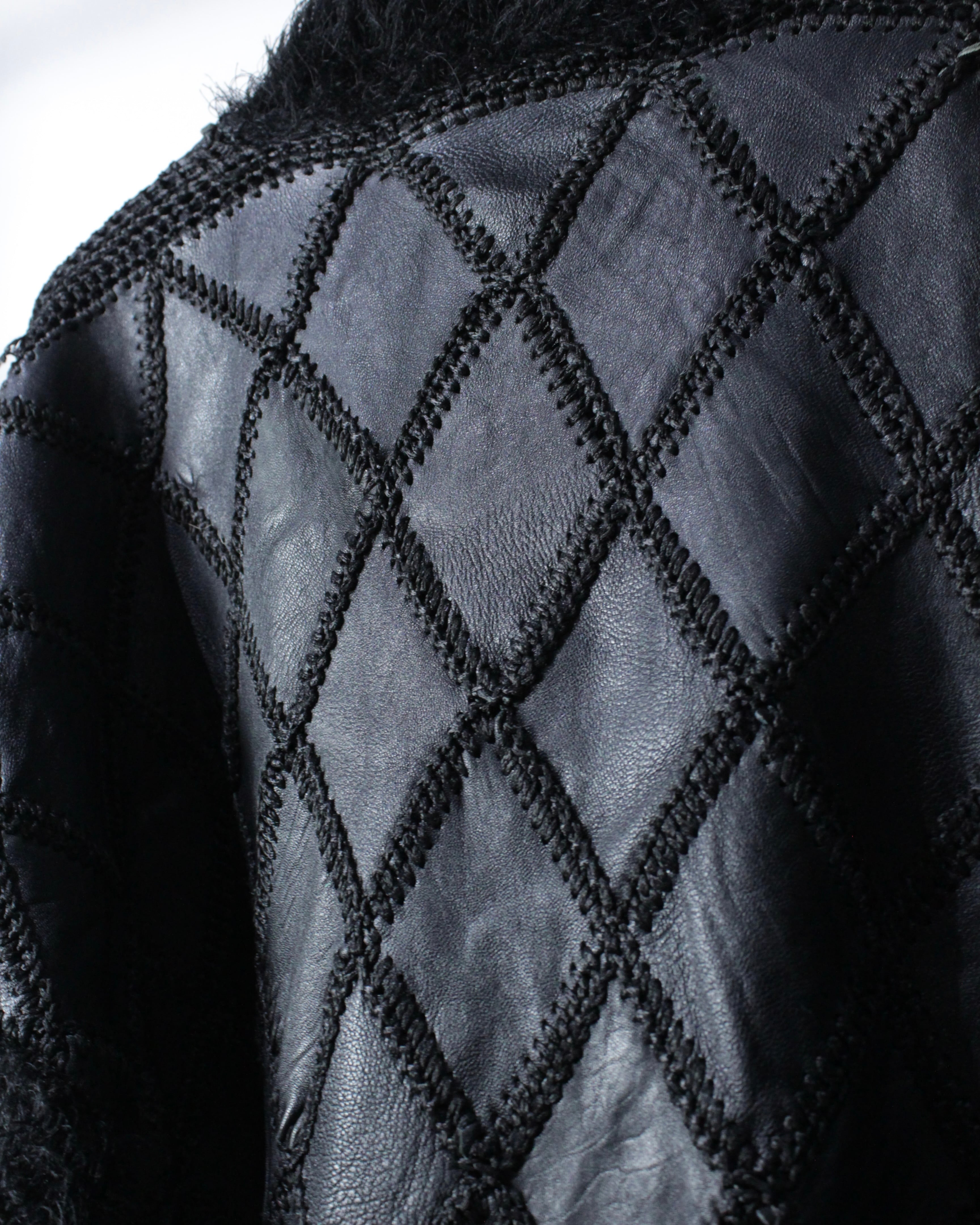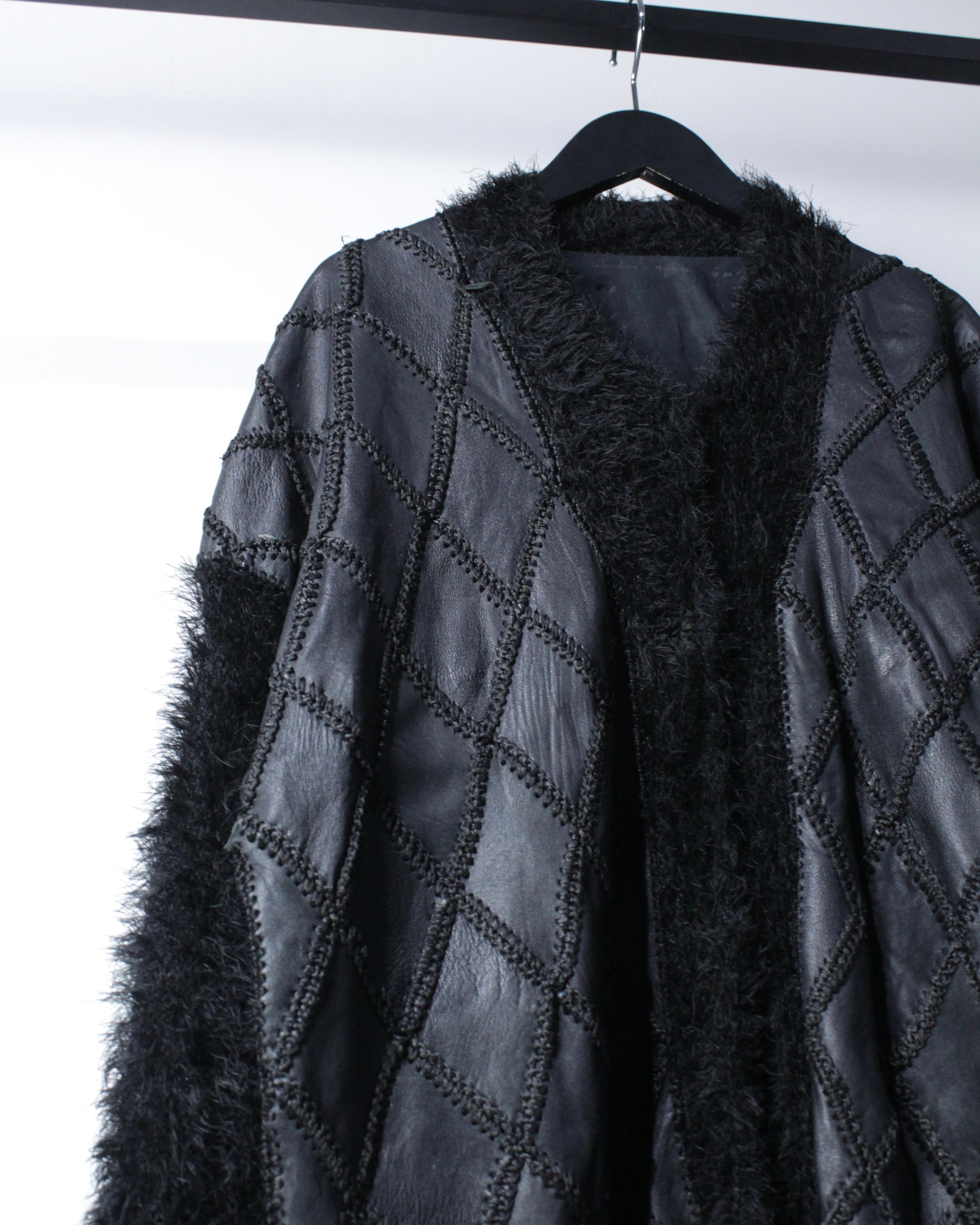 対して袖やフロント縁、裾には毛足の長いシャギーニットを用いており、レザーの滑らかさとふわりとした起毛感とのコントラストが秀逸で、素材同士の対比がそのままデザインへと昇華されています。