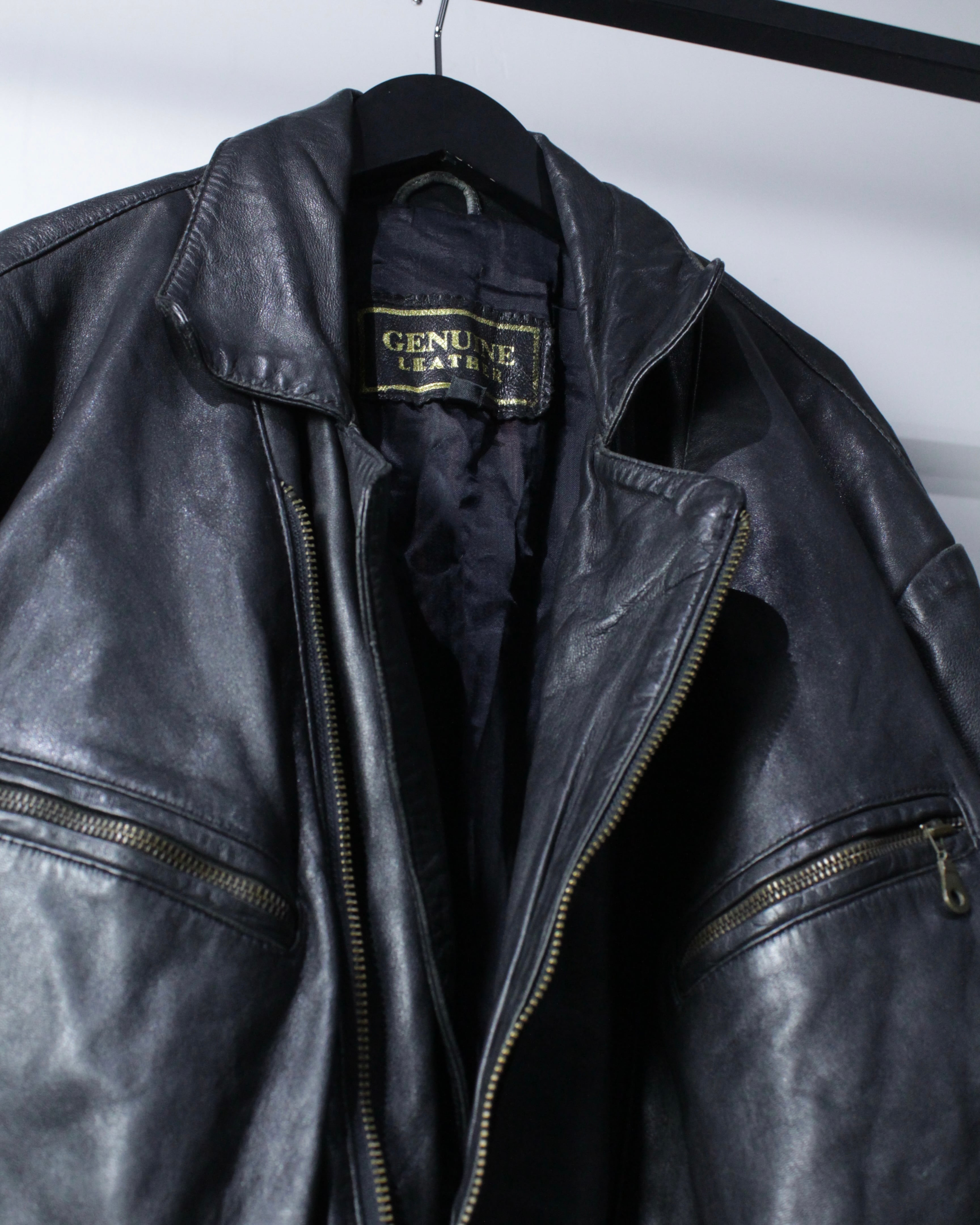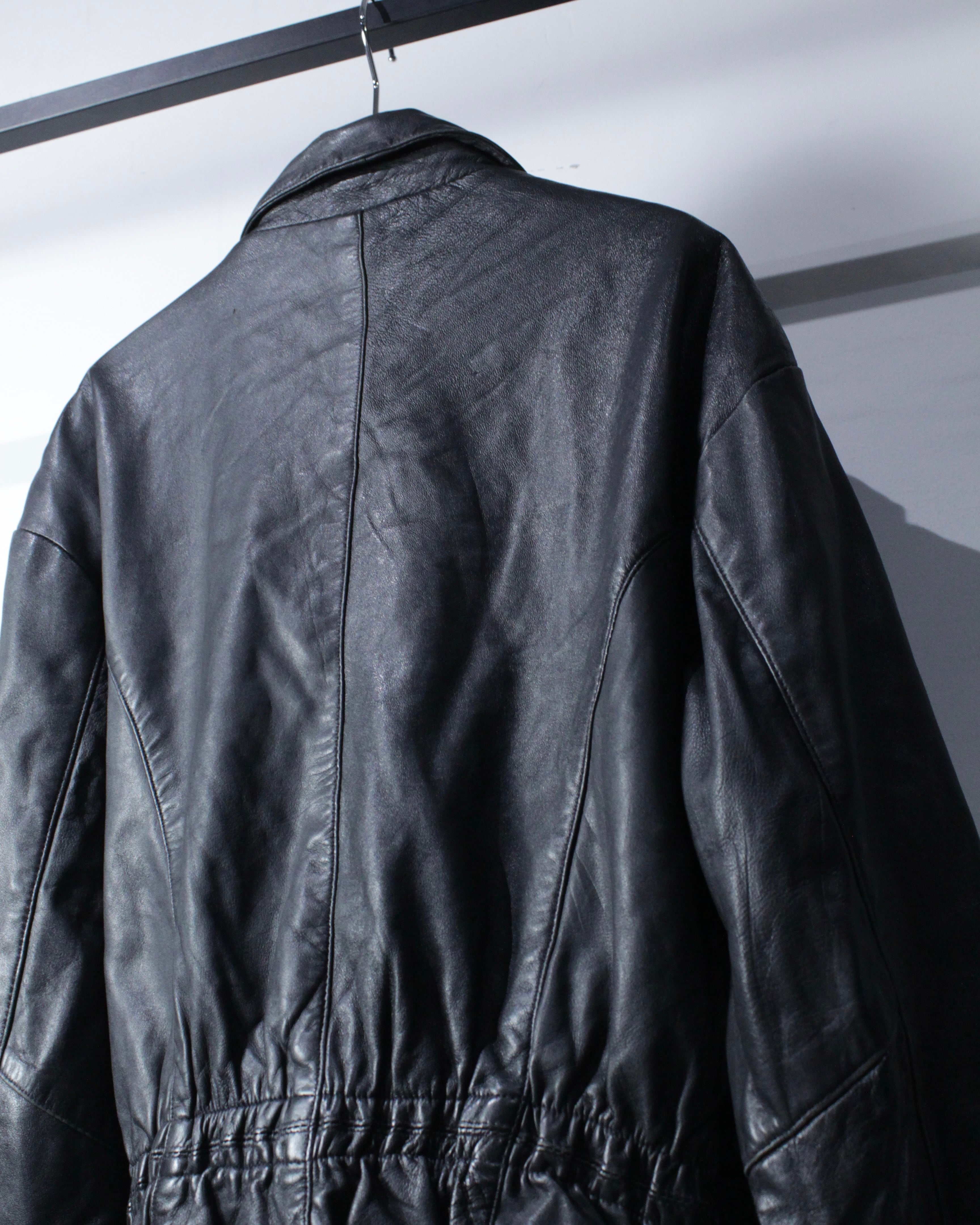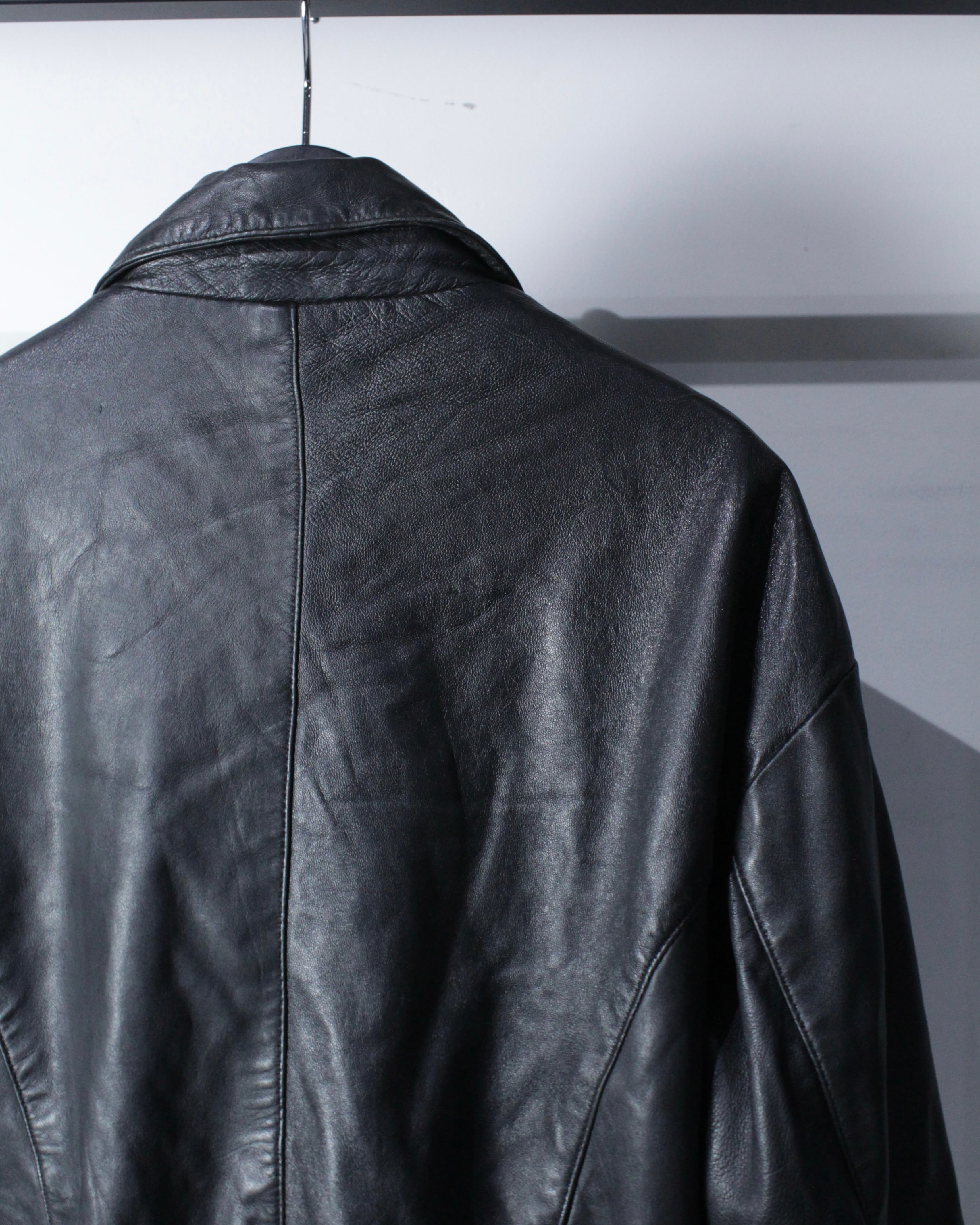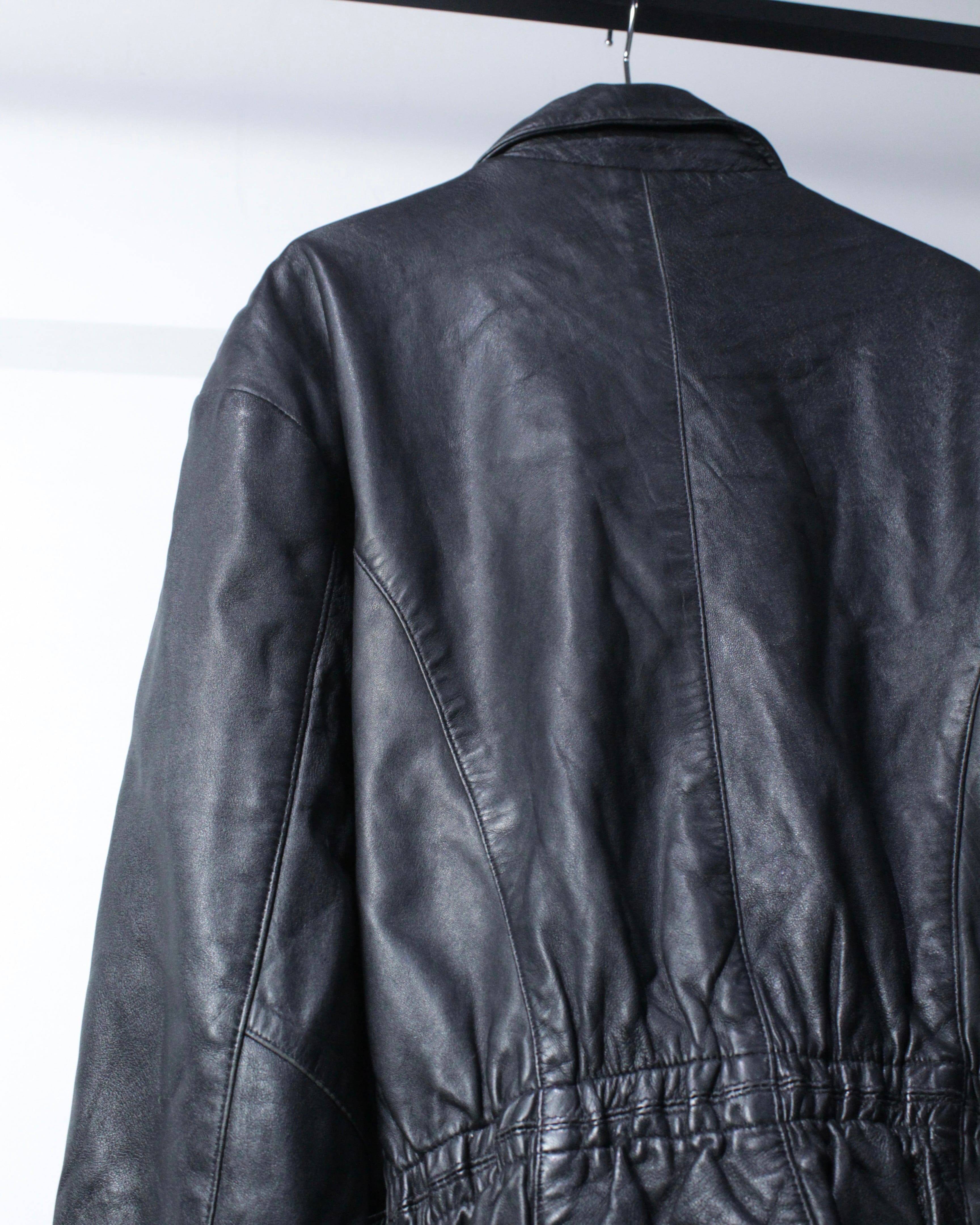 上質なリアルレザーを贅沢に使用し、鈍い艶を帯びたブラックの質感が圧倒的な存在感を放つ1着。