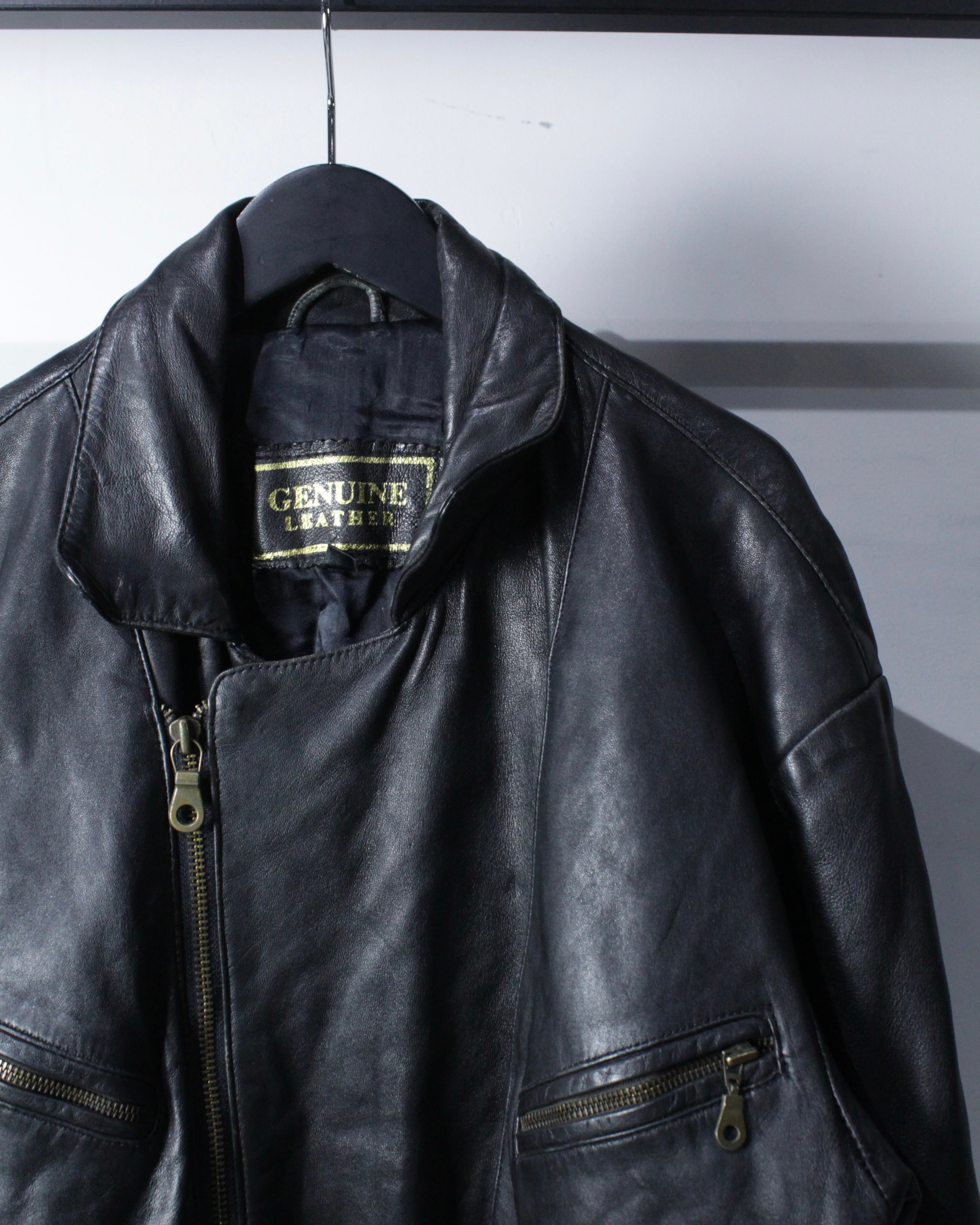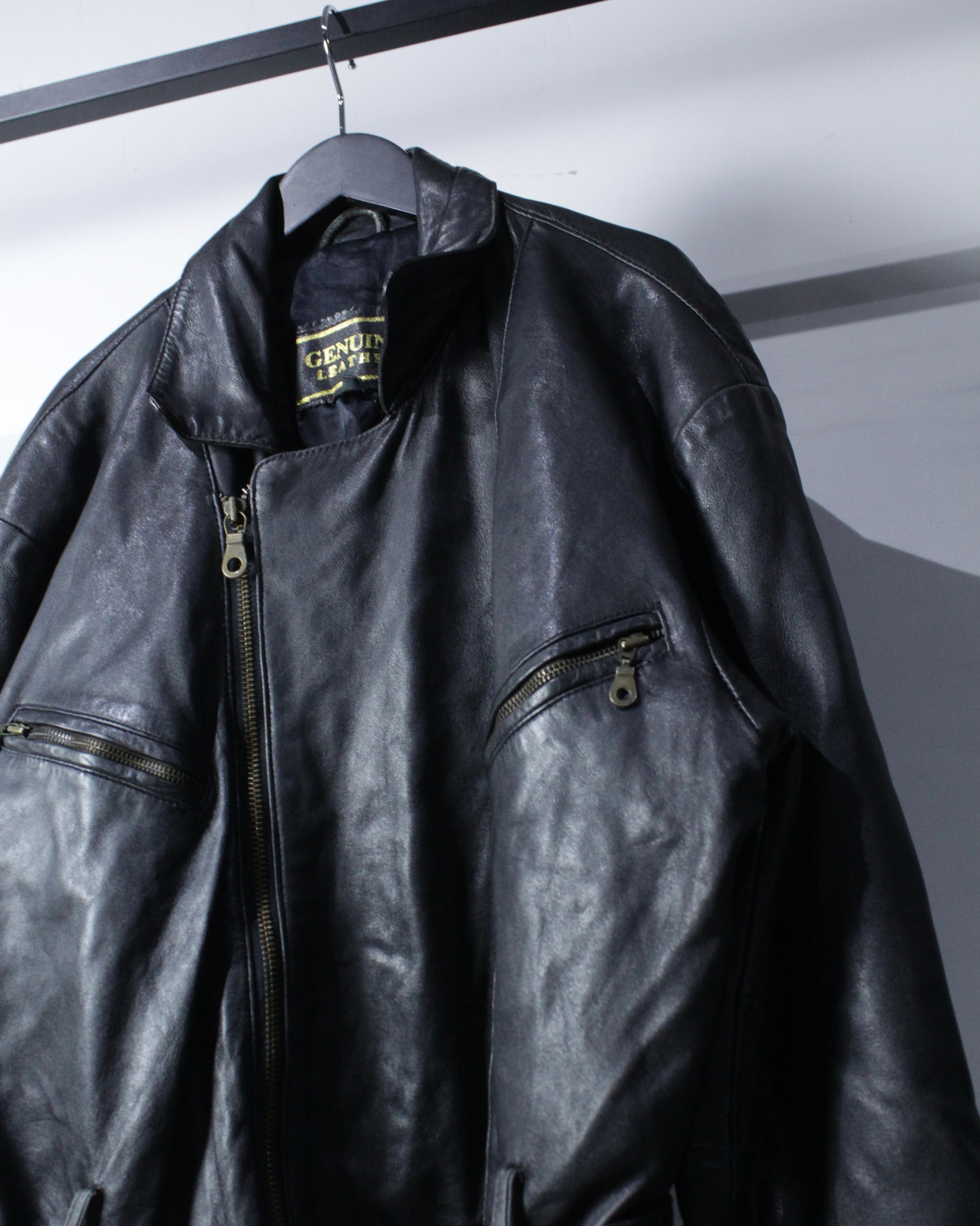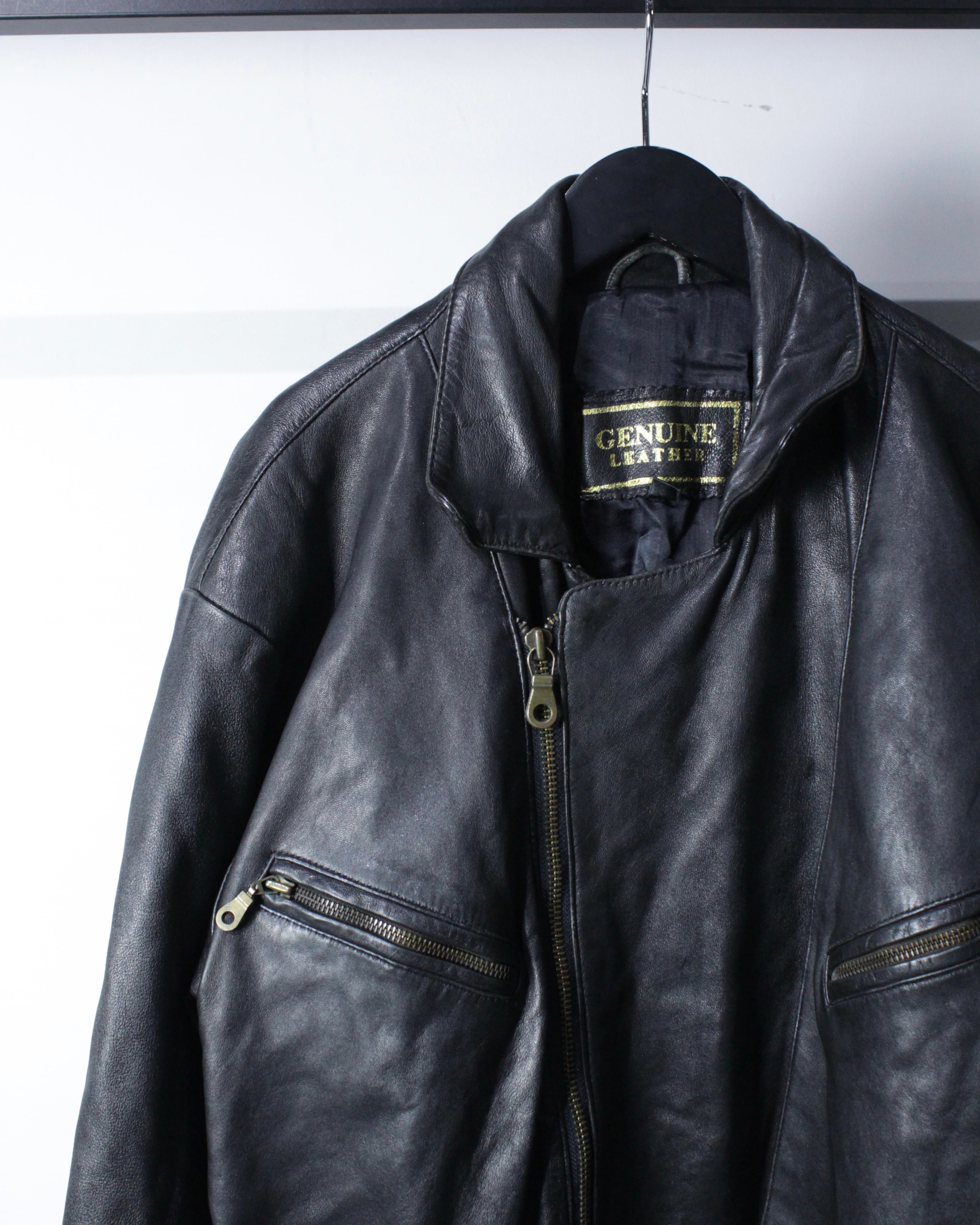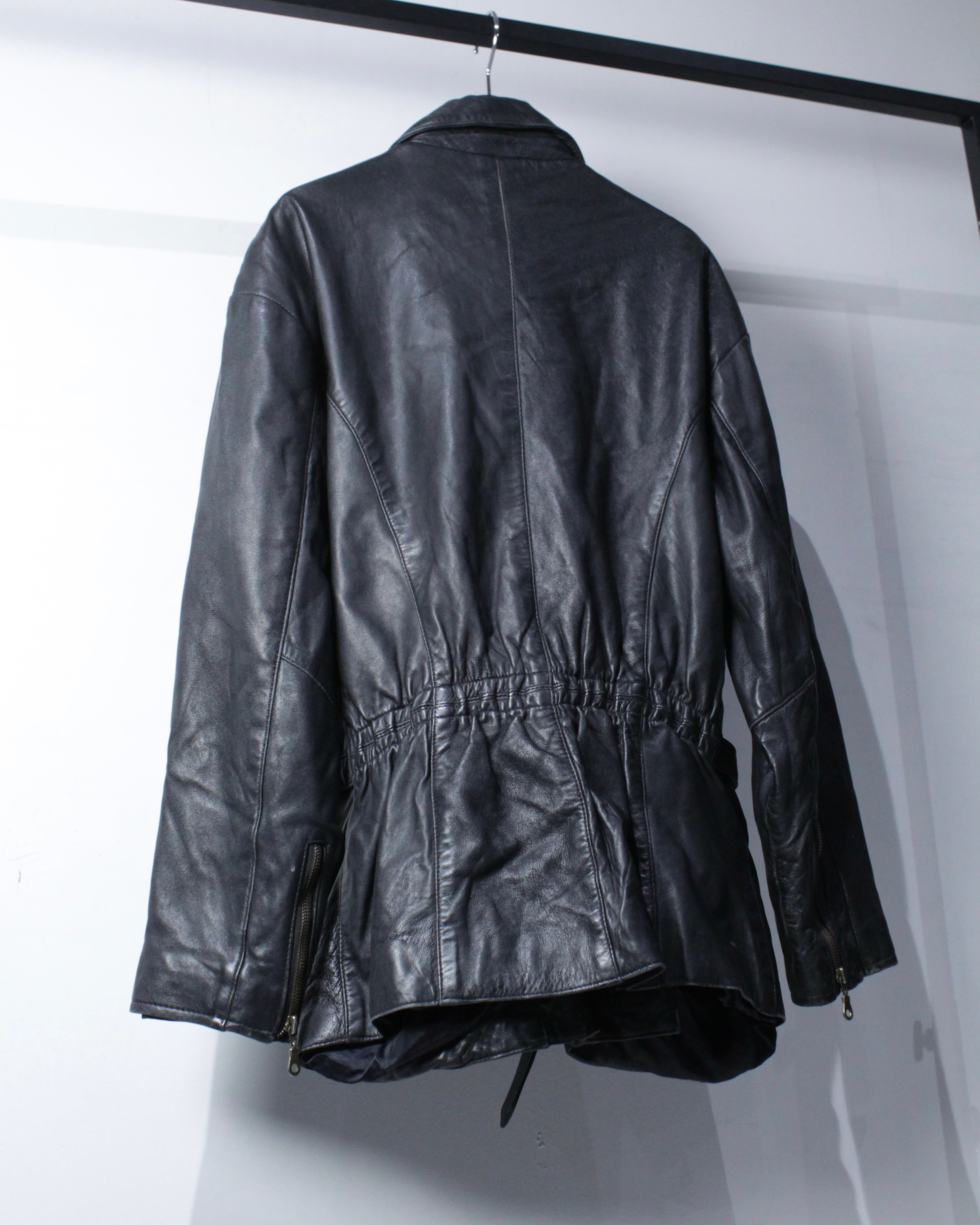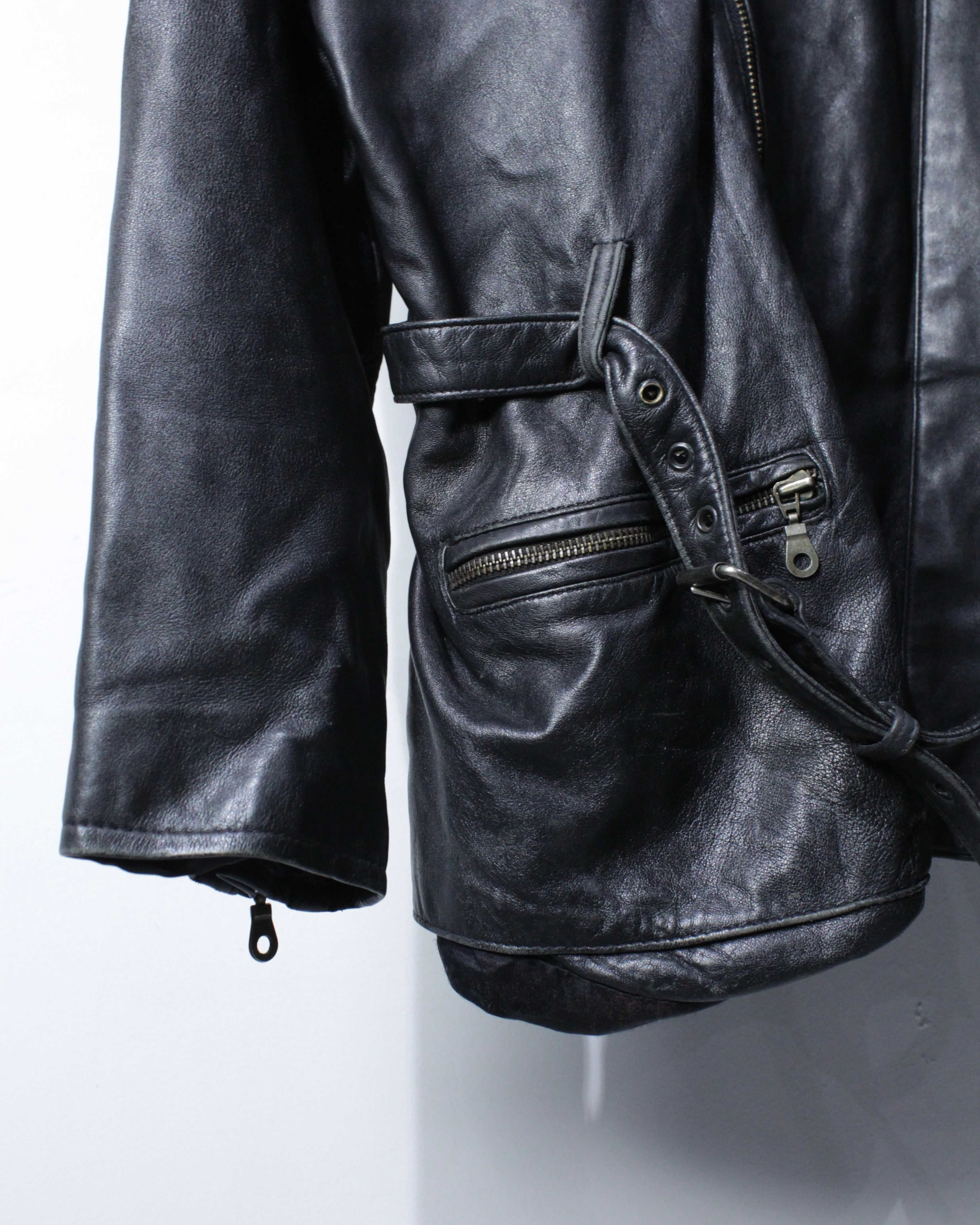 上質なリアルレザーを贅沢に使用し、鈍い艶を帯びたブラックの質感が圧倒的な存在感を放つ1着。
