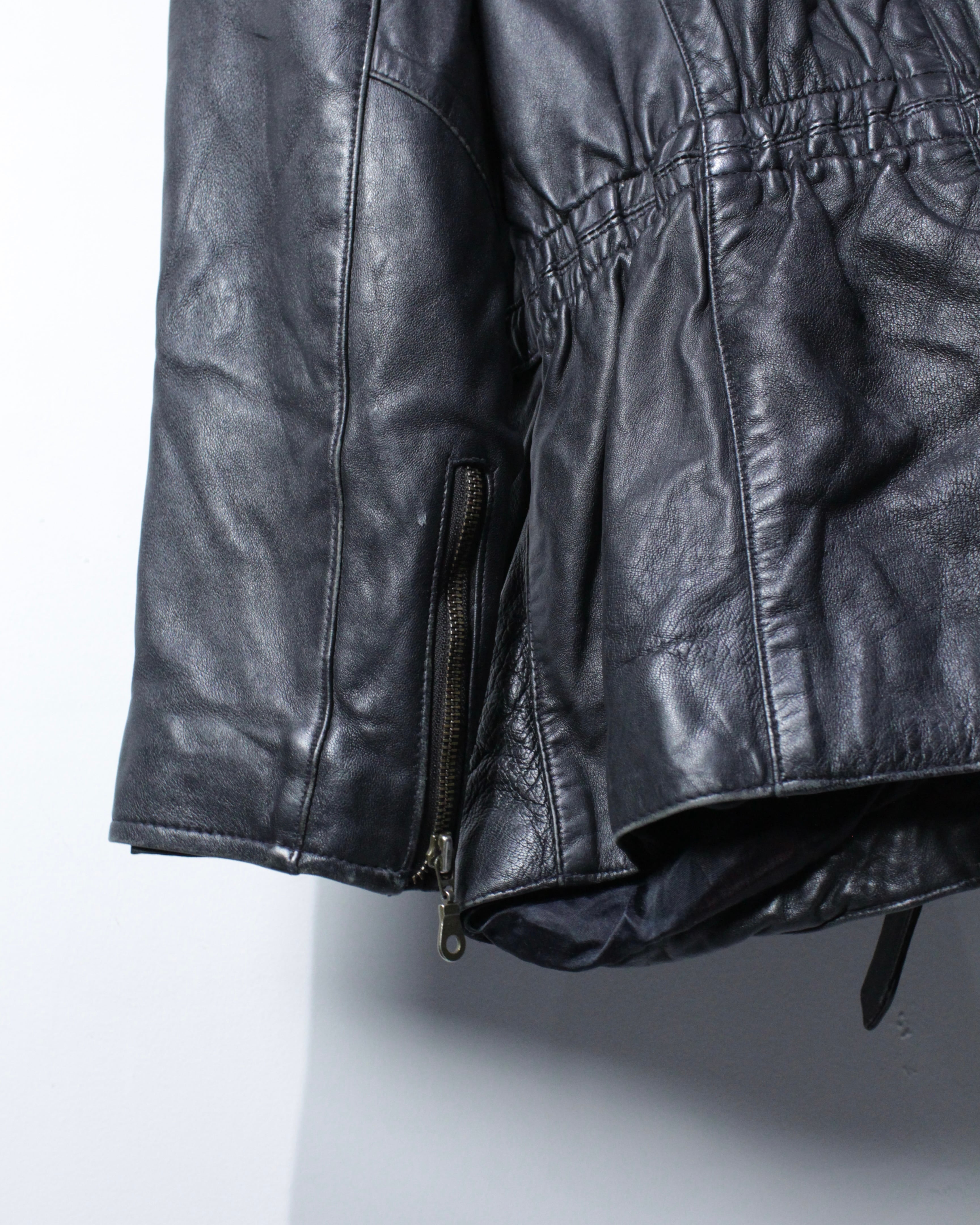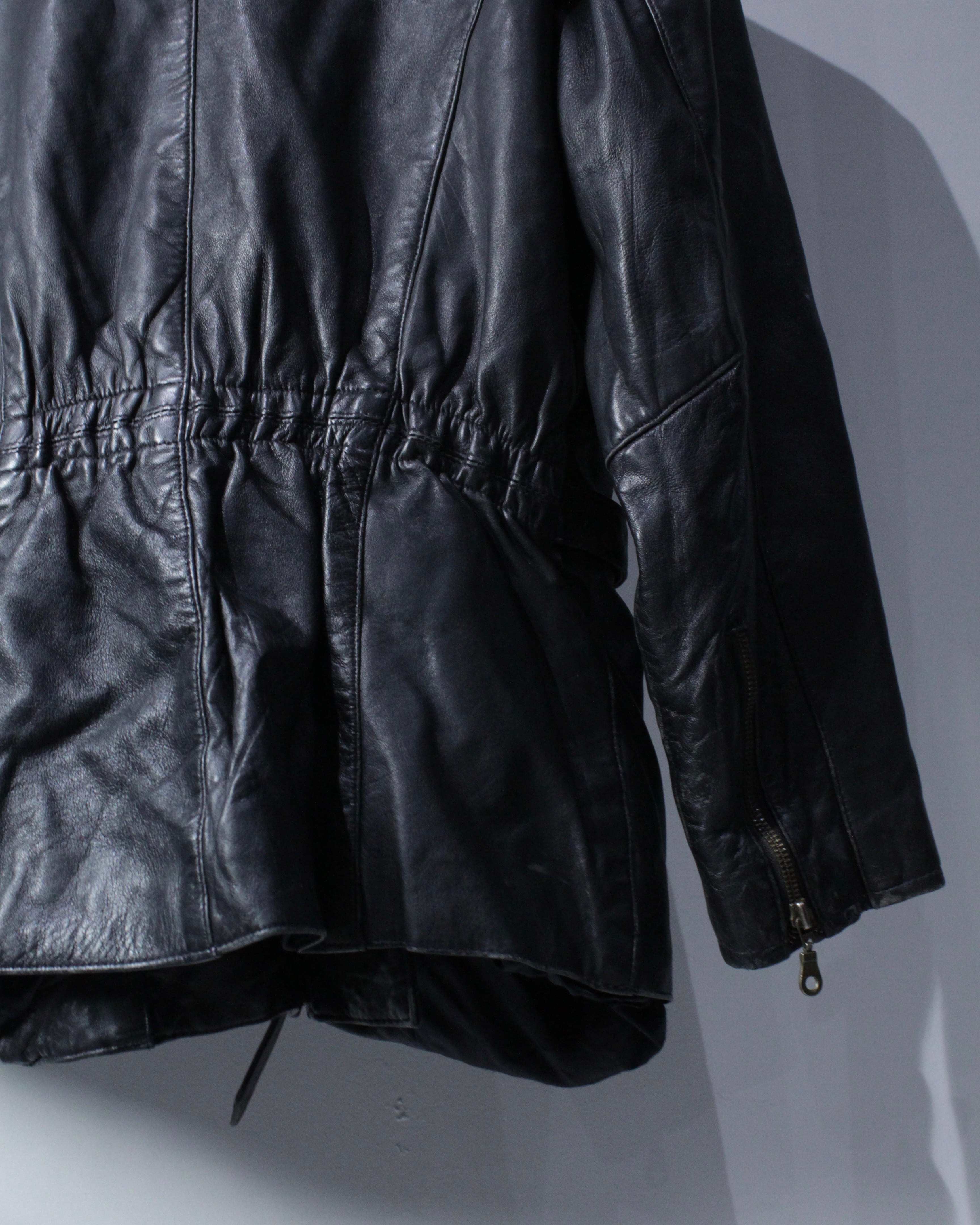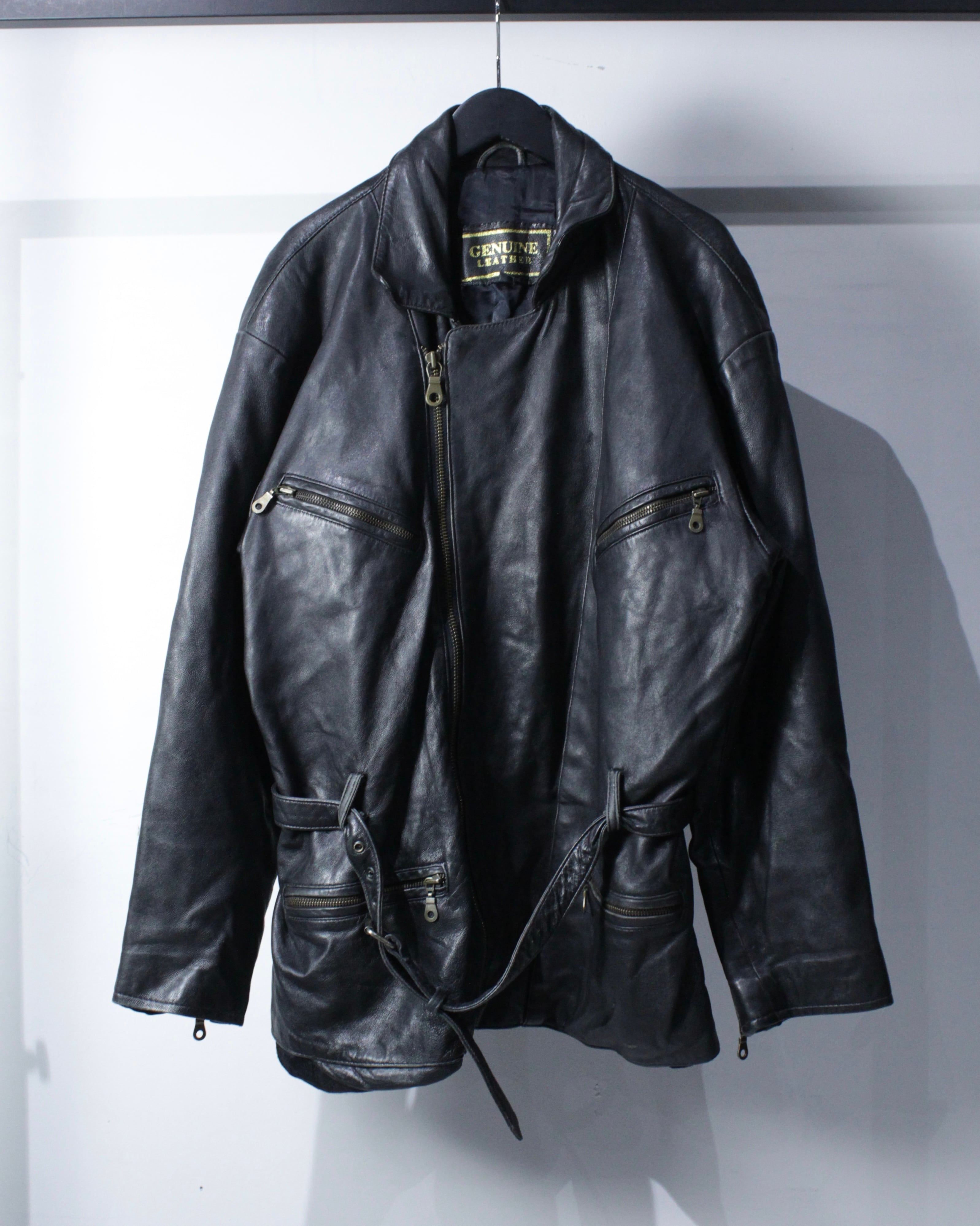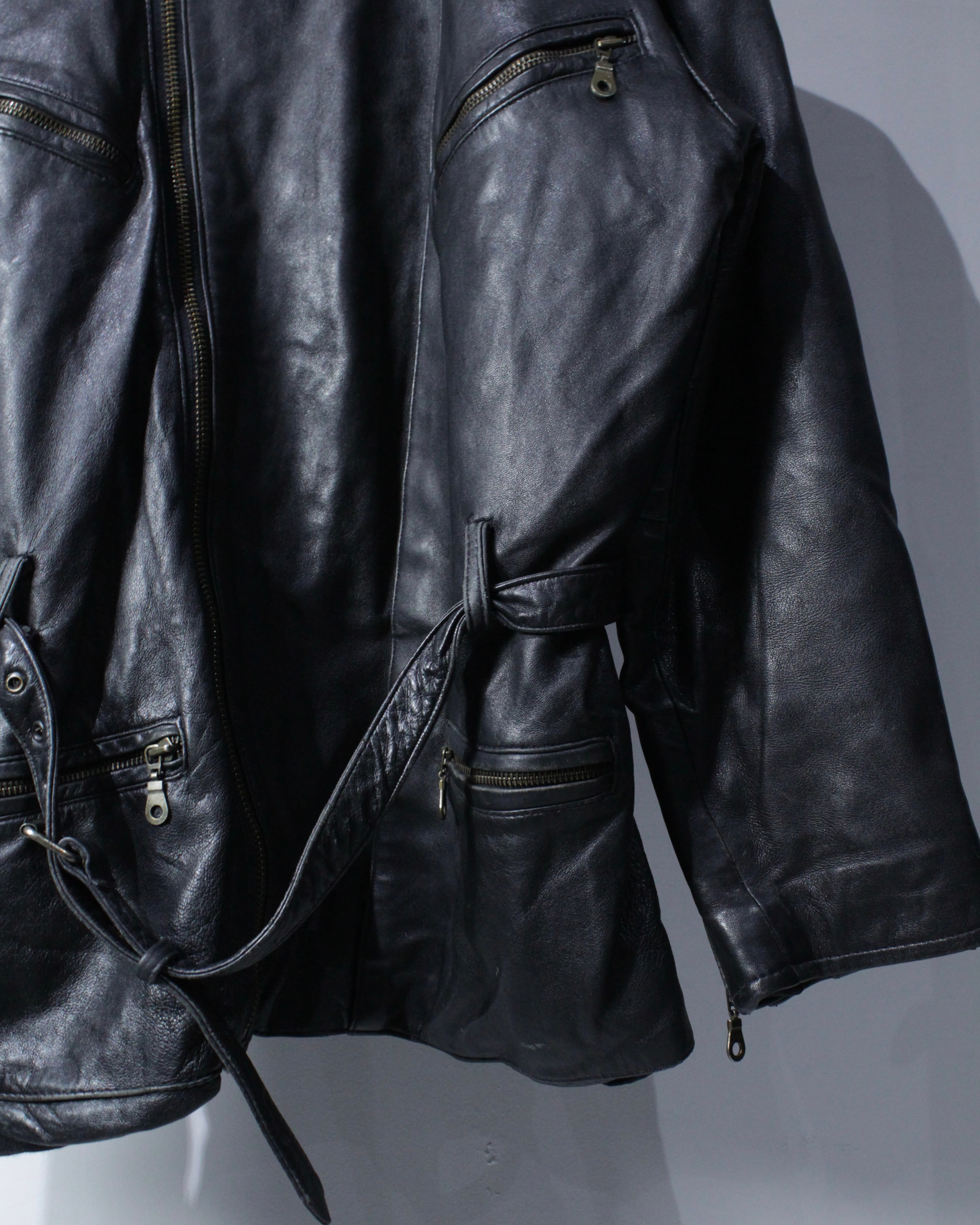 上質なリアルレザーを贅沢に使用し、鈍い艶を帯びたブラックの質感が圧倒的な存在感を放つ1着。