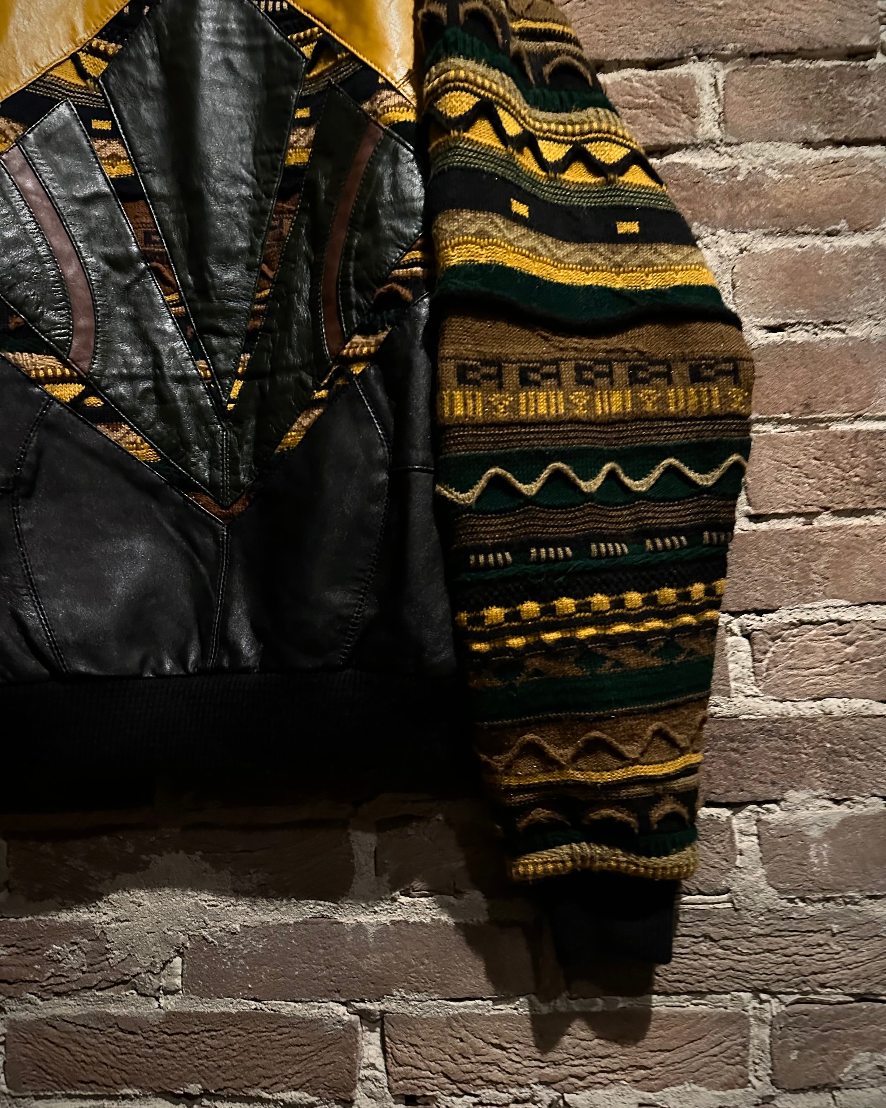 袖から背面にかけては奥行きある配色の3Dニットが広がり、インパクトも抜群。フロントのレザー切り替えが主役でありながら、全体で見た際のバランスも秀逸で、計算されたデザインセンスが光ります。