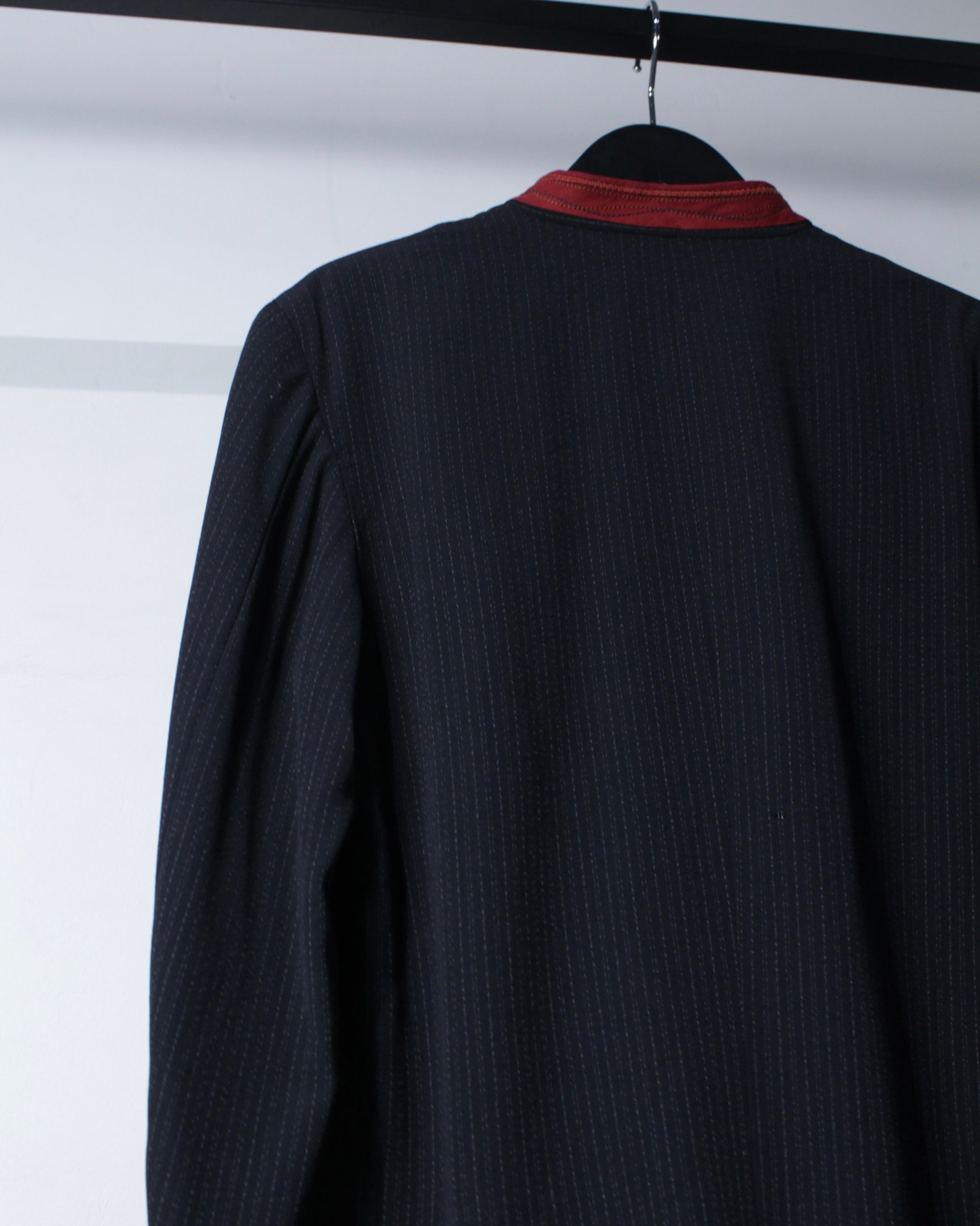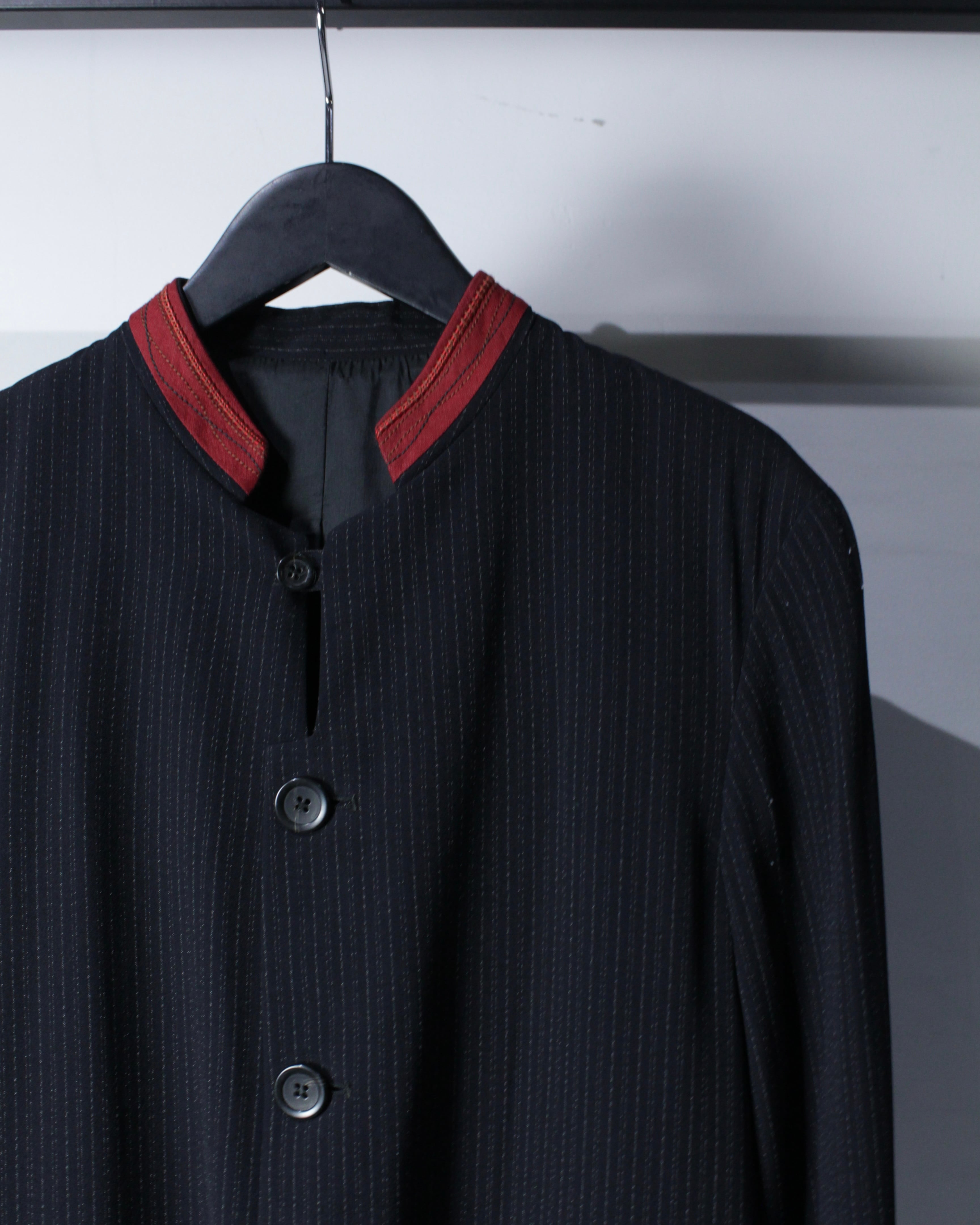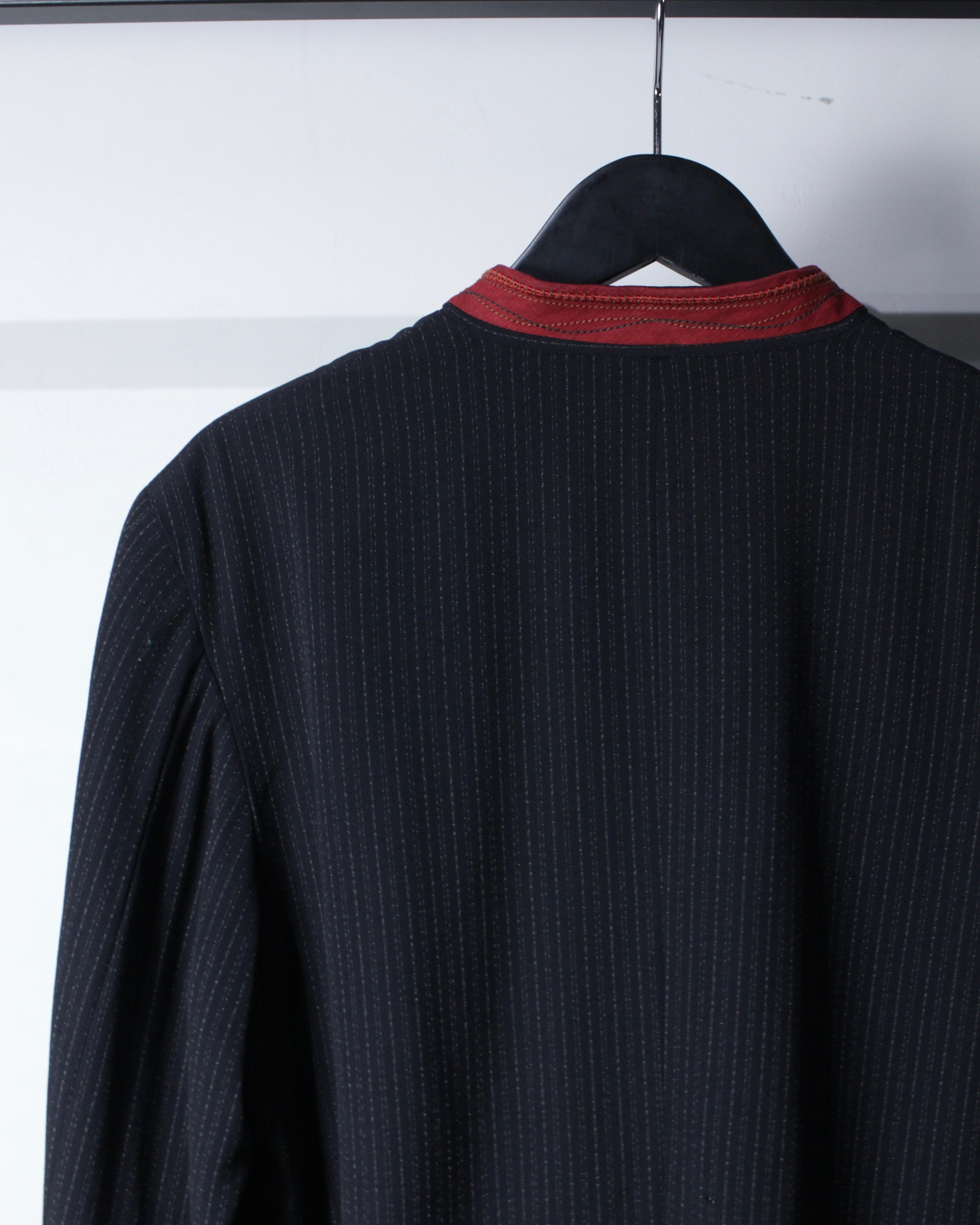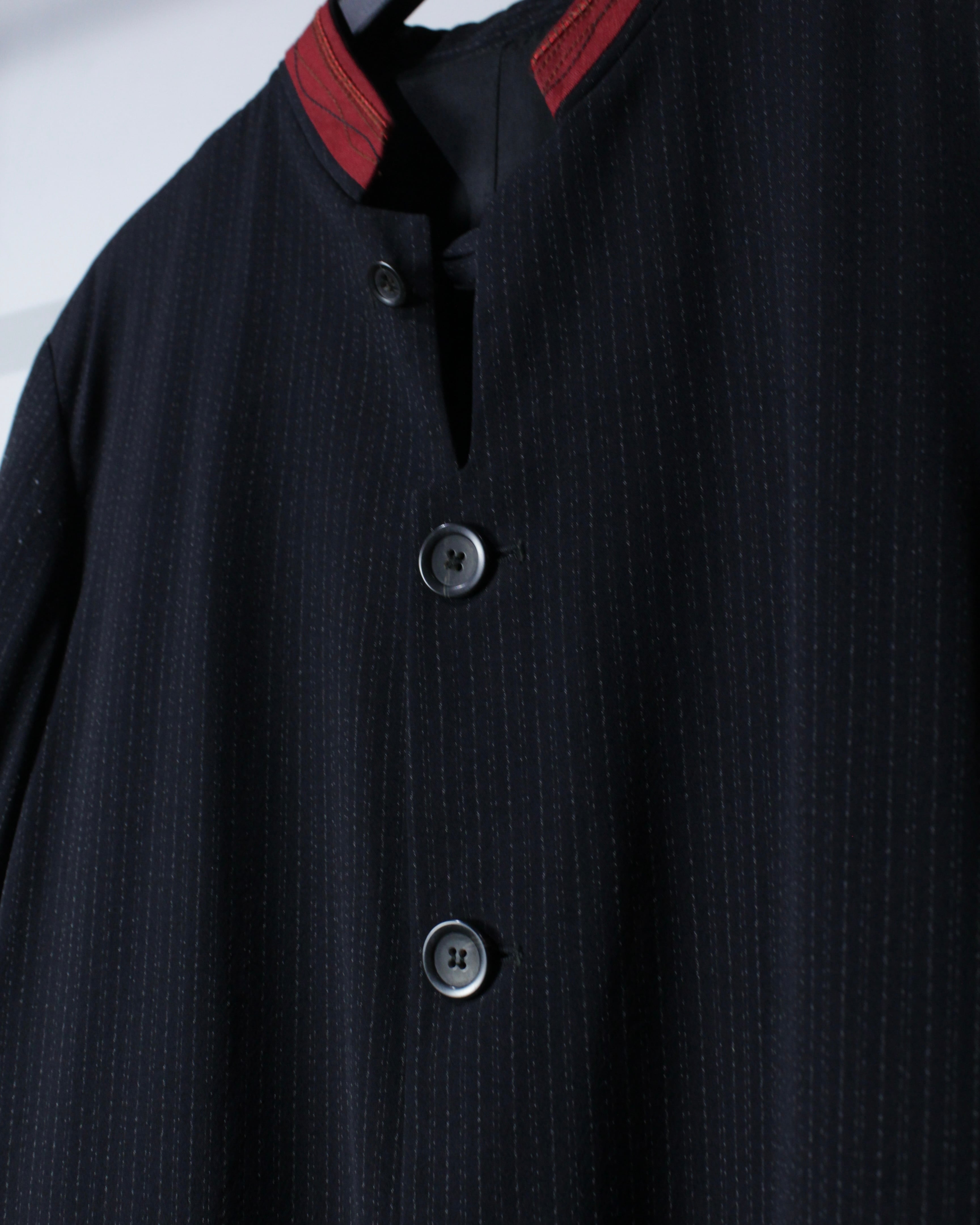 繊細なストライプが走るボディに、赤の切り替えマオカラーが映えるデザイン。ミニマルなボディに対して首元のみ色を差すことで生まれるバランス感は、まさにジルボーらしい仕上がりです。