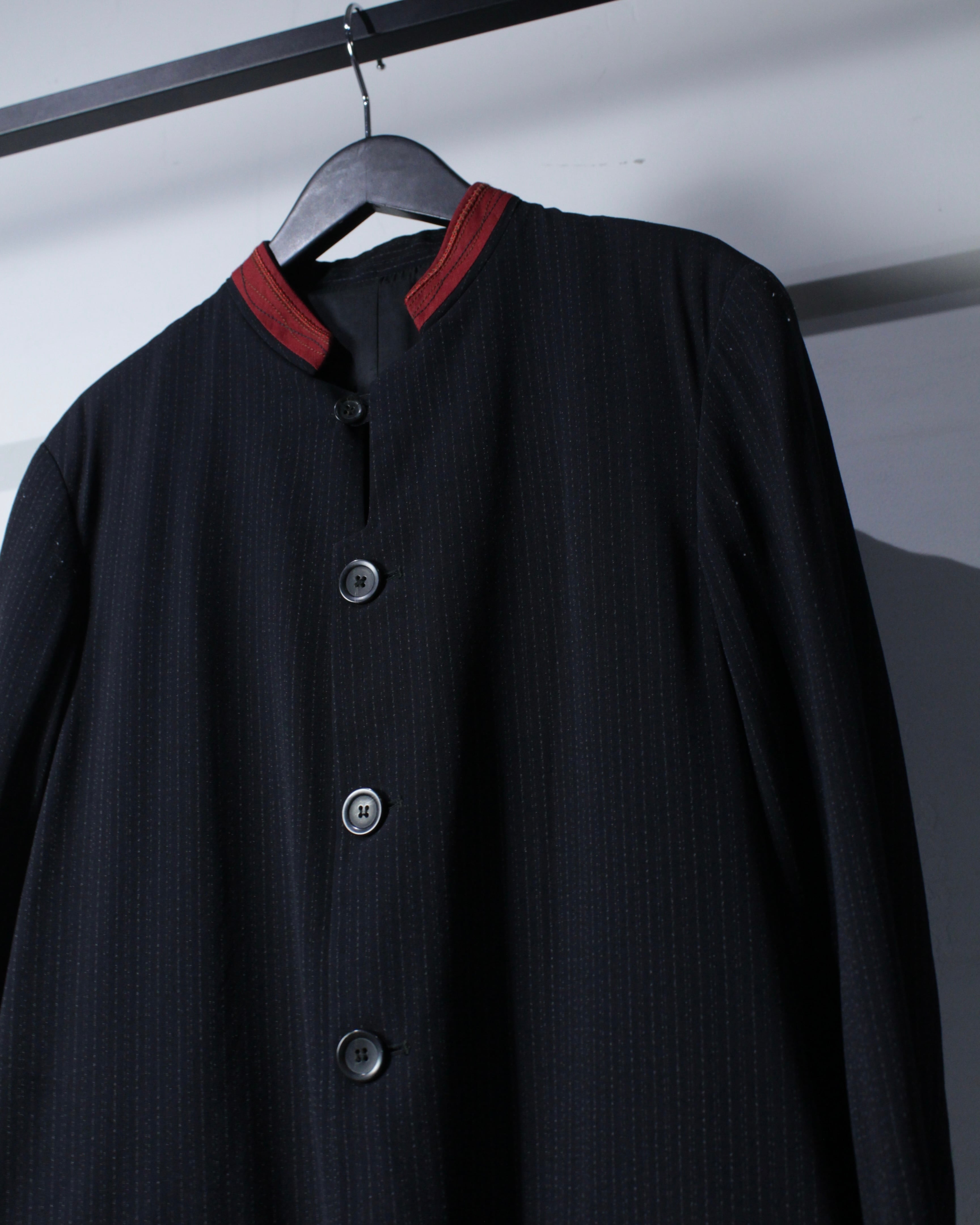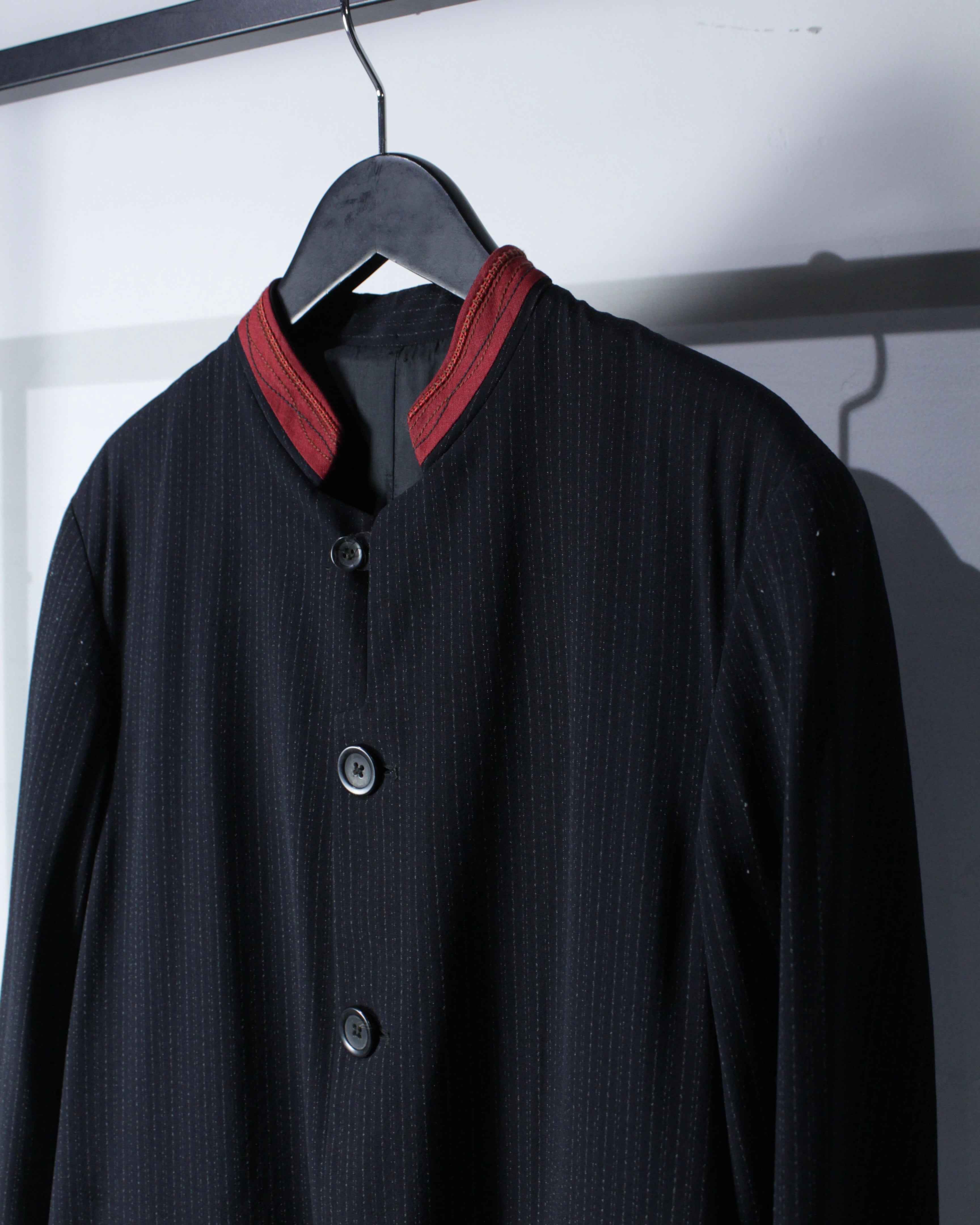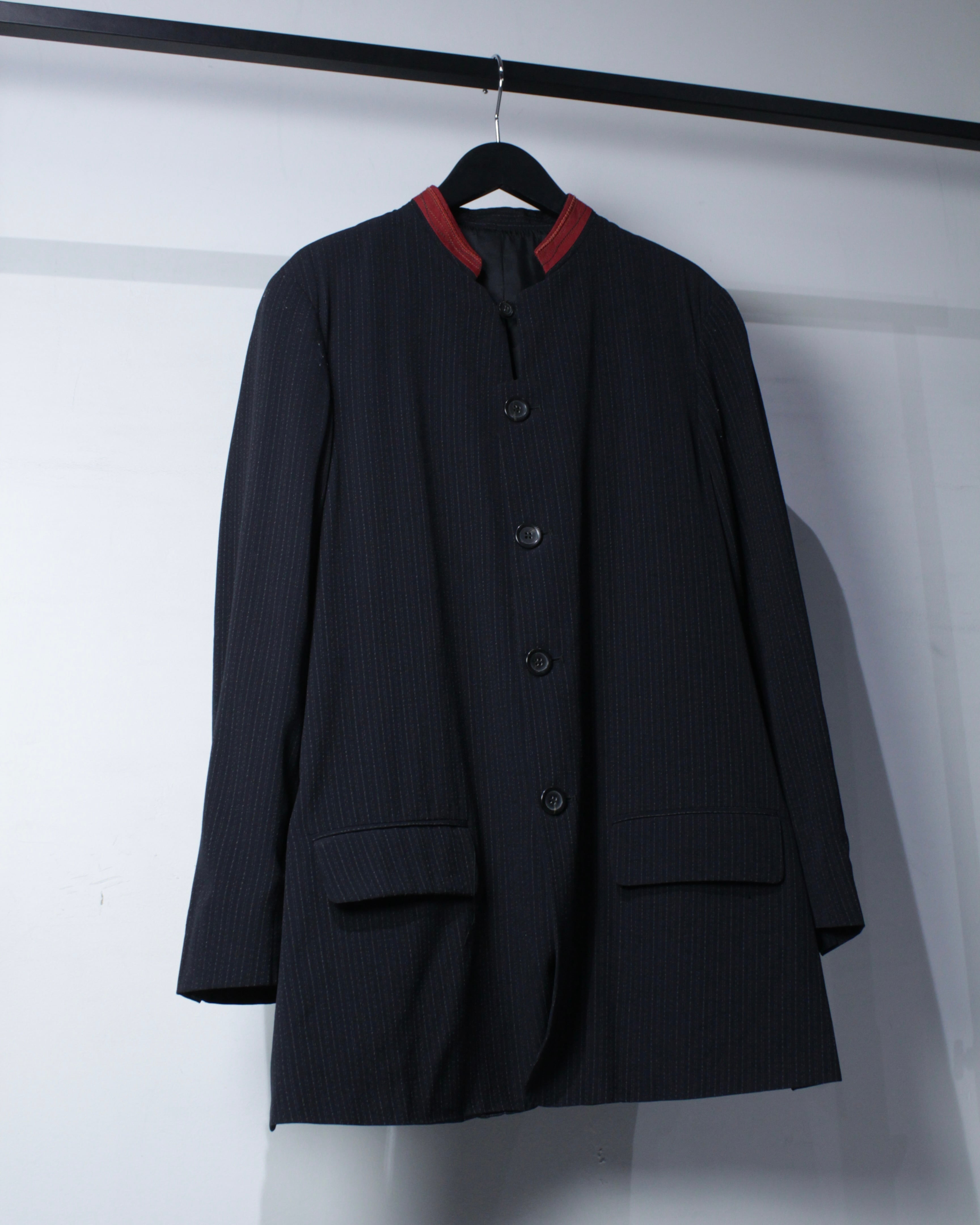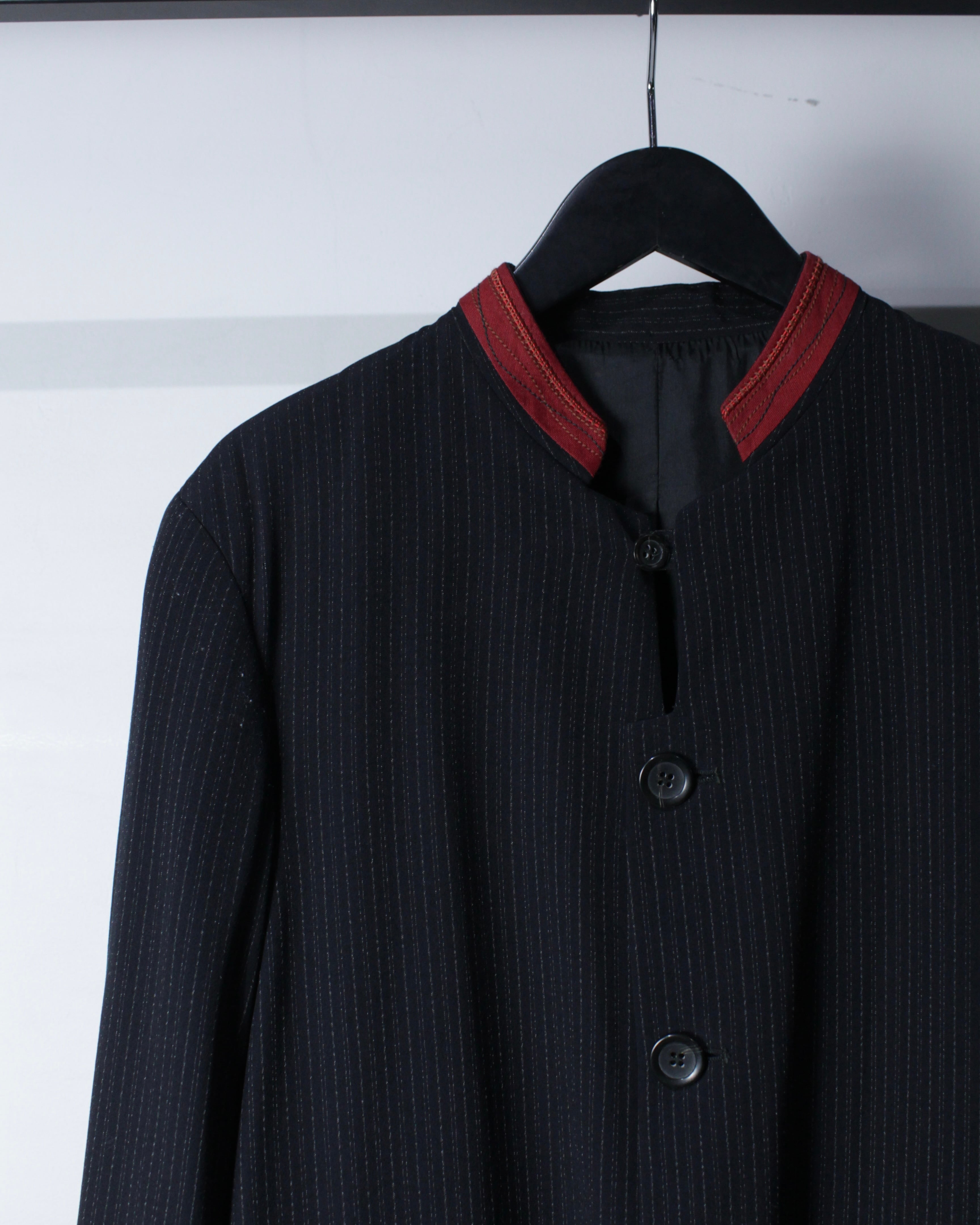 繊細なストライプが走るボディに、赤の切り替えマオカラーが映えるデザイン。ミニマルなボディに対して首元のみ色を差すことで生まれるバランス感は、まさにジルボーらしい仕上がりです。