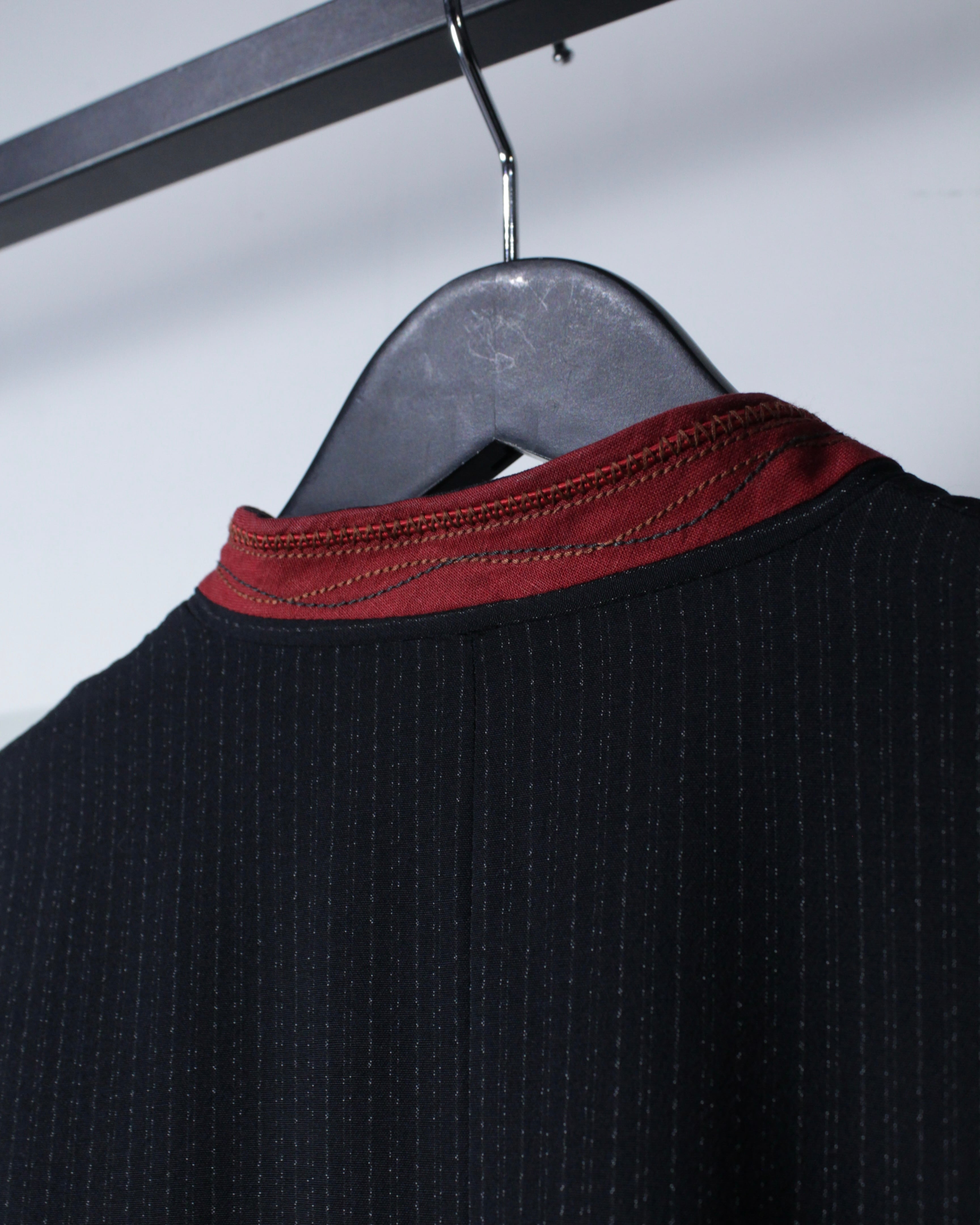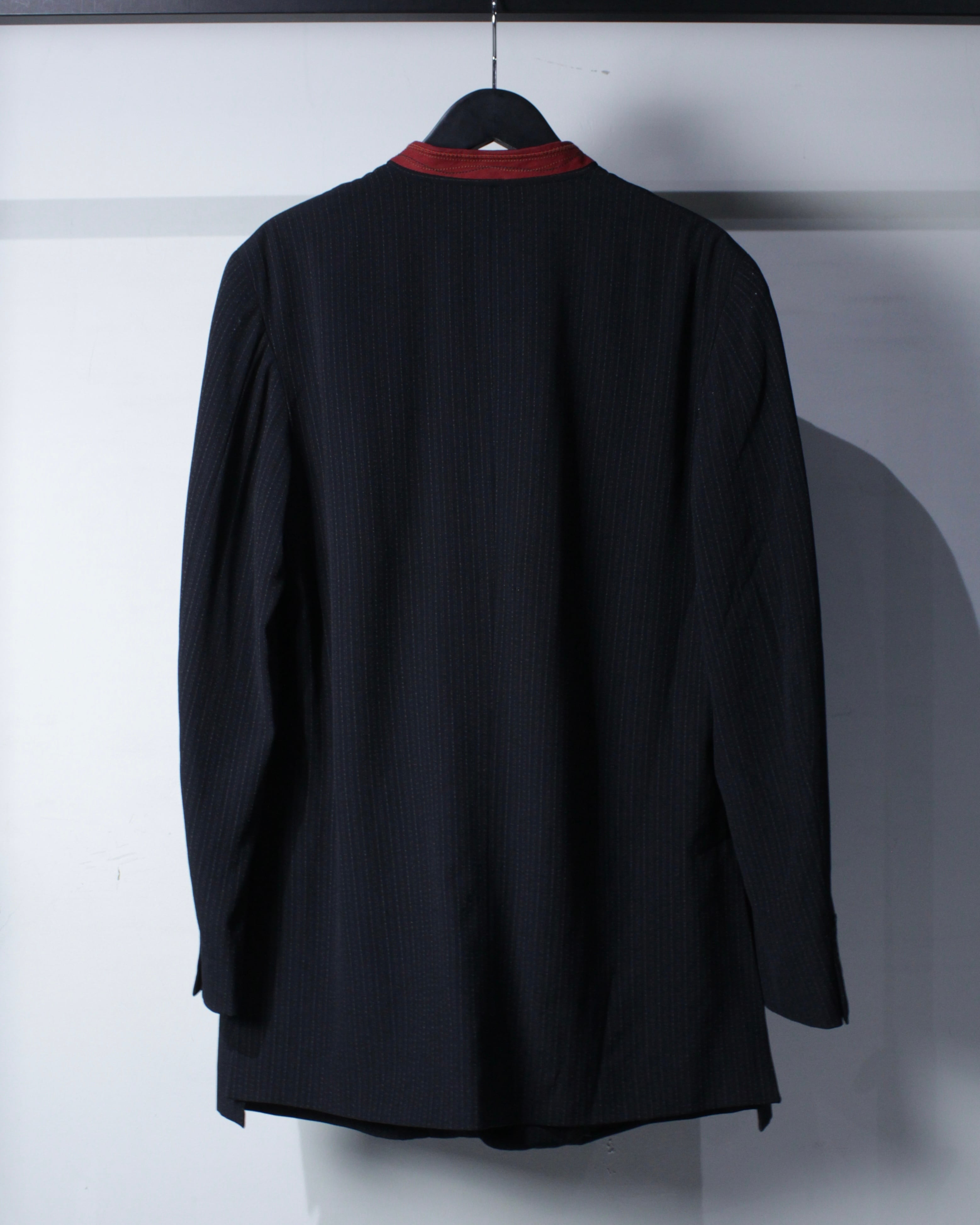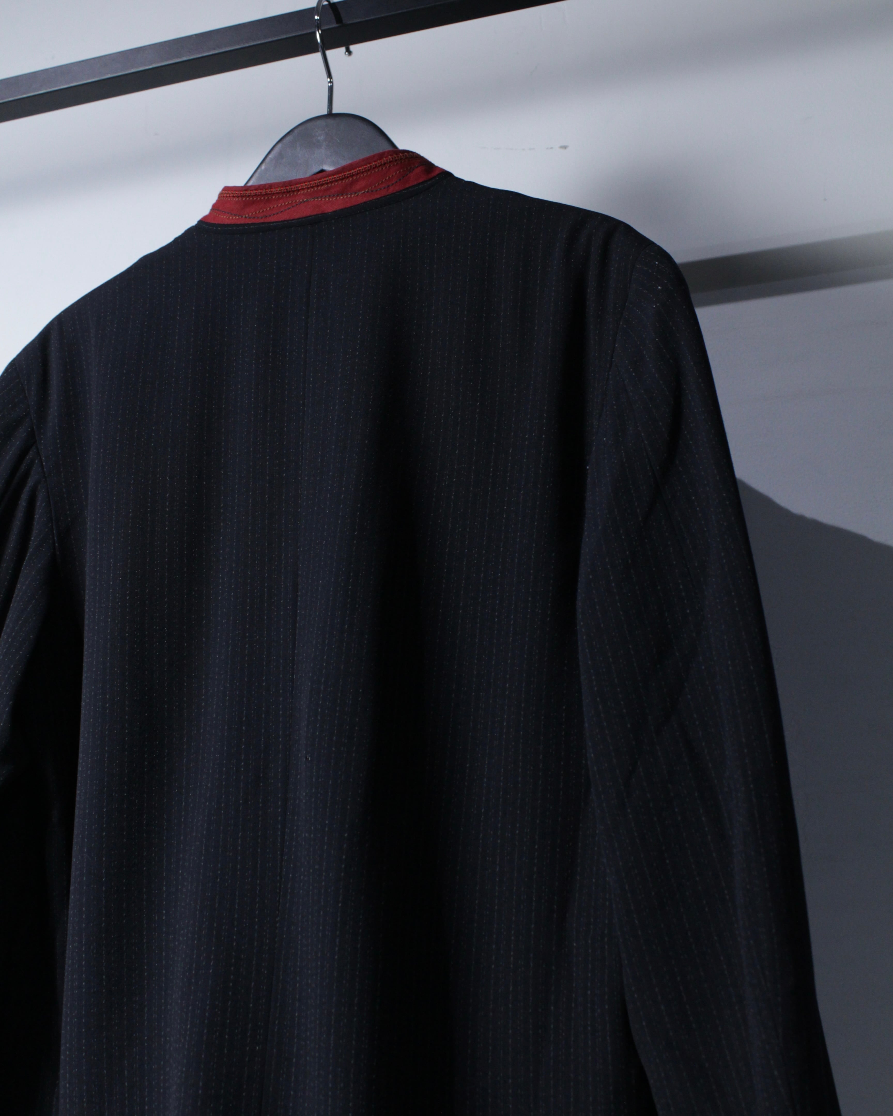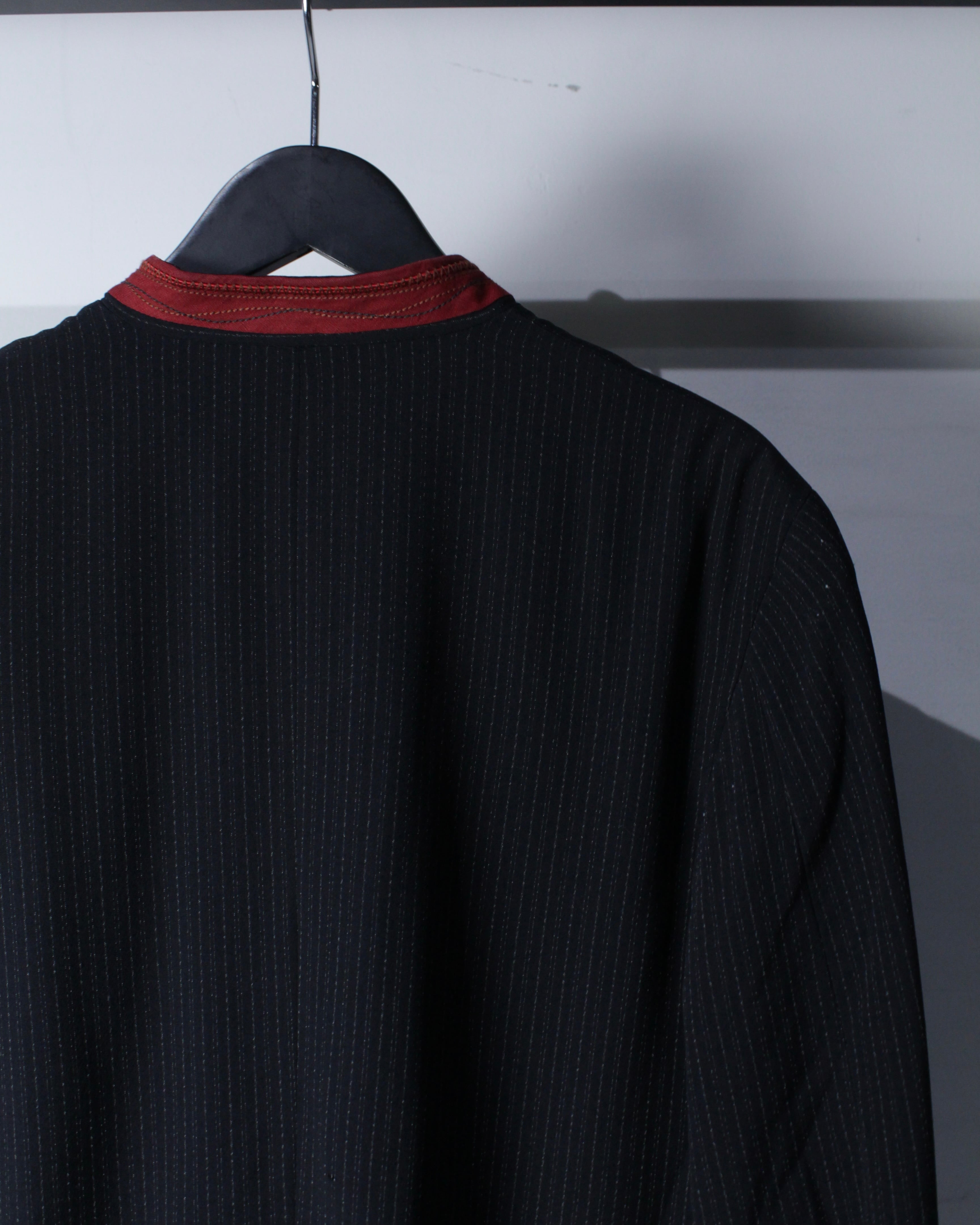 繊細なストライプが走るボディに、赤の切り替えマオカラーが映えるデザイン。ミニマルなボディに対して首元のみ色を差すことで生まれるバランス感は、まさにジルボーらしい仕上がりです。