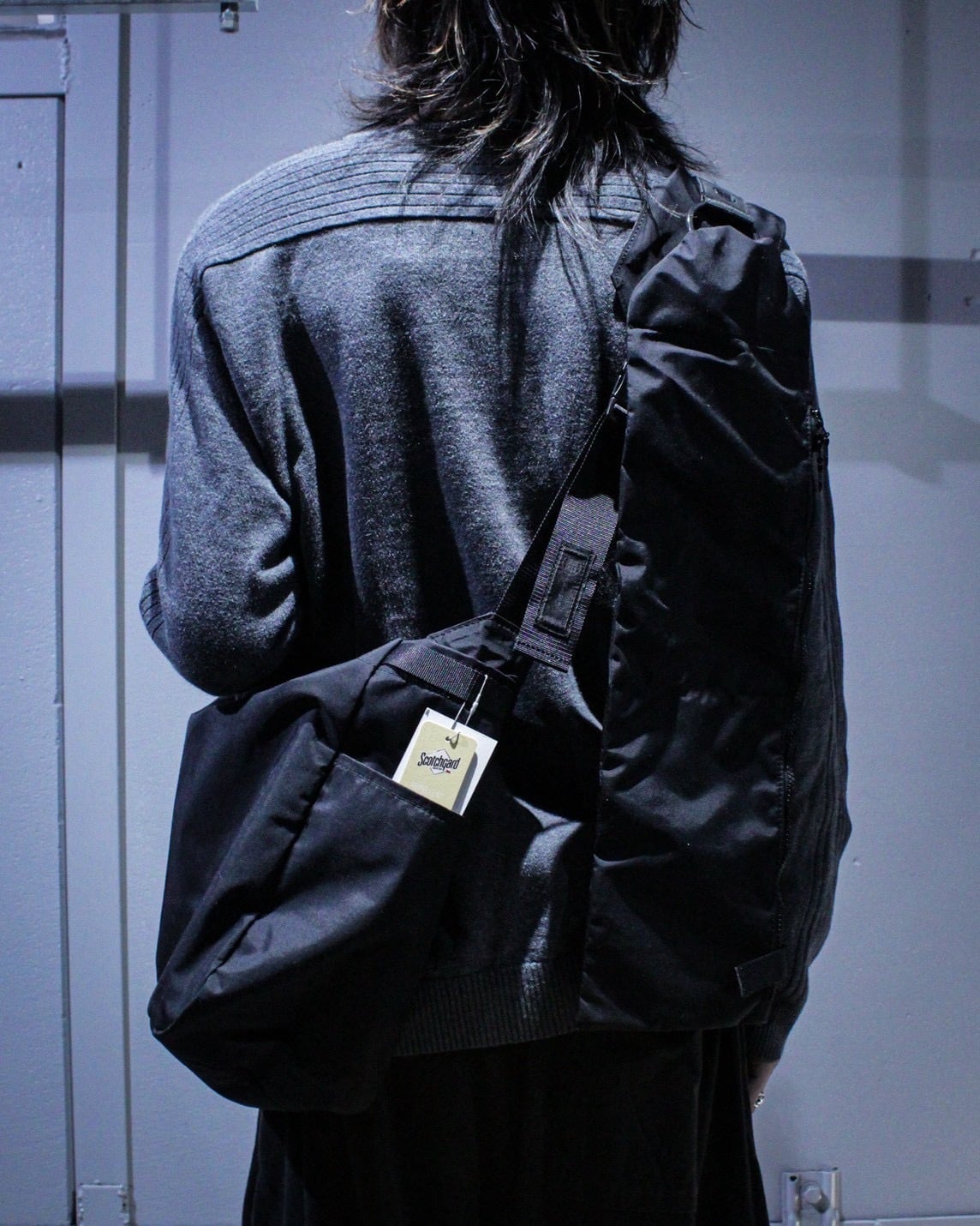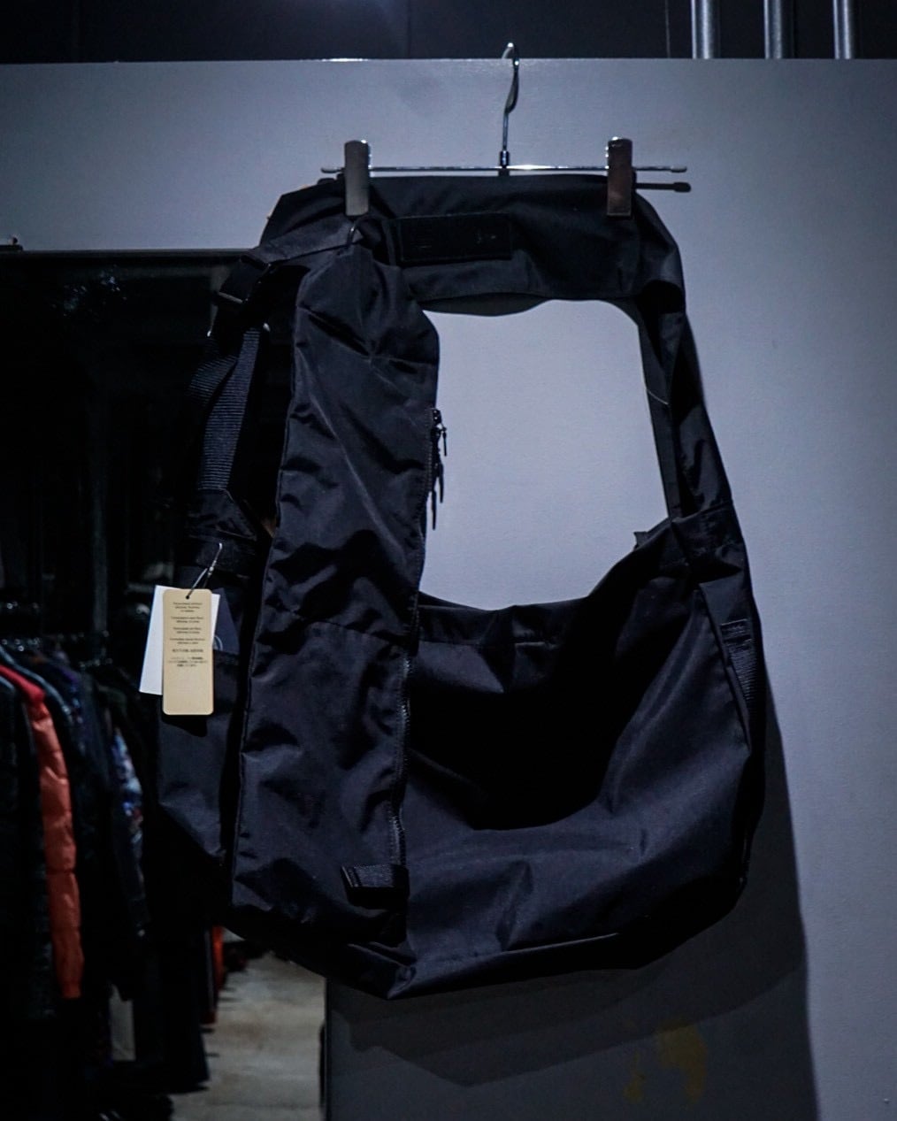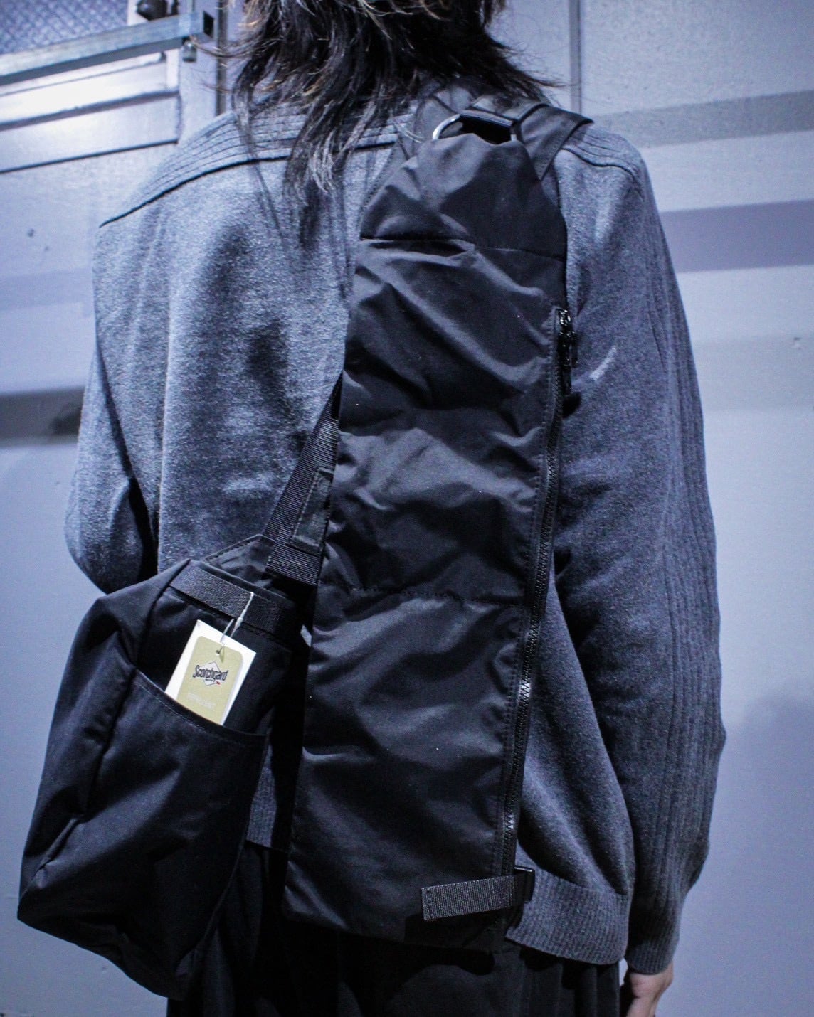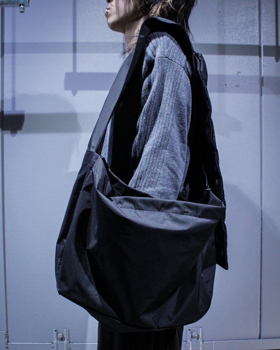 二天の名を冠した、構造を纏うタスキショルダーバッグ。最大の特徴は、肩紐に付属する縦長のビッグストラップ。まるで薄型のバッグを重ねたような存在感があります。