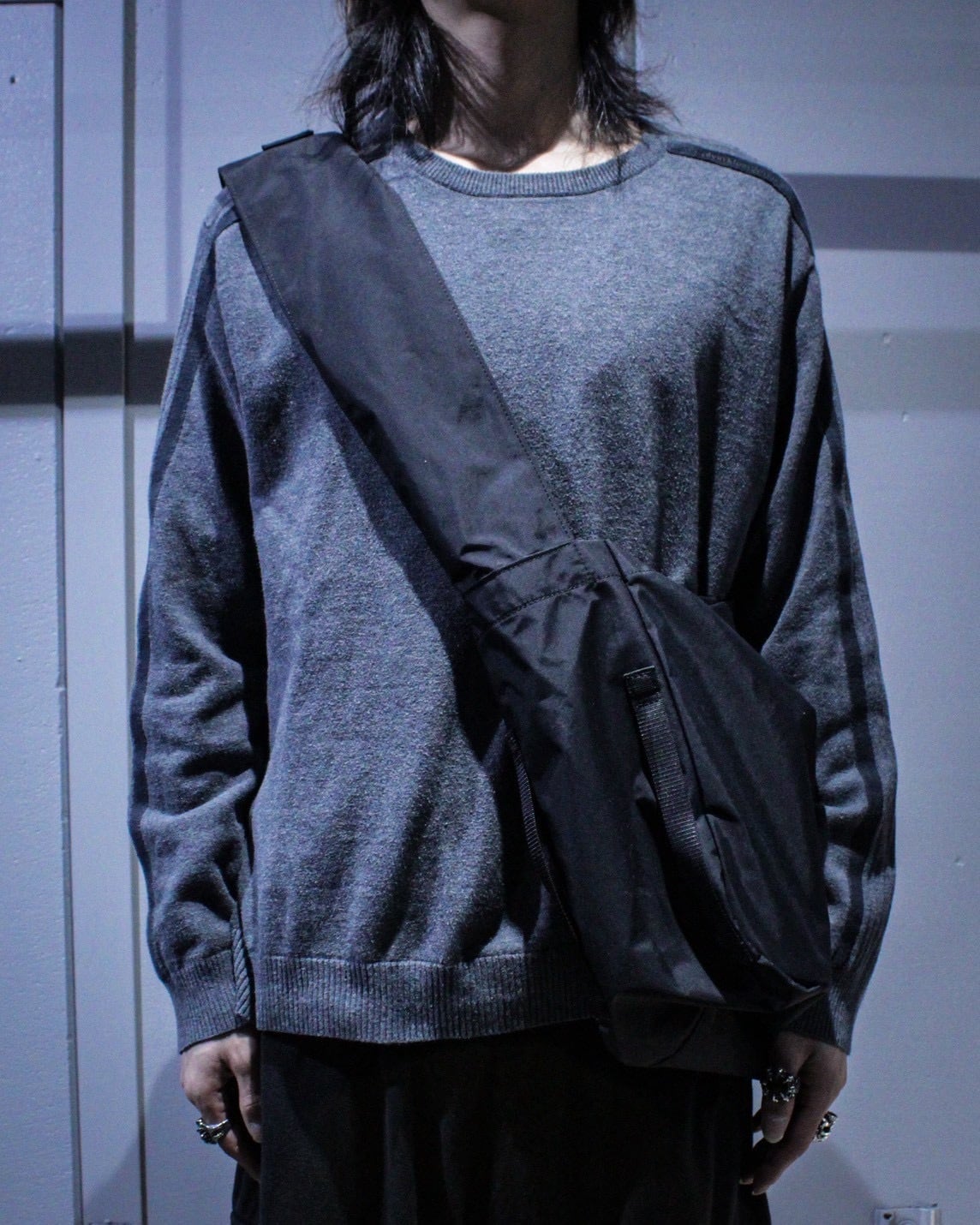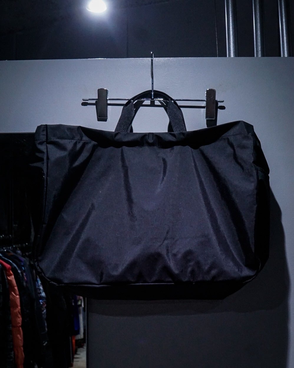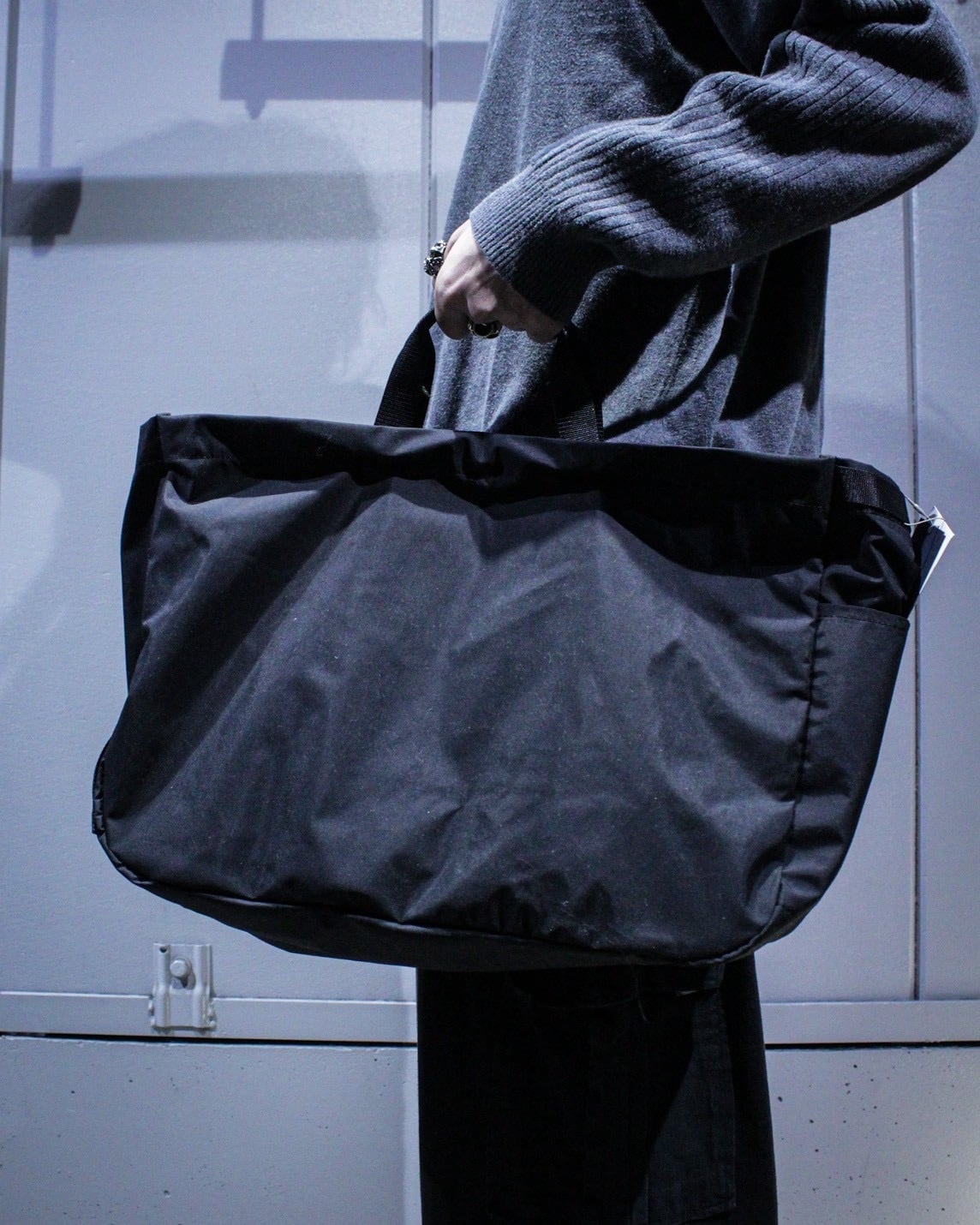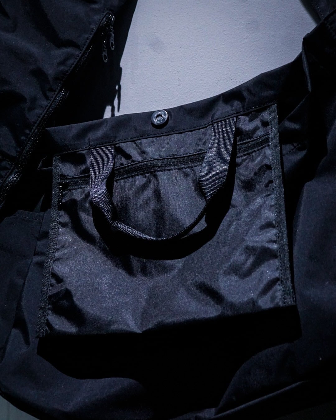 二天の名を冠した、構造を纏うタスキショルダーバッグ。最大の特徴は、肩紐に付属する縦長のビッグストラップ。まるで薄型のバッグを重ねたような存在感があります。