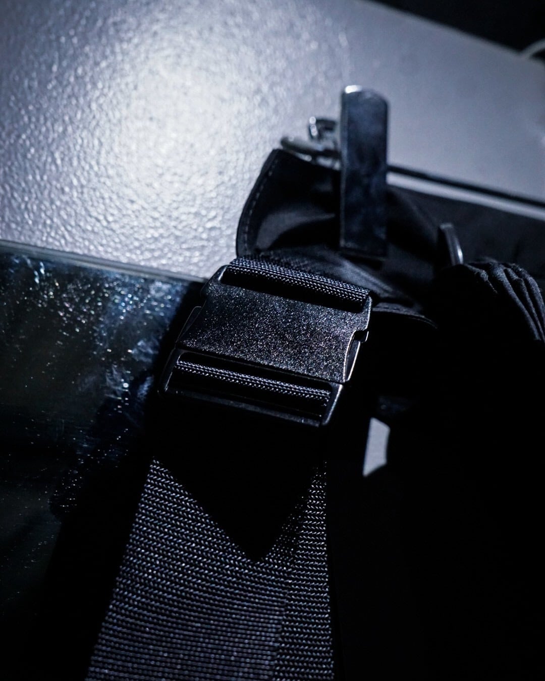 ストラップ内側にはサイドリリースバックルを搭載しています。肩紐に沿わせてすっきりと固定することも、あえて垂らしてデザインとして活かすことも可能です。スタイリングに応じた可変性。