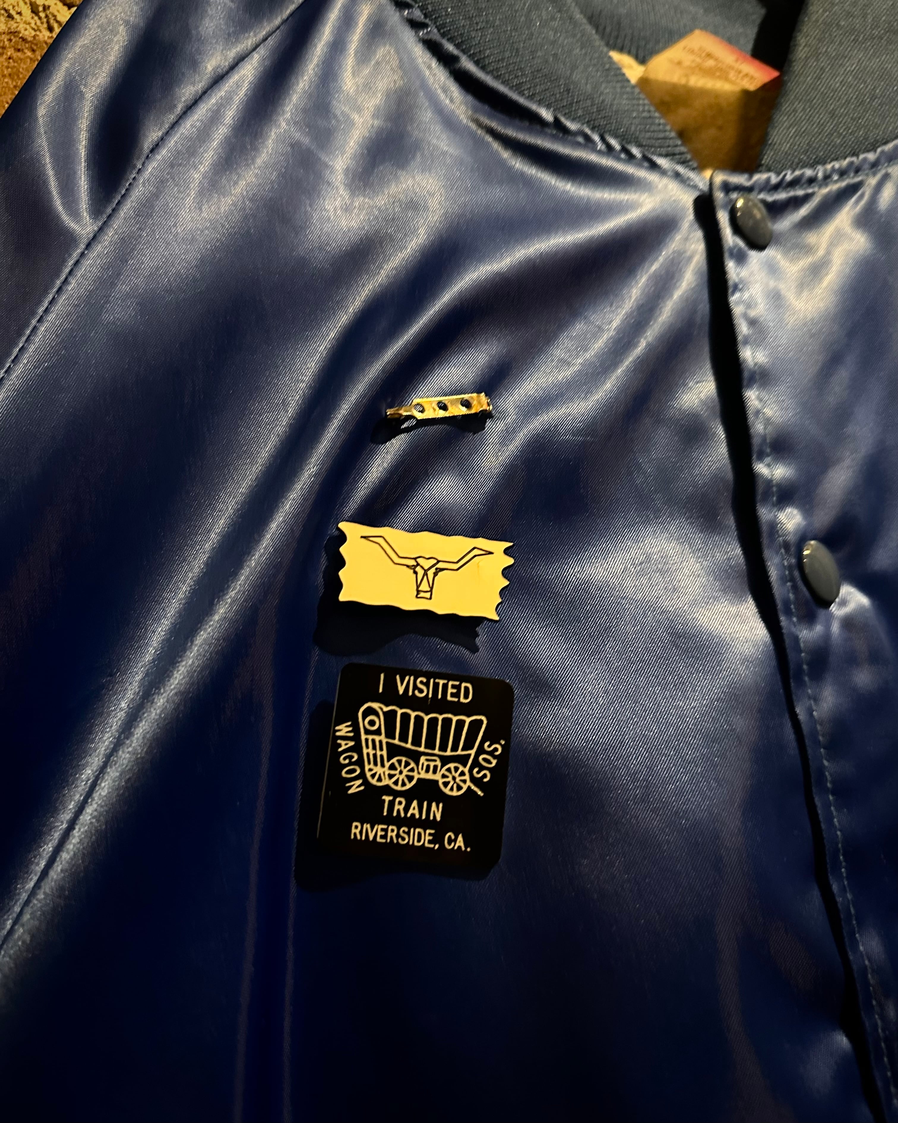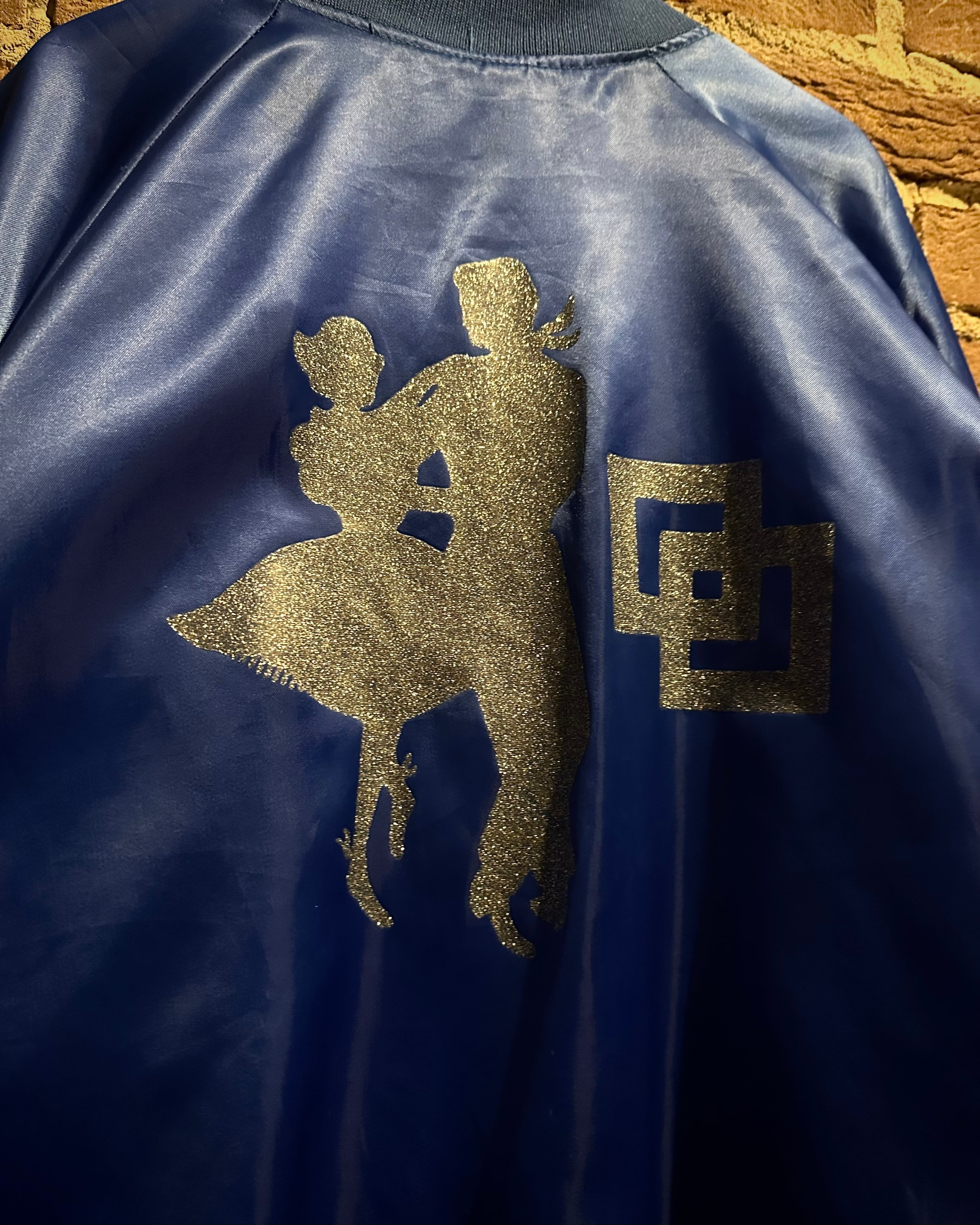 フロントはスナップボタン仕様。胸元にはピンズをあしらい、左胸と背面にはラメ感のあるダンサーのシルエットとロゴを大胆にプリント。煌びやかなグリッター仕様が、当時のショーマインドやカルチャー背景を感じさせます。