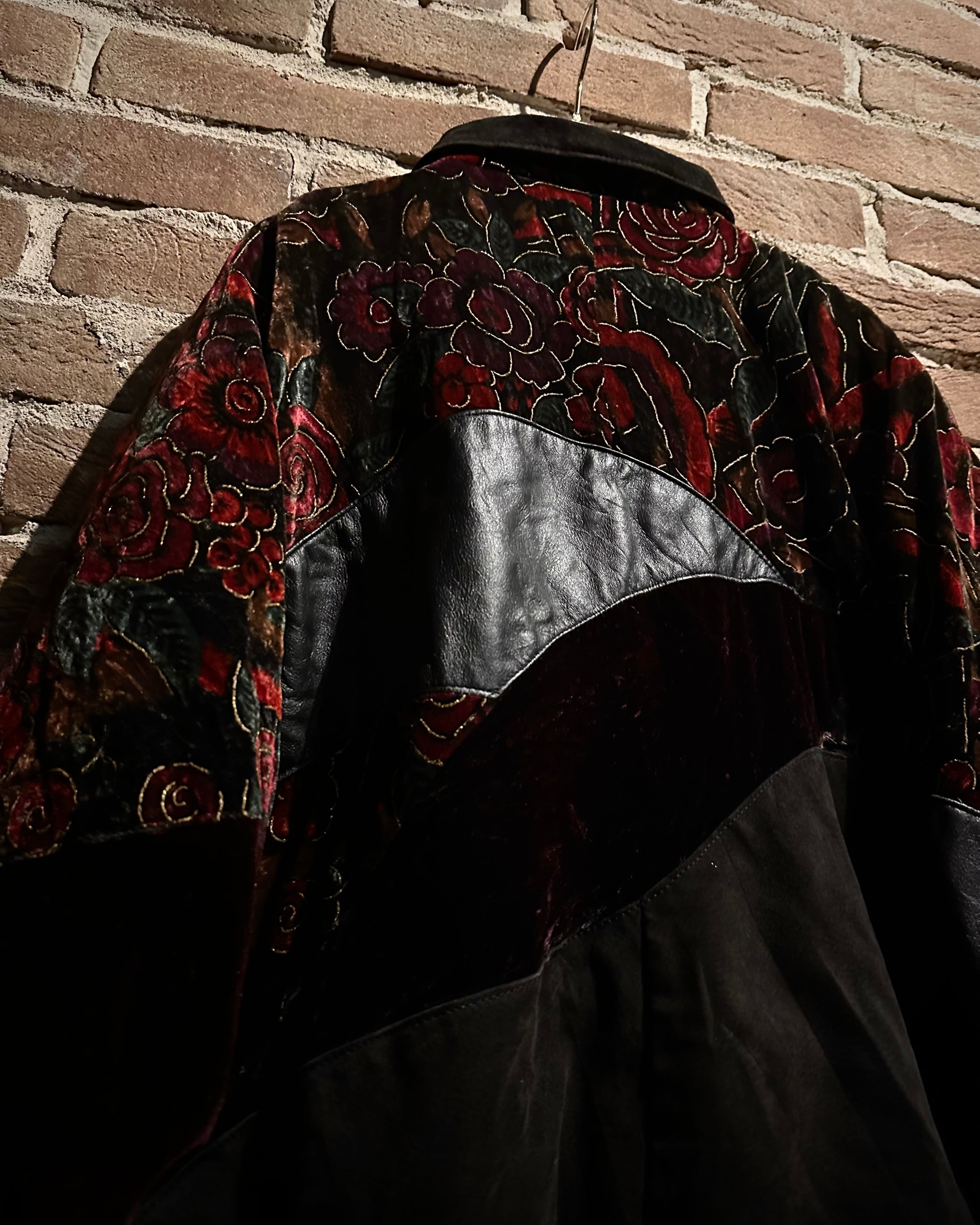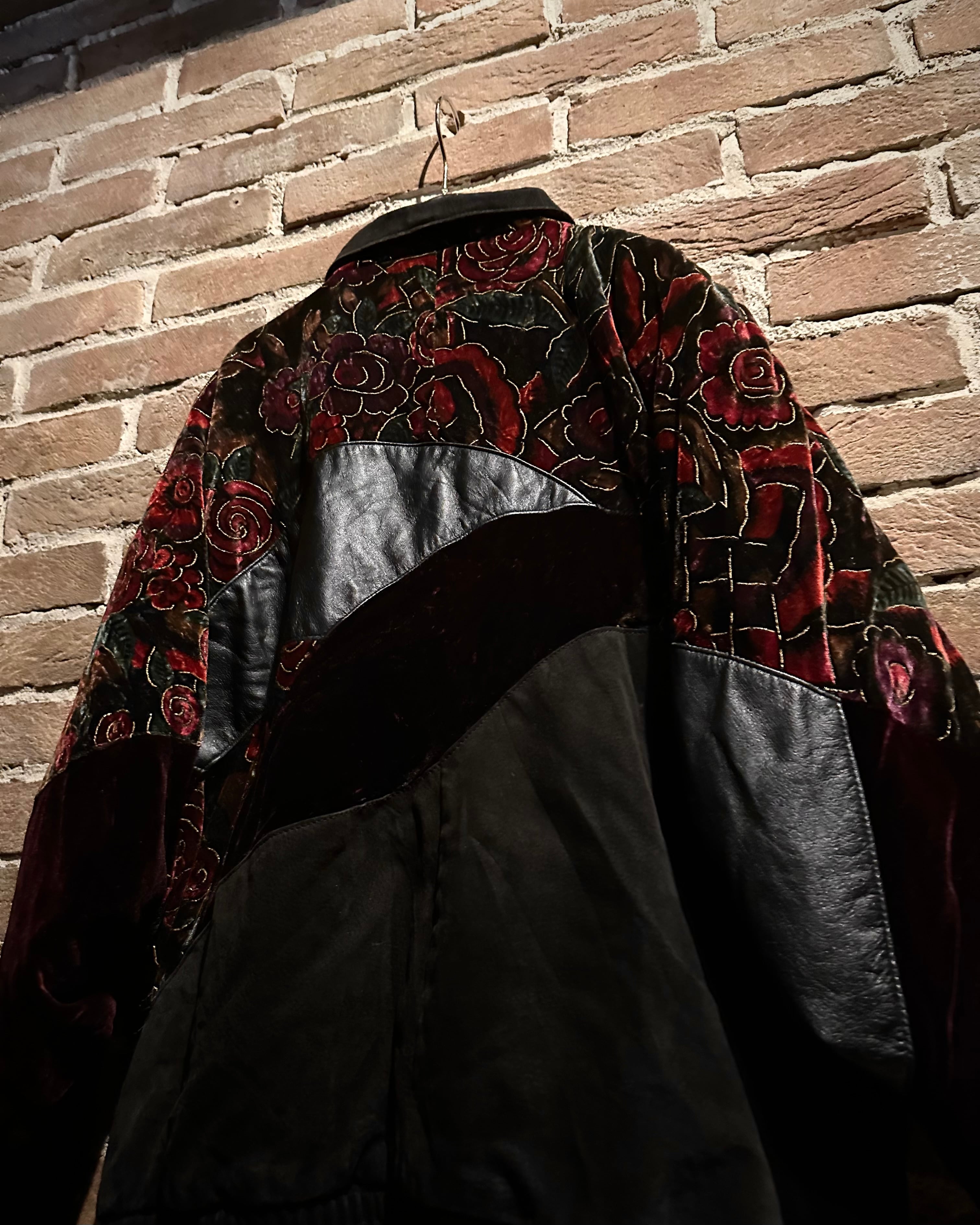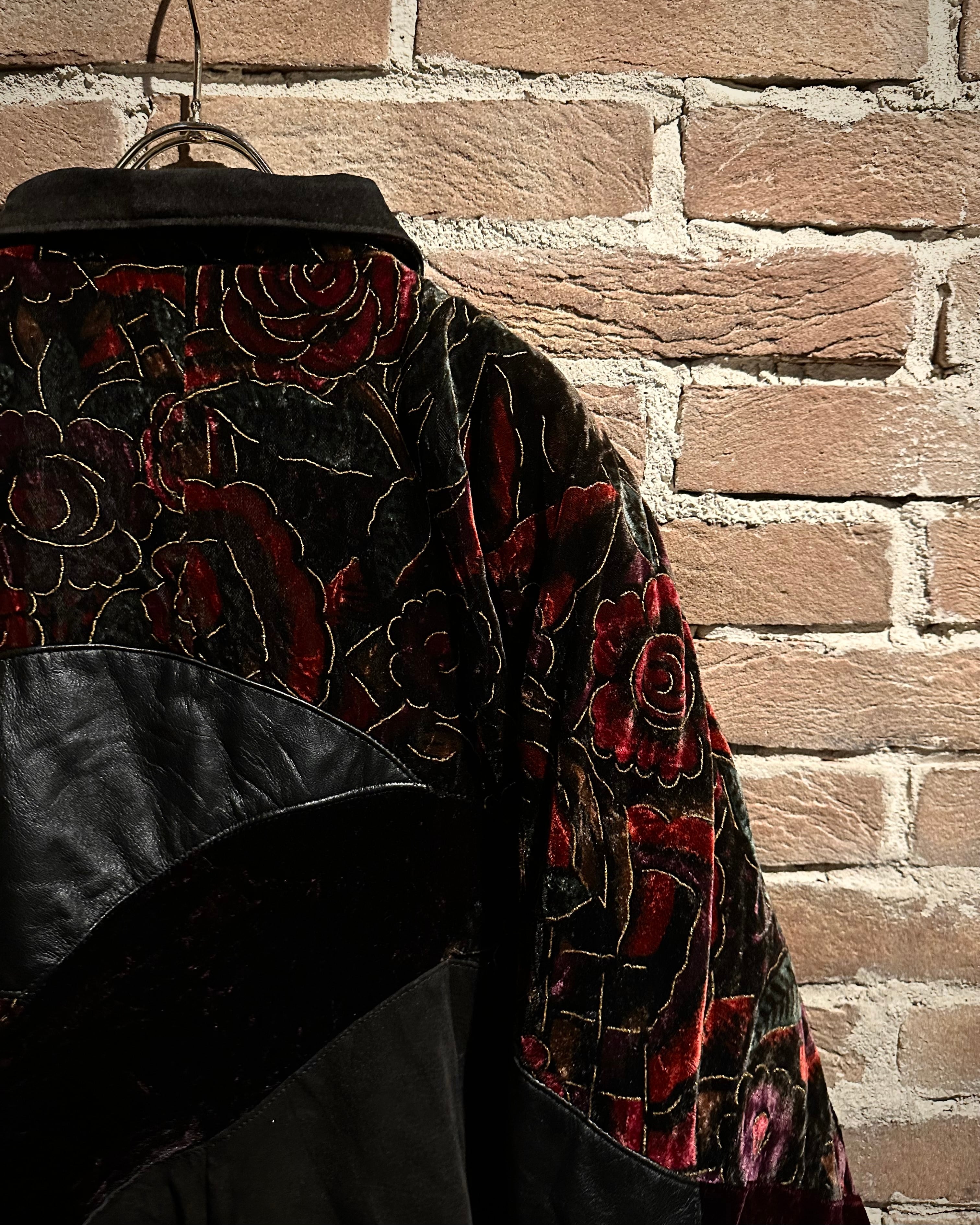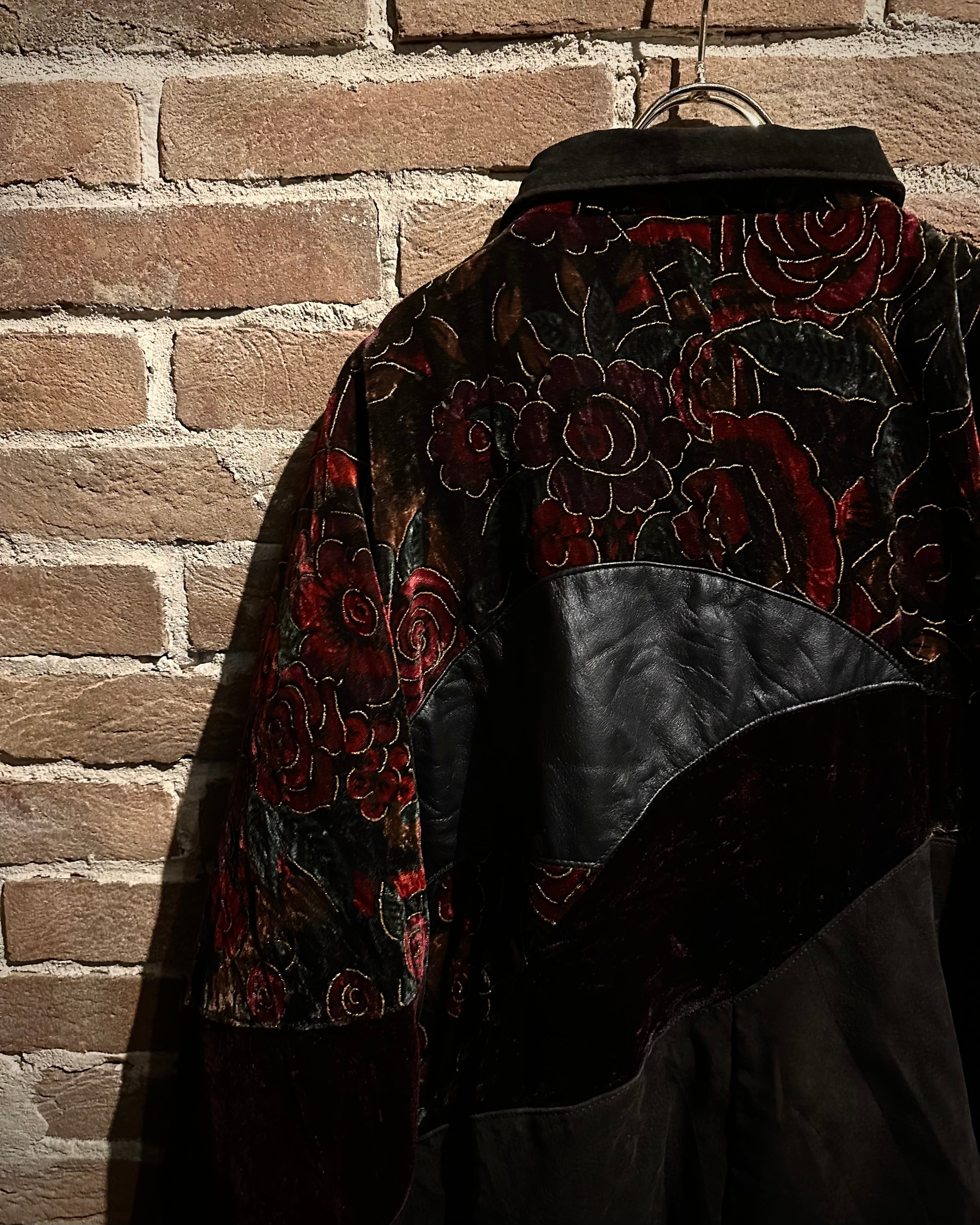 重厚なレザーと妖艶な薔薇柄ベロアを大胆に切り替えた、存在感抜群のスペシャルピース。
