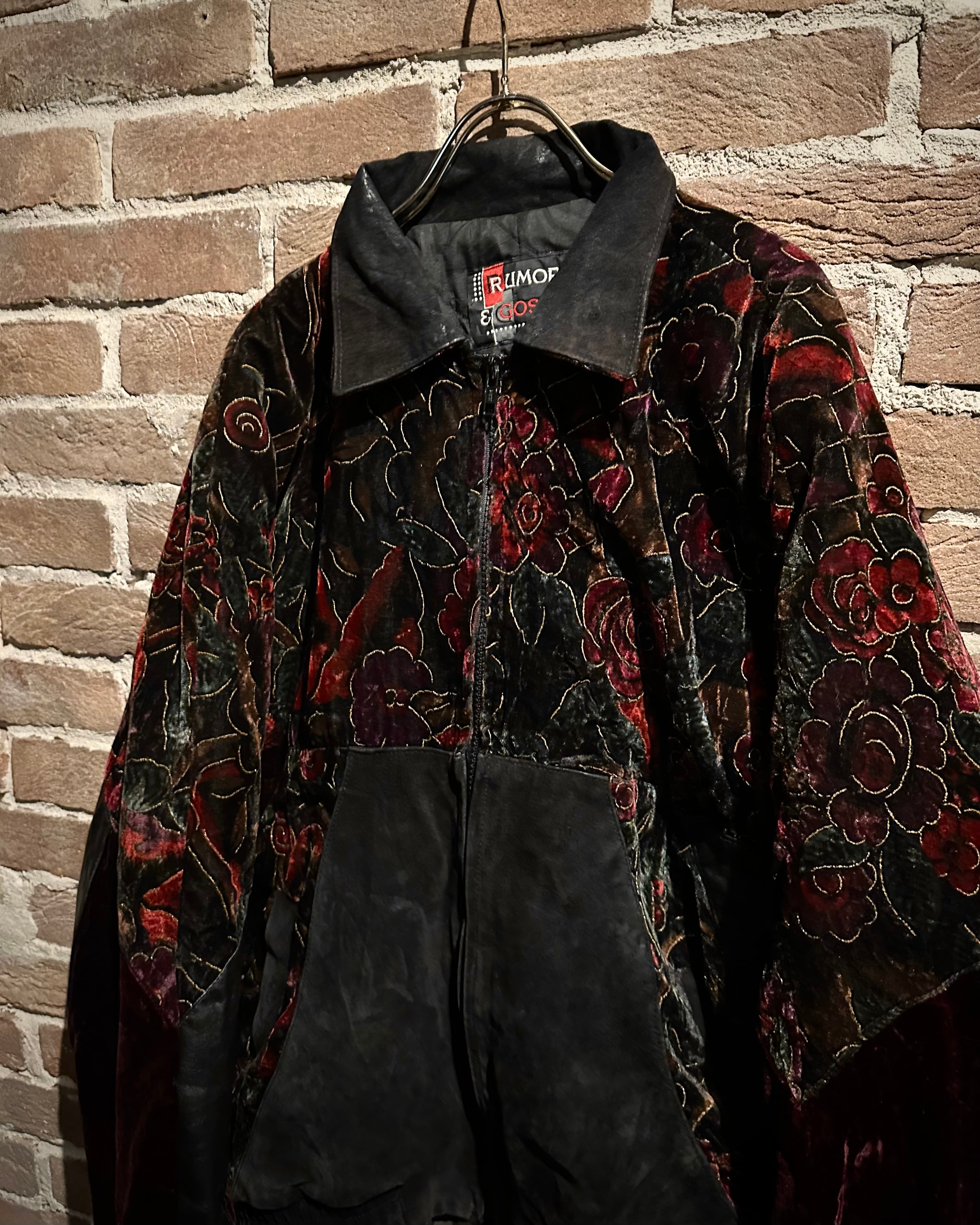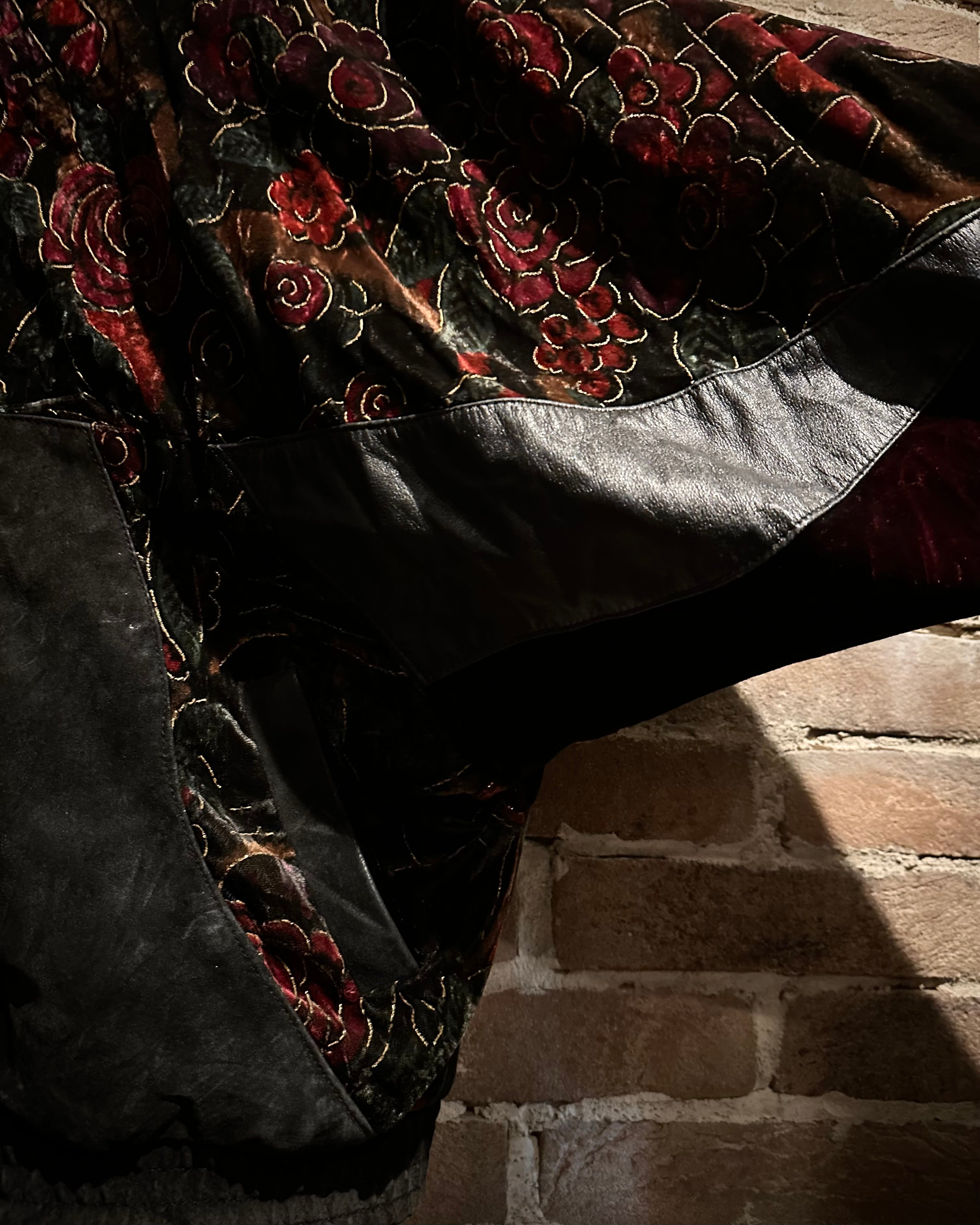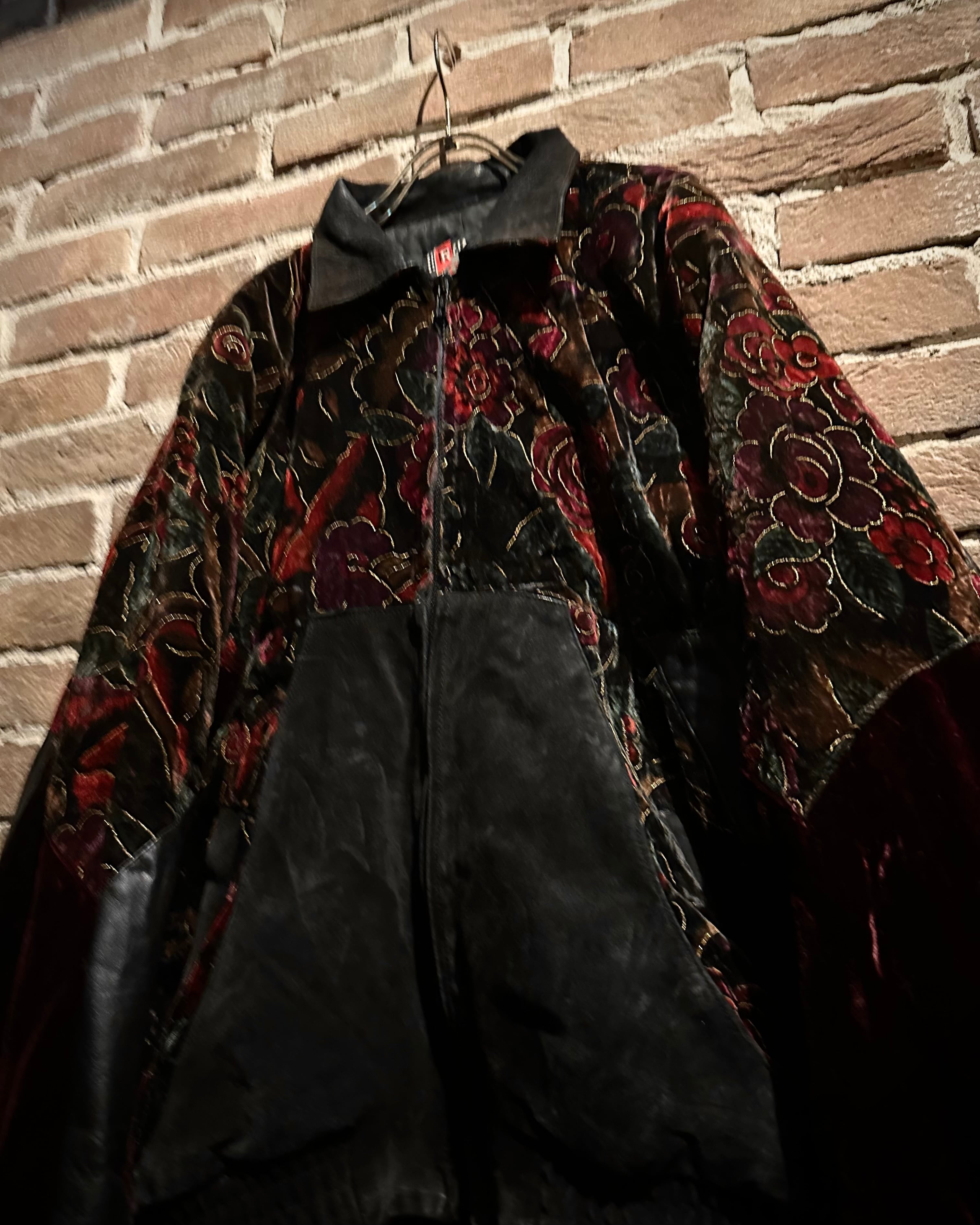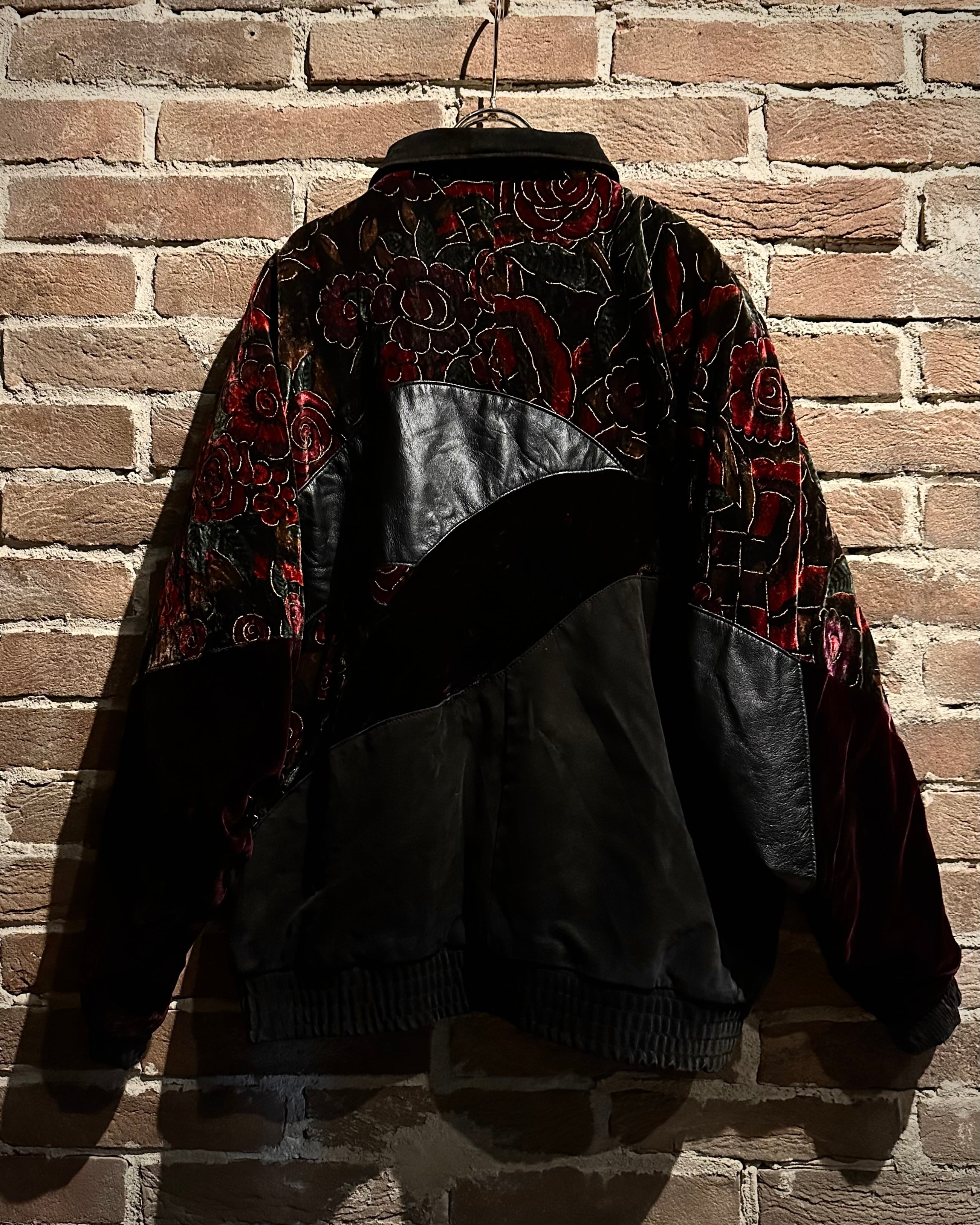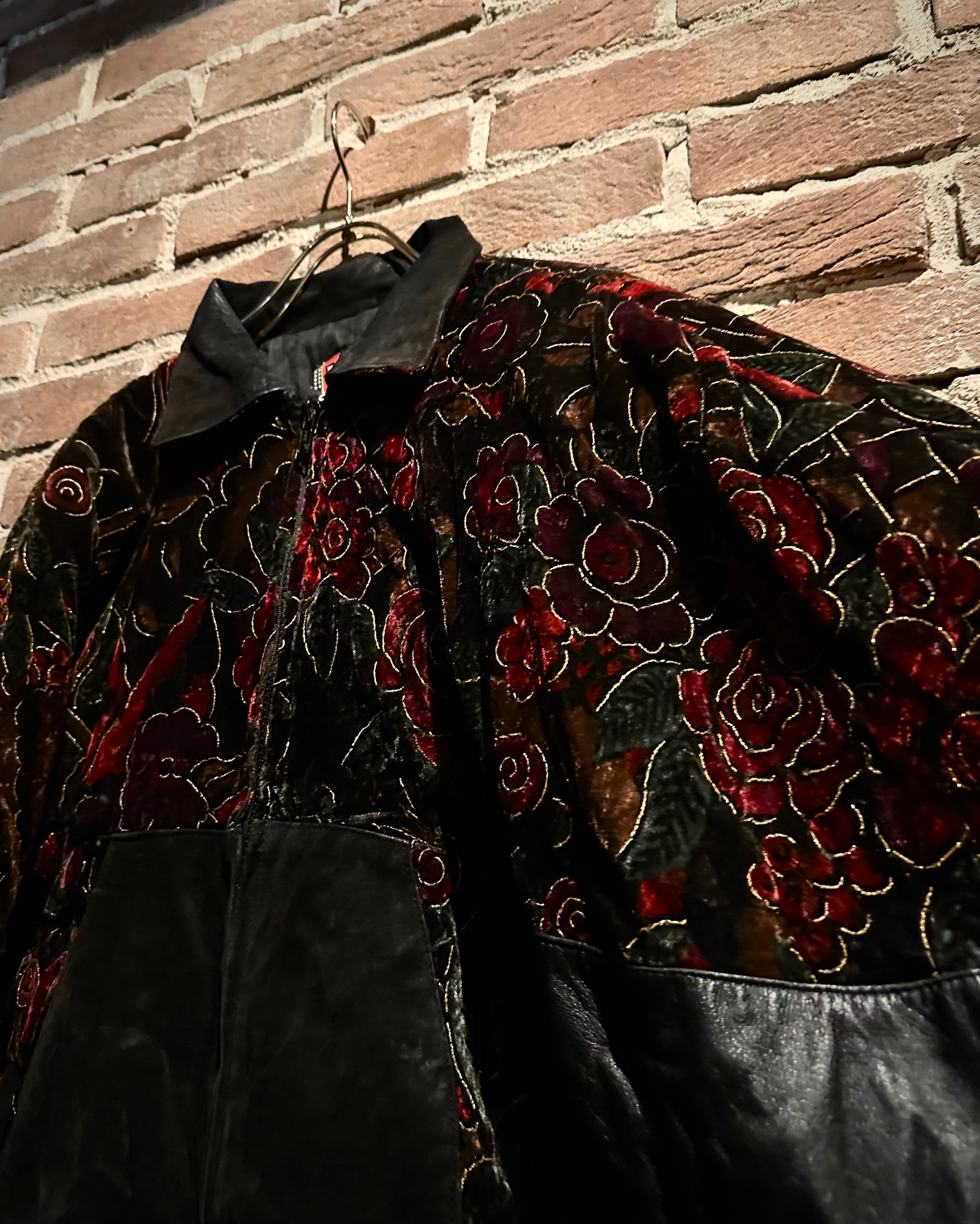 重厚なレザーと妖艶な薔薇柄ベロアを大胆に切り替えた、存在感抜群のスペシャルピース。