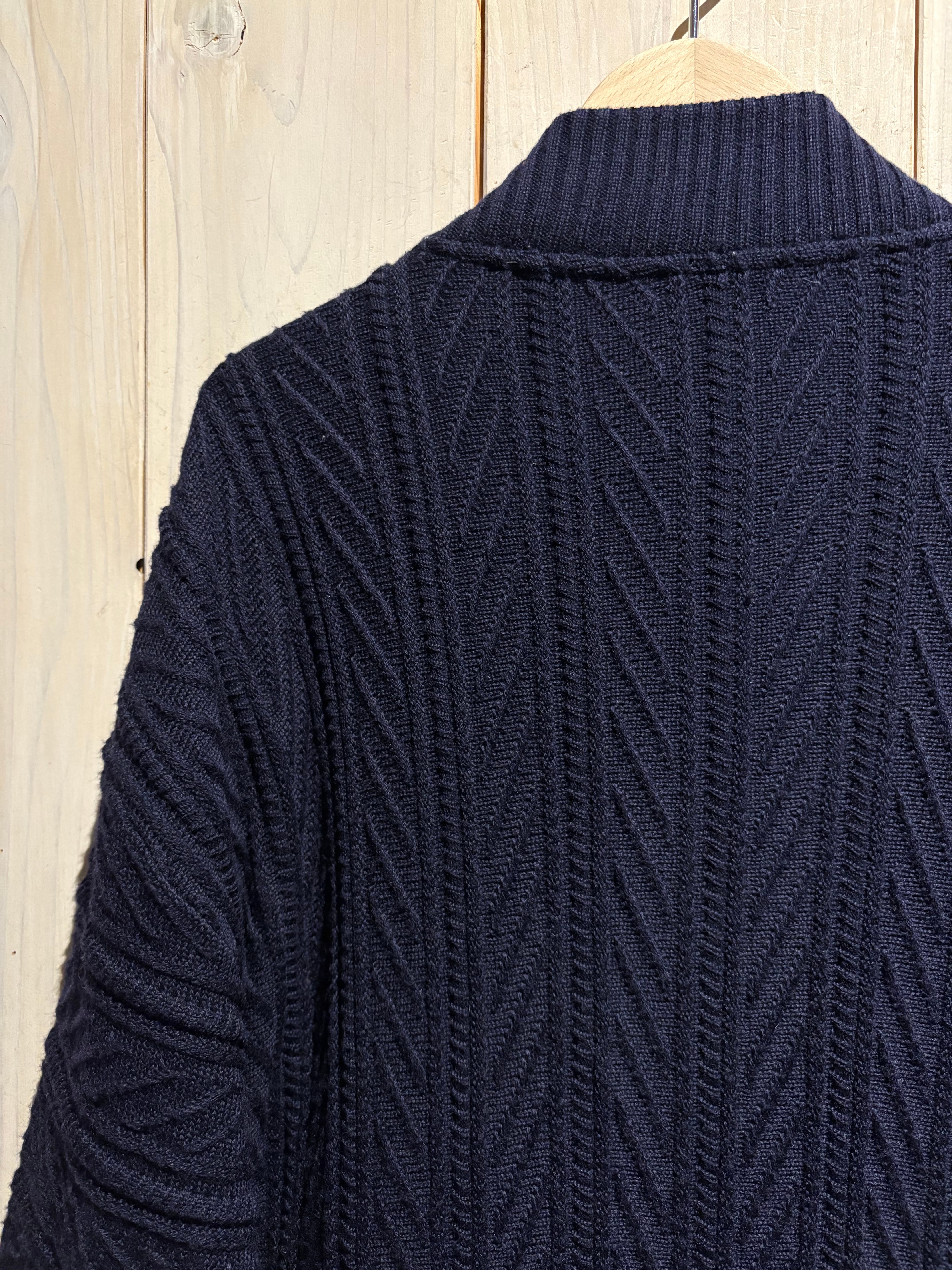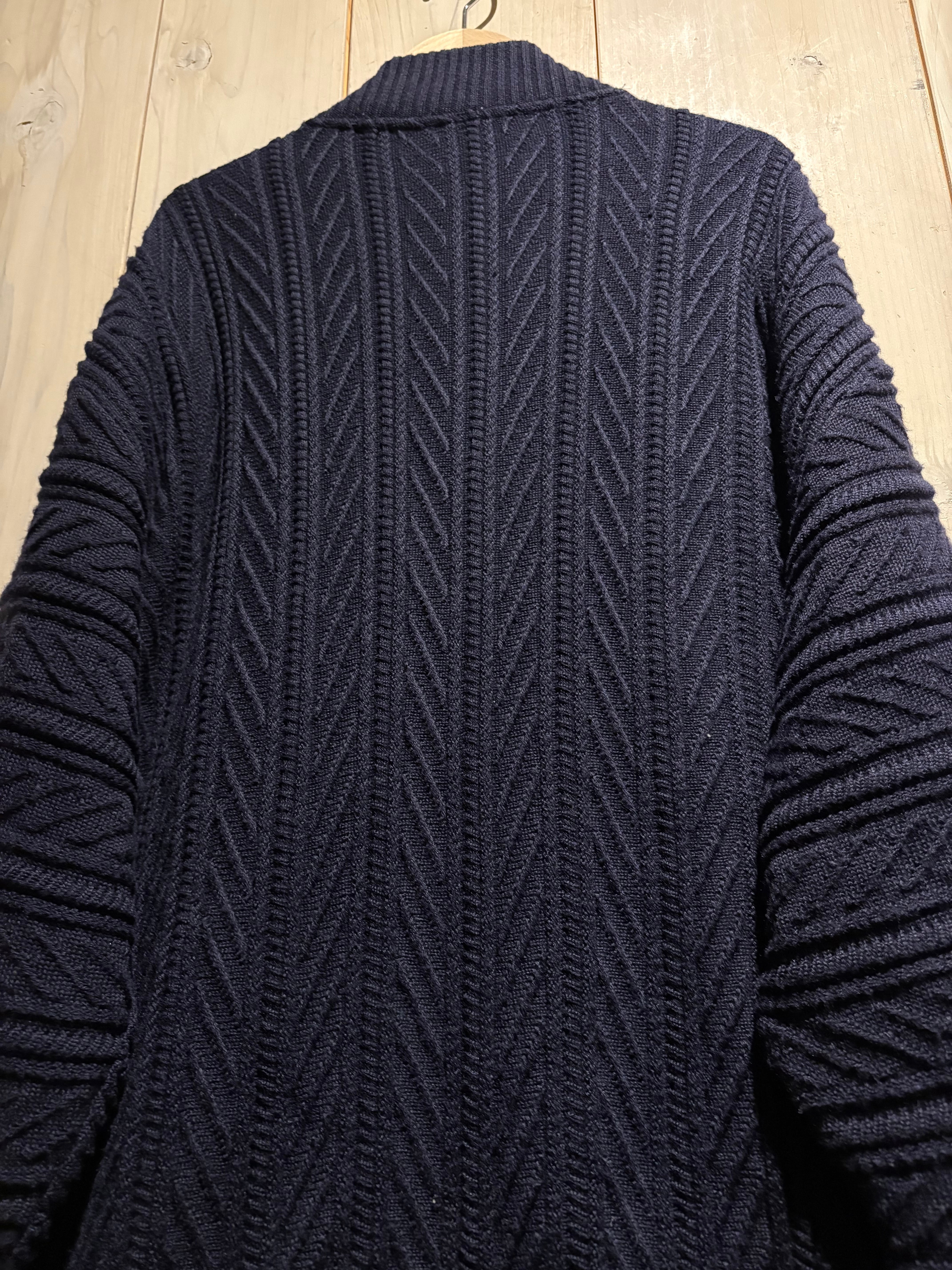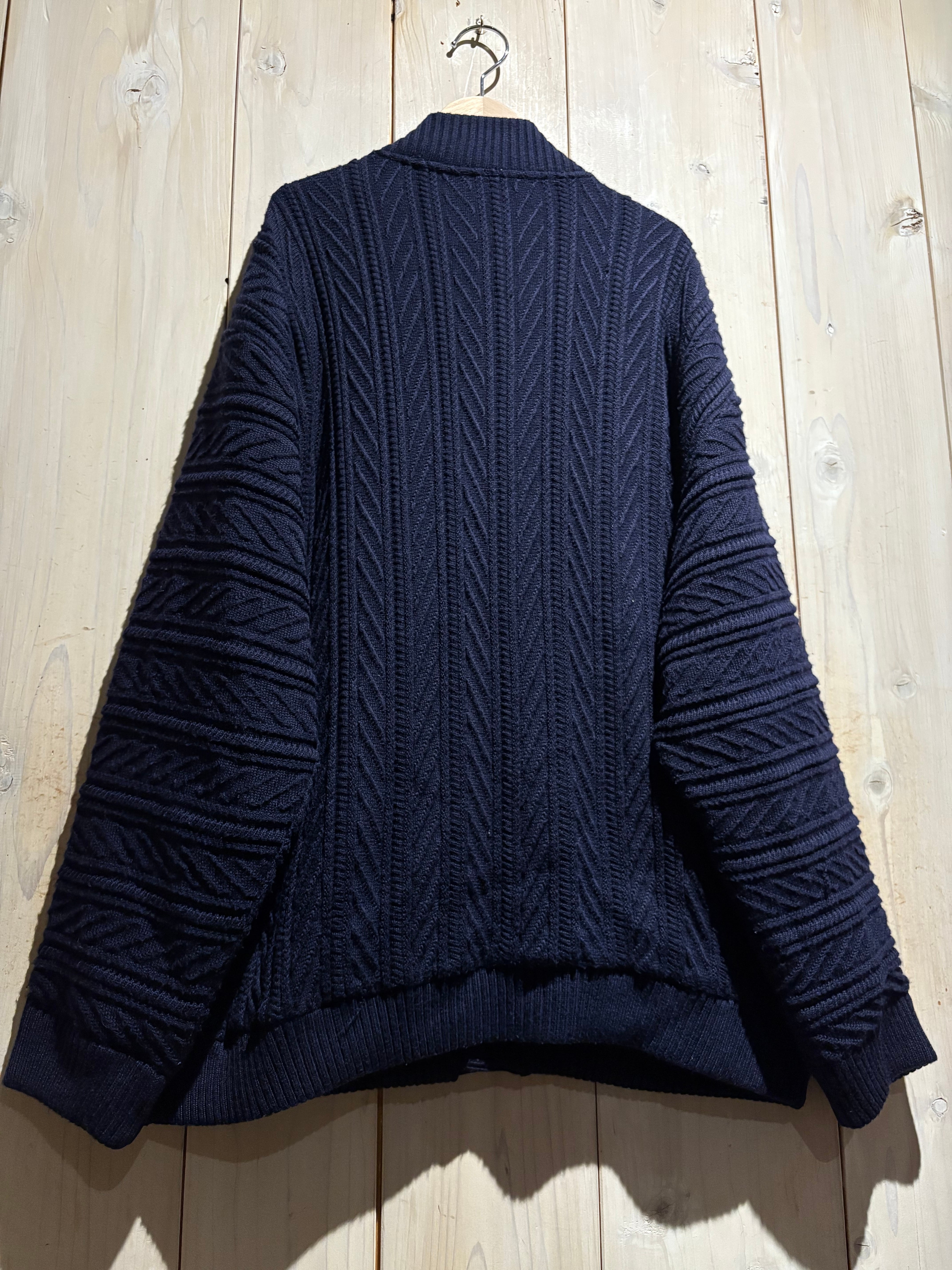 ボディは立体感のある編み地で、3Dの編み柄が視覚的な奥行きを演出。しっかりと肉感のあるニットは保温性も高く、裏地付きなので春先のアウターとして活躍してくれるかと。
