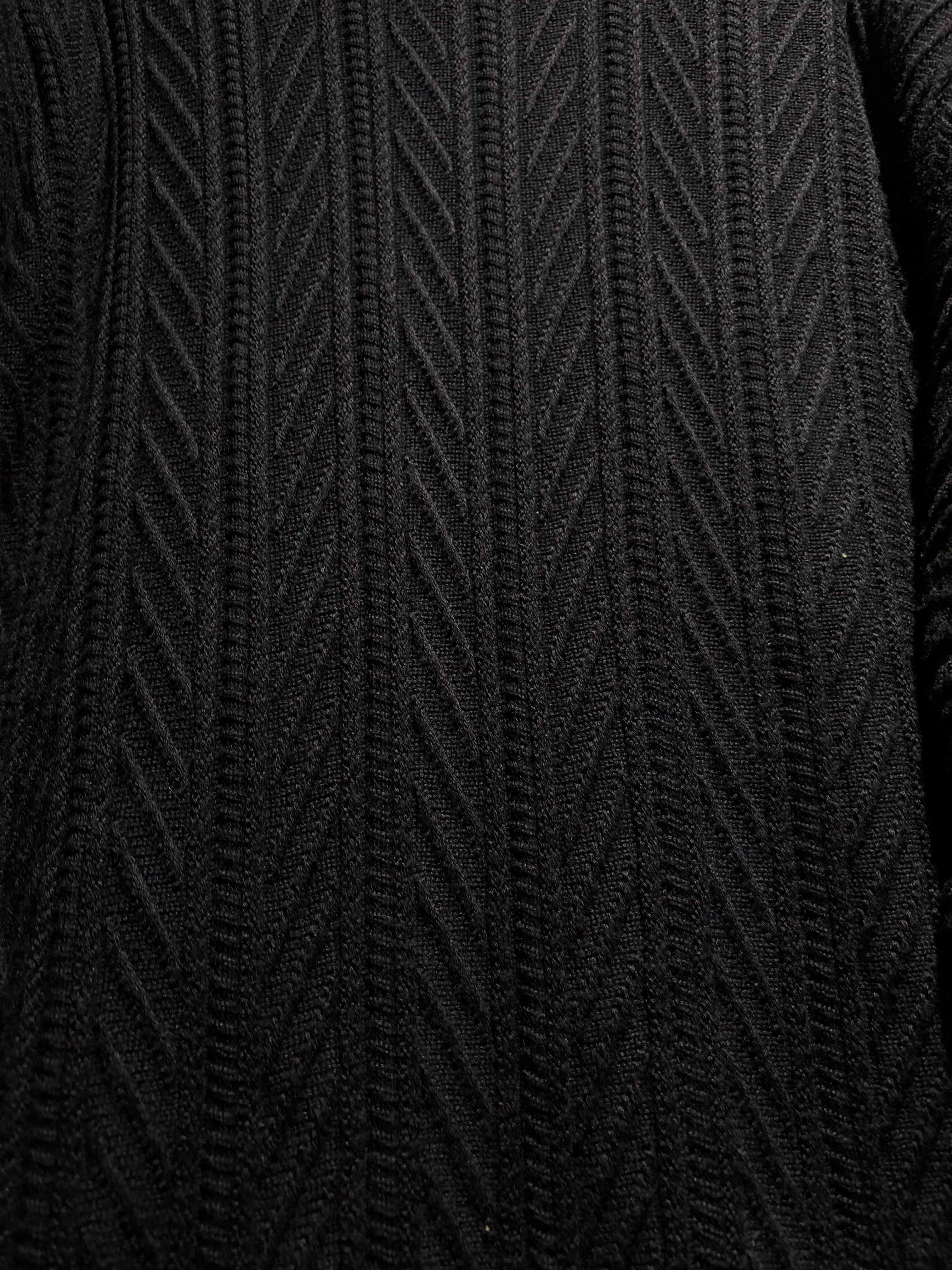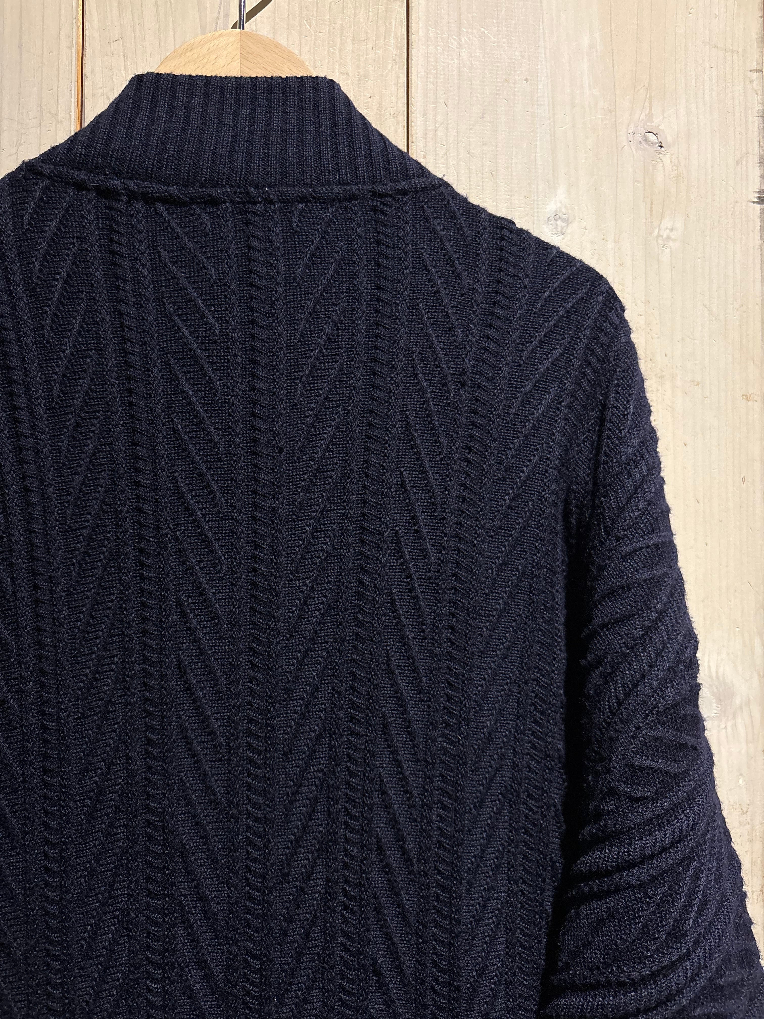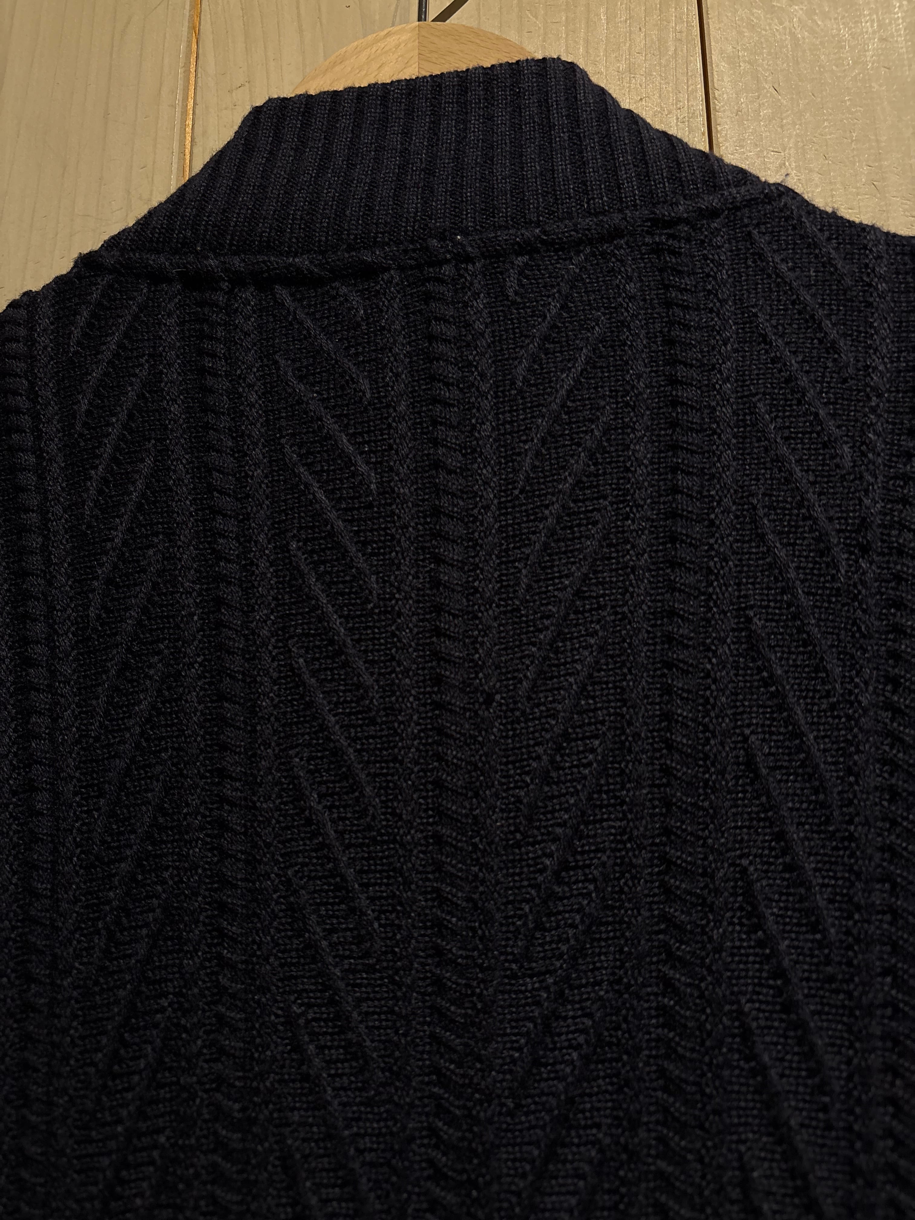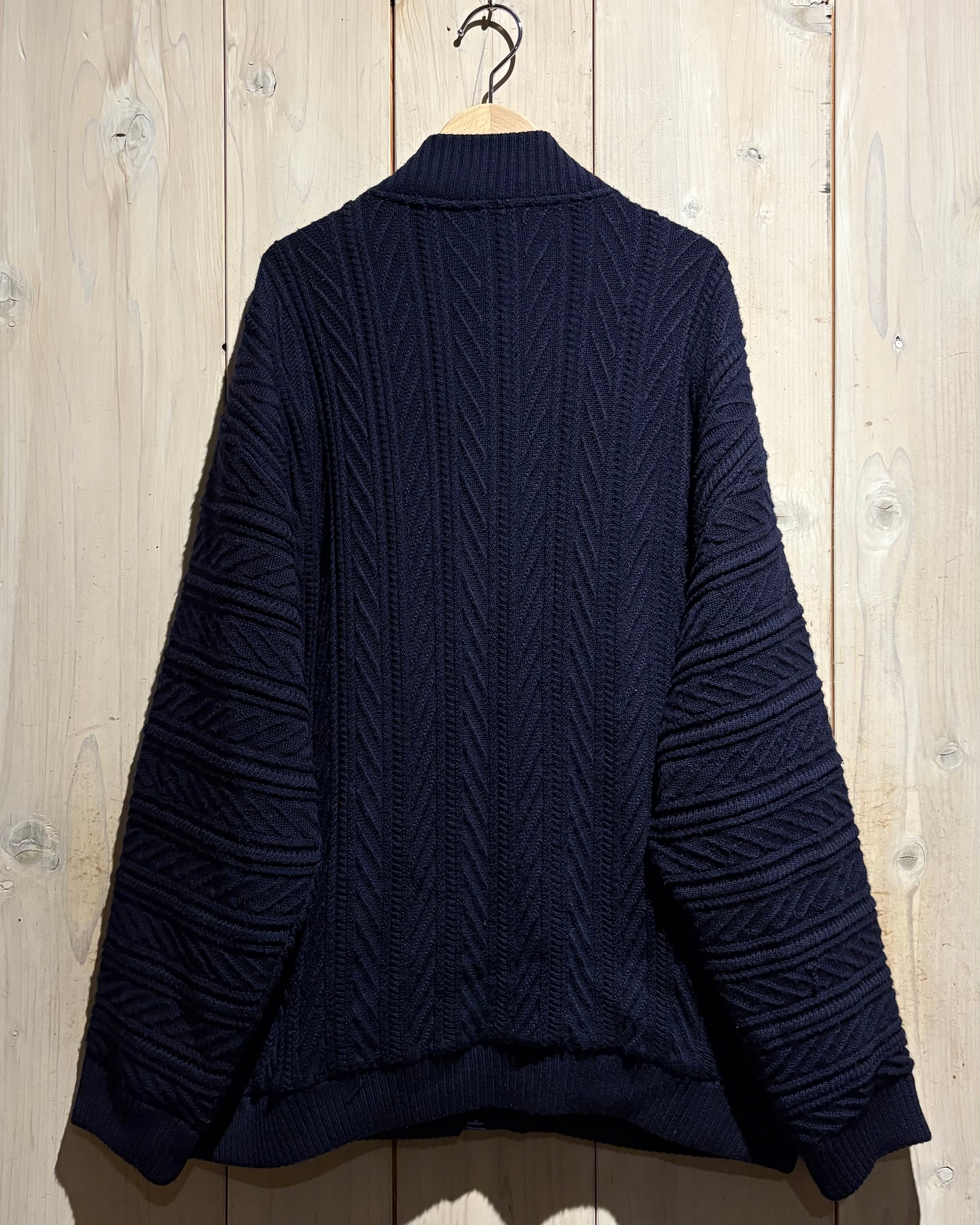 ボディは立体感のある編み地で、3Dの編み柄が視覚的な奥行きを演出。しっかりと肉感のあるニットは保温性も高く、裏地付きなので春先のアウターとして活躍してくれるかと。