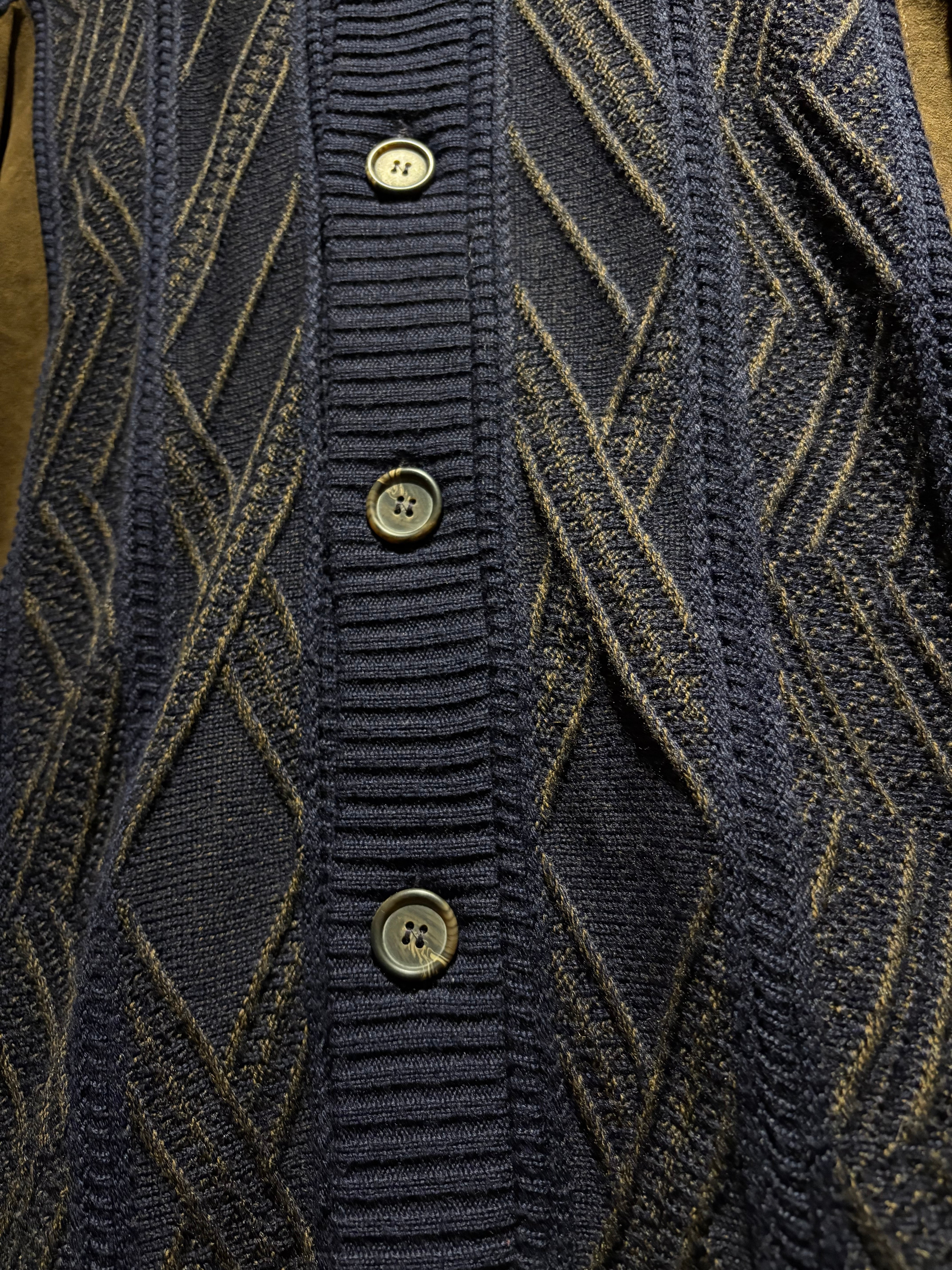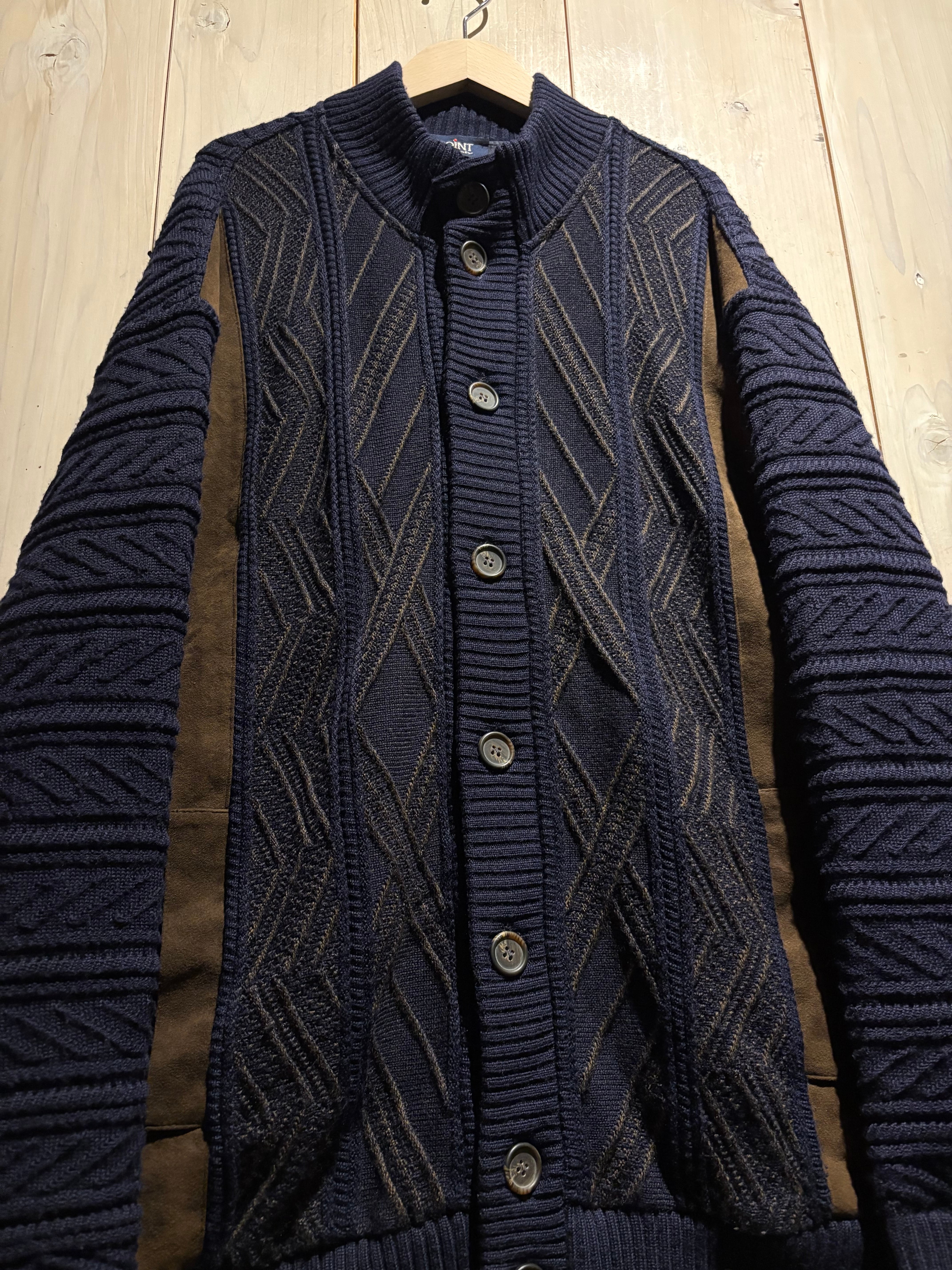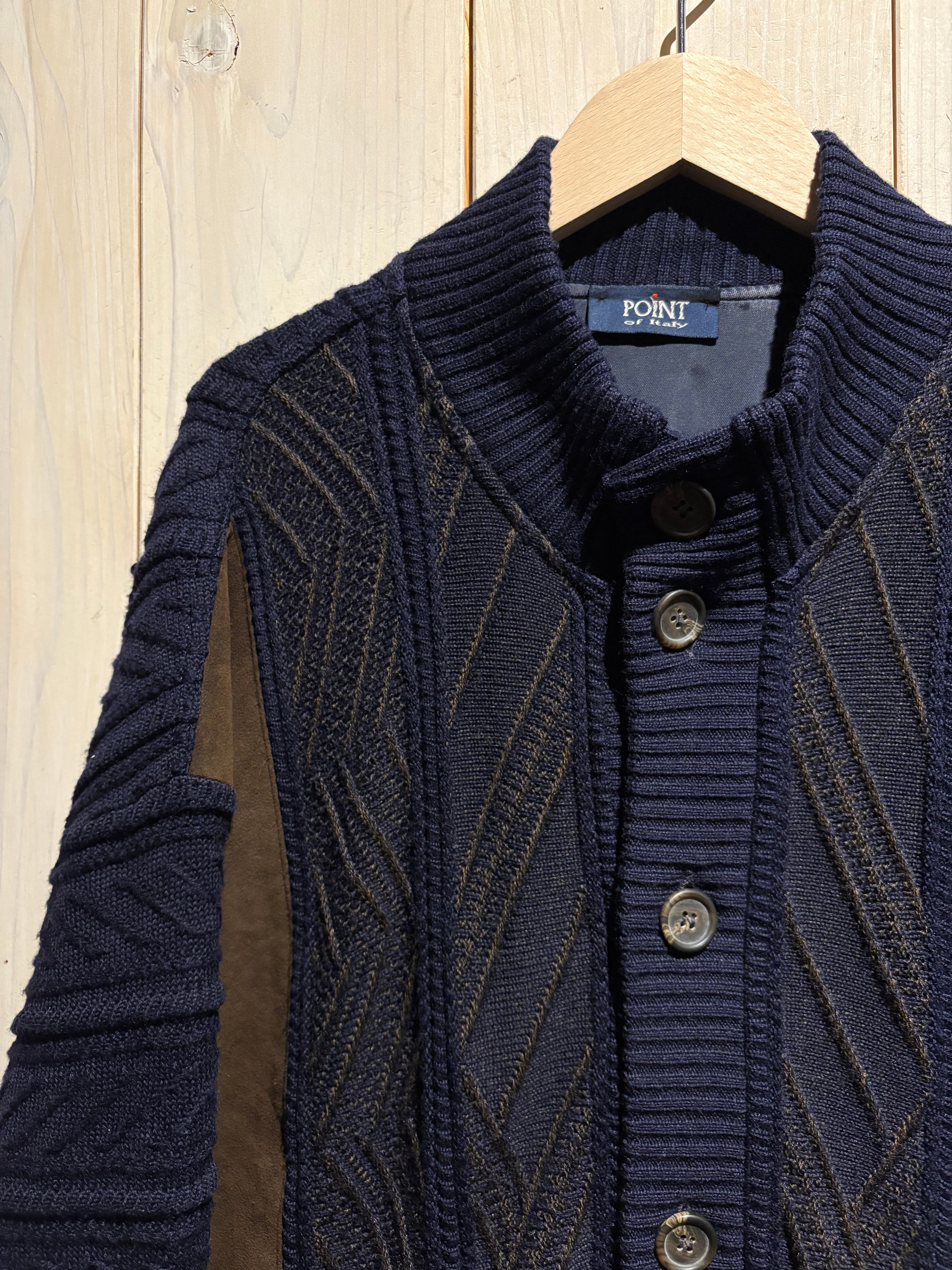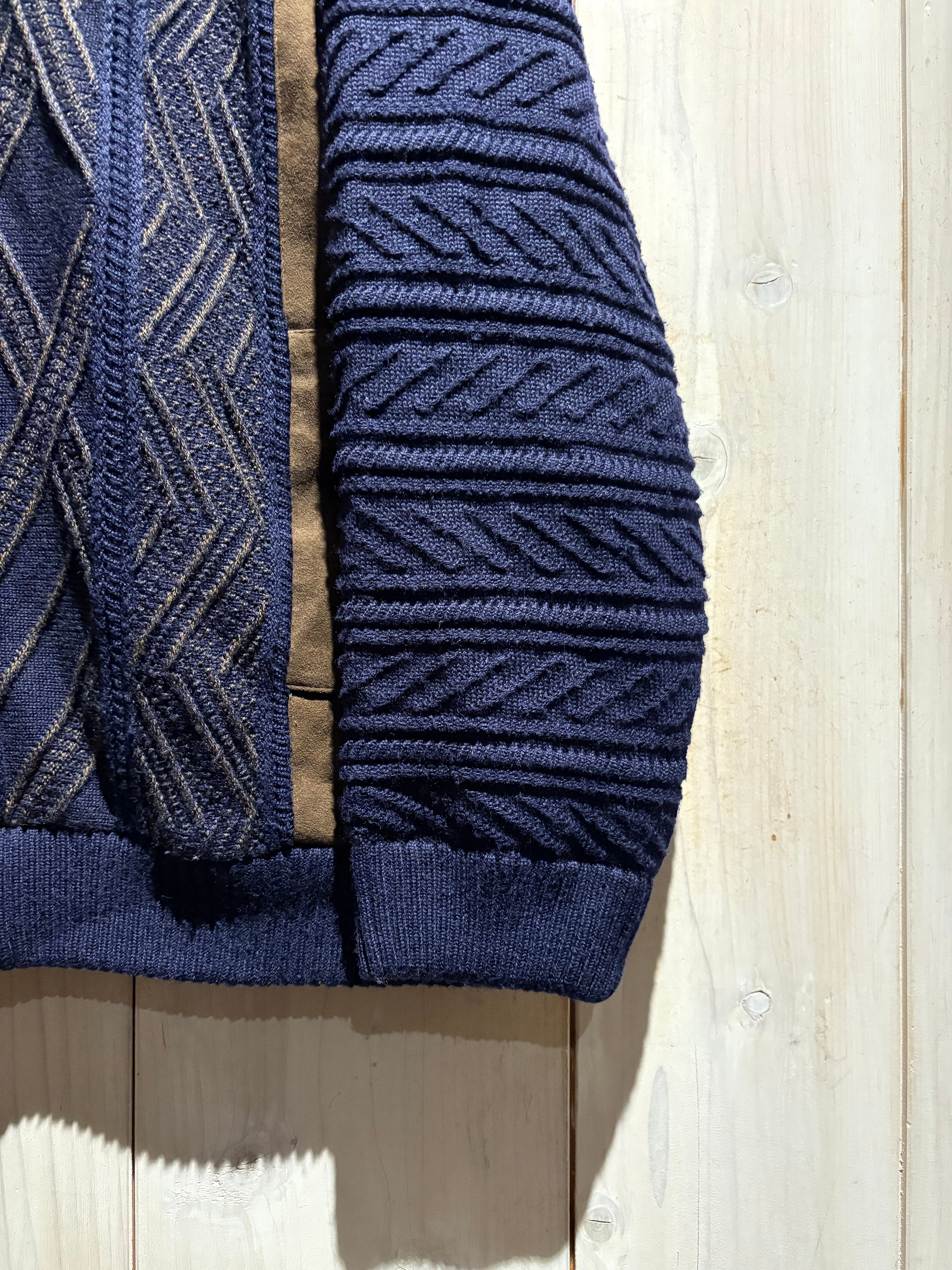 深みのあるネイビーボディをベースに、両袖へブラウンのスエードレザーを大胆に切り替えた1着。クラシックなニットジャケットの佇まいに、異素材コンビネーションでモダンなエッセンスを加えた、イタリアらしいバランス感覚が光ります。