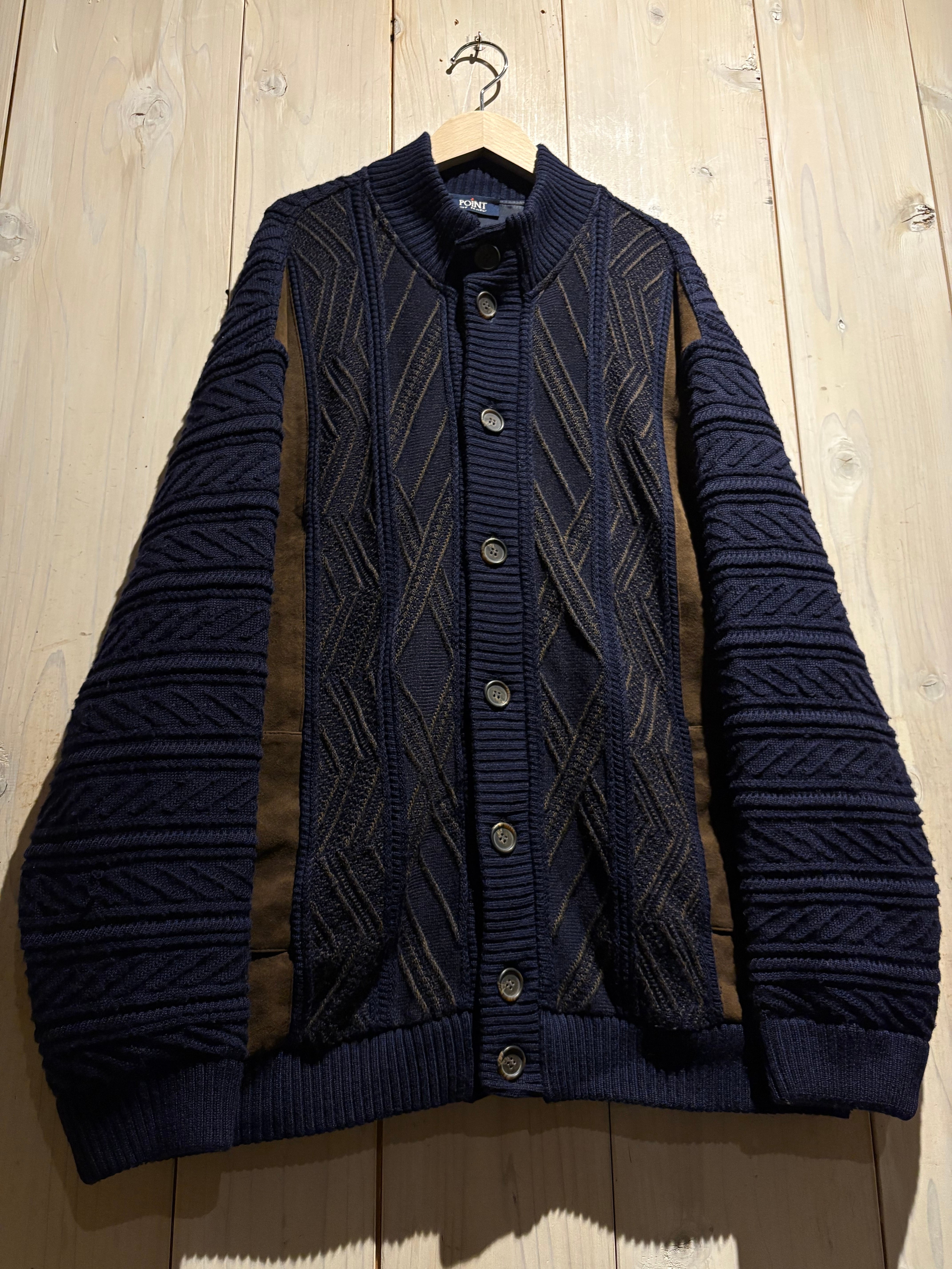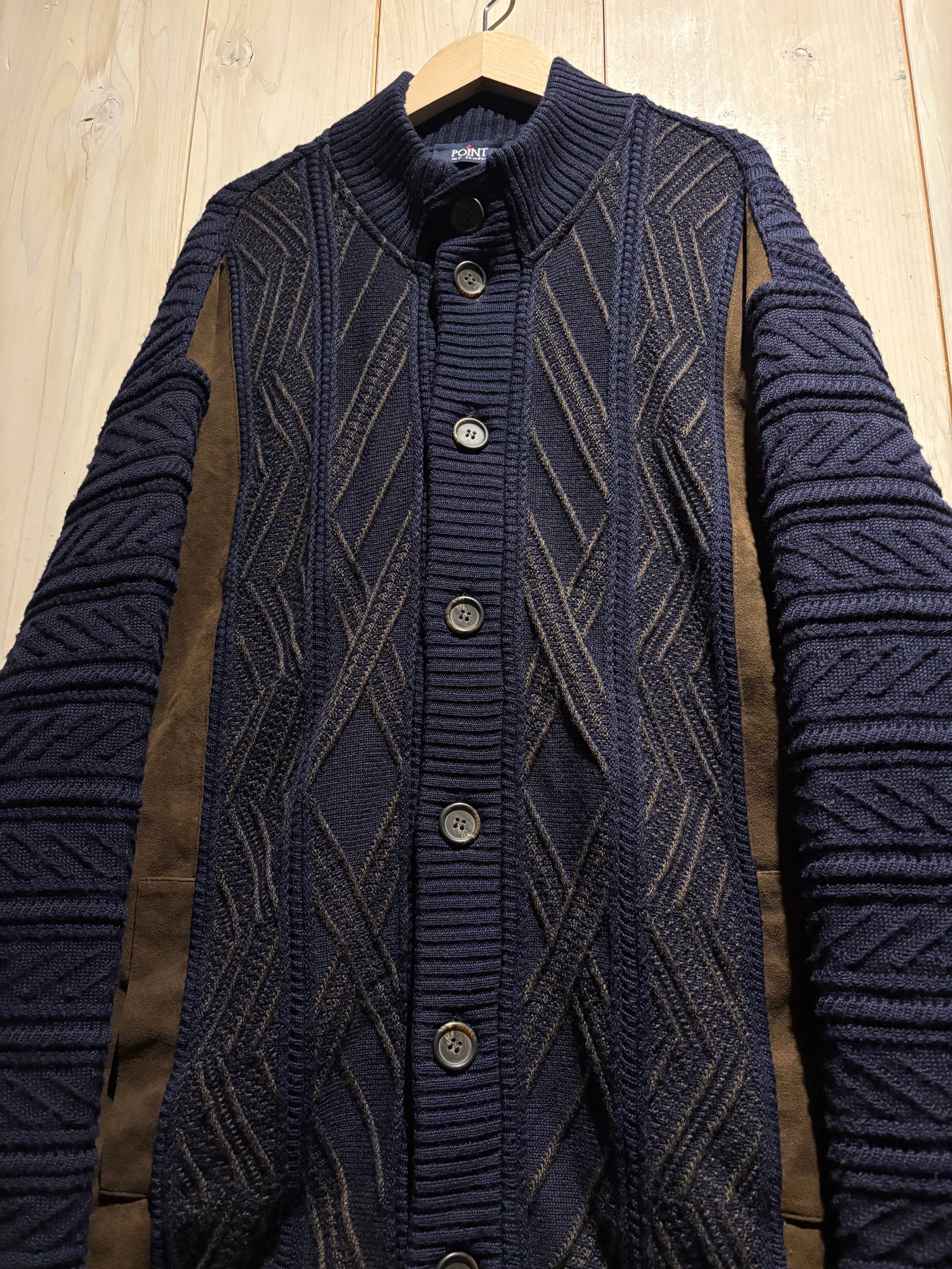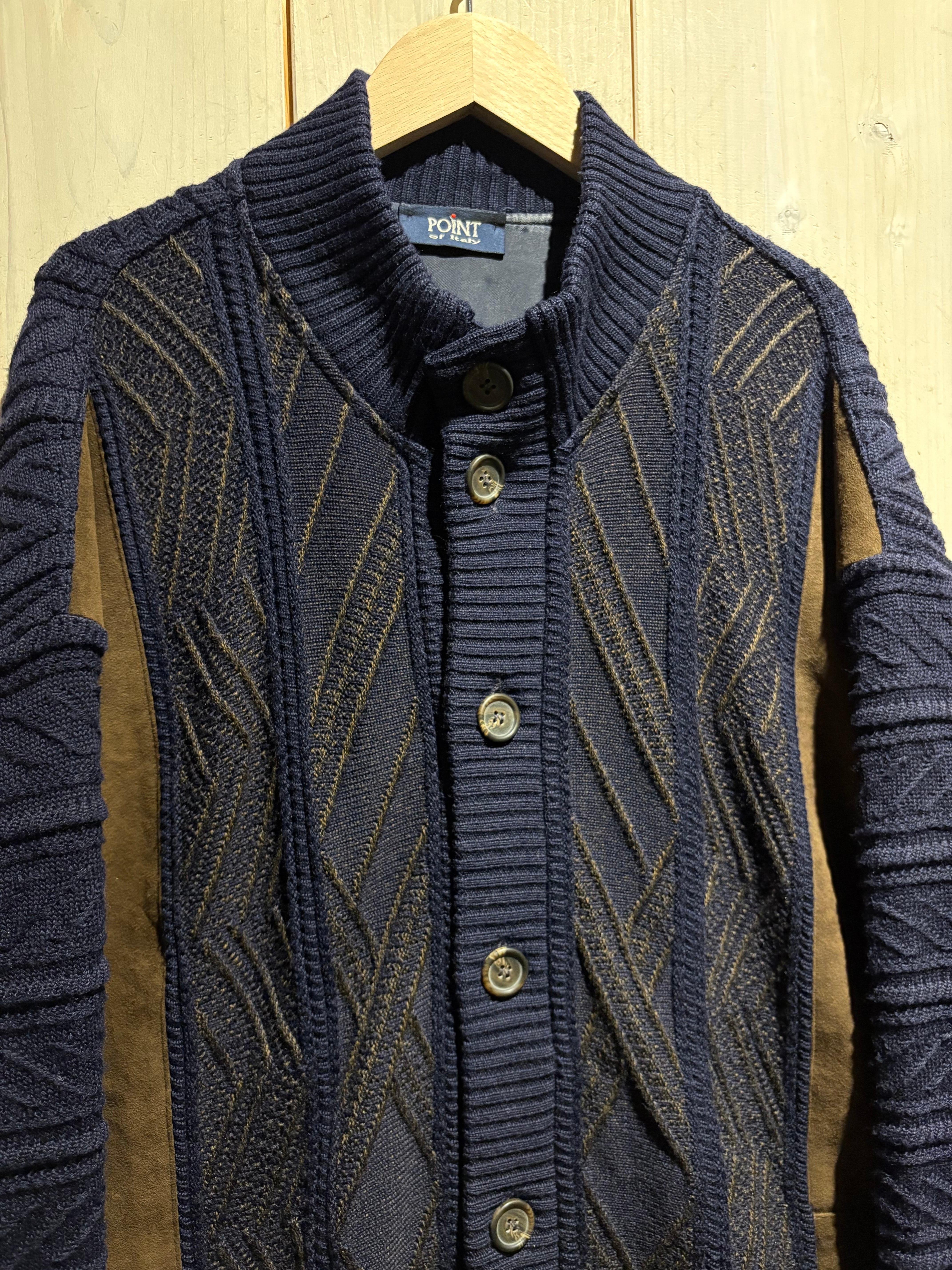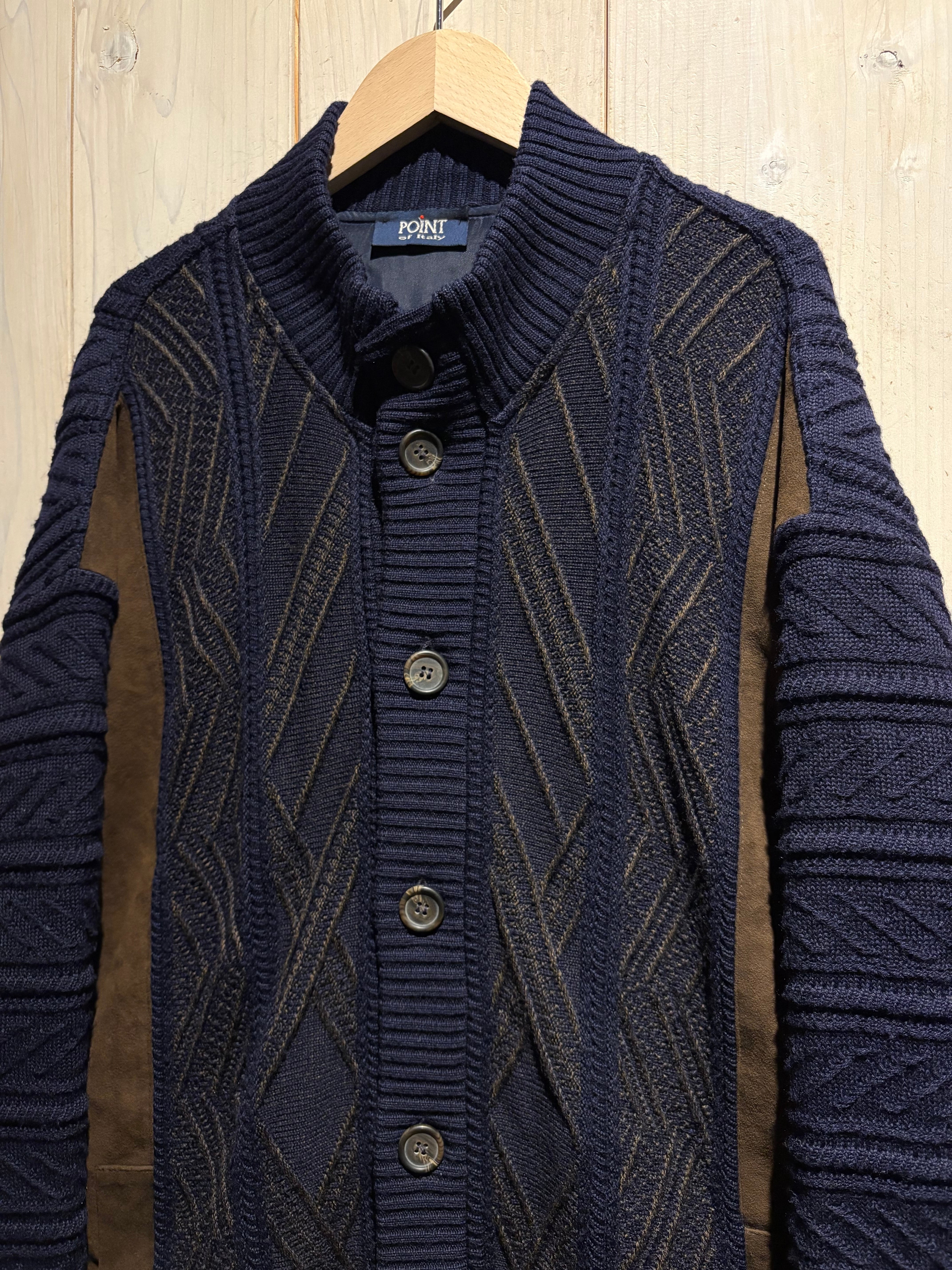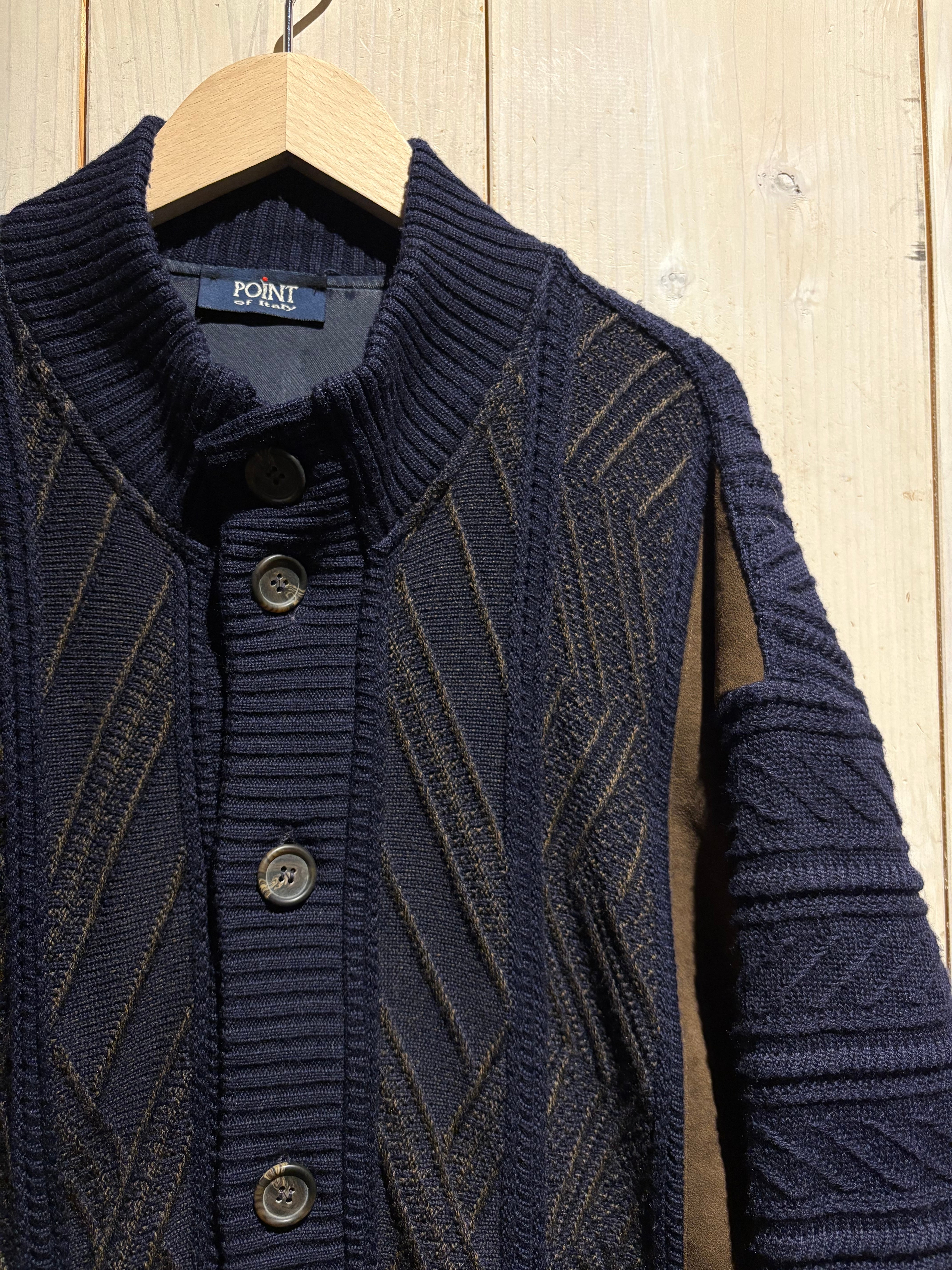 深みのあるネイビーボディをベースに、両袖へブラウンのスエードレザーを大胆に切り替えた1着。クラシックなニットジャケットの佇まいに、異素材コンビネーションでモダンなエッセンスを加えた、イタリアらしいバランス感覚が光ります。