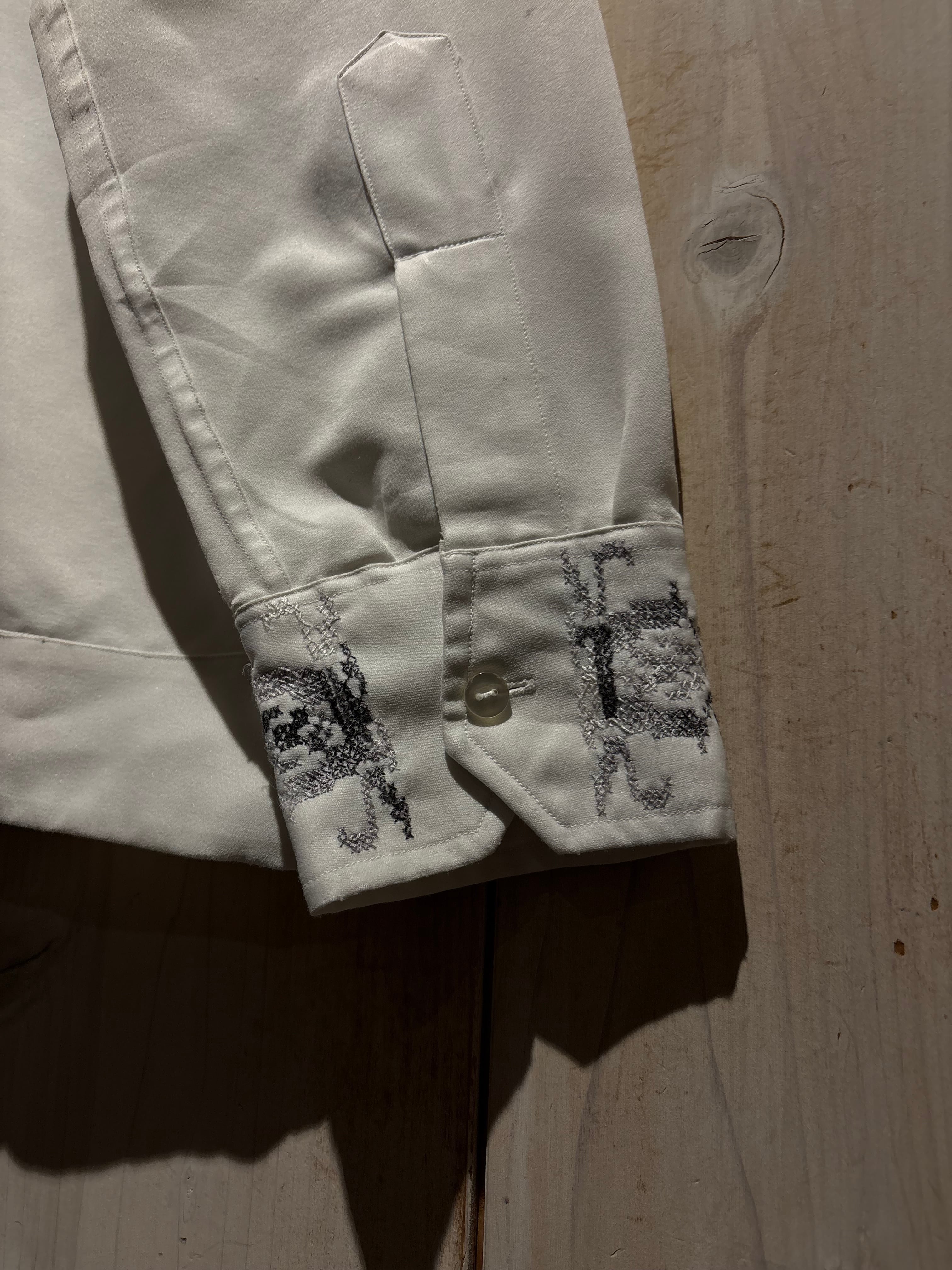 刺繍は細やかなクロスステッチ調で、カフスにも同様の刺繍が入り、細部まで統一感のあるデザインに。