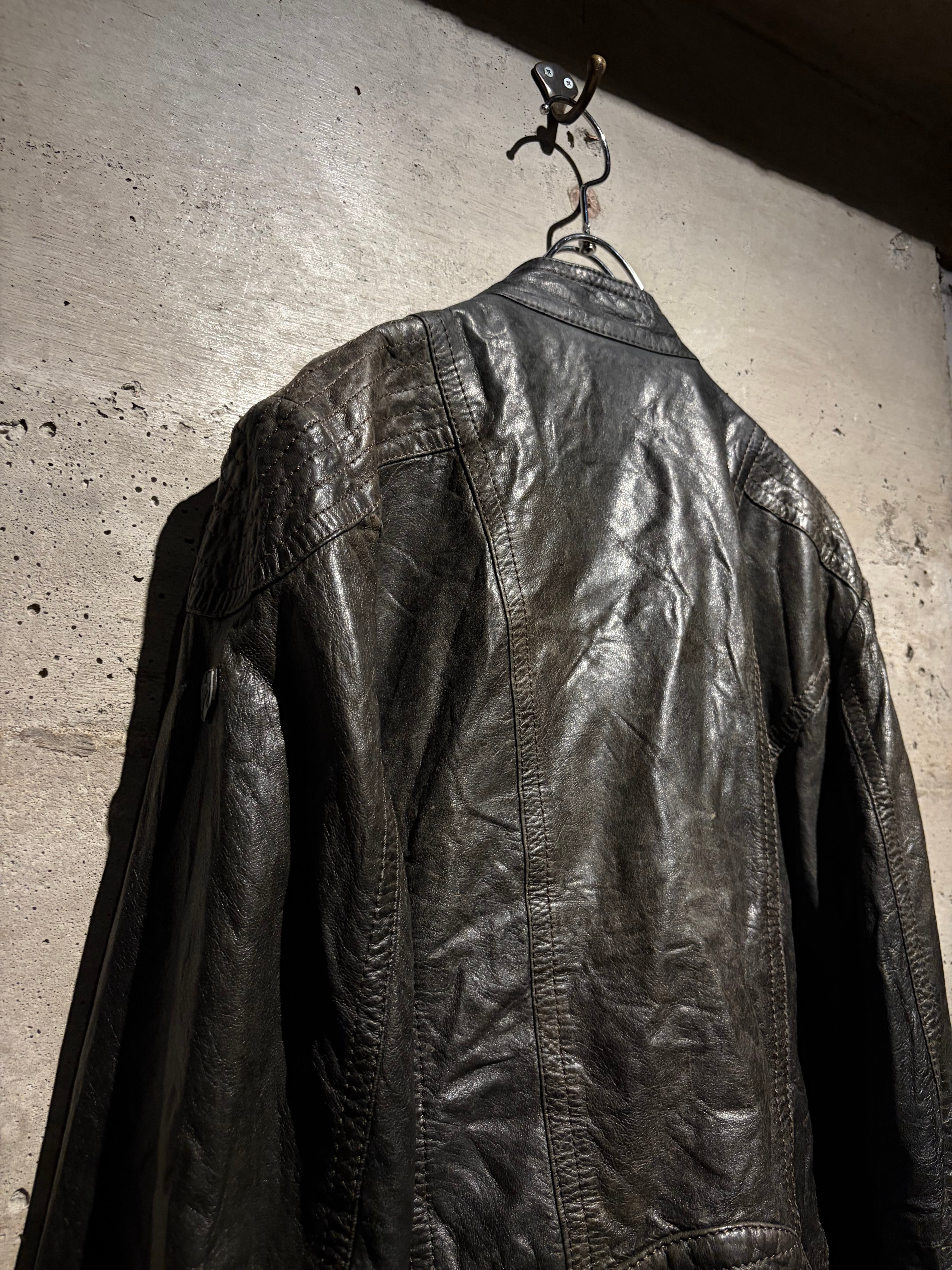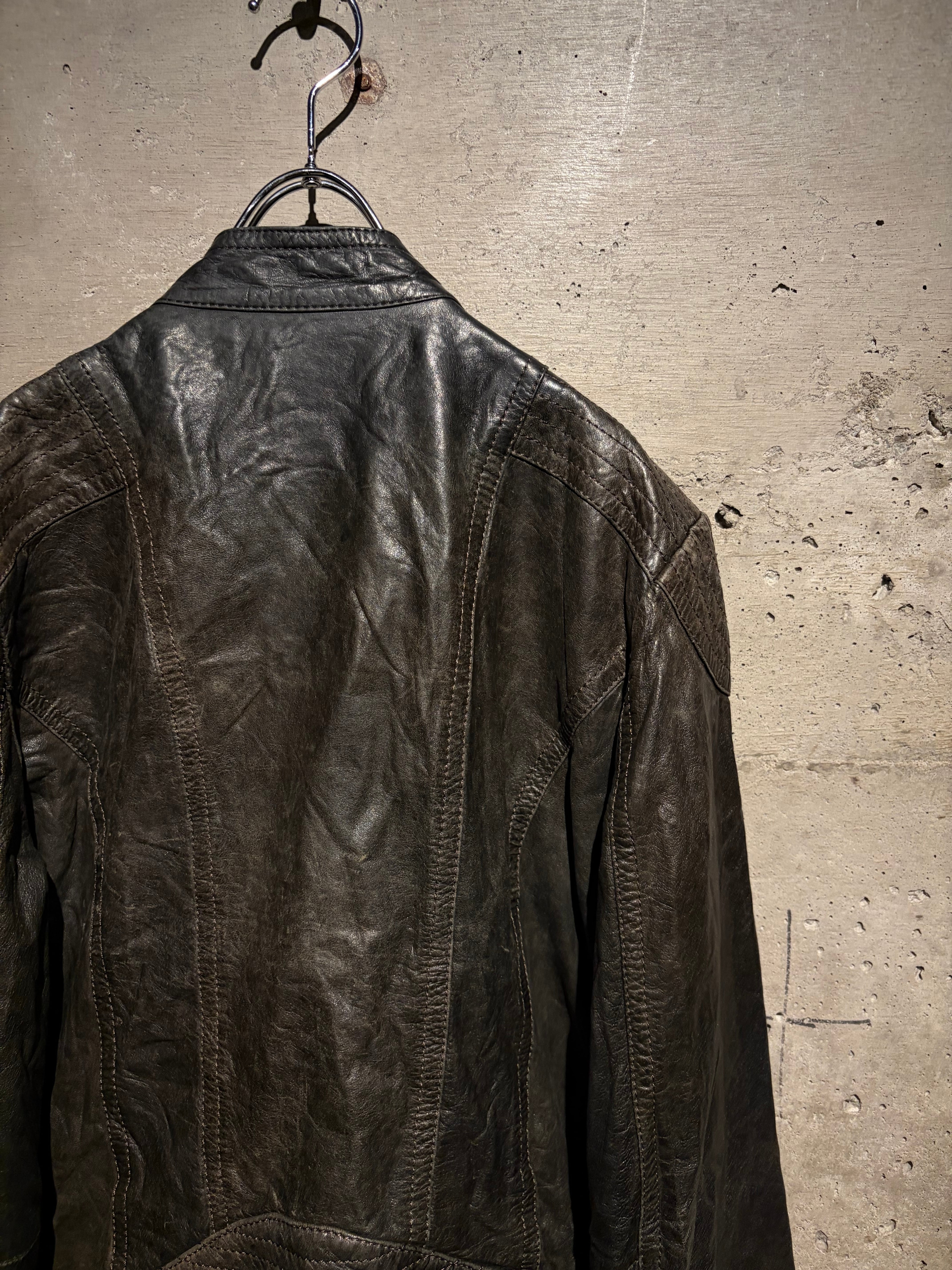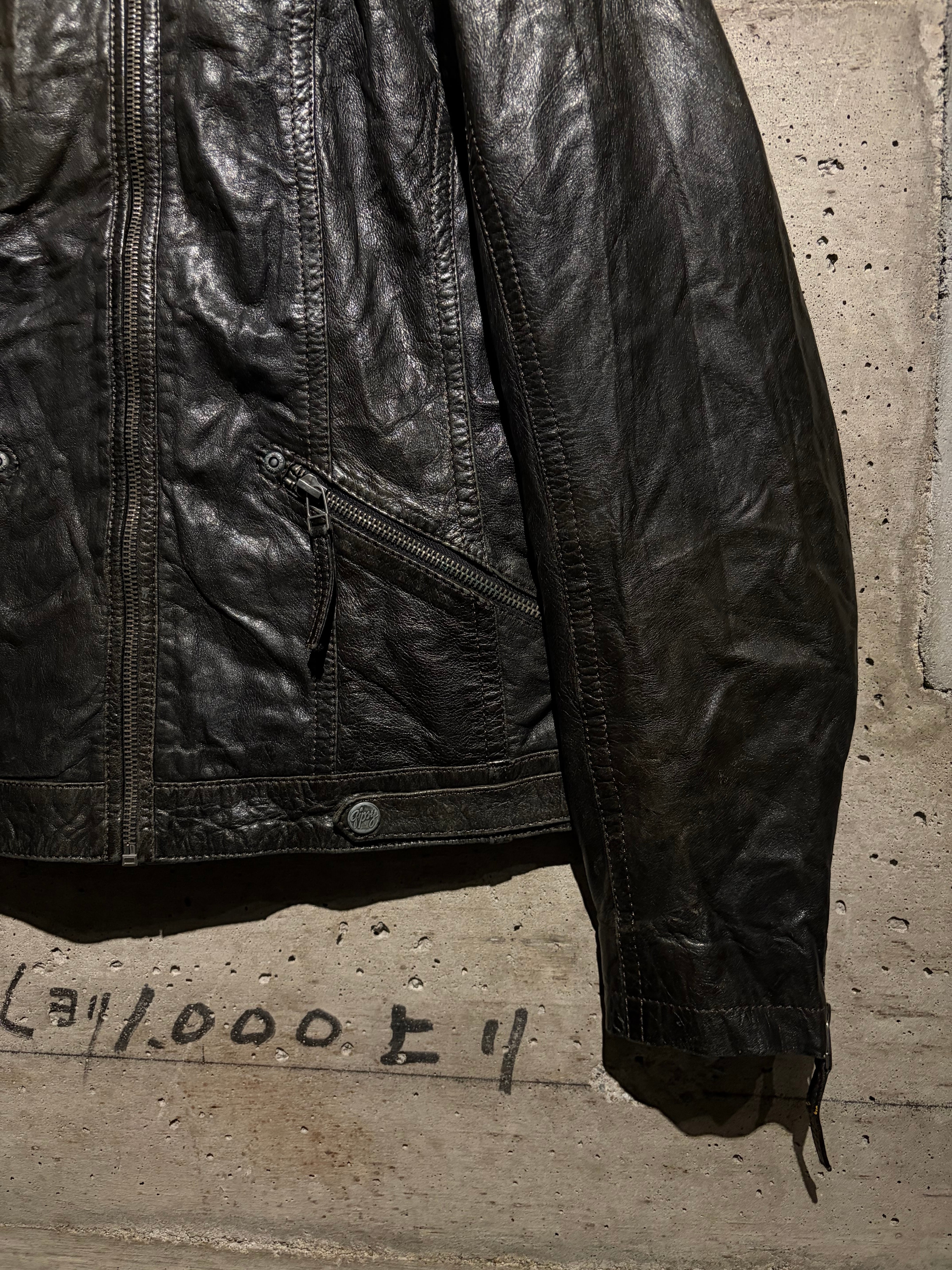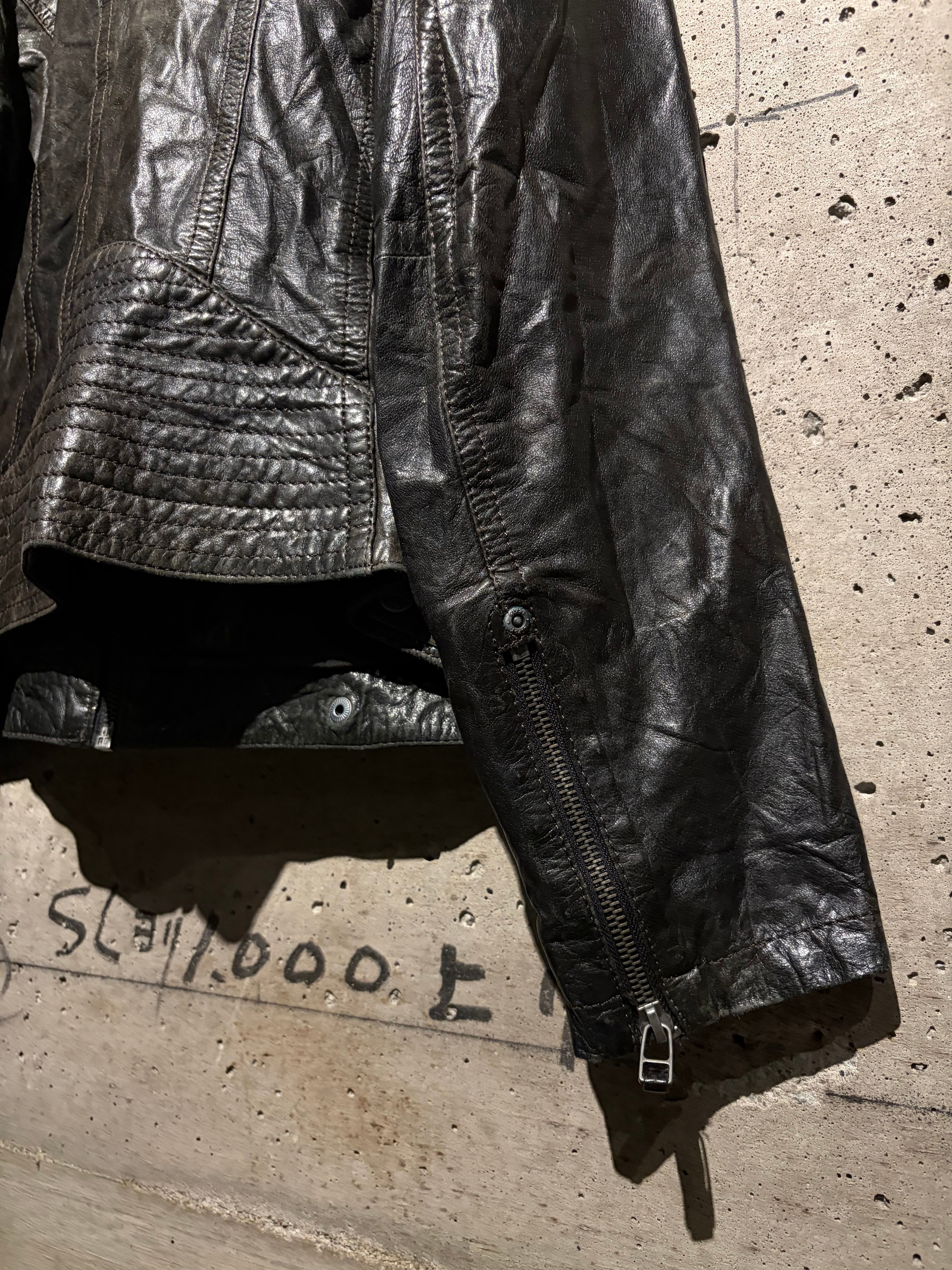 滑らかでありながらタフなテクスチャーのレザー。着用と経年により生まれたブラックレザー特有のフェード感、シボの表情や色の濃淡が自然な陰影は、古着ならではの魅力かと。