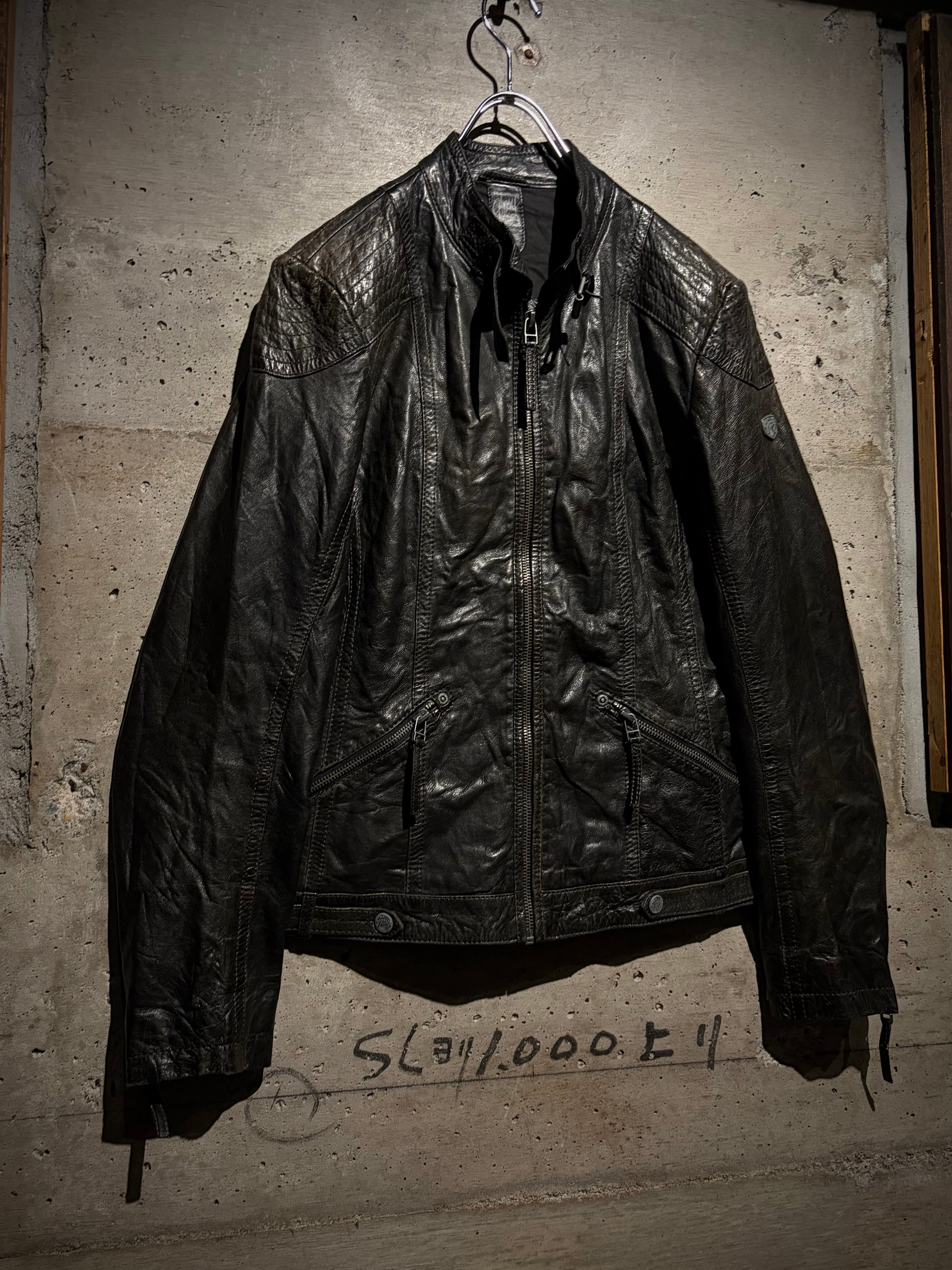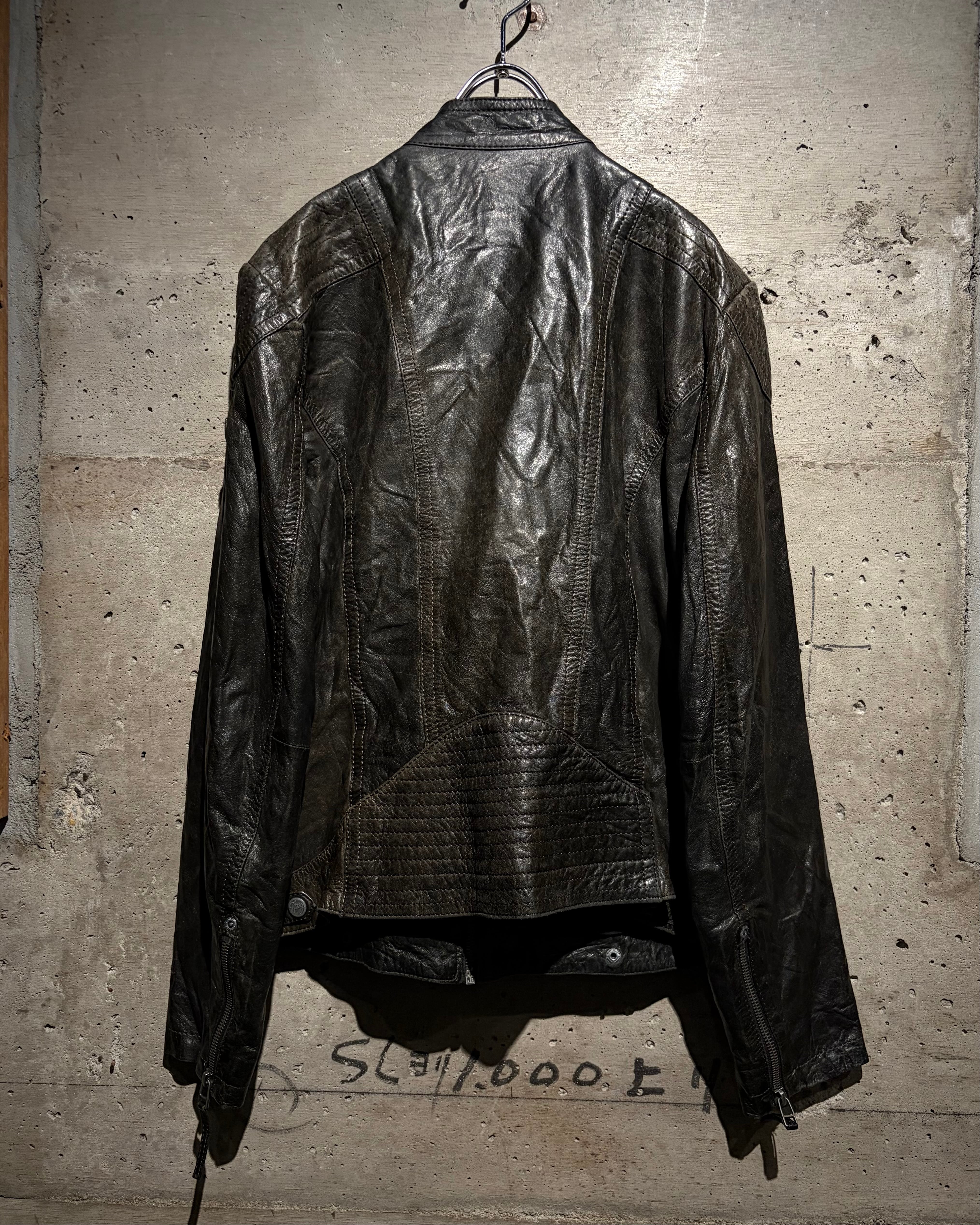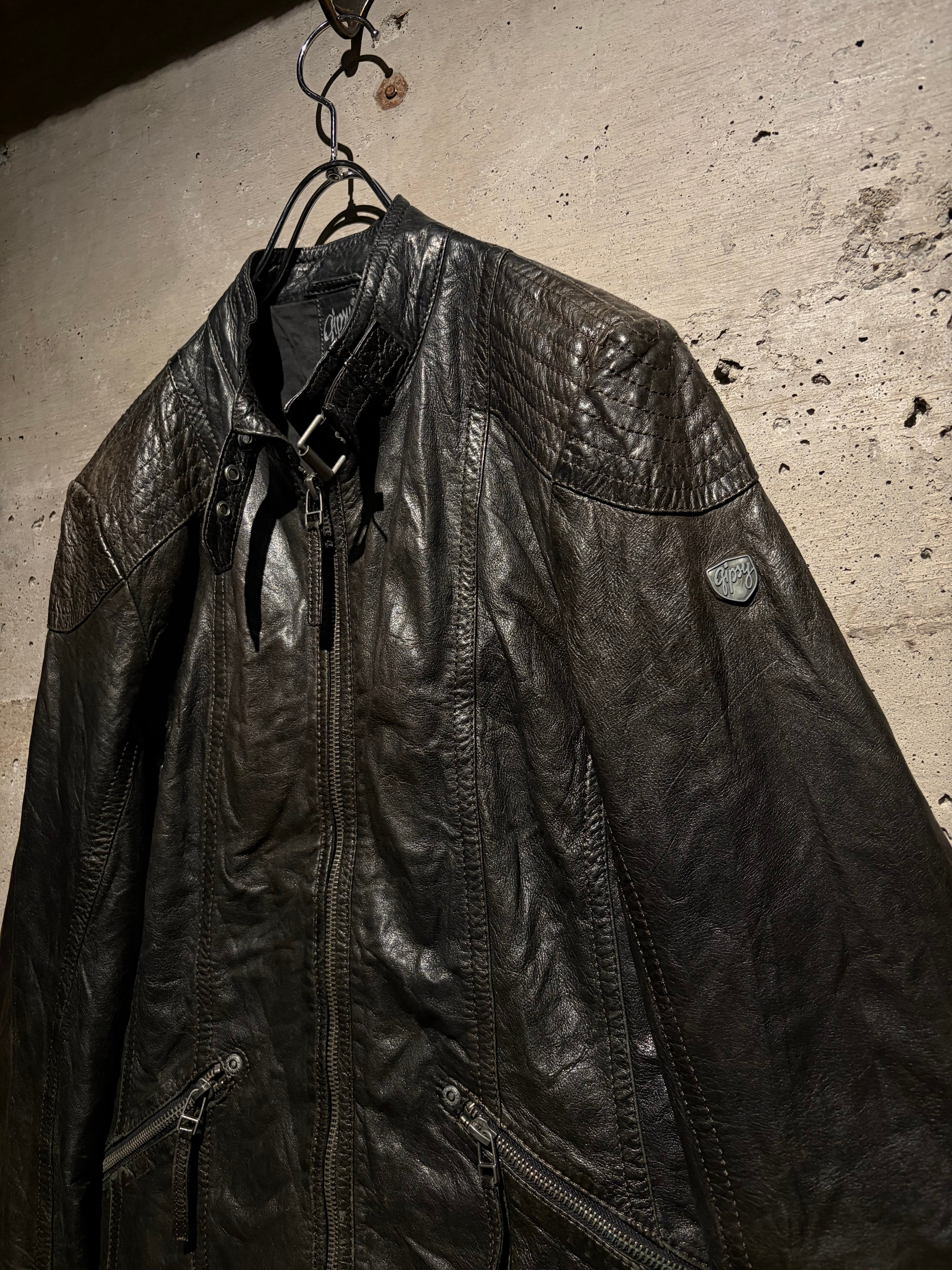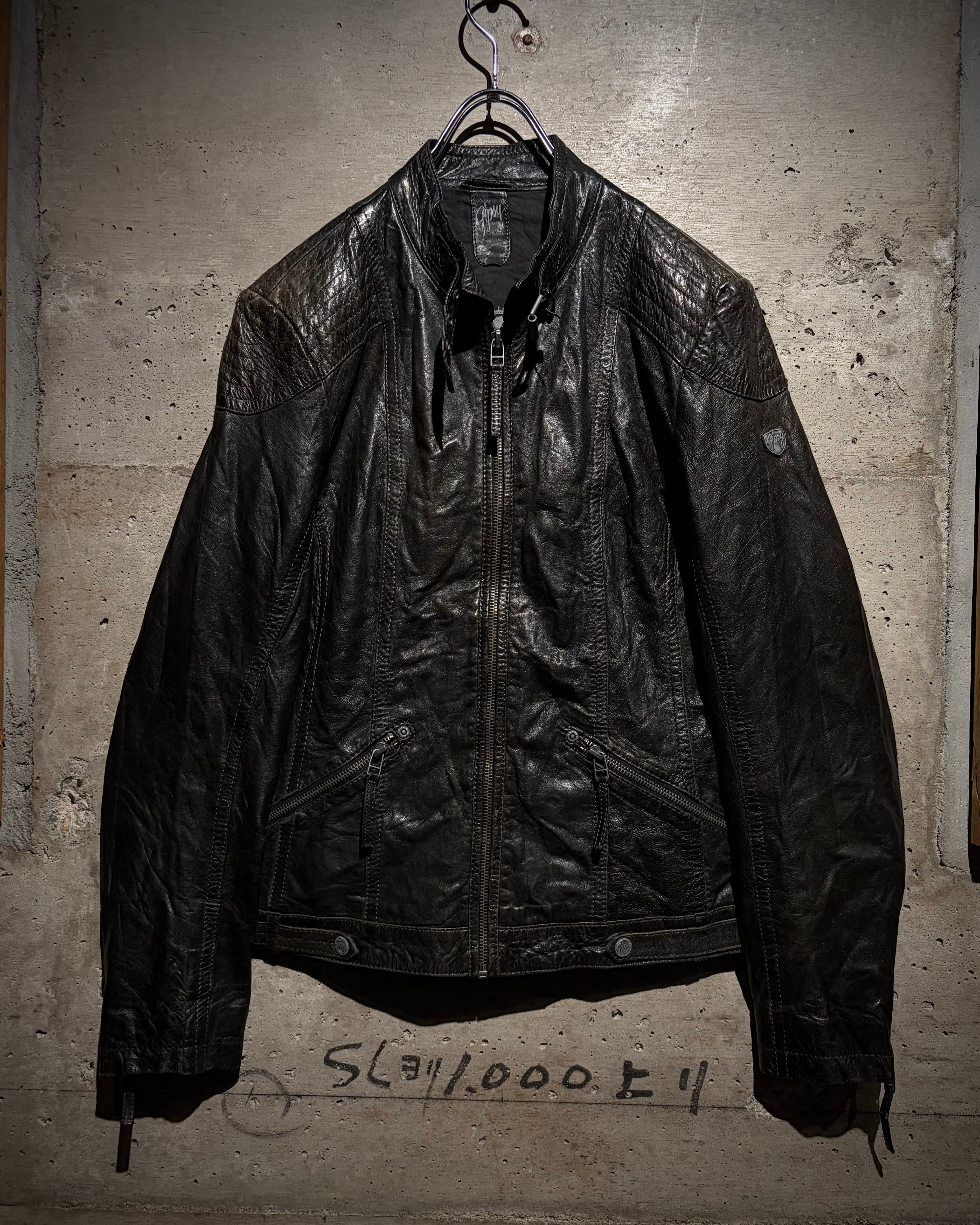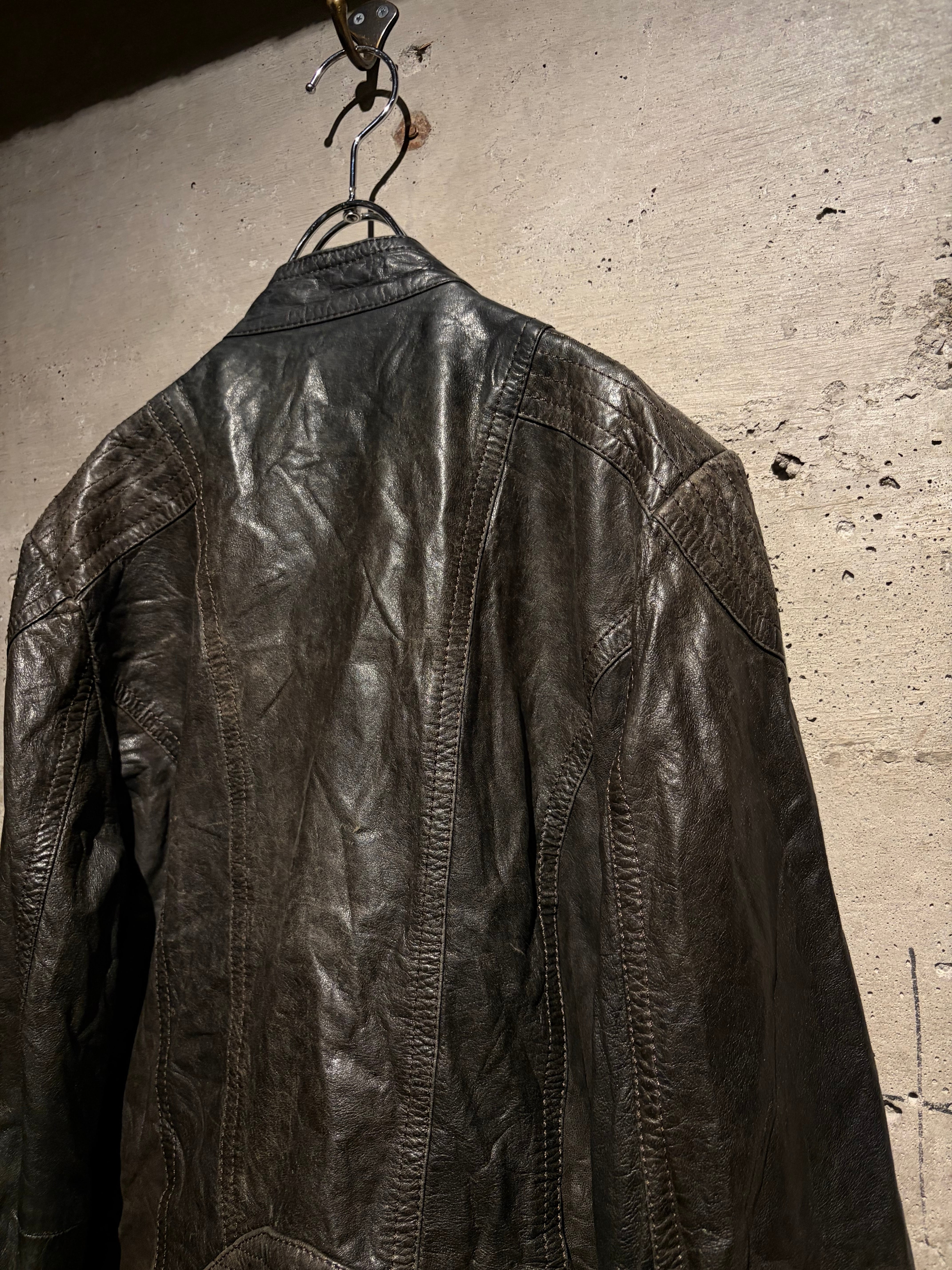 滑らかでありながらタフなテクスチャーのレザー。着用と経年により生まれたブラックレザー特有のフェード感、シボの表情や色の濃淡が自然な陰影は、古着ならではの魅力かと。