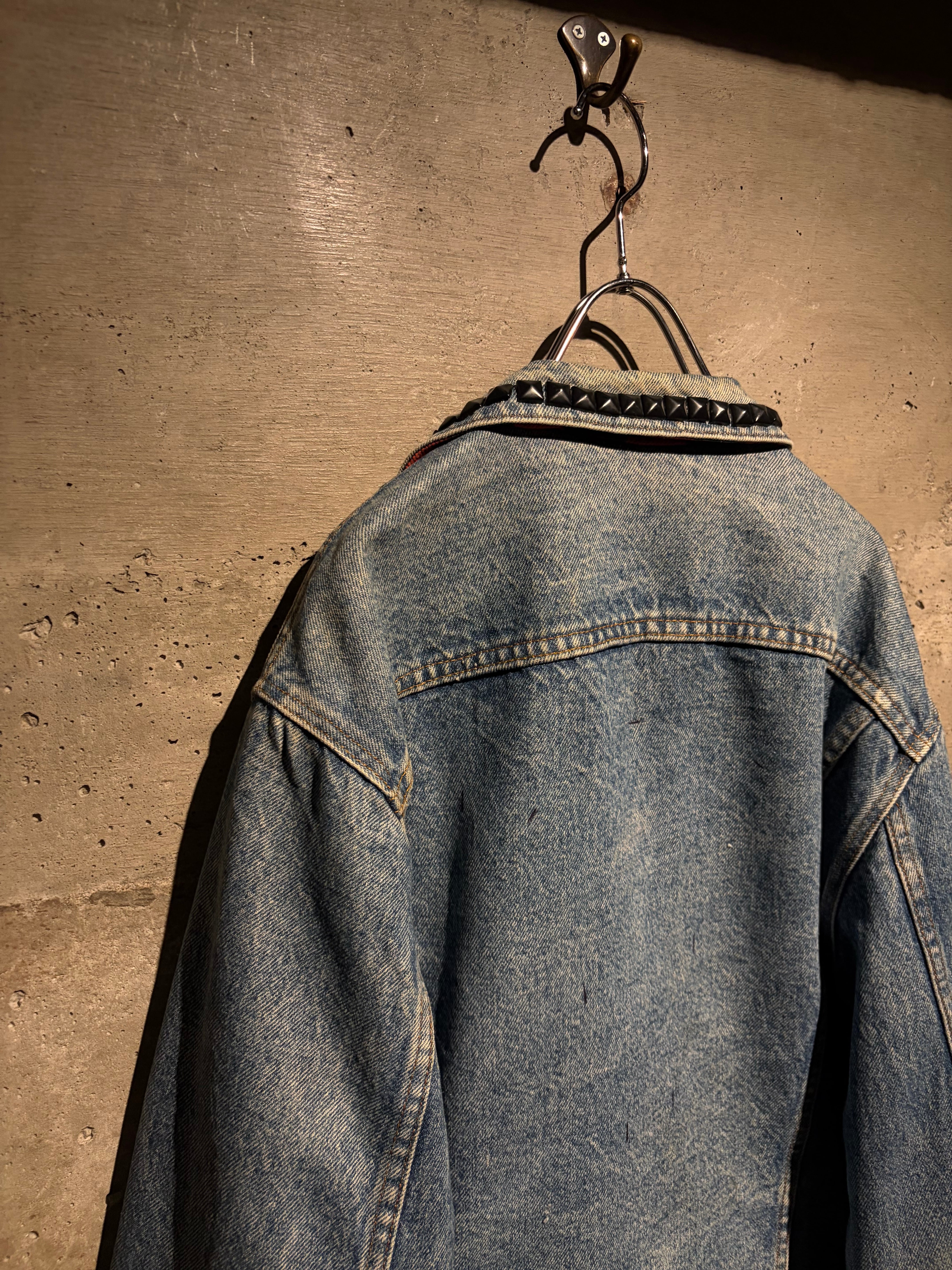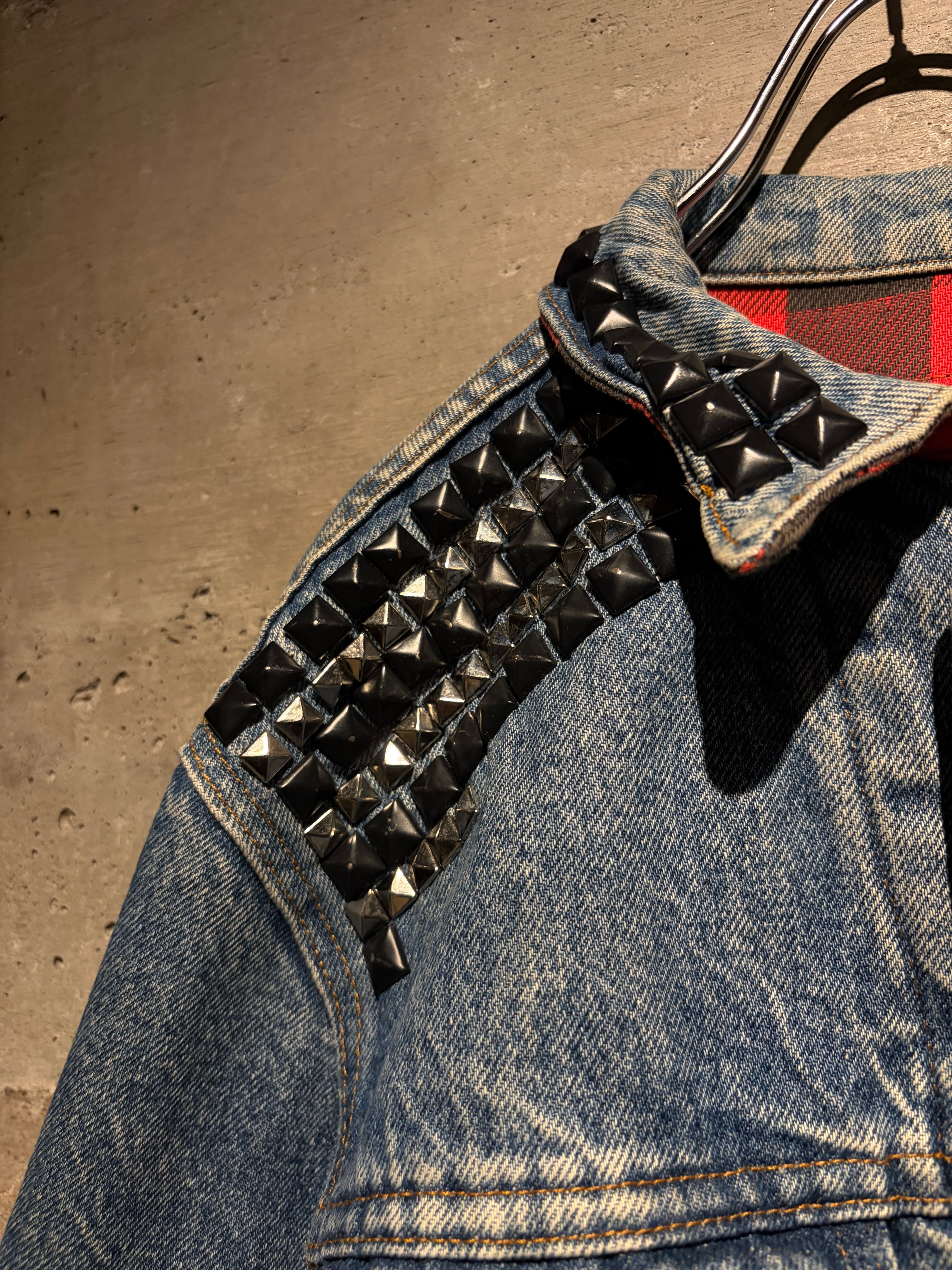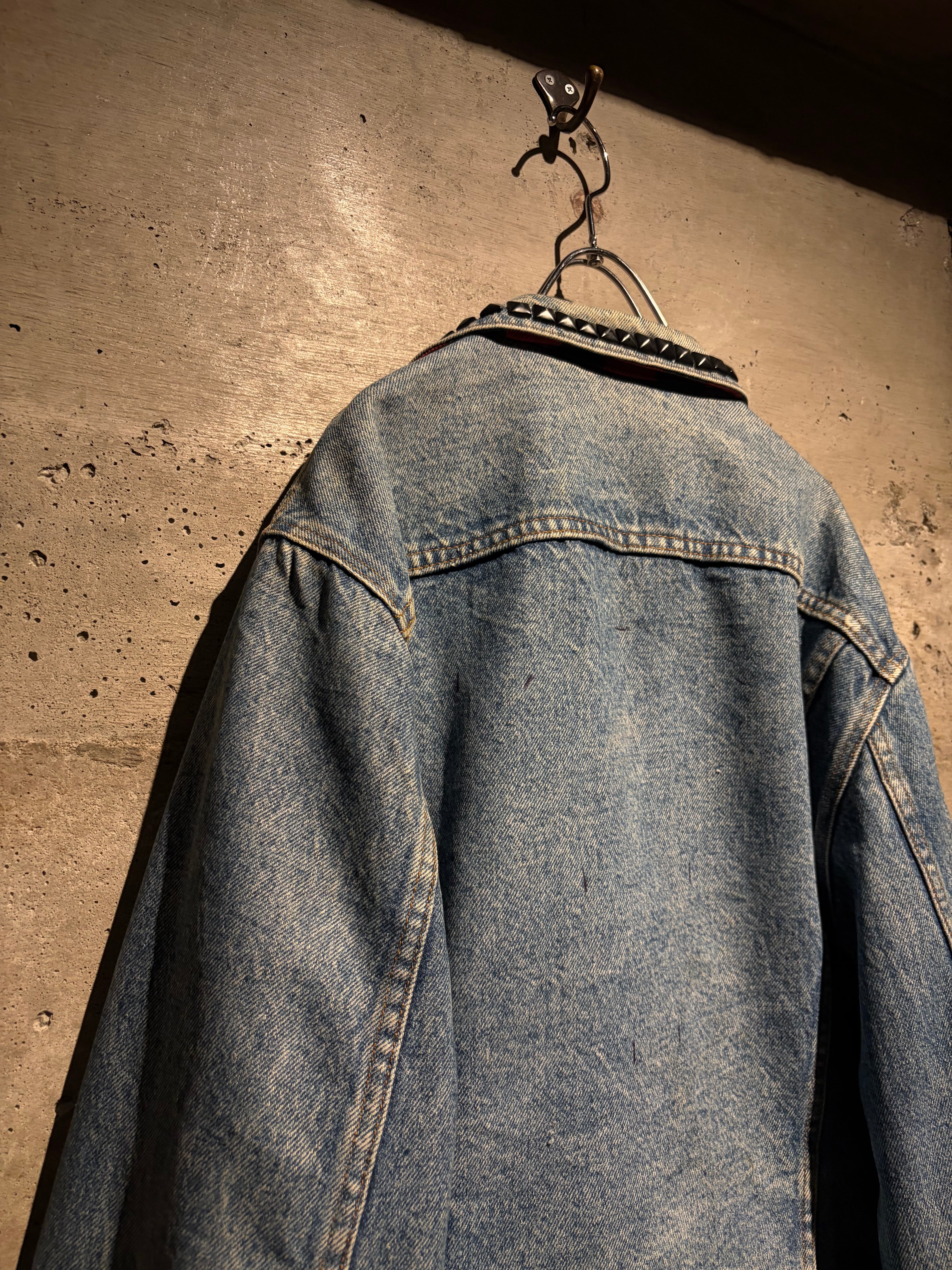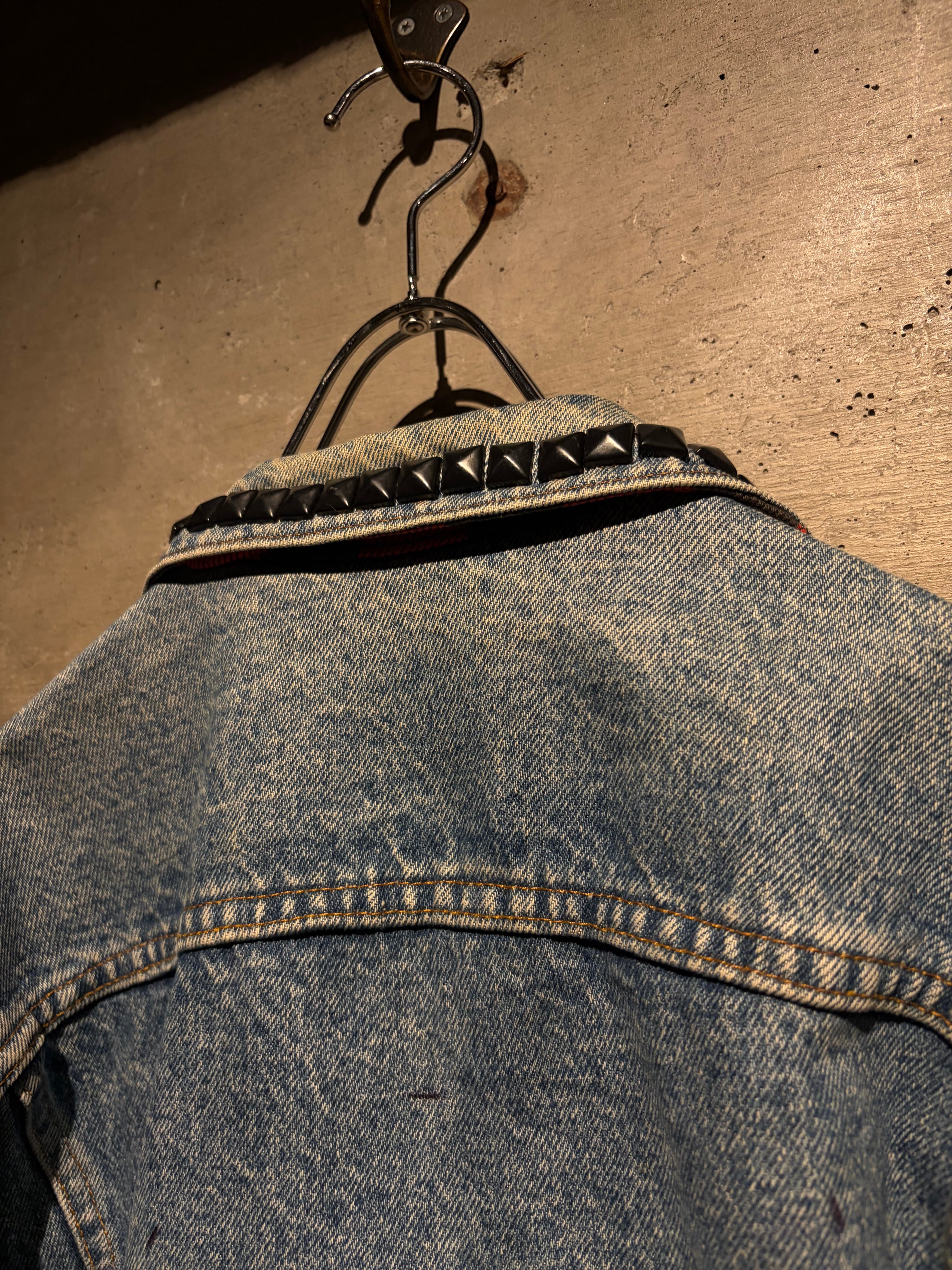 最大の特徴は襟元とショルダーに打ち込まれたブラックスタッズ。無骨なデニムにパンクマインドを掛け合わせたデザインは、ベーシックなデニムジャケットの枠を超えた存在感を放ちます。