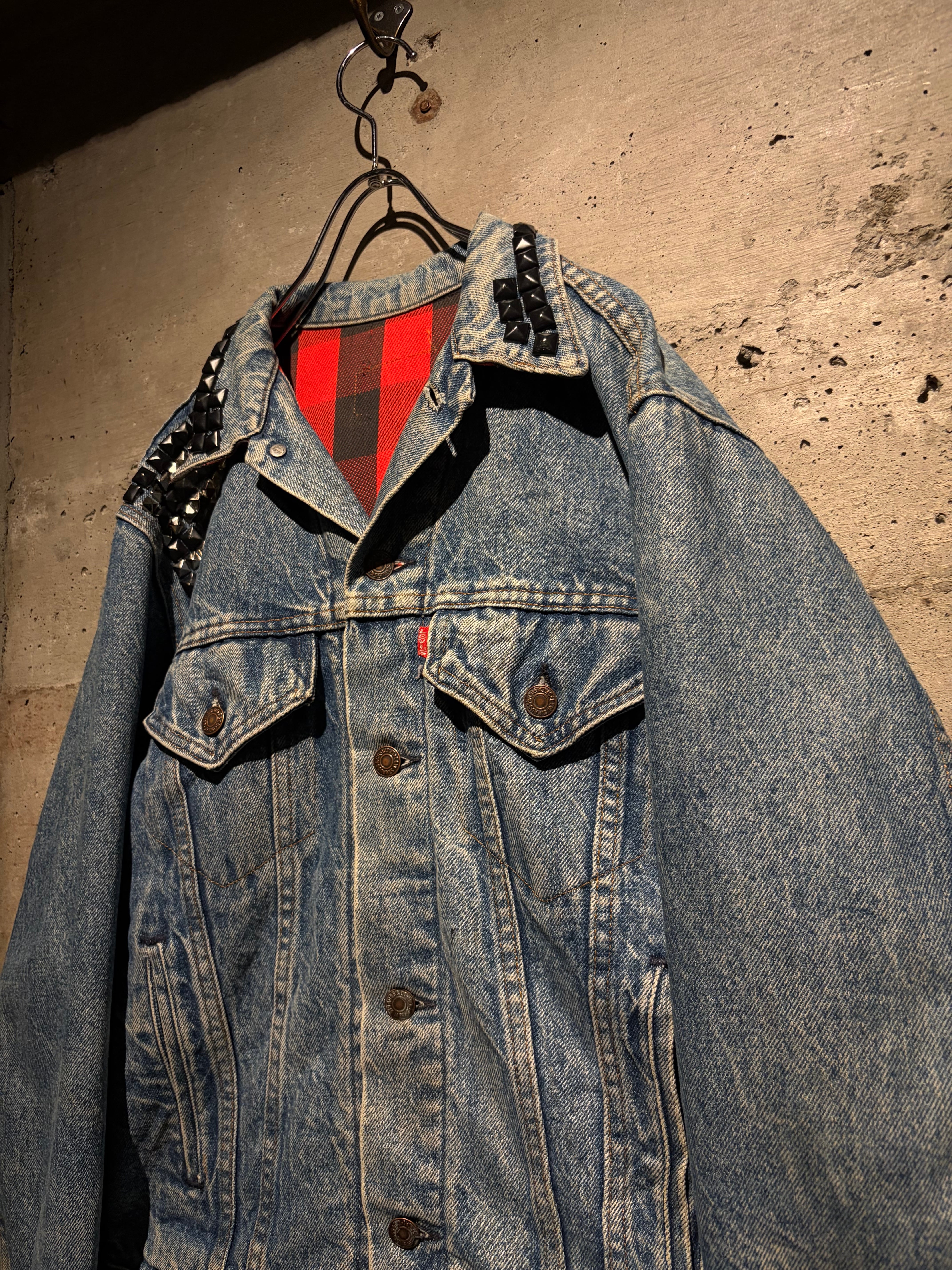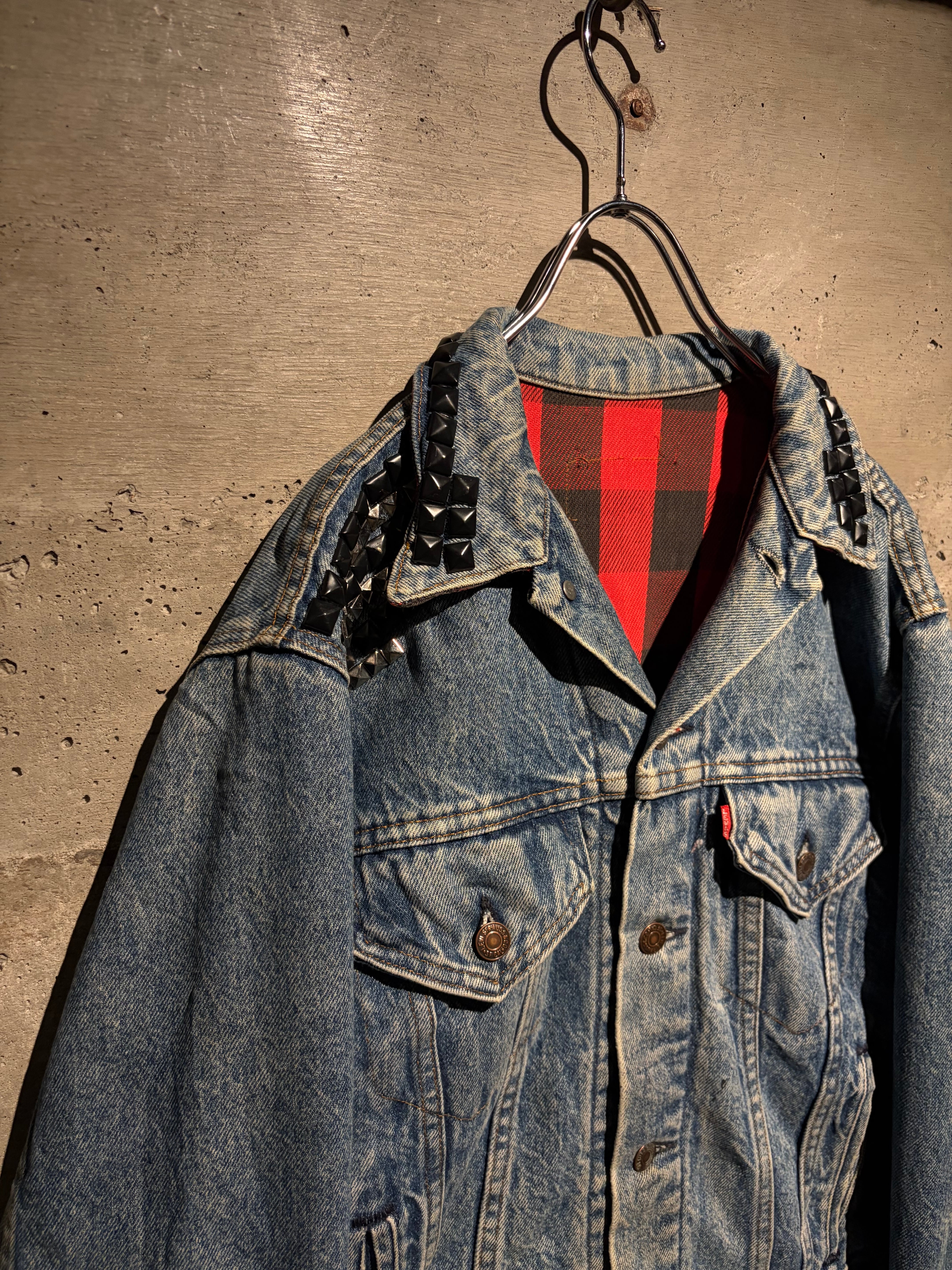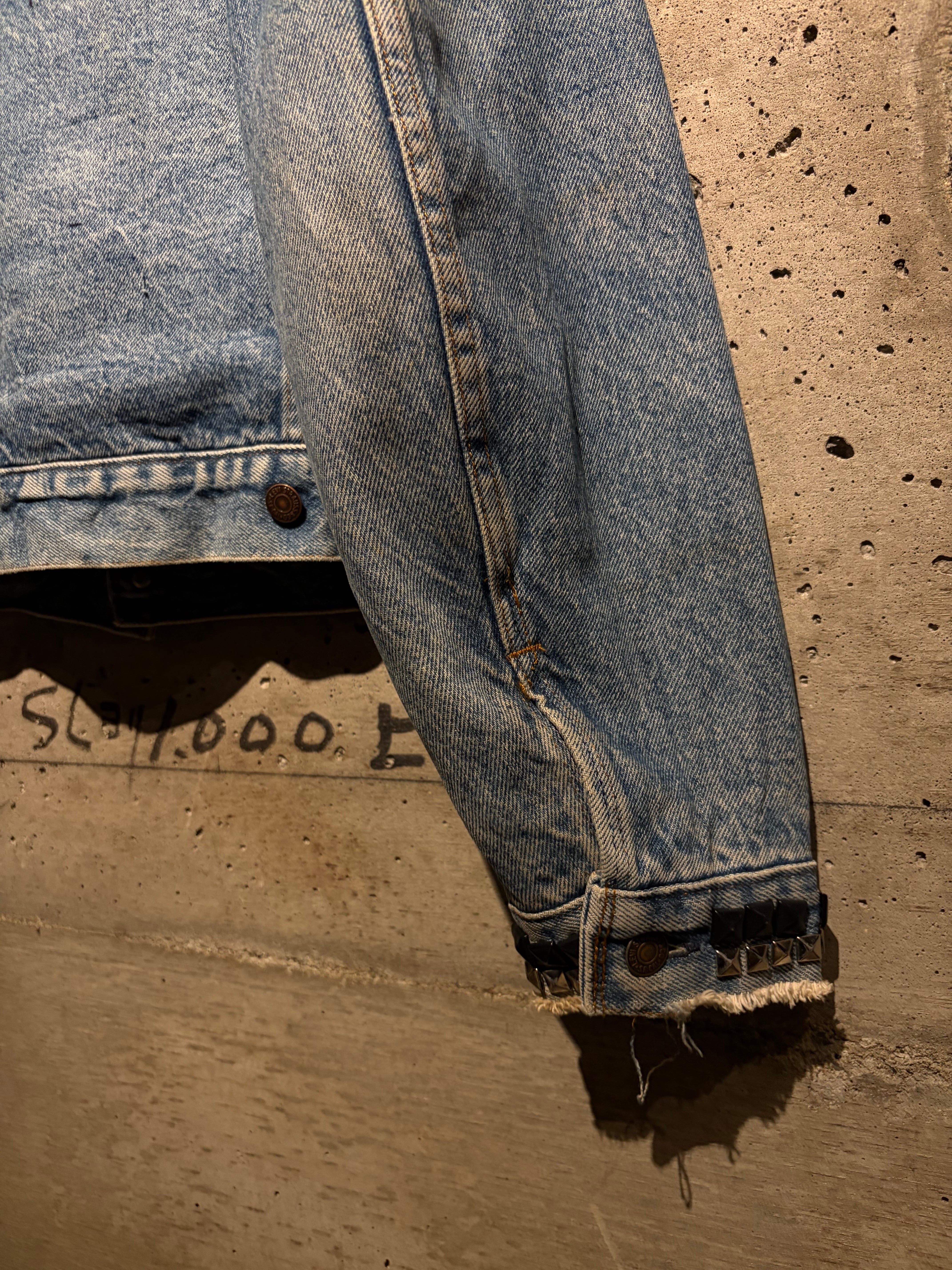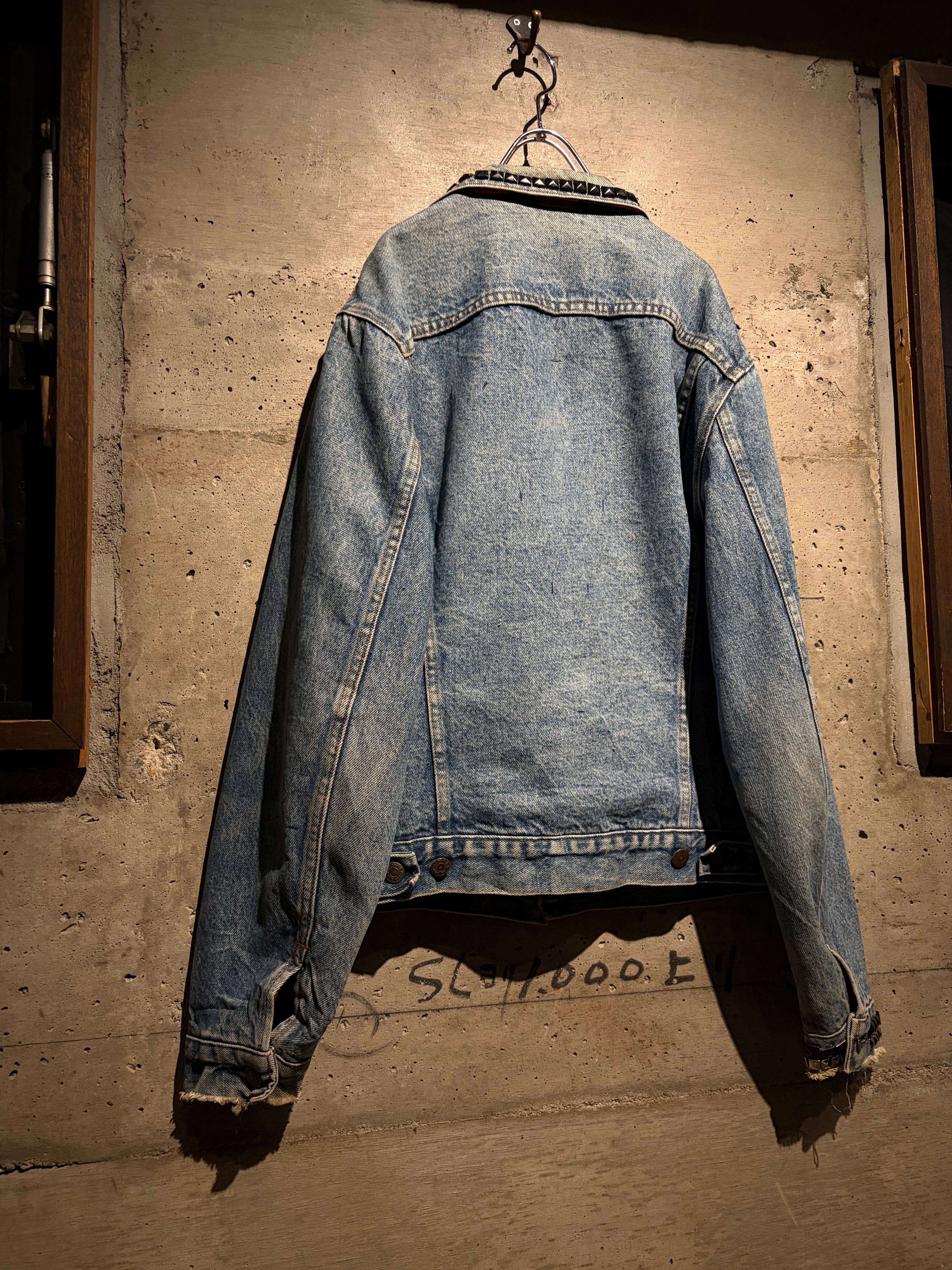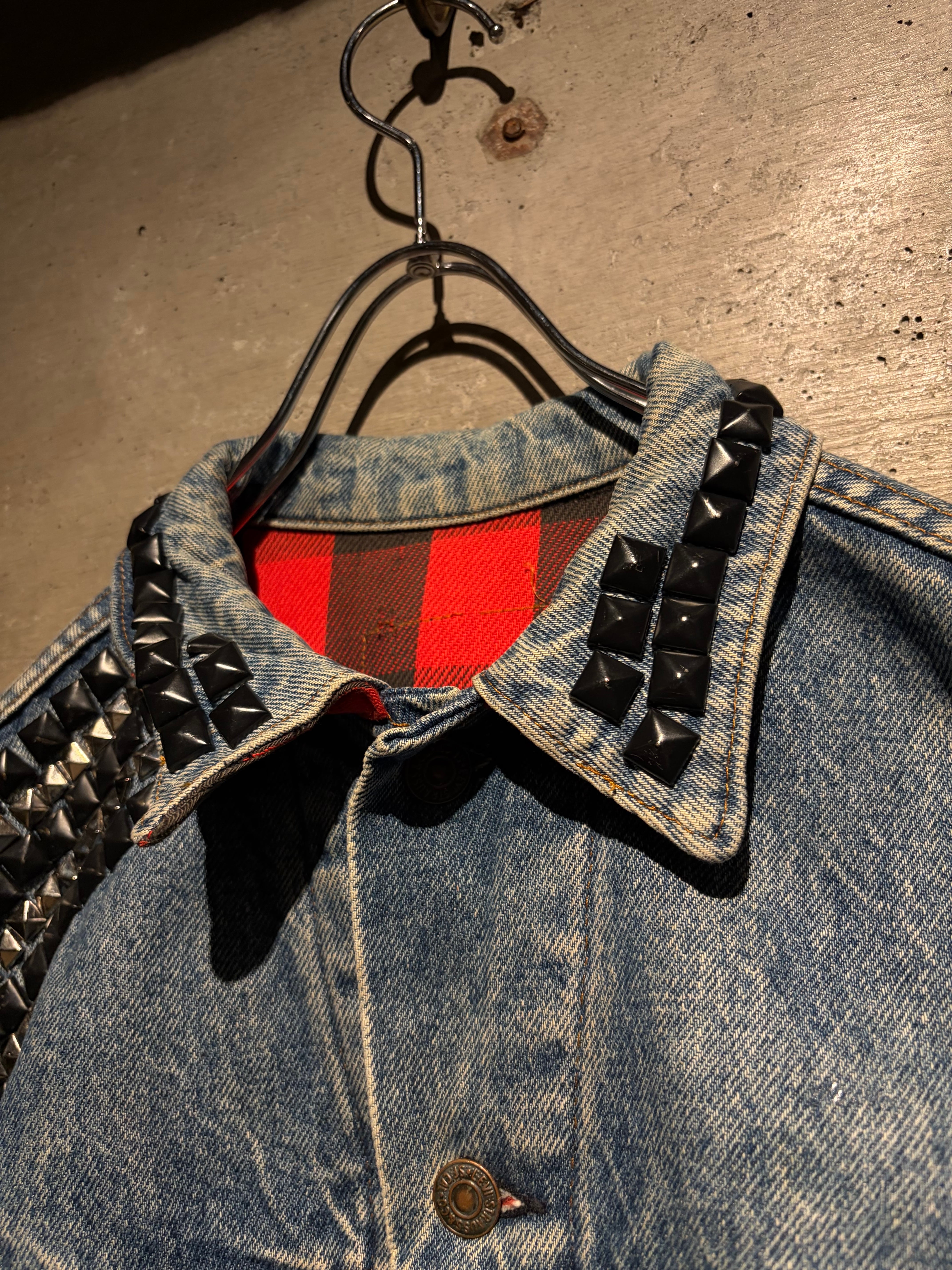 最大の特徴は襟元とショルダーに打ち込まれたブラックスタッズ。無骨なデニムにパンクマインドを掛け合わせたデザインは、ベーシックなデニムジャケットの枠を超えた存在感を放ちます。
