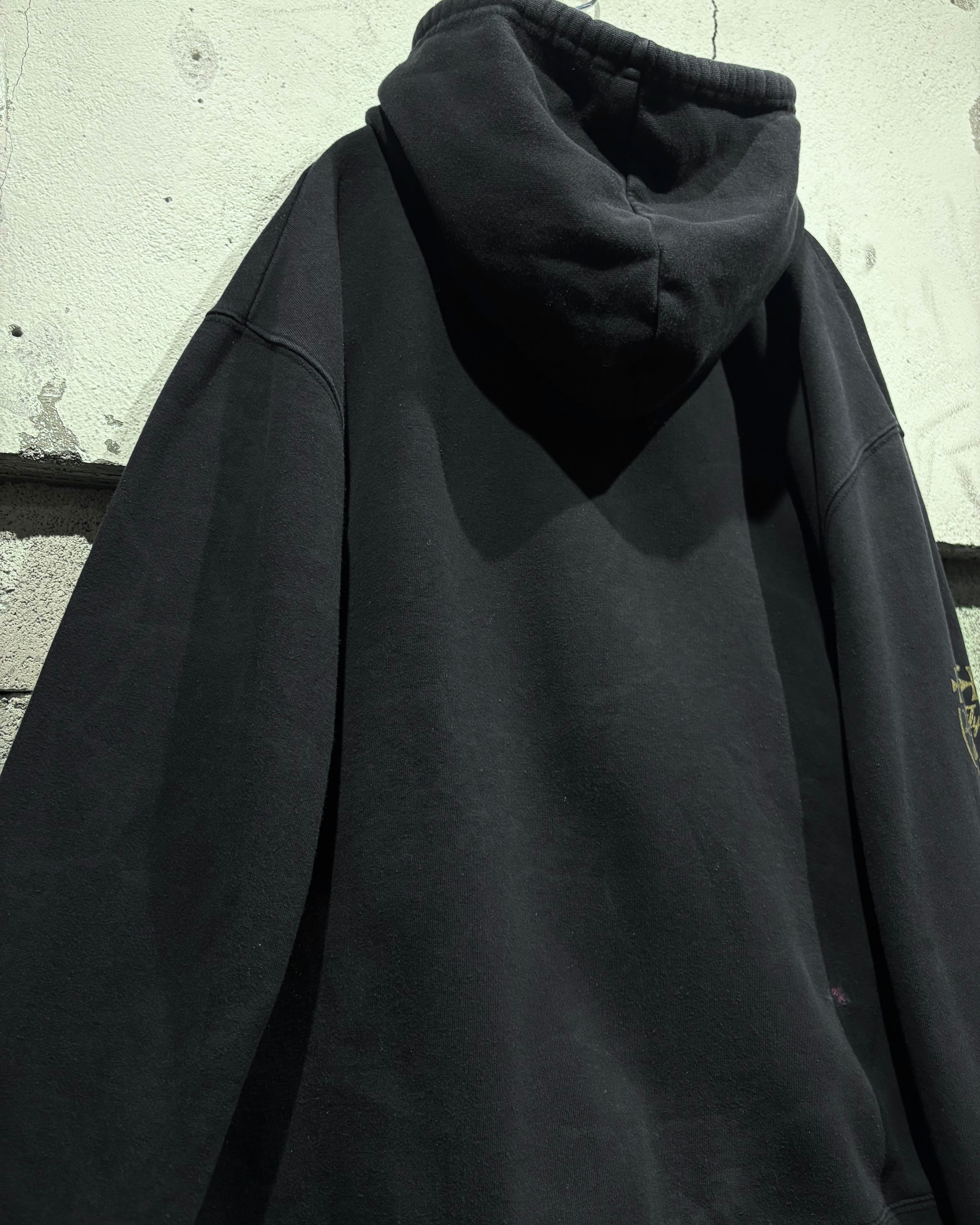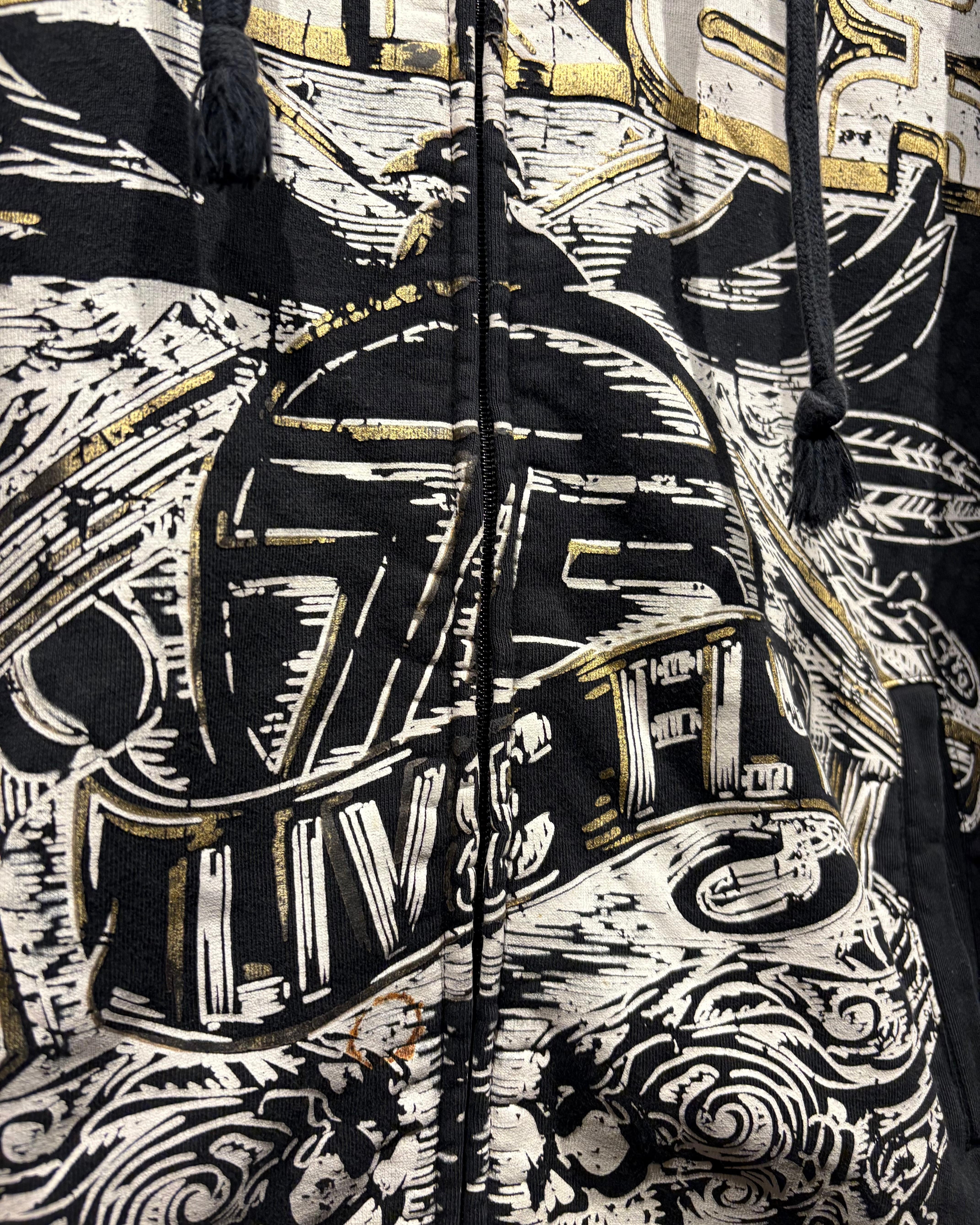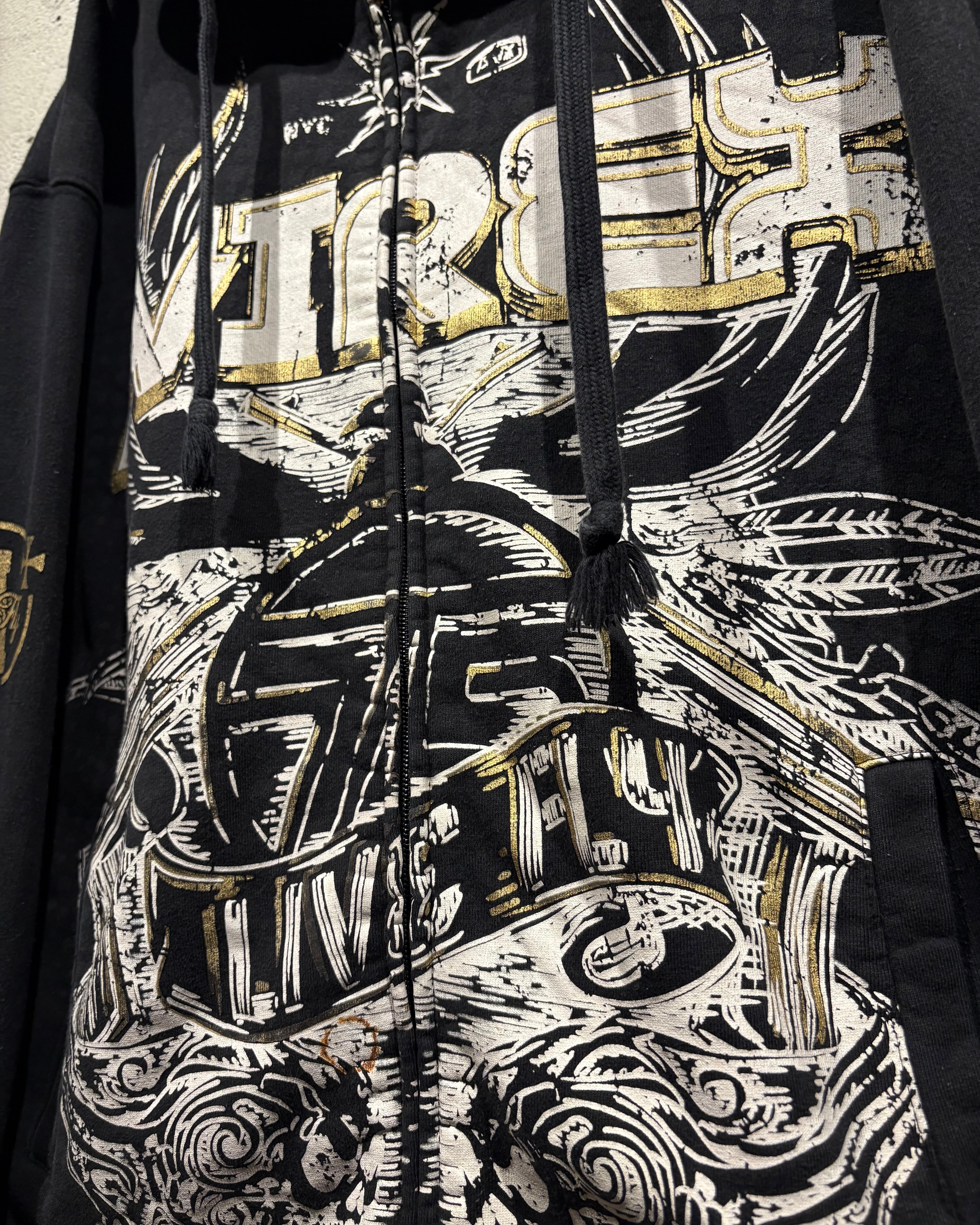 ブラックのボディをベースに、フロント全面に大胆に配されたゴシックモチーフが圧倒的な存在感を放つ1着。