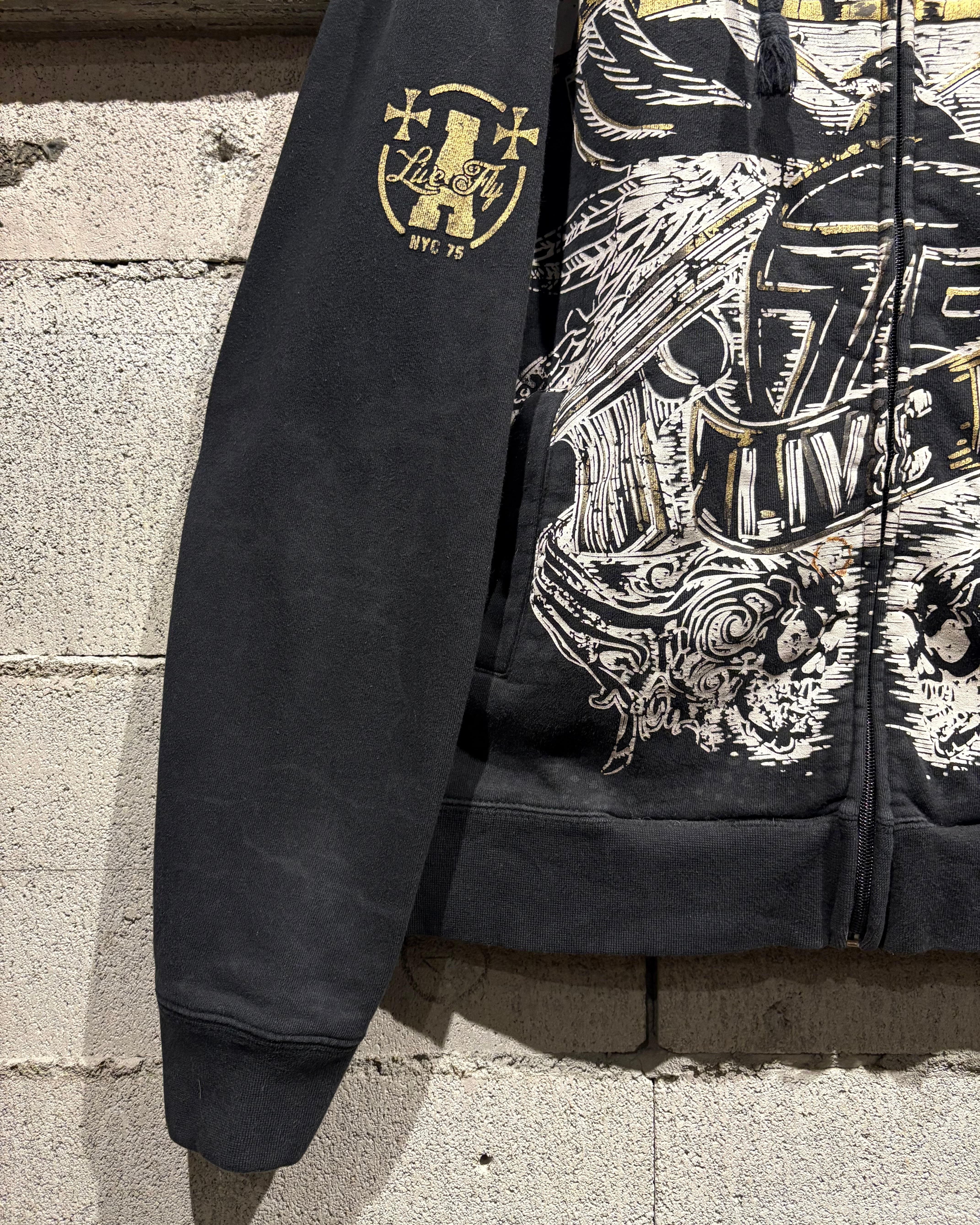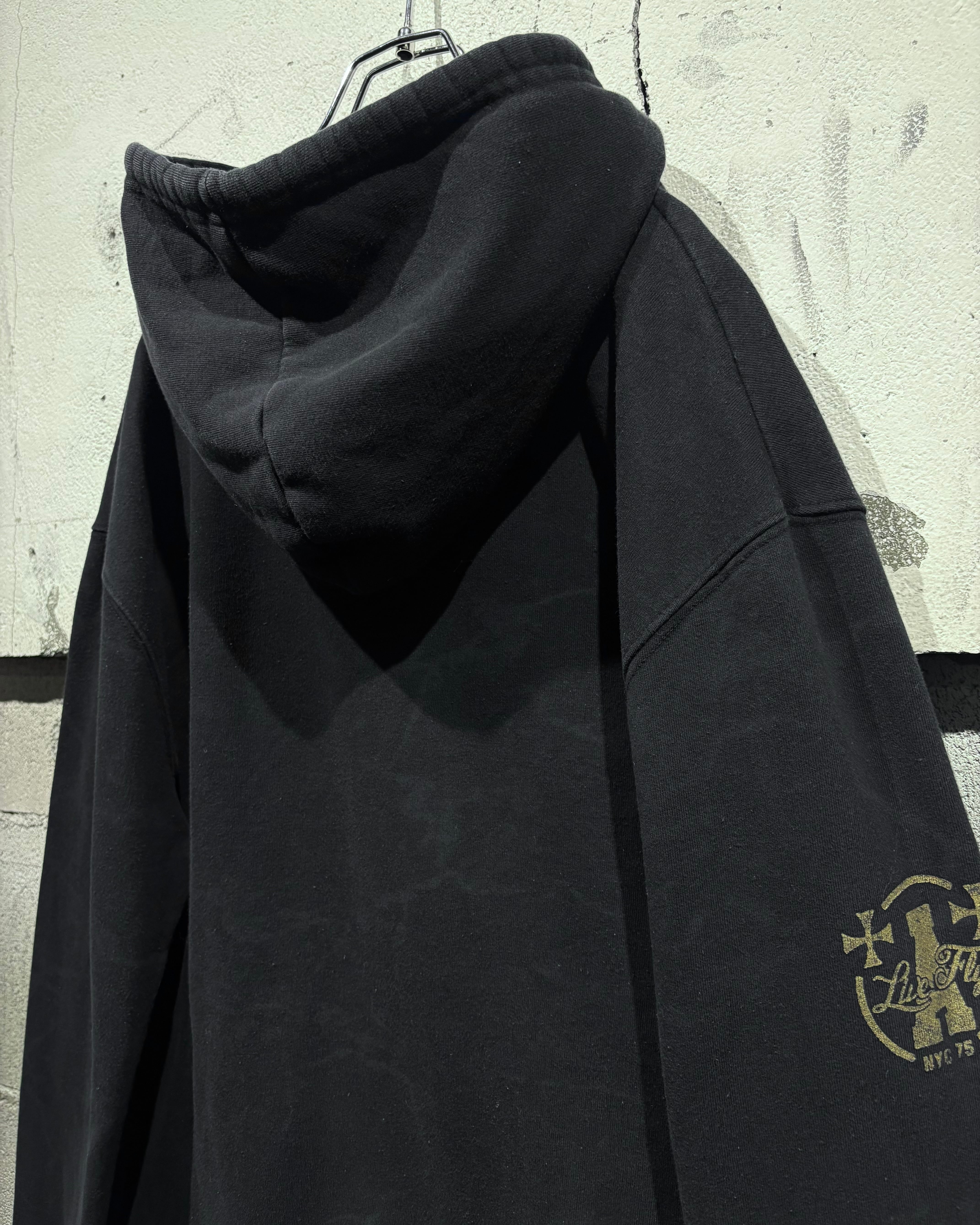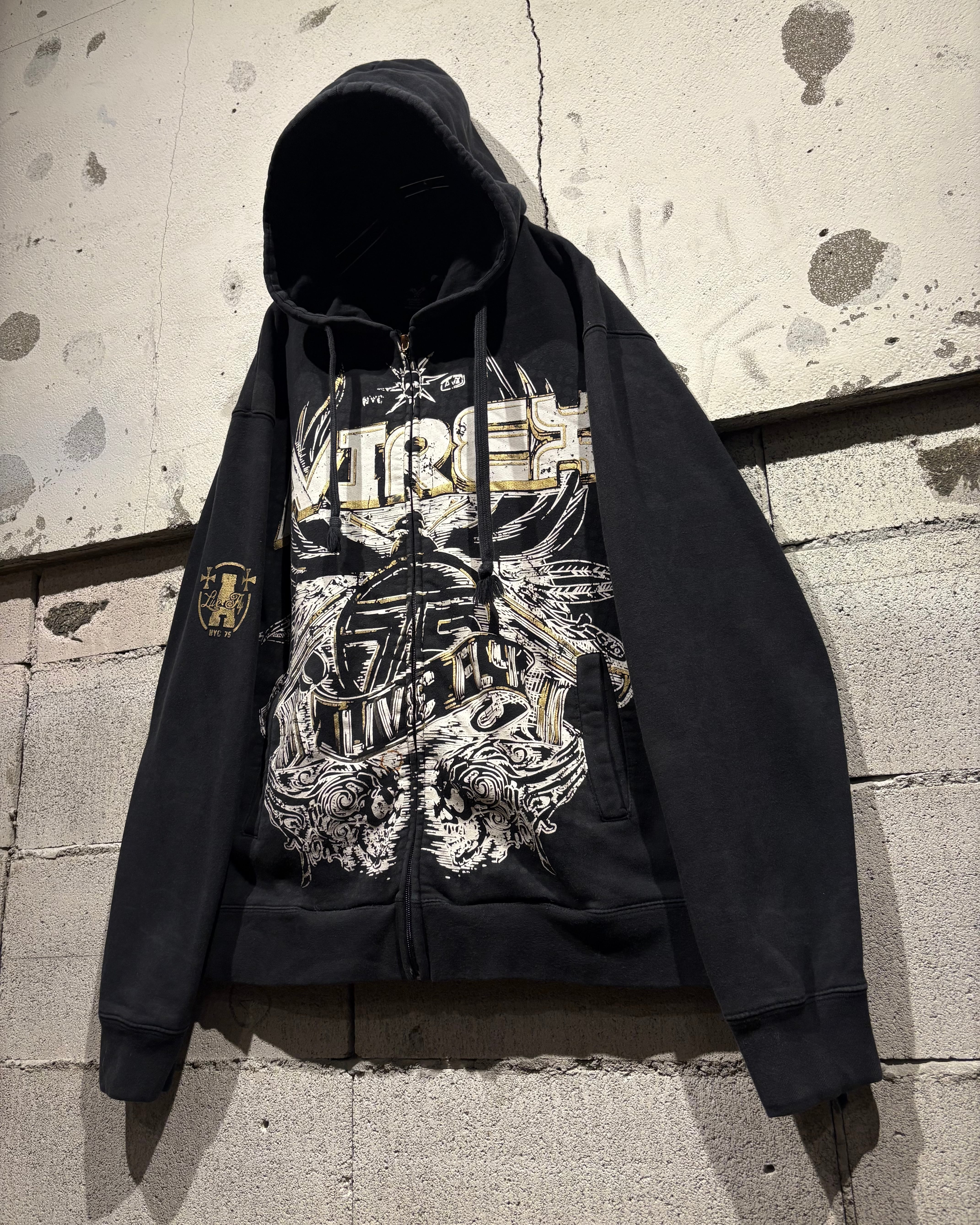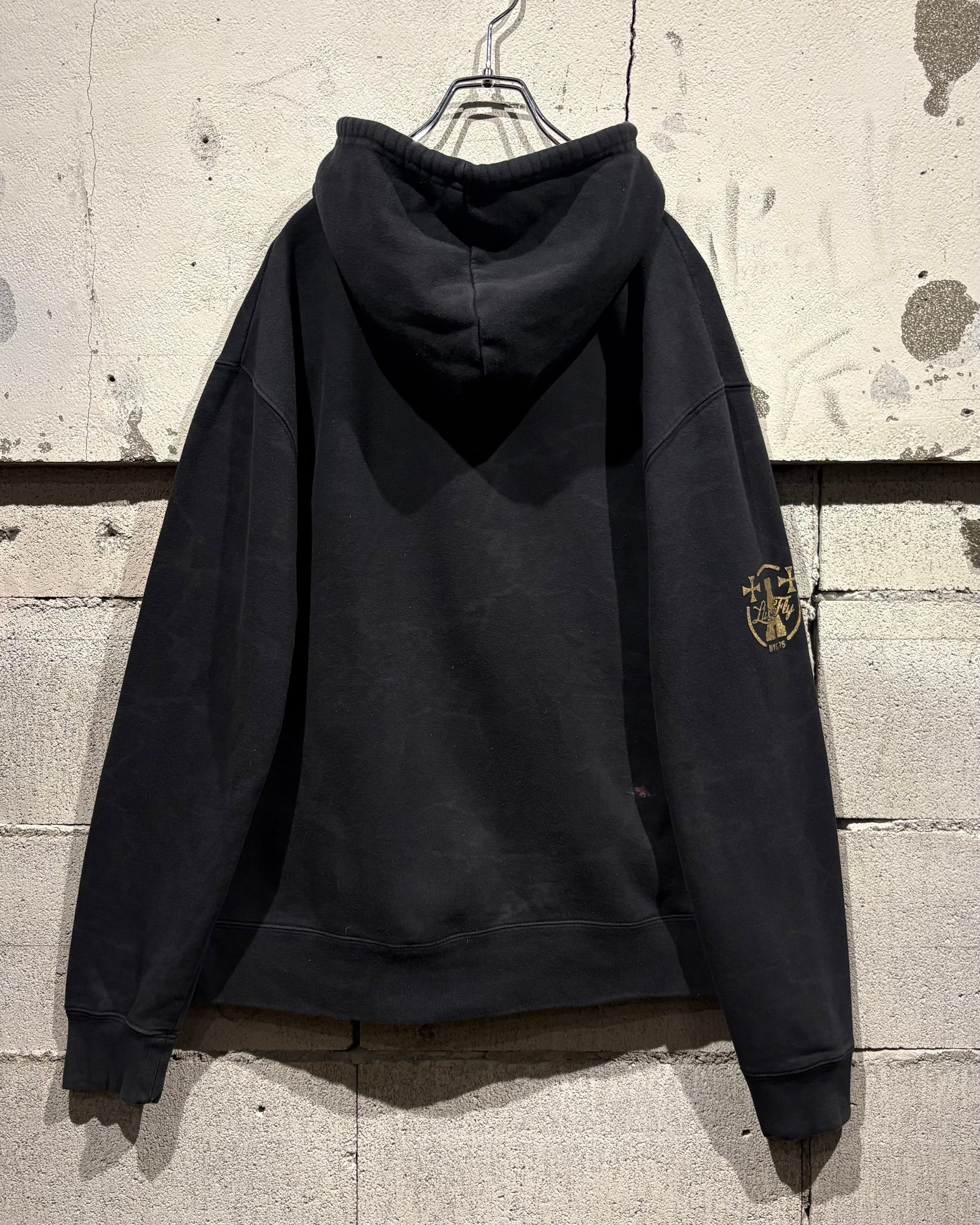 ブラックのボディをベースに、フロント全面に大胆に配されたゴシックモチーフが圧倒的な存在感を放つ1着。
