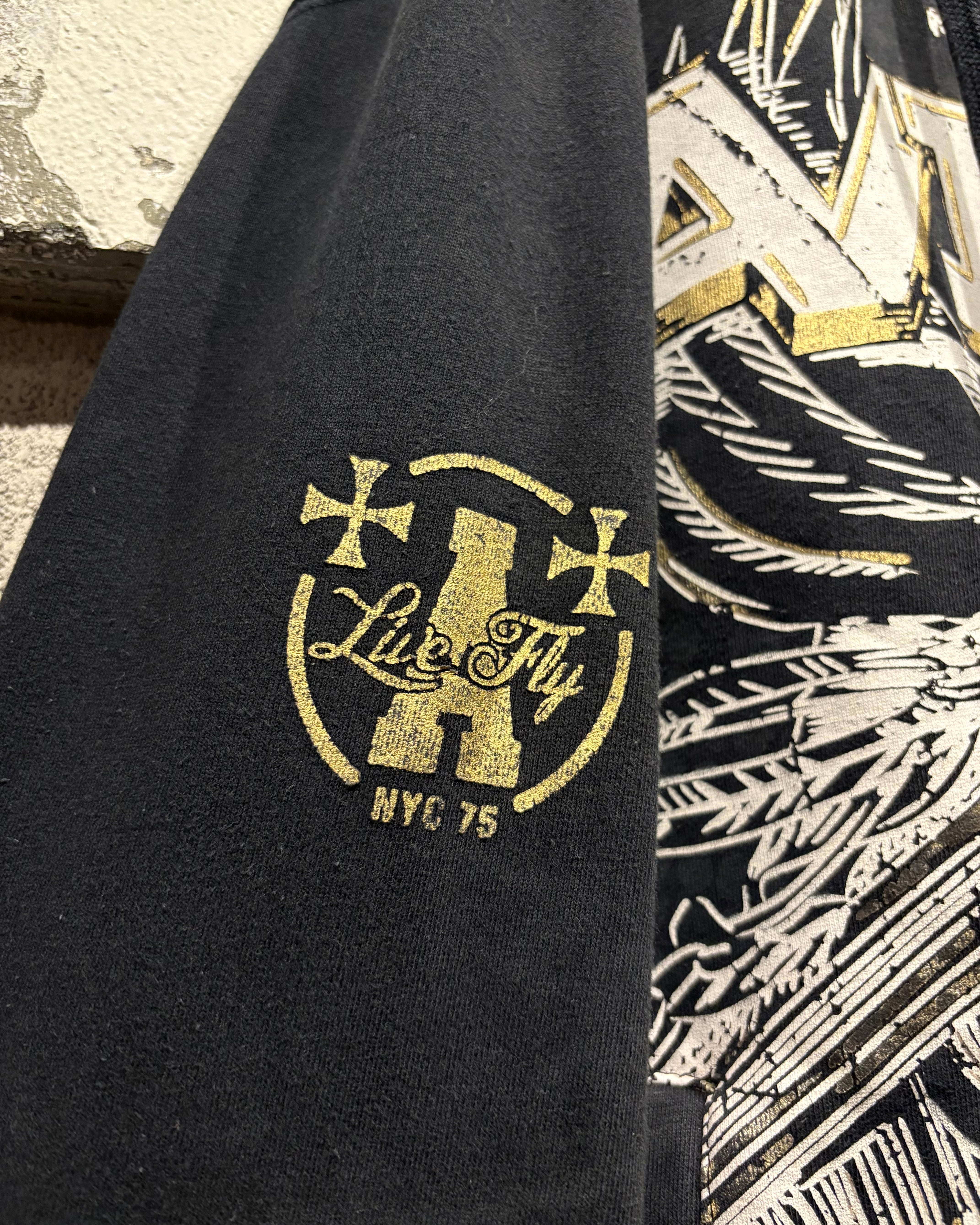 ホワイトで描かれた荘厳なグラフィックの上から、ゴールドラメを重ねることで立体感を演出。無骨さの中にラグジュアリーさを感じられる、AVIREXらしい完成度の高いデザインに仕上がっています。
