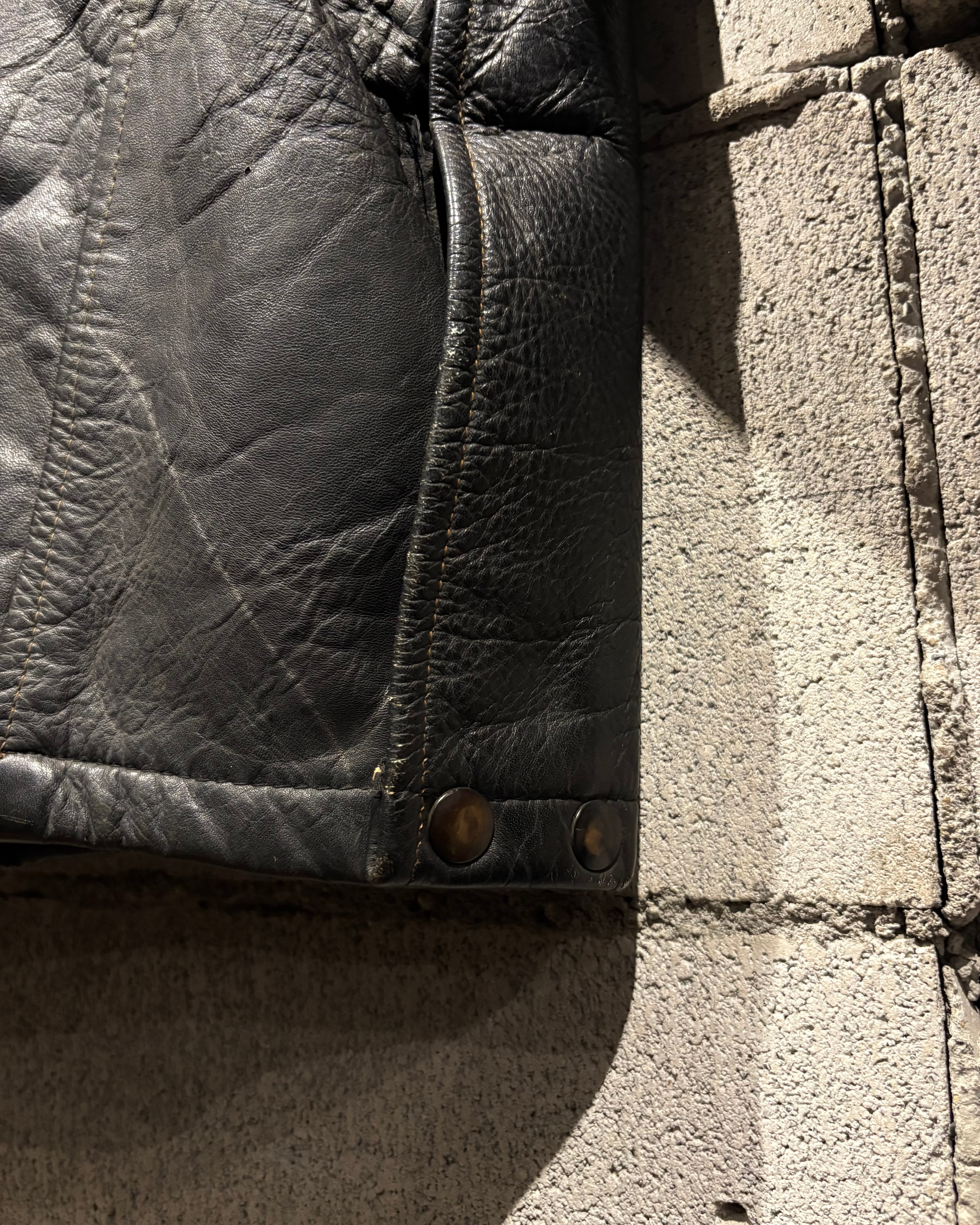 肉厚でしなやかなレザーは長年着込まれたことで生まれたシワやアタリがあり、鈍い艶を放つブラックが存在感を演出。ヴィンテージレザーならではの迫力を感じられますね。