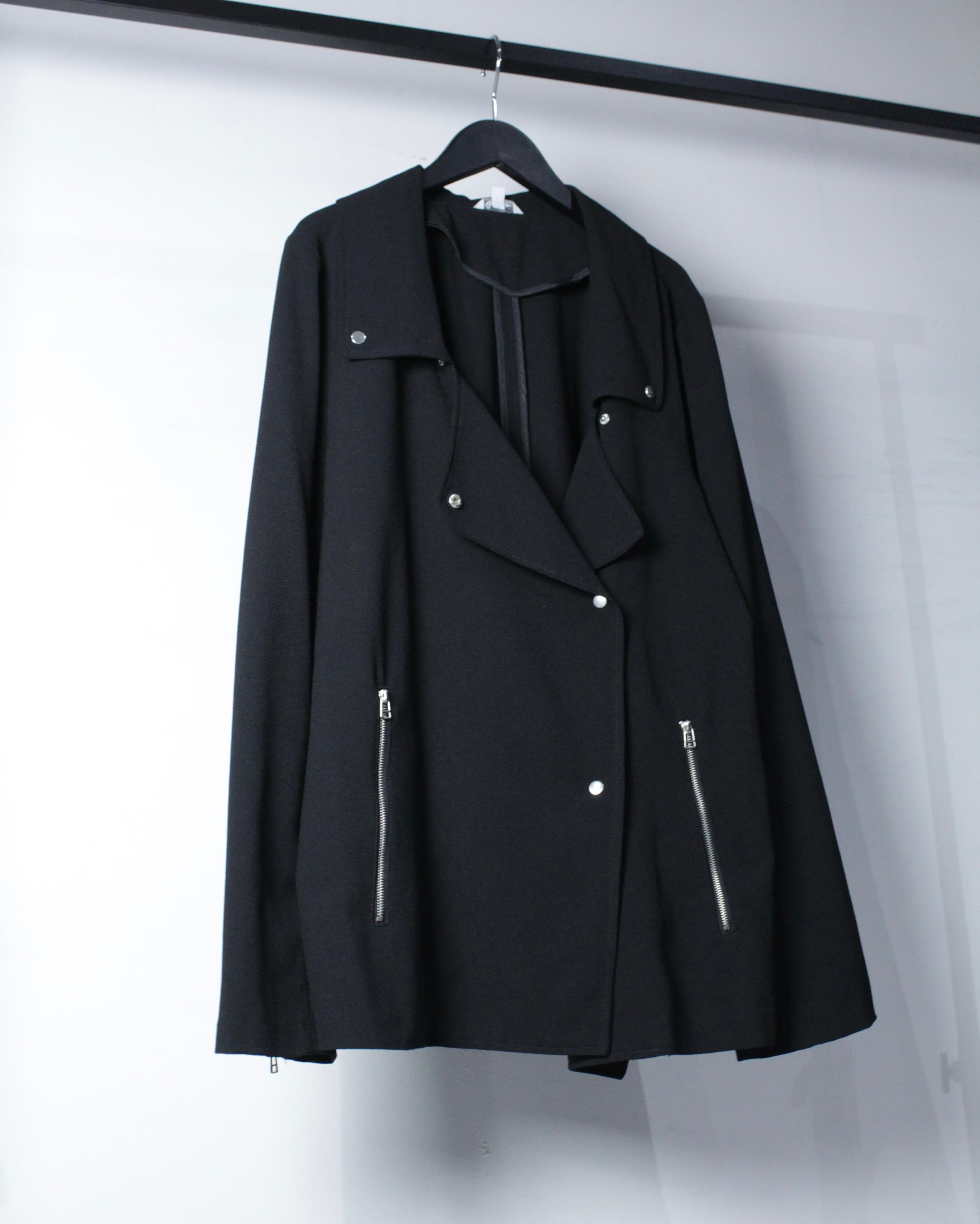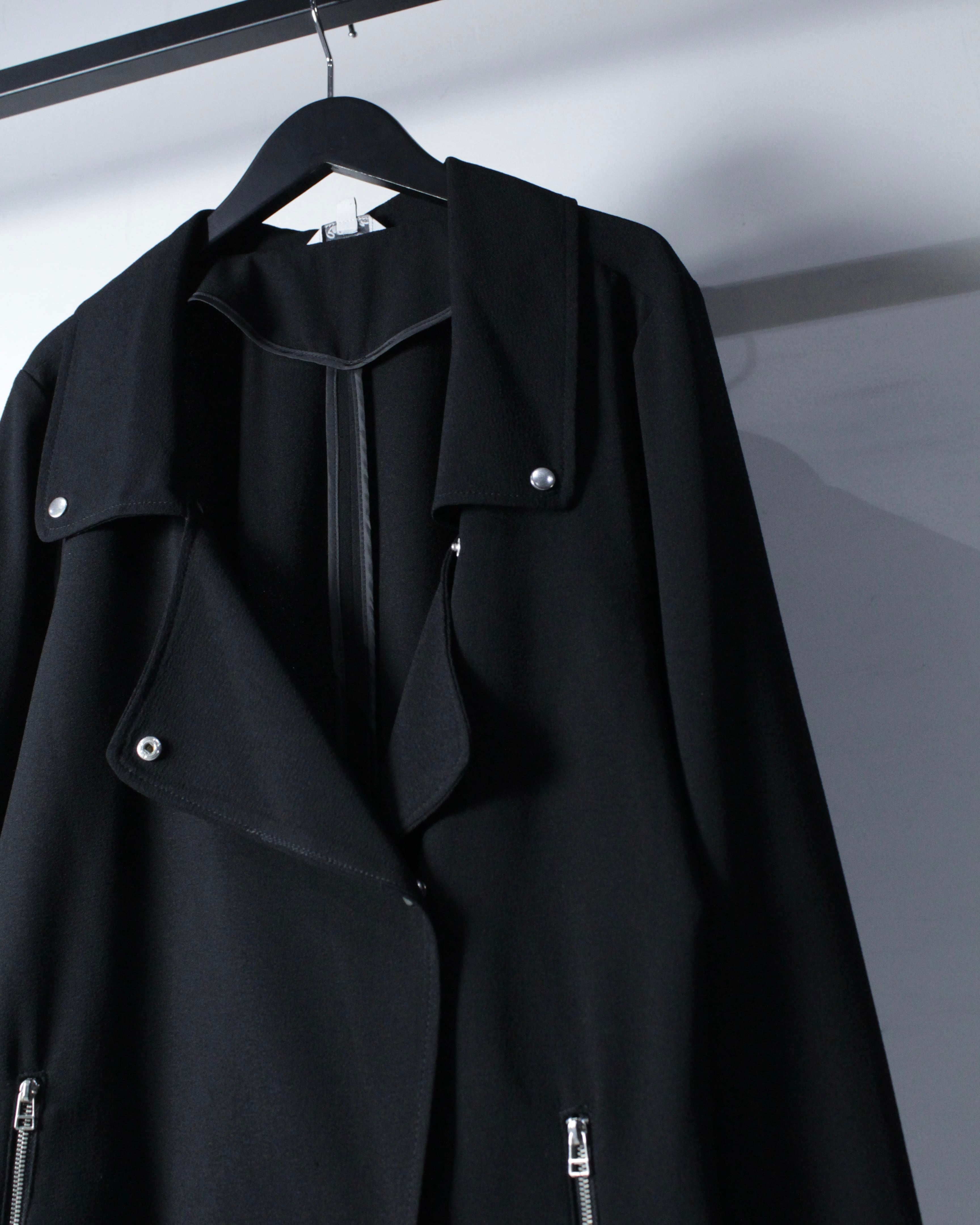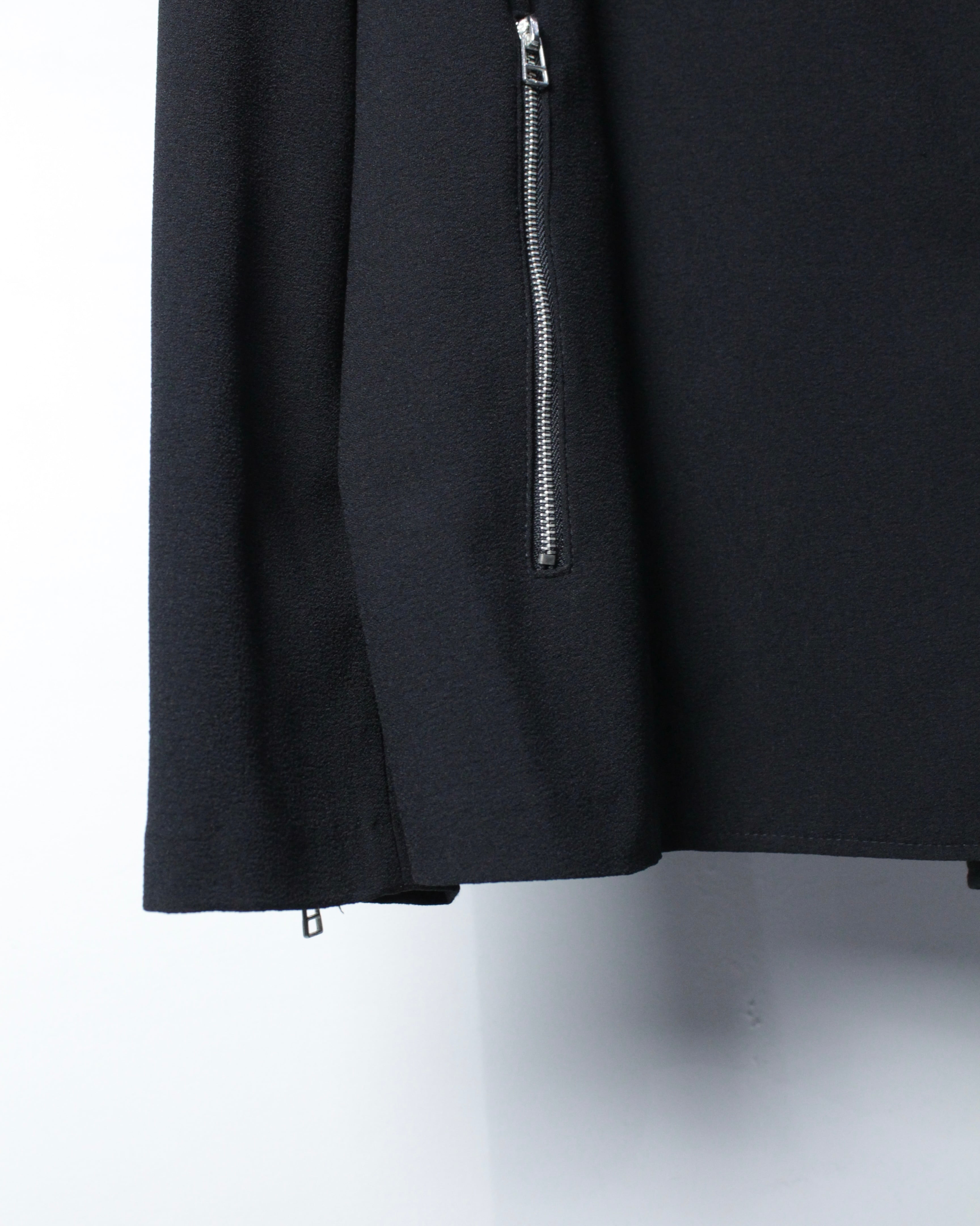 軽やかなポリエステルを用いながら、ダブルライダースの意匠を落とし込んだ、モードな雰囲気漂うジャケット。