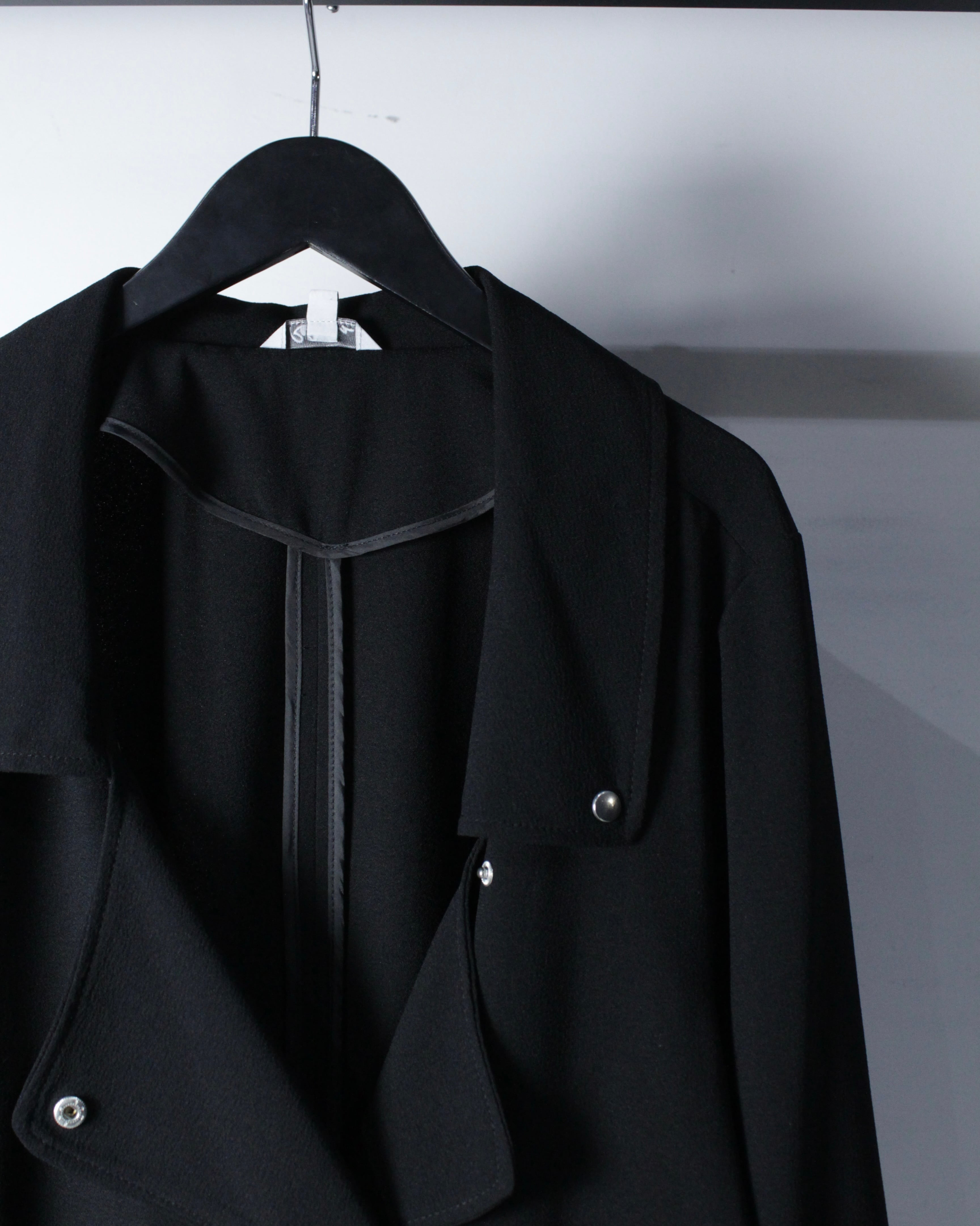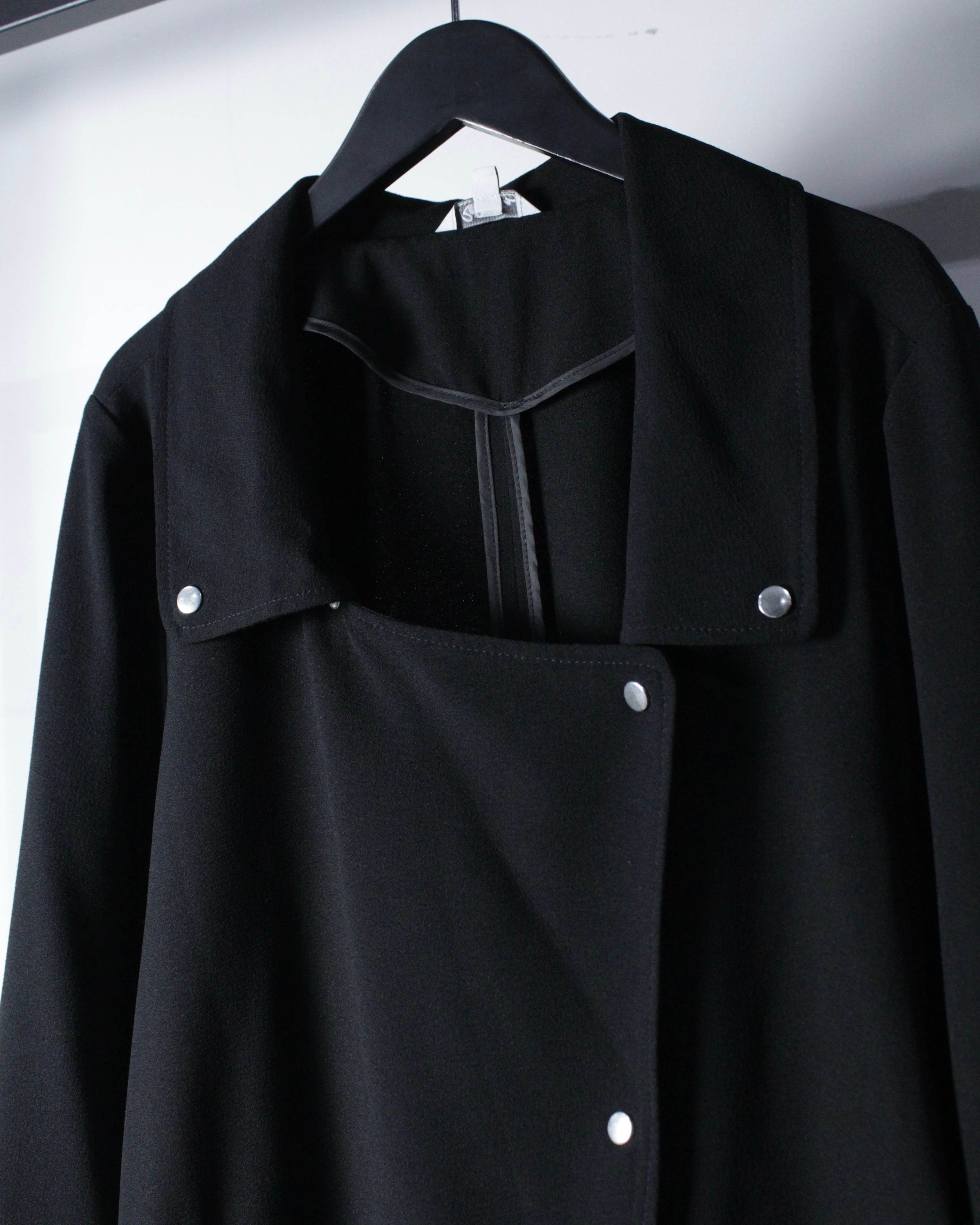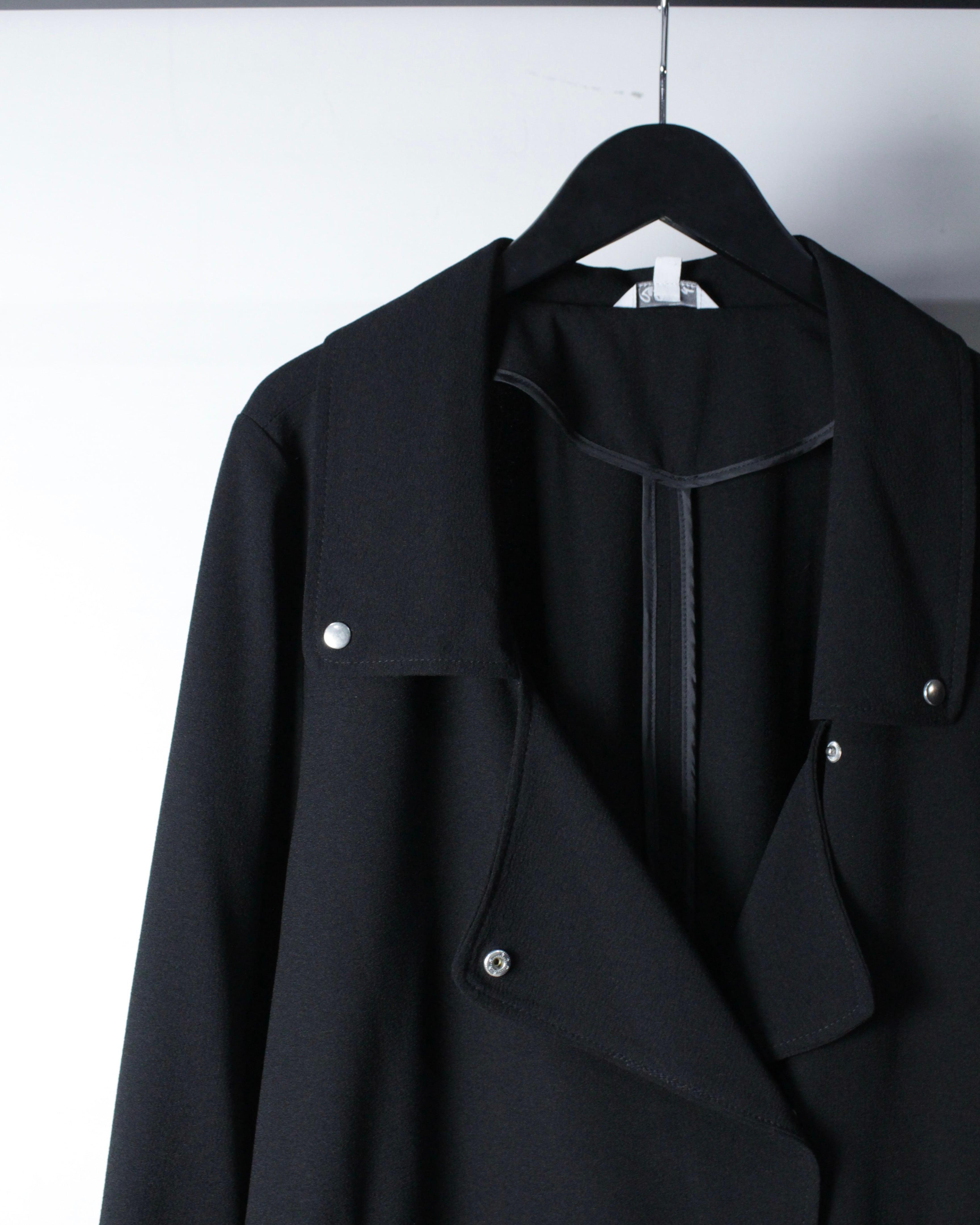 軽やかなポリエステルを用いながら、ダブルライダースの意匠を落とし込んだ、モードな雰囲気漂うジャケット。