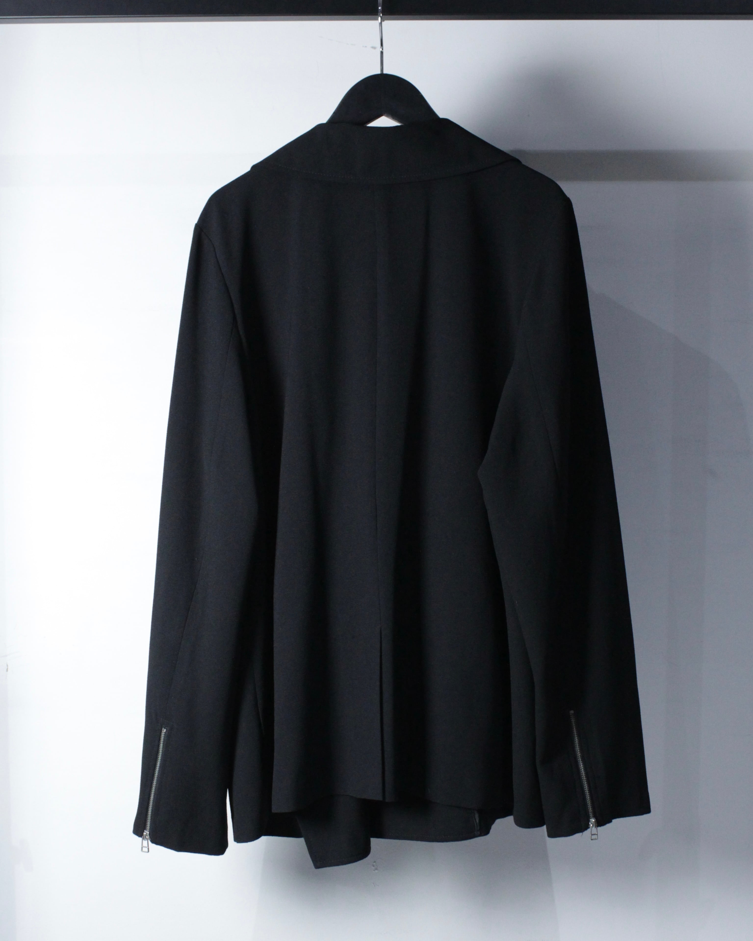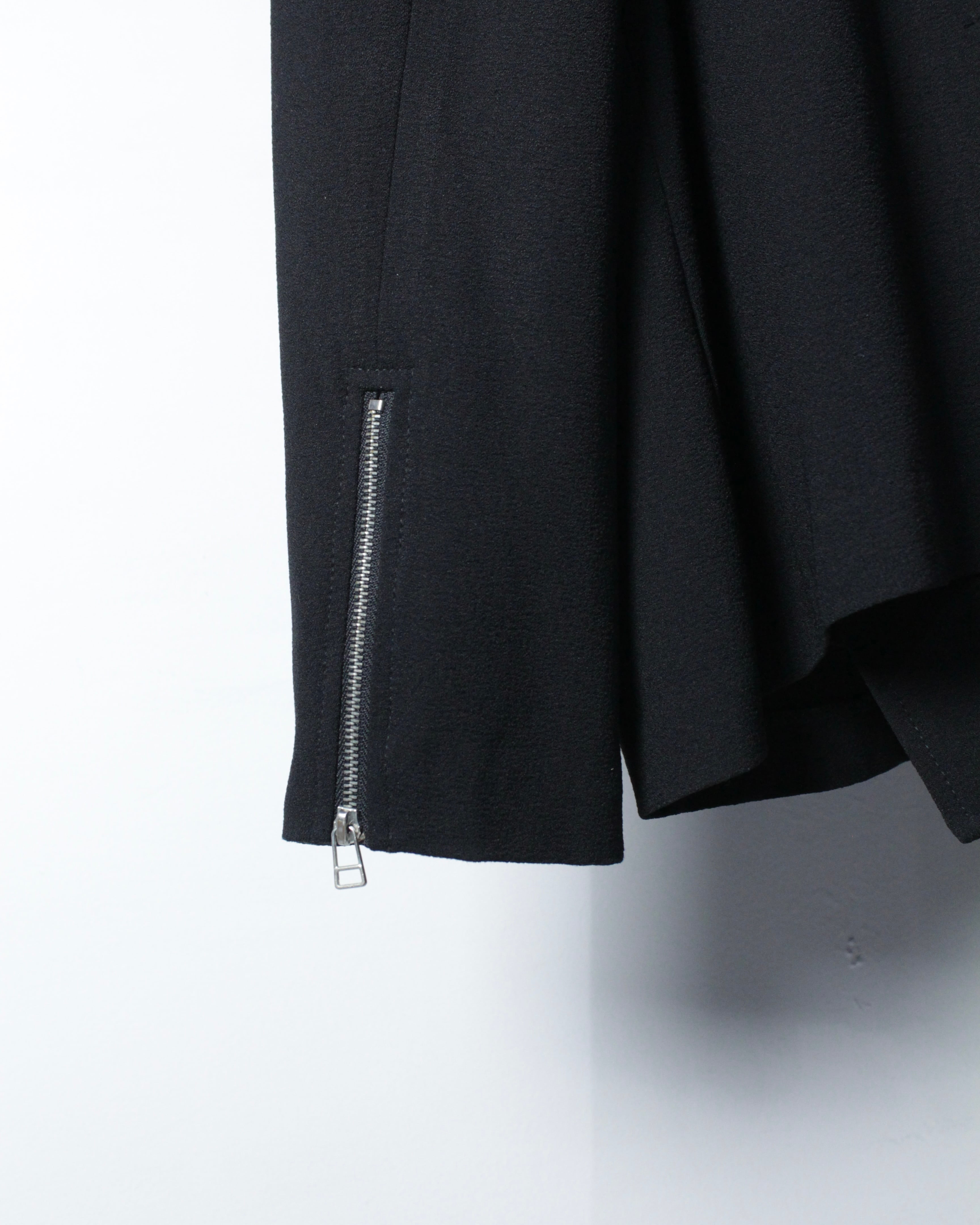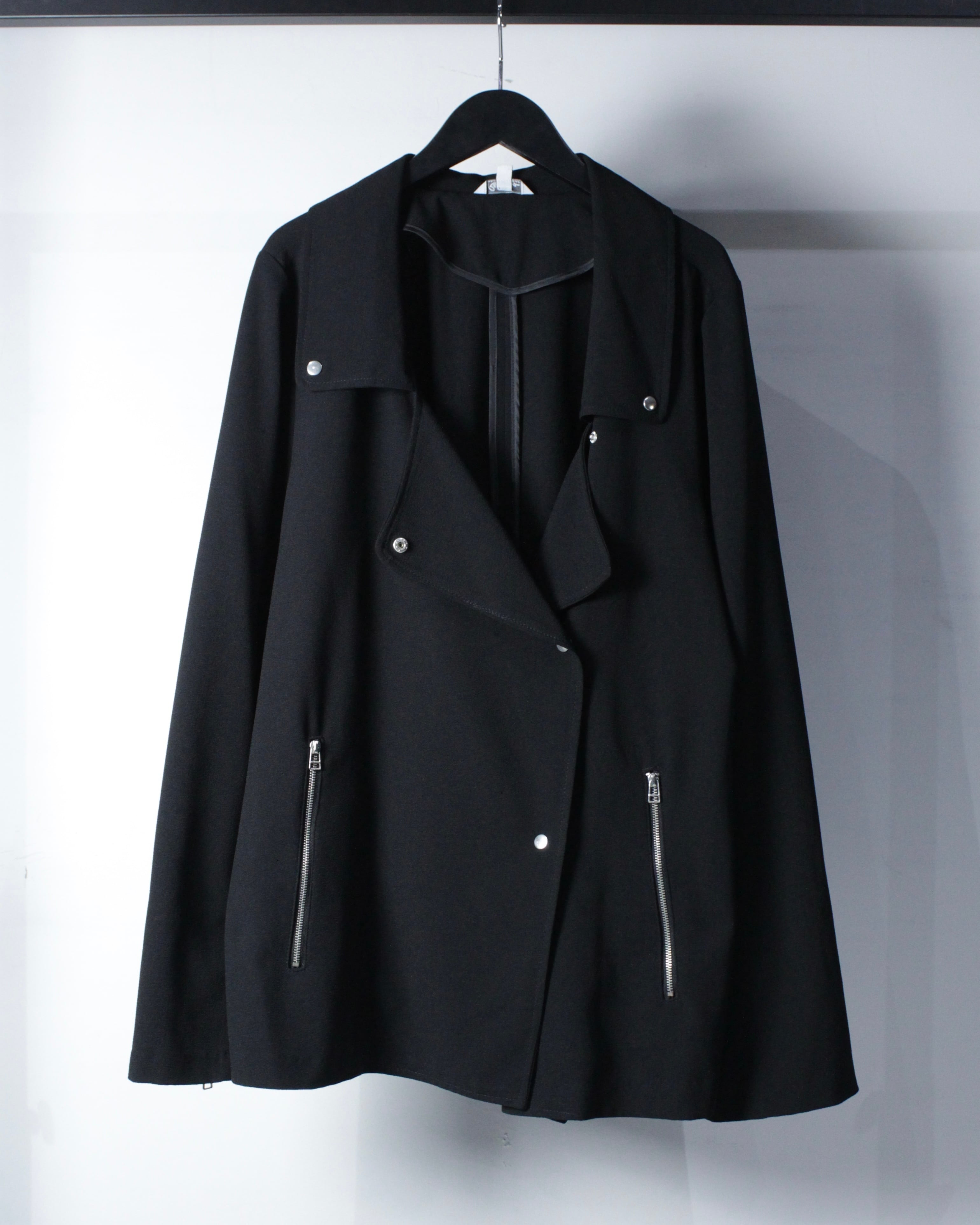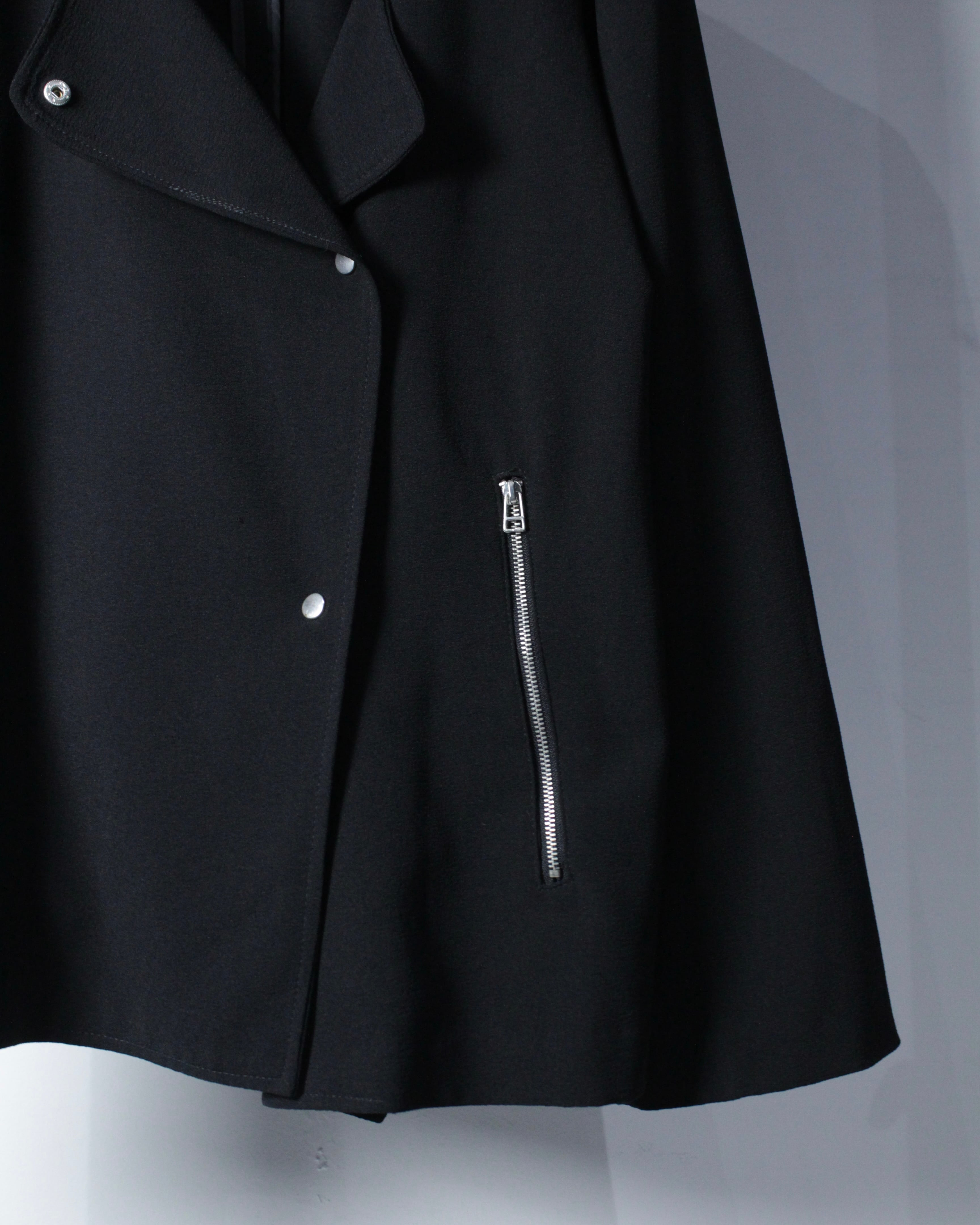 ダブルライダース由来のラペルデザイン、アシンメトリーなフロントに、随所に配されたメタルスナップやジップポケットがアクセントに。袖口にもジップを備え、ライダースの要素が組み込まれながらも無骨になりすぎない、絶妙なデザインバランスが◎