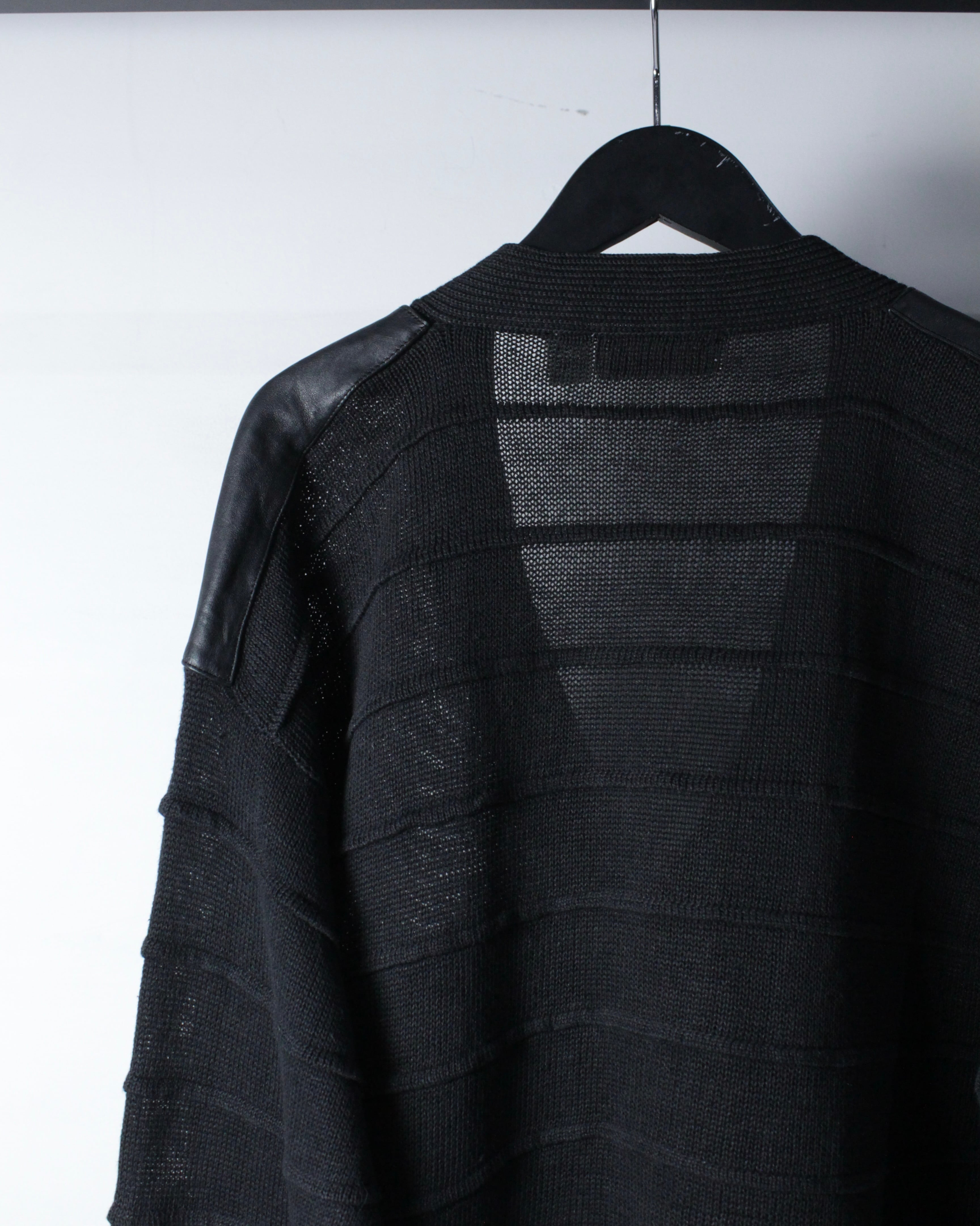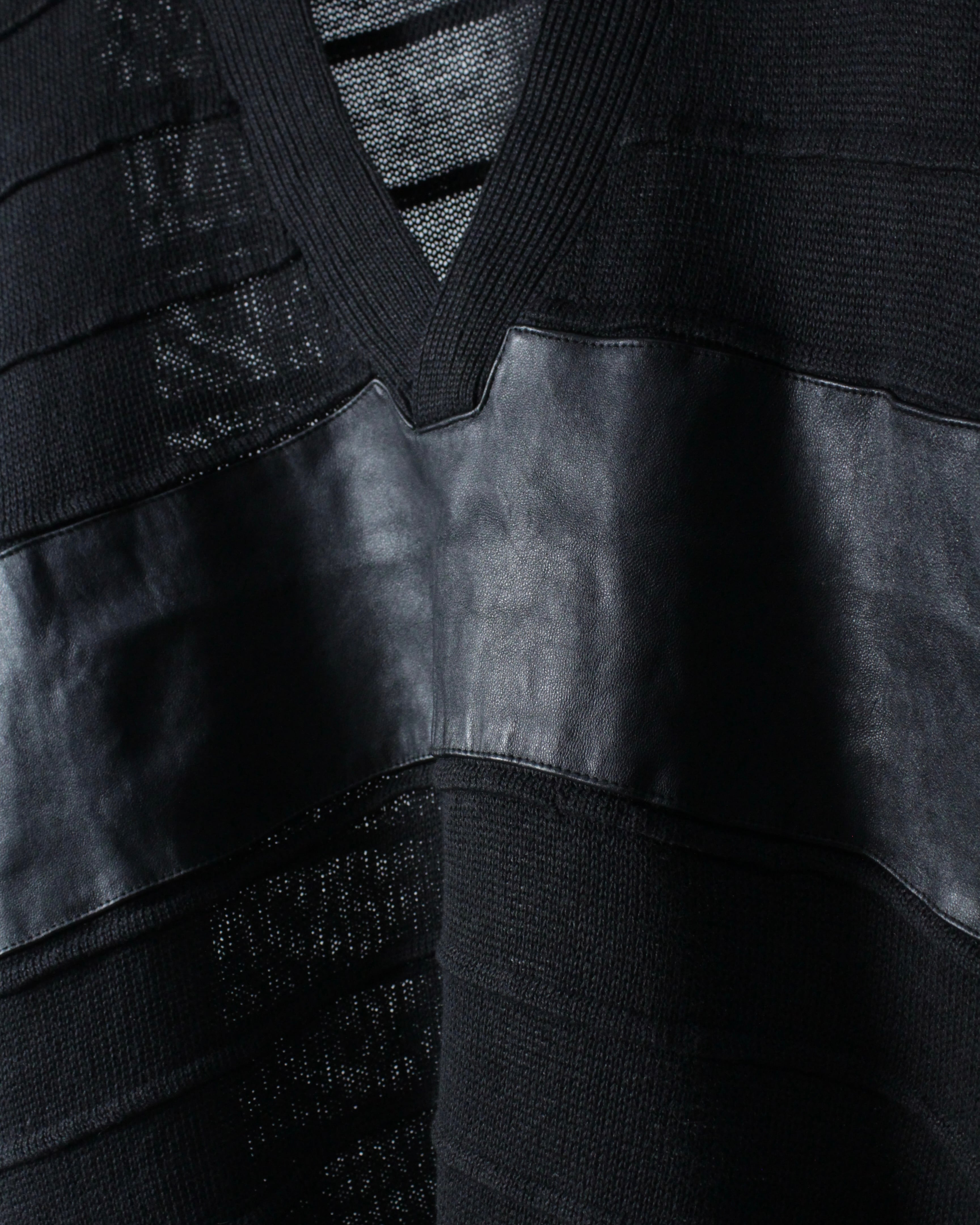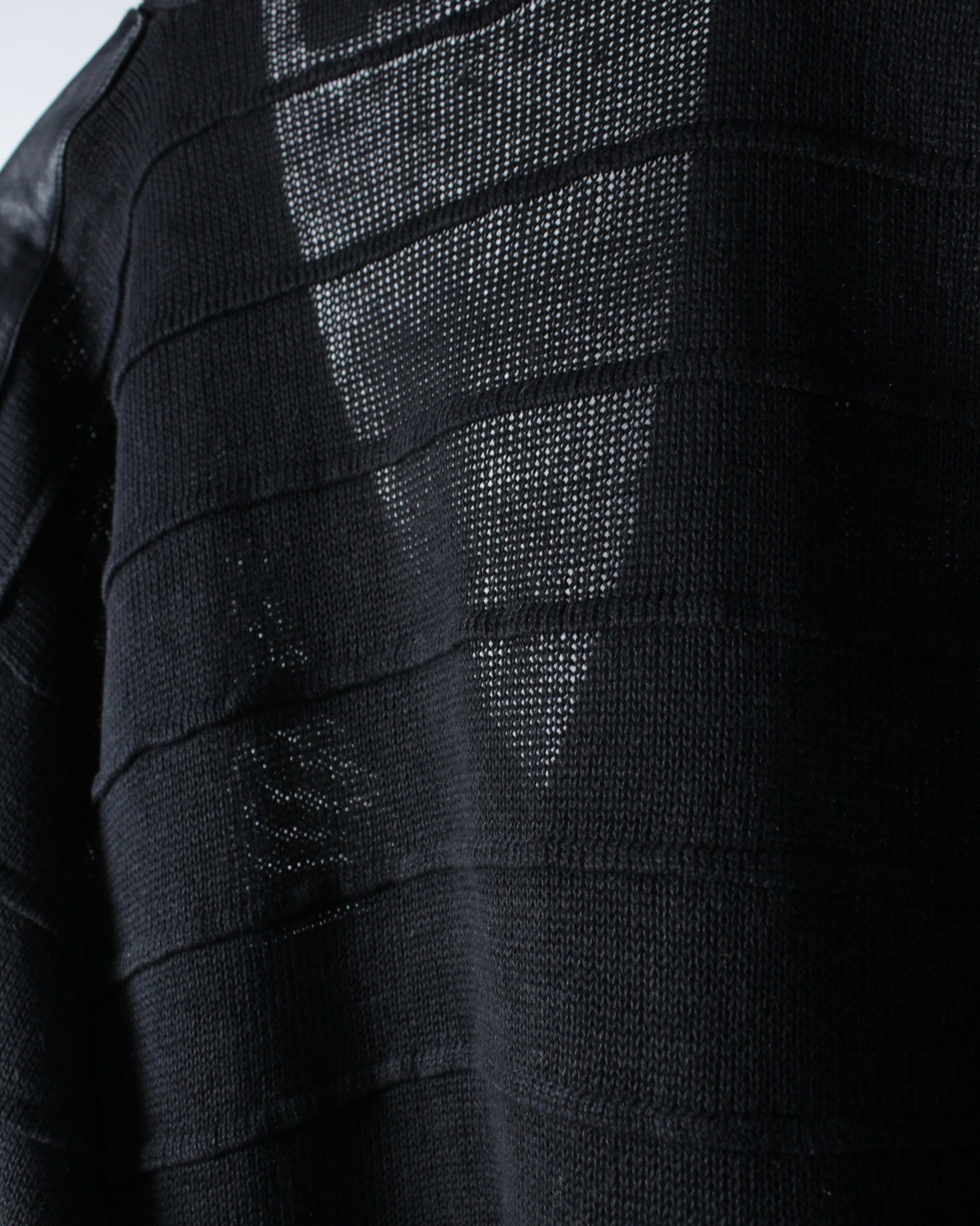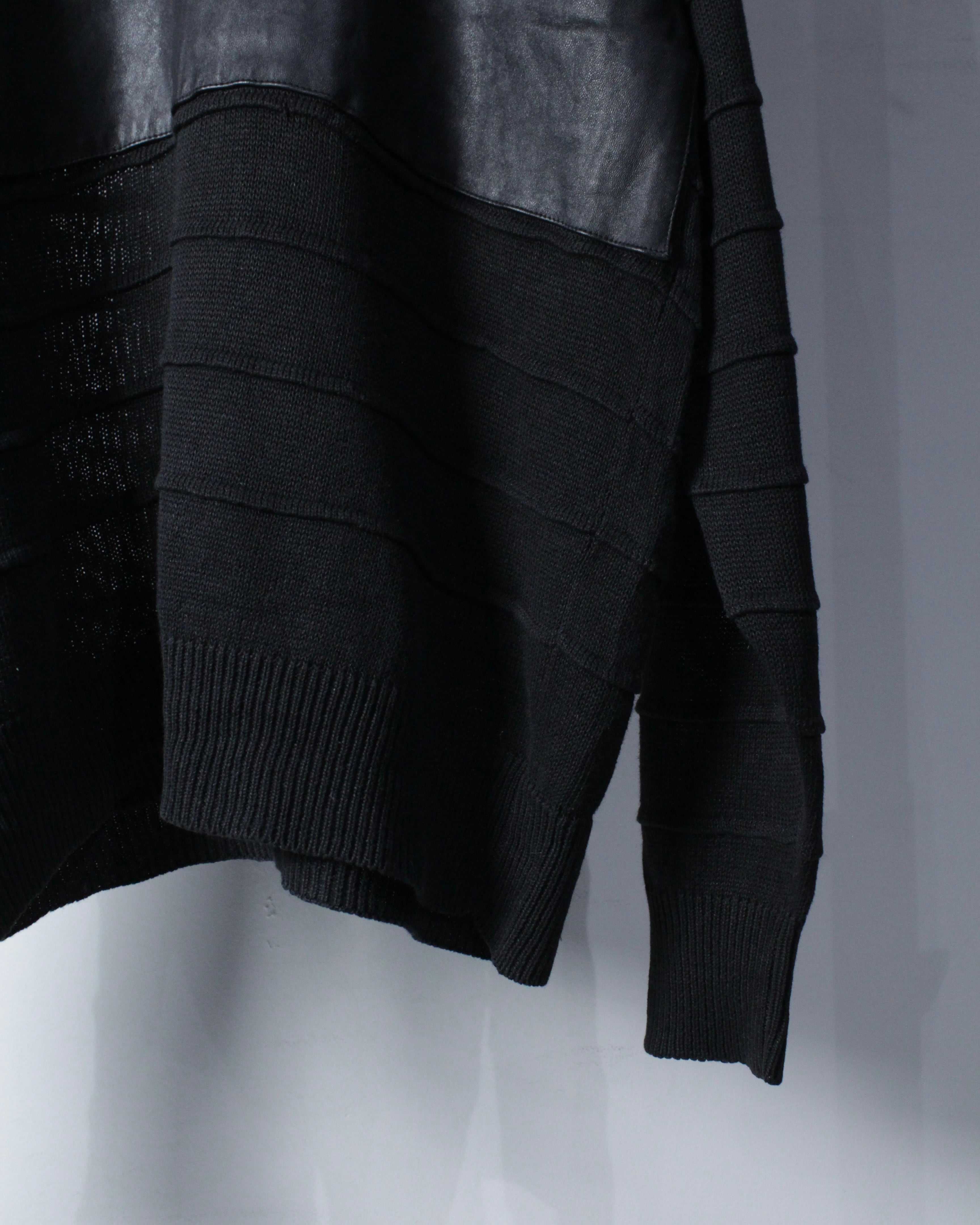 ボーダー状に立体感のあるニッティングが施されたボディに、フロントと肩部分へ滑らかなブラックレザーを切り替えた1着。