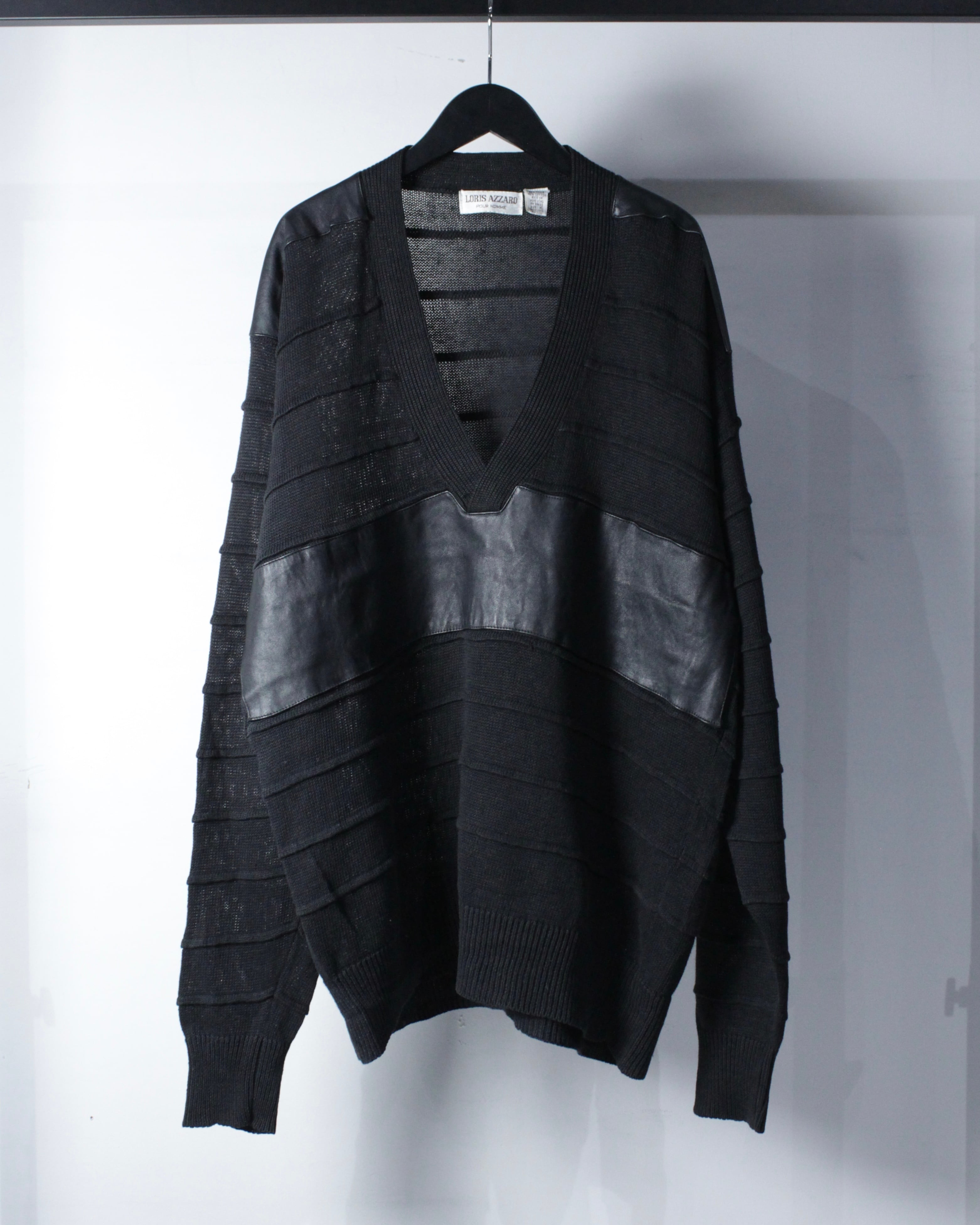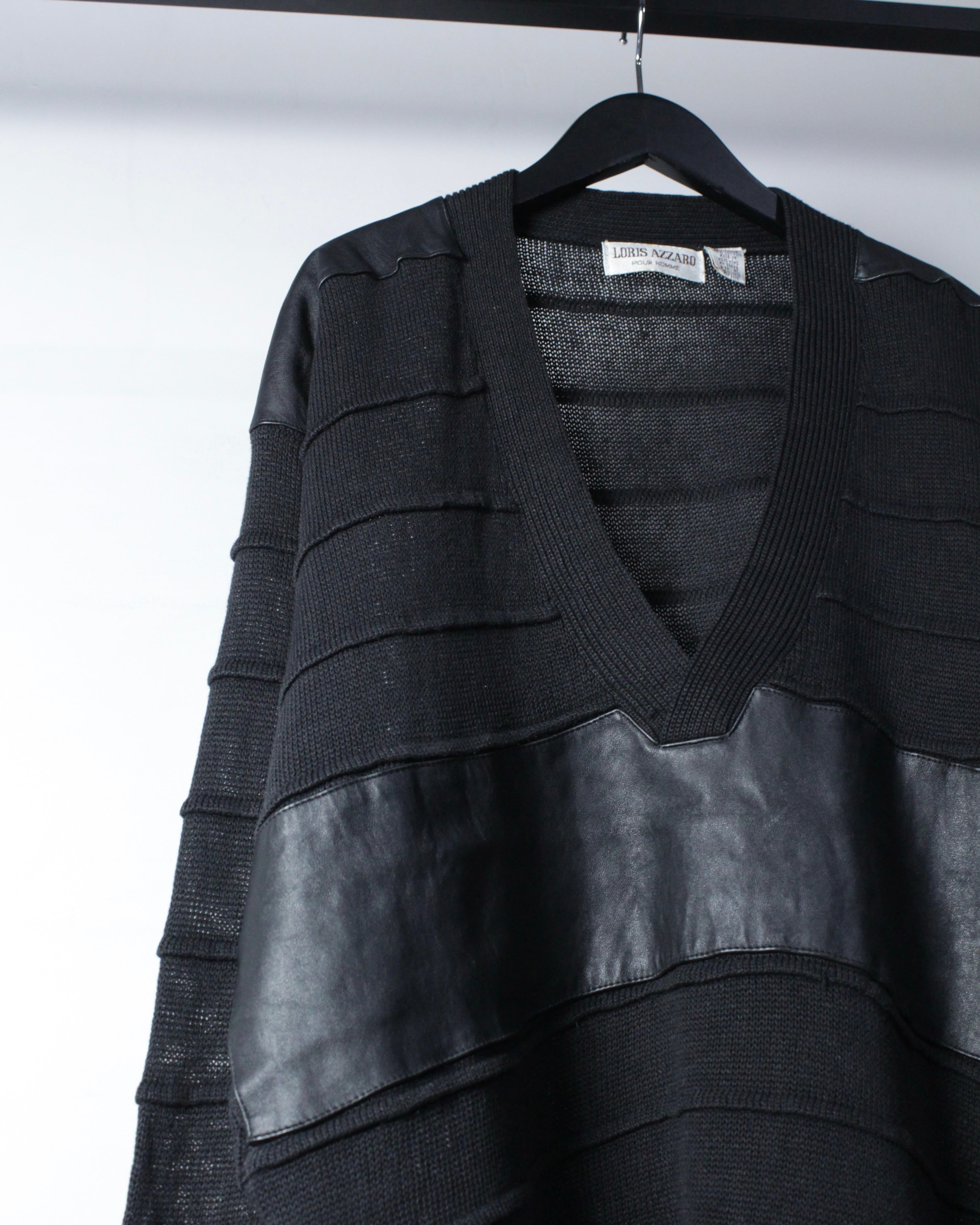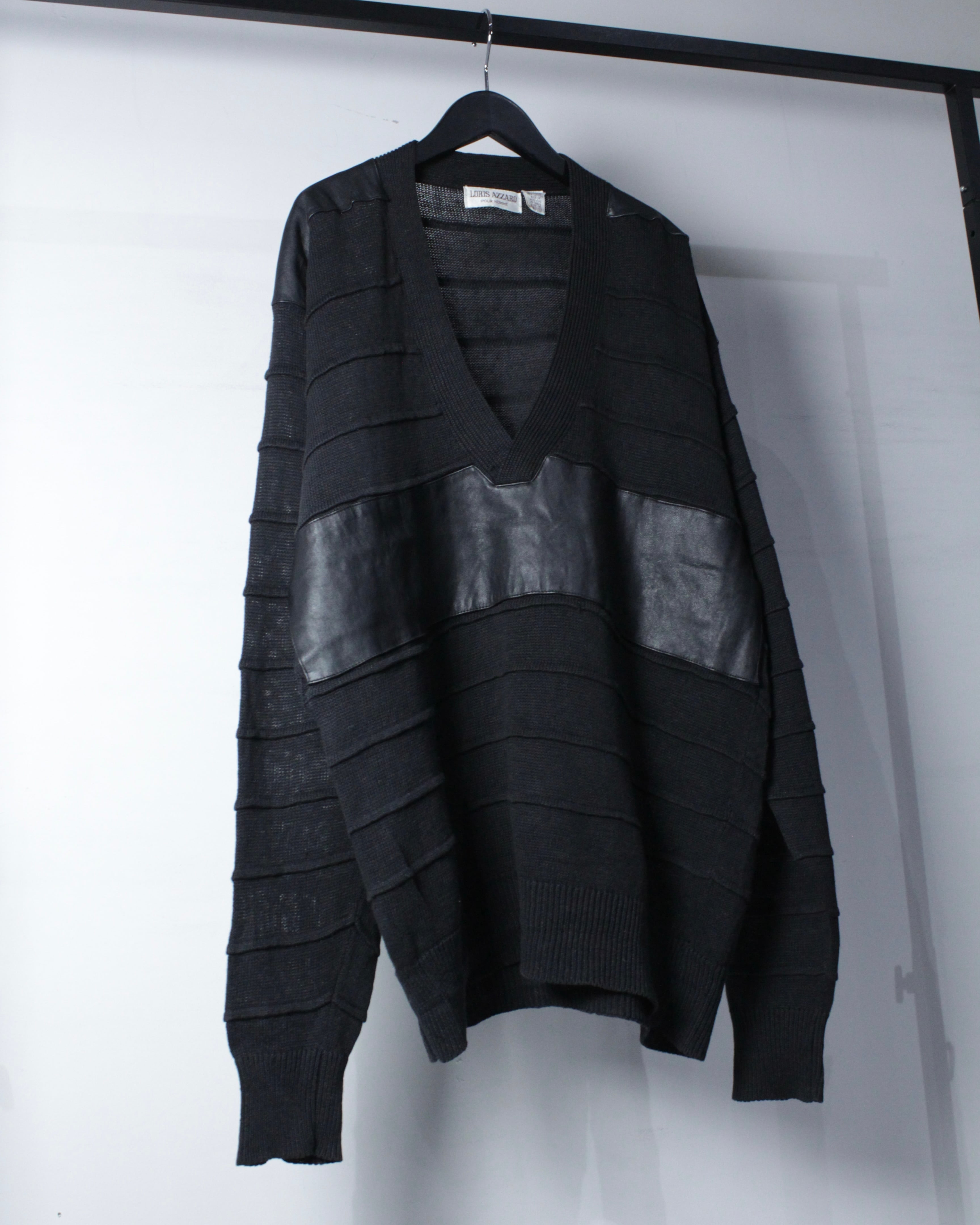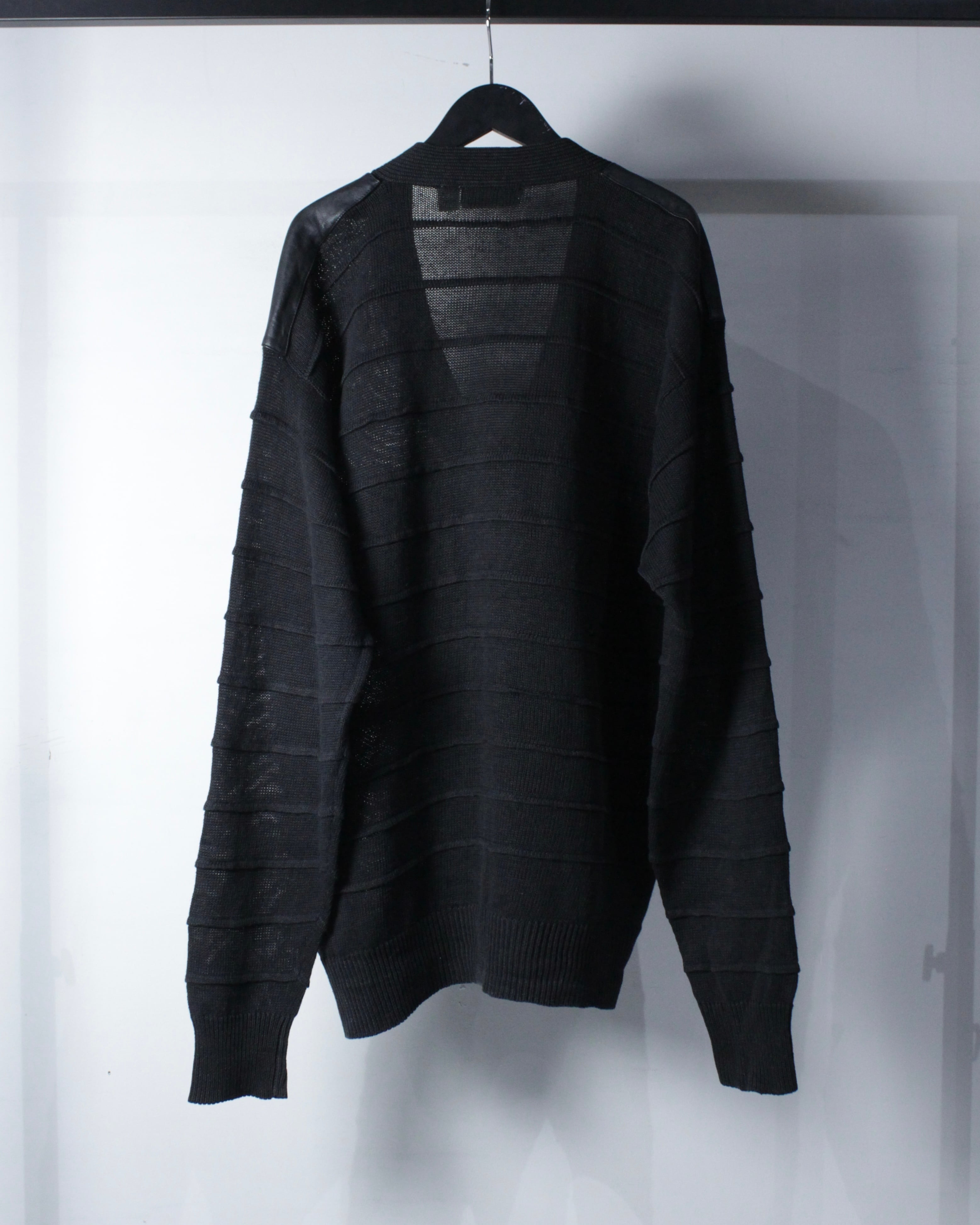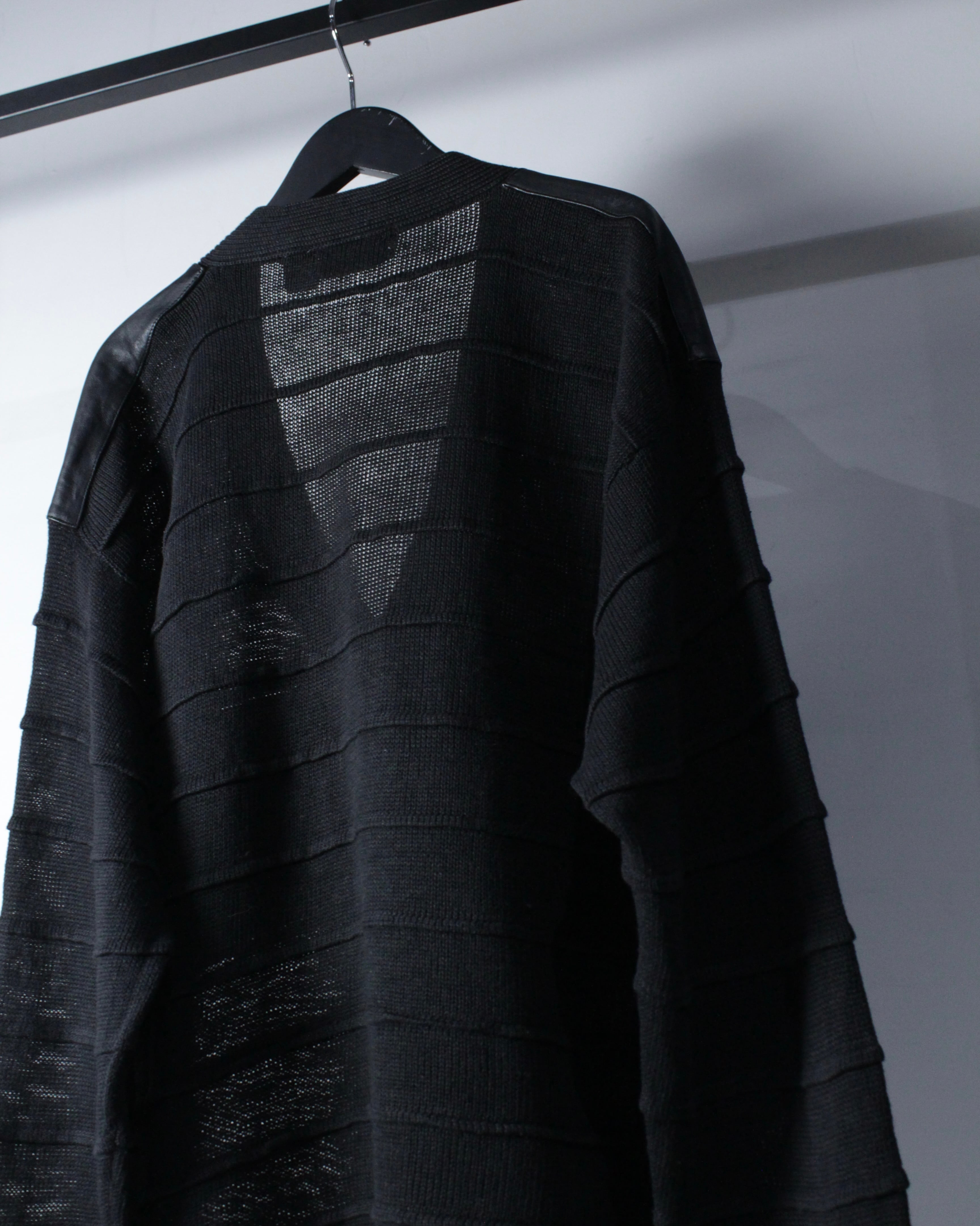 ボーダー状に立体感のあるニッティングが施されたボディに、フロントと肩部分へ滑らかなブラックレザーを切り替えた1着。