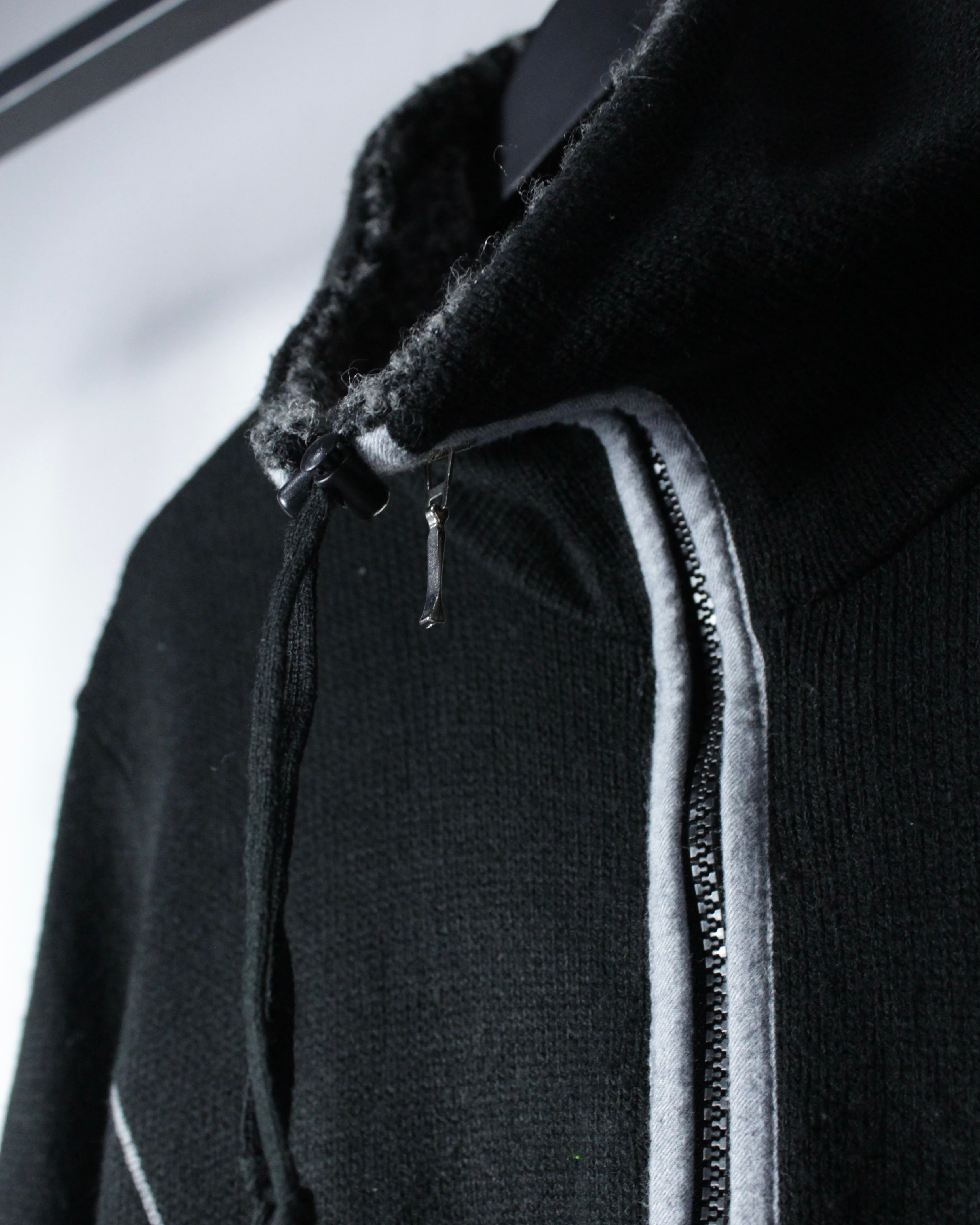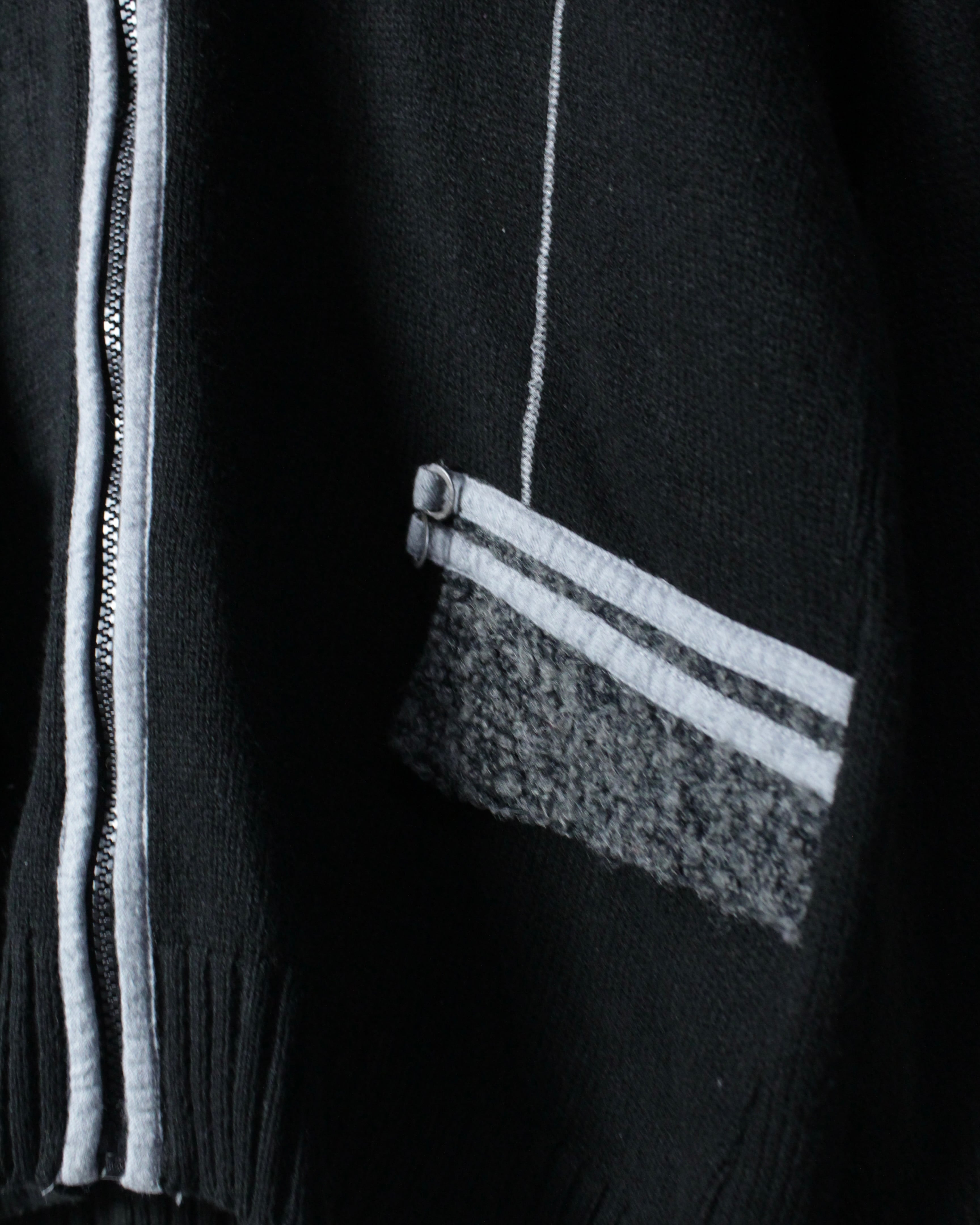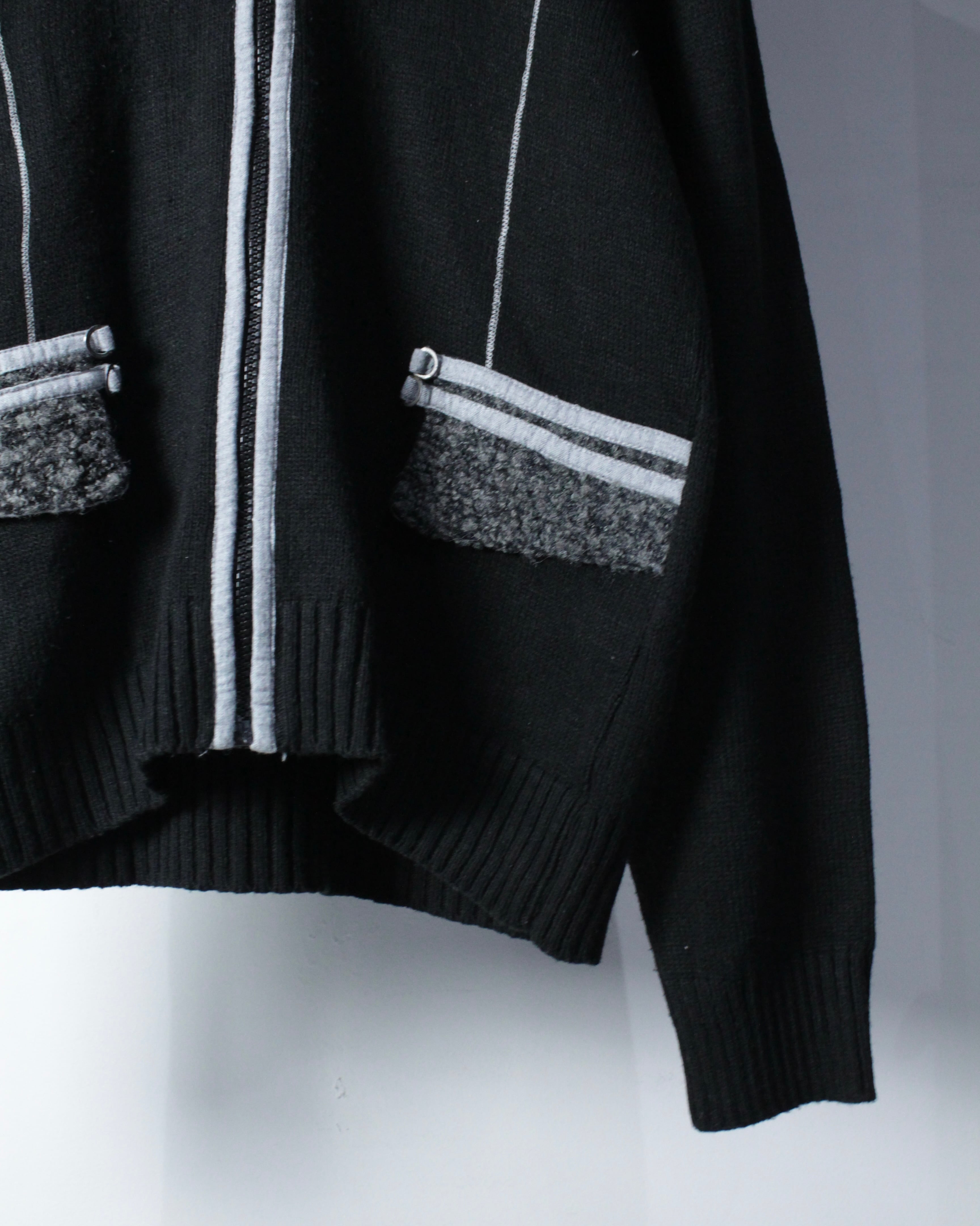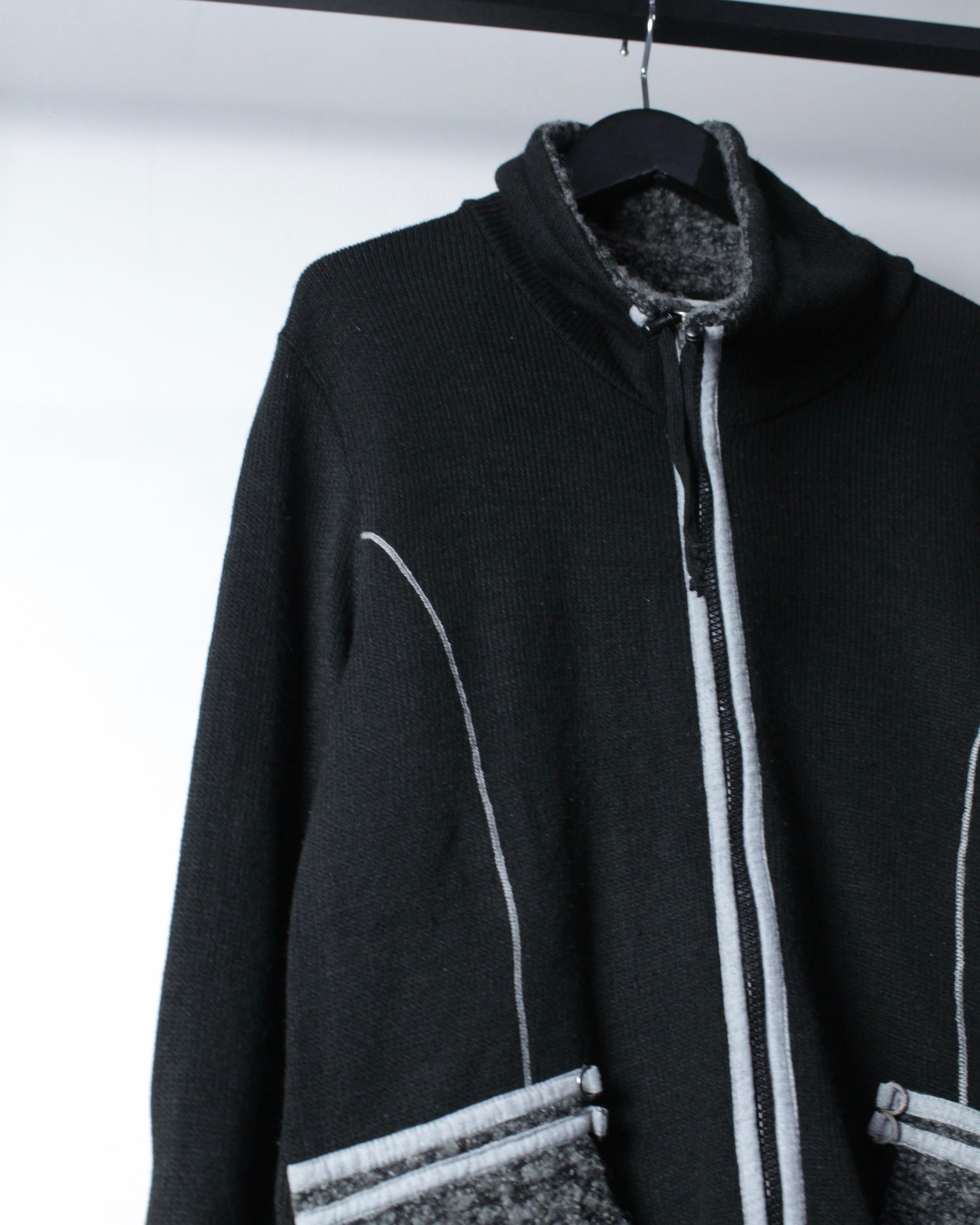 全体は落ち着いたブラックのニットボディ。程よく肉感のある編み地に、フロントジップ両脇へ走るライトグレーのパイピングがシャープなアクセントを加えています。