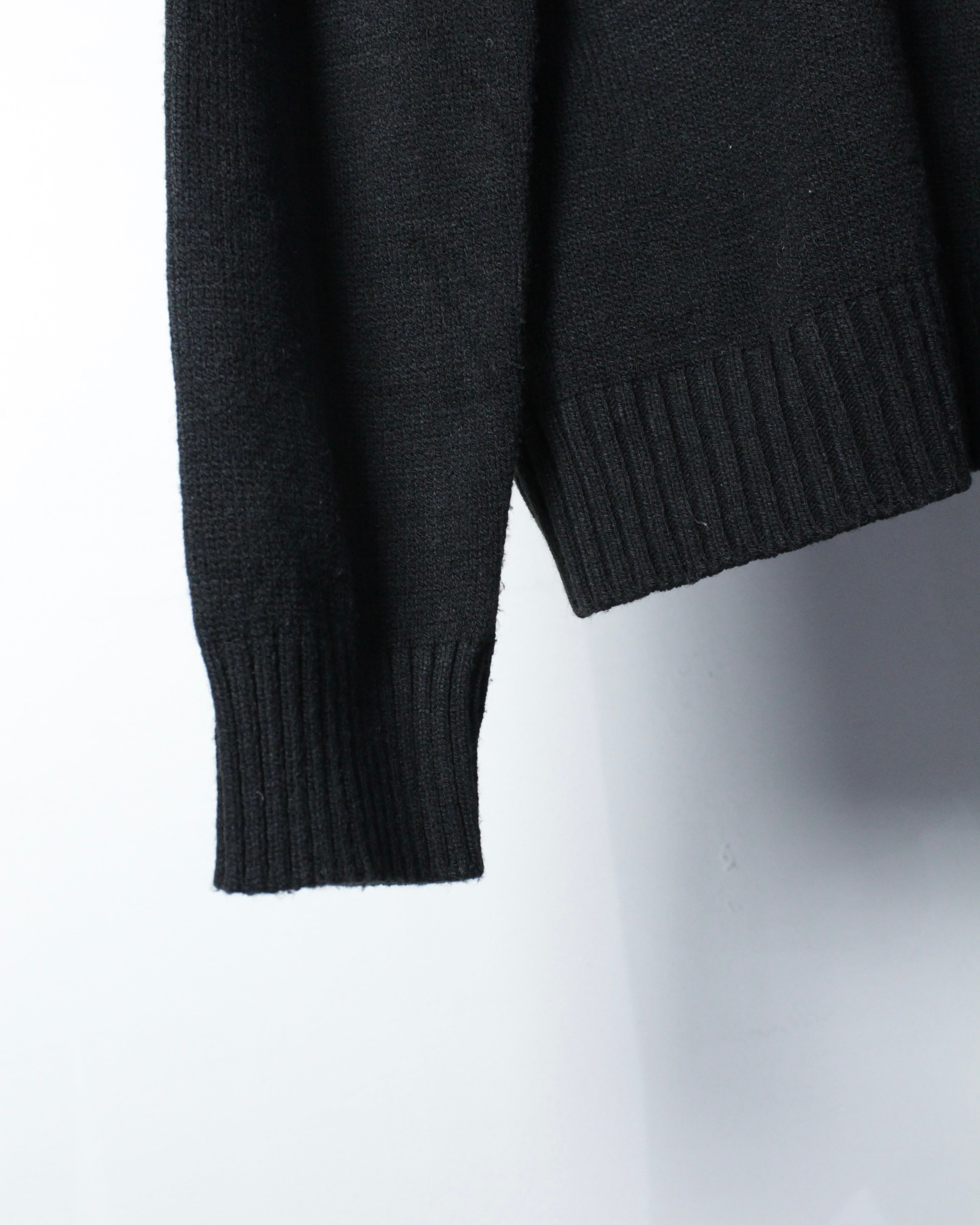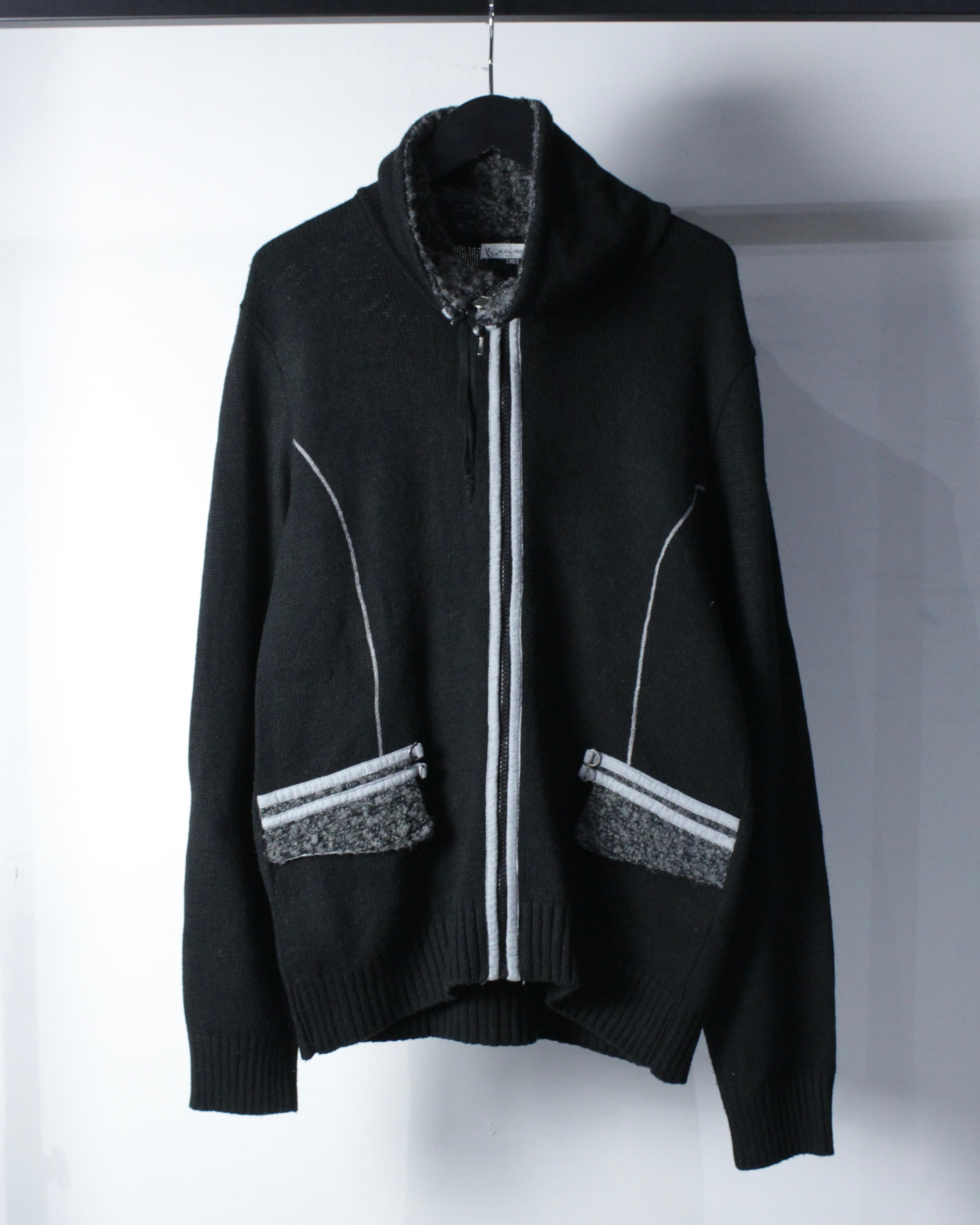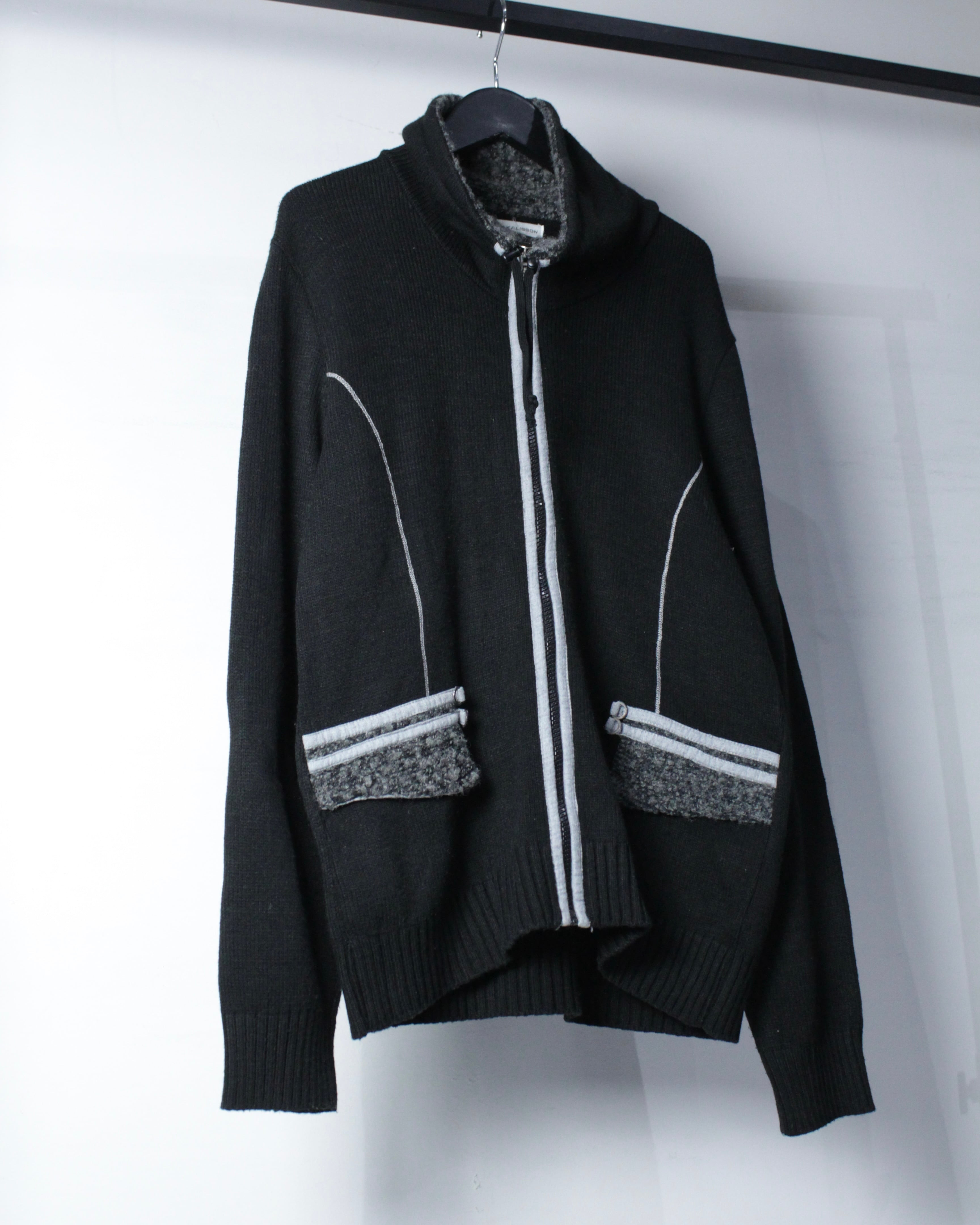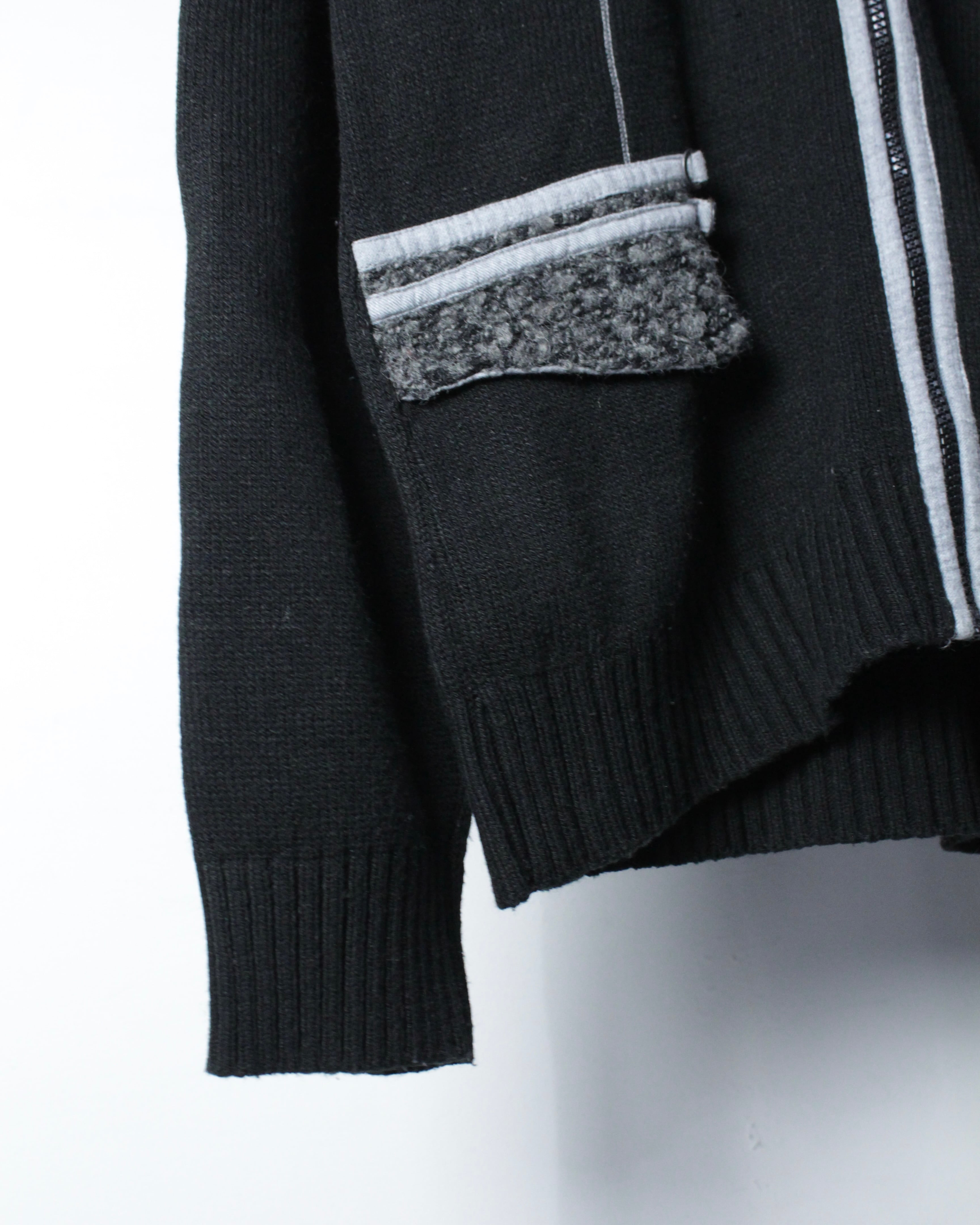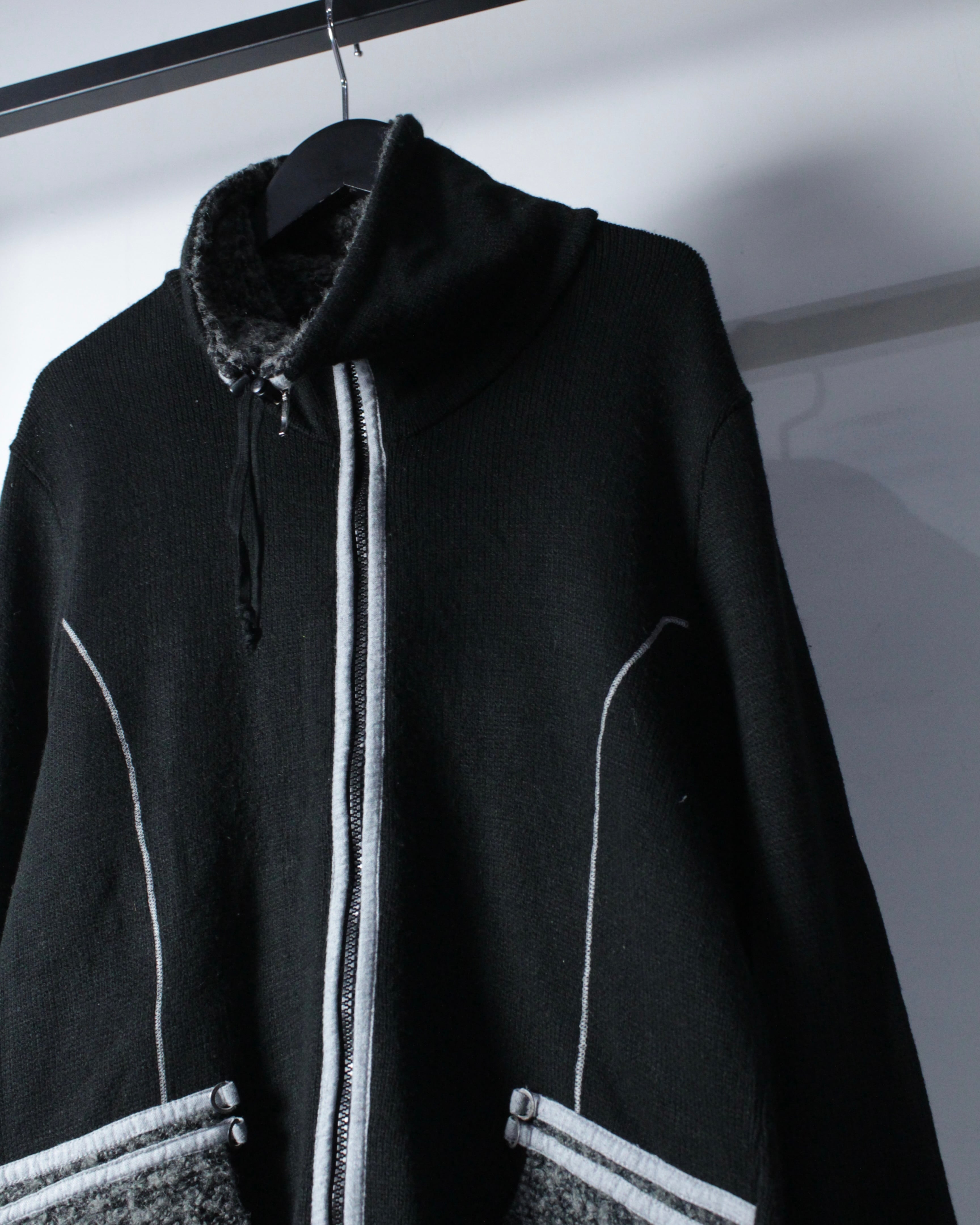 全体は落ち着いたブラックのニットボディ。程よく肉感のある編み地に、フロントジップ両脇へ走るライトグレーのパイピングがシャープなアクセントを加えています。