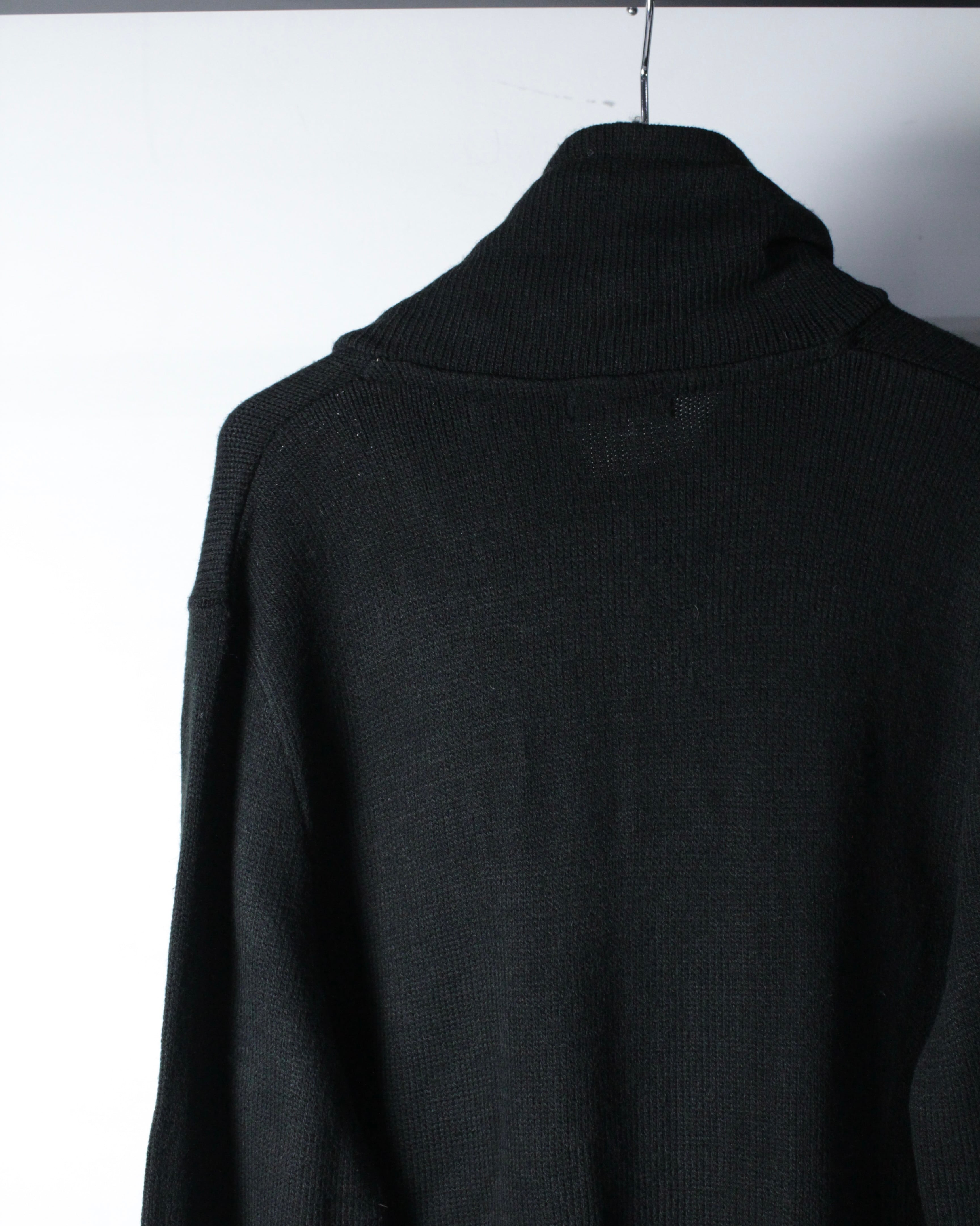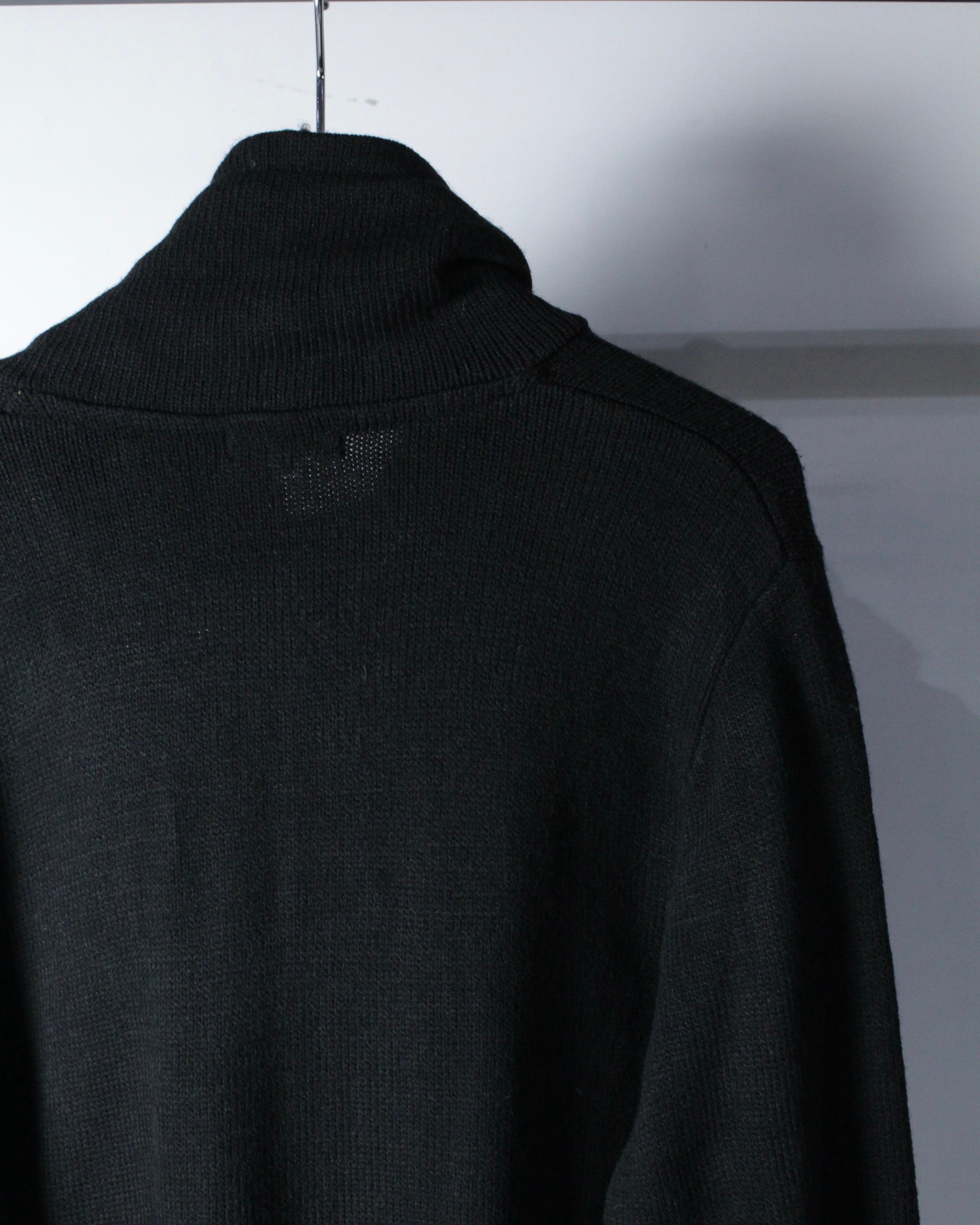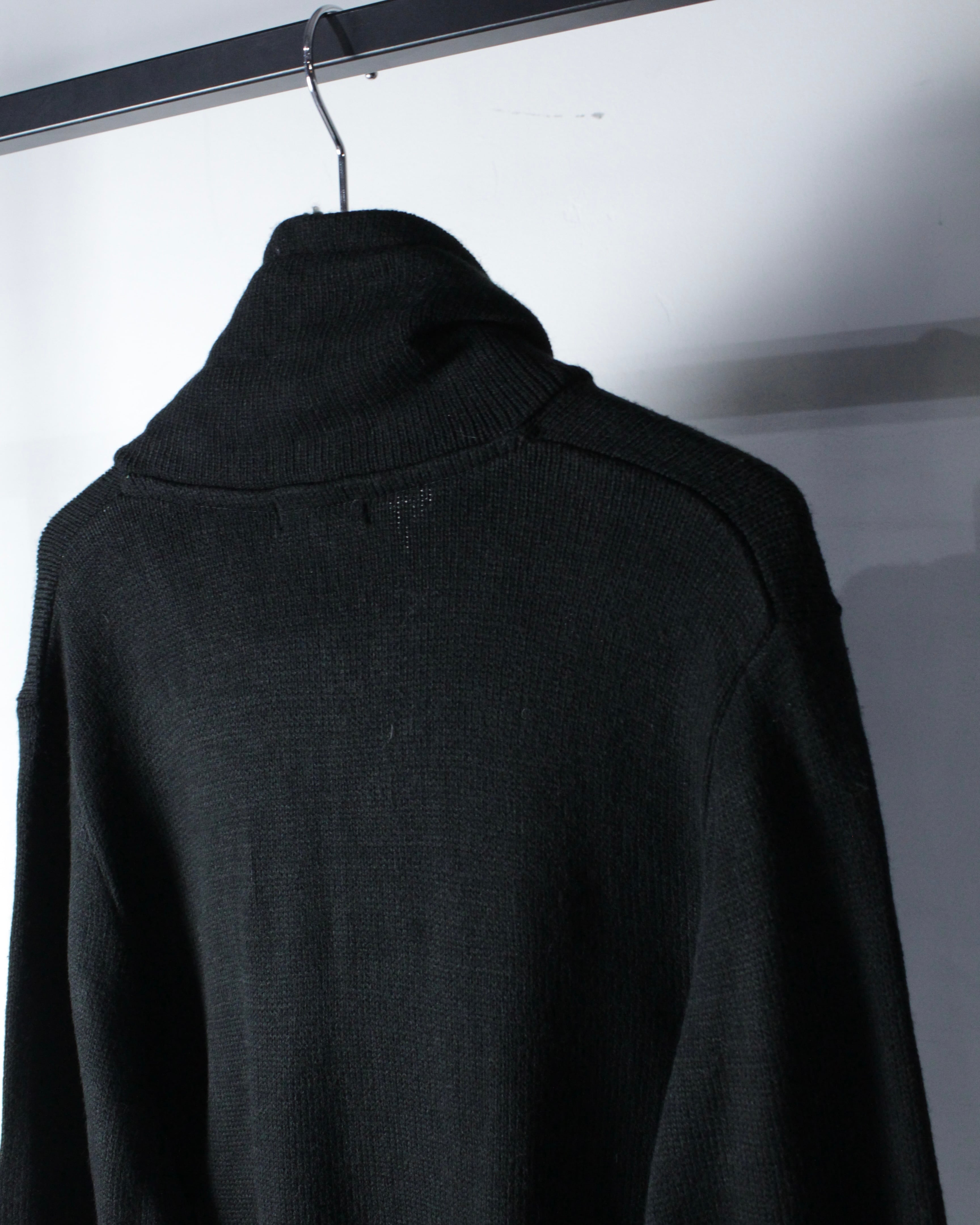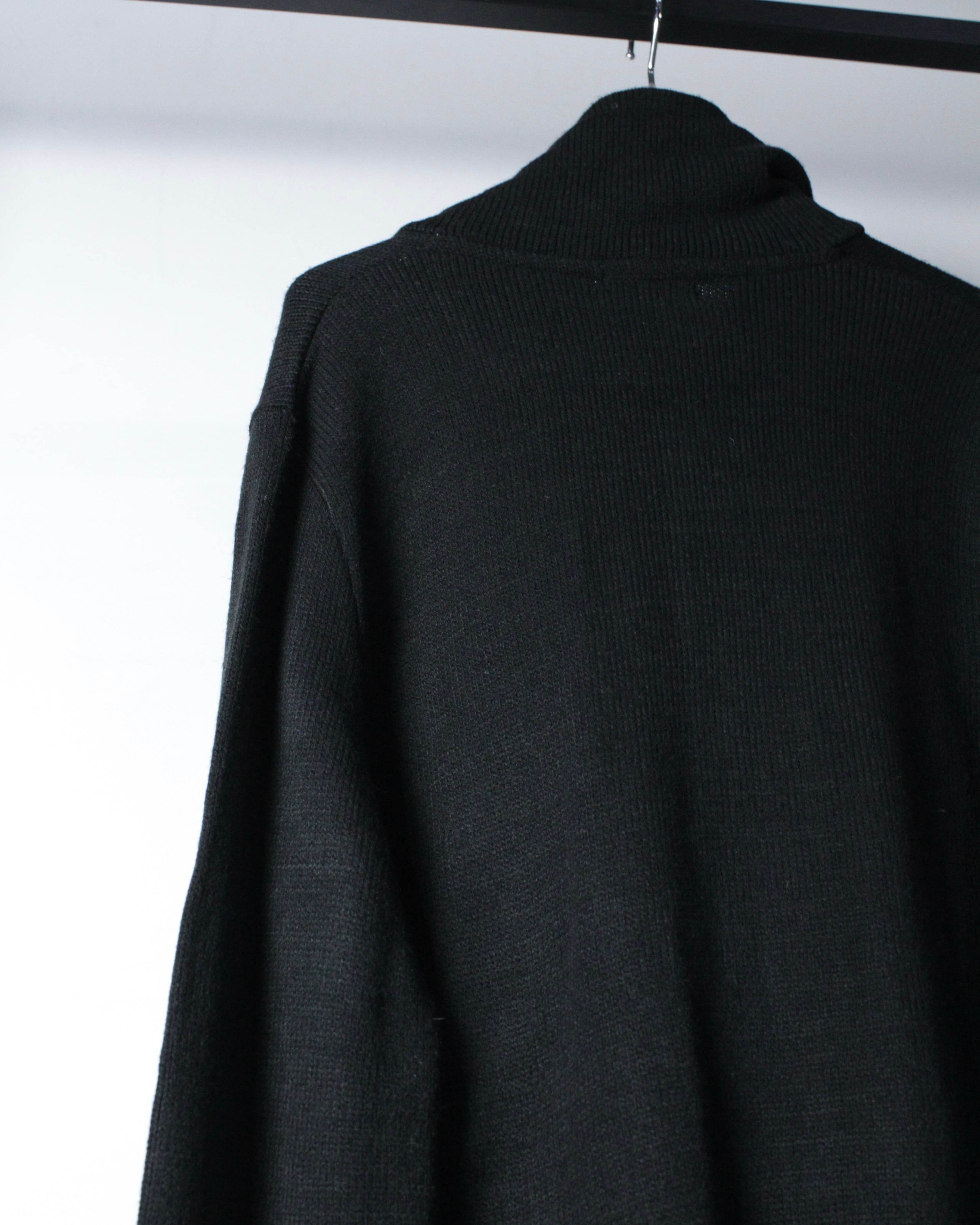 全体は落ち着いたブラックのニットボディ。程よく肉感のある編み地に、フロントジップ両脇へ走るライトグレーのパイピングがシャープなアクセントを加えています。