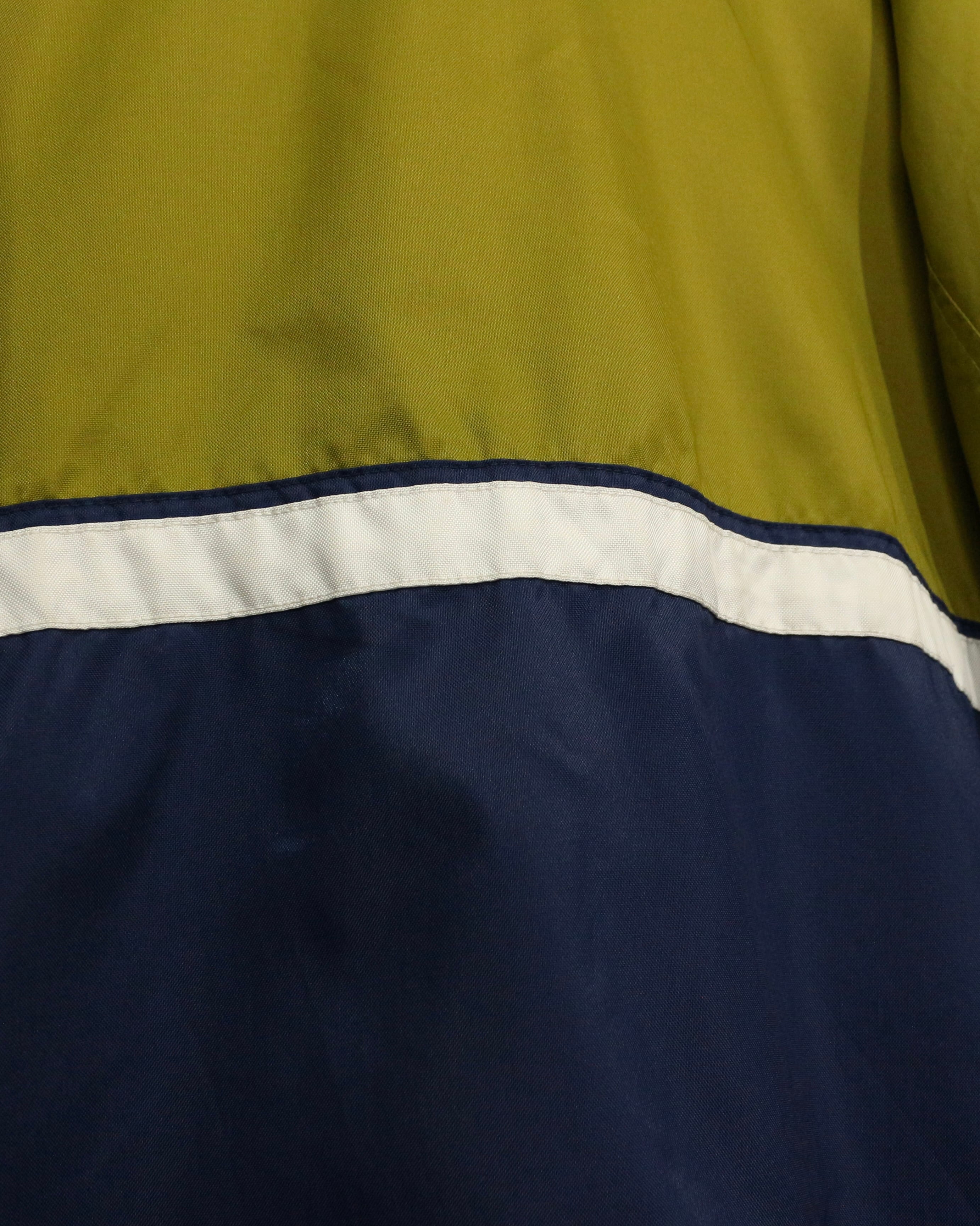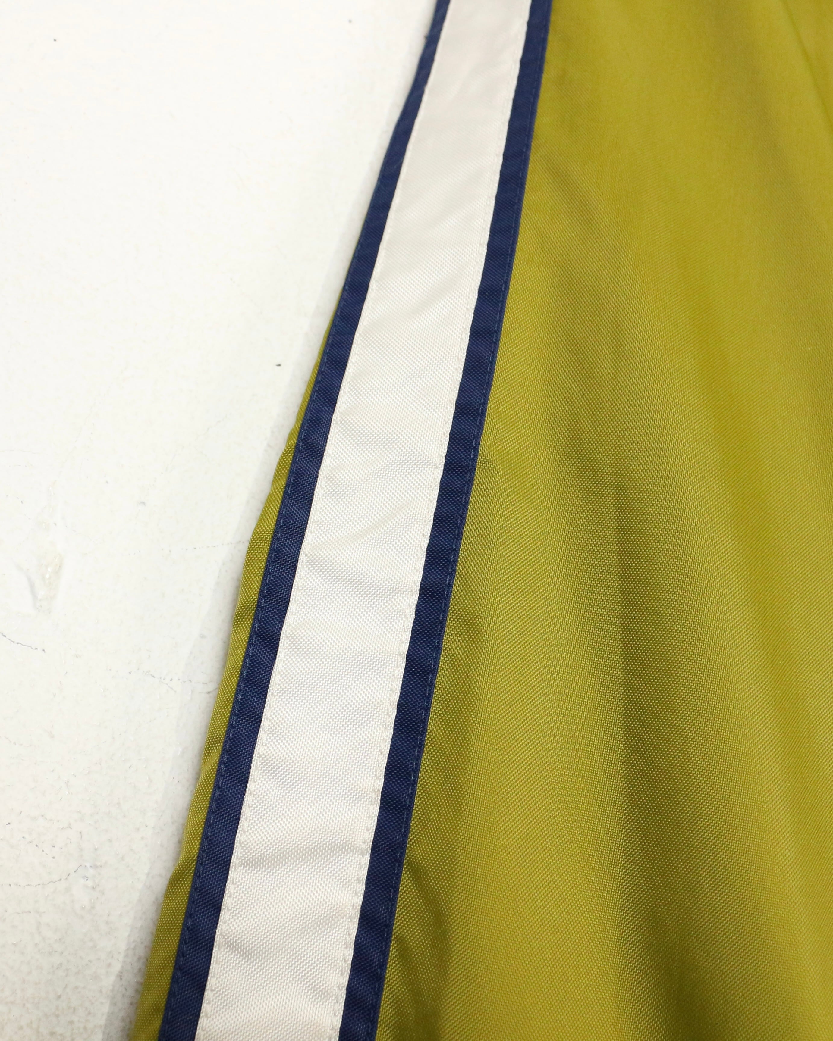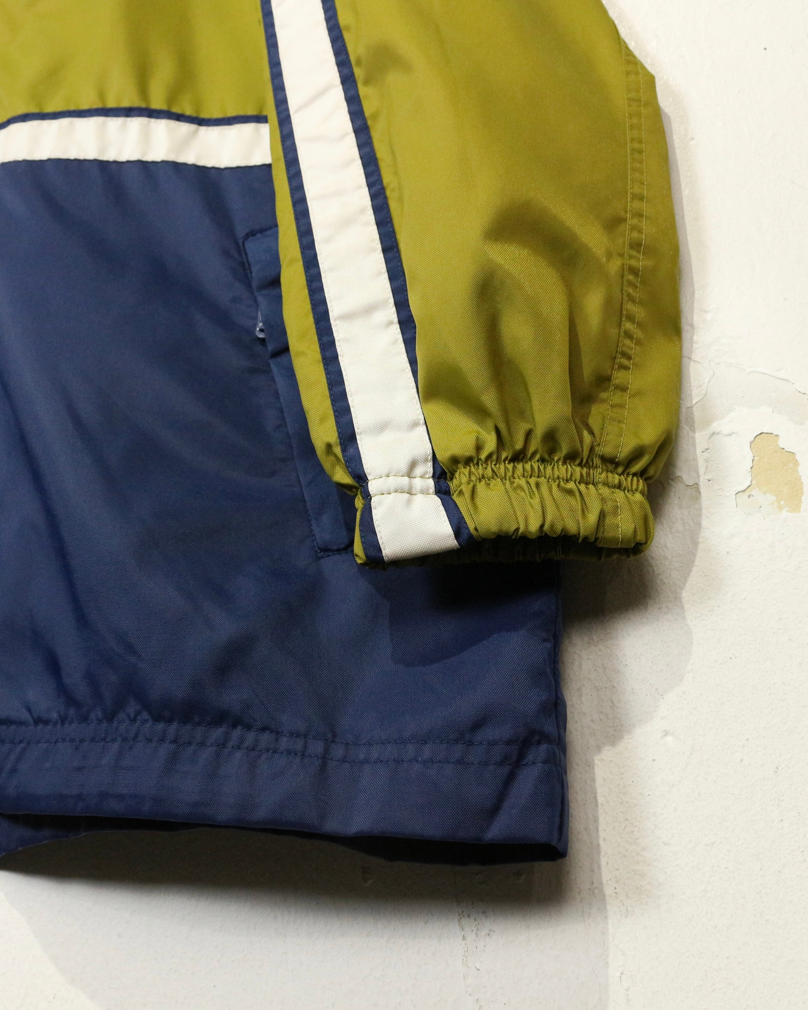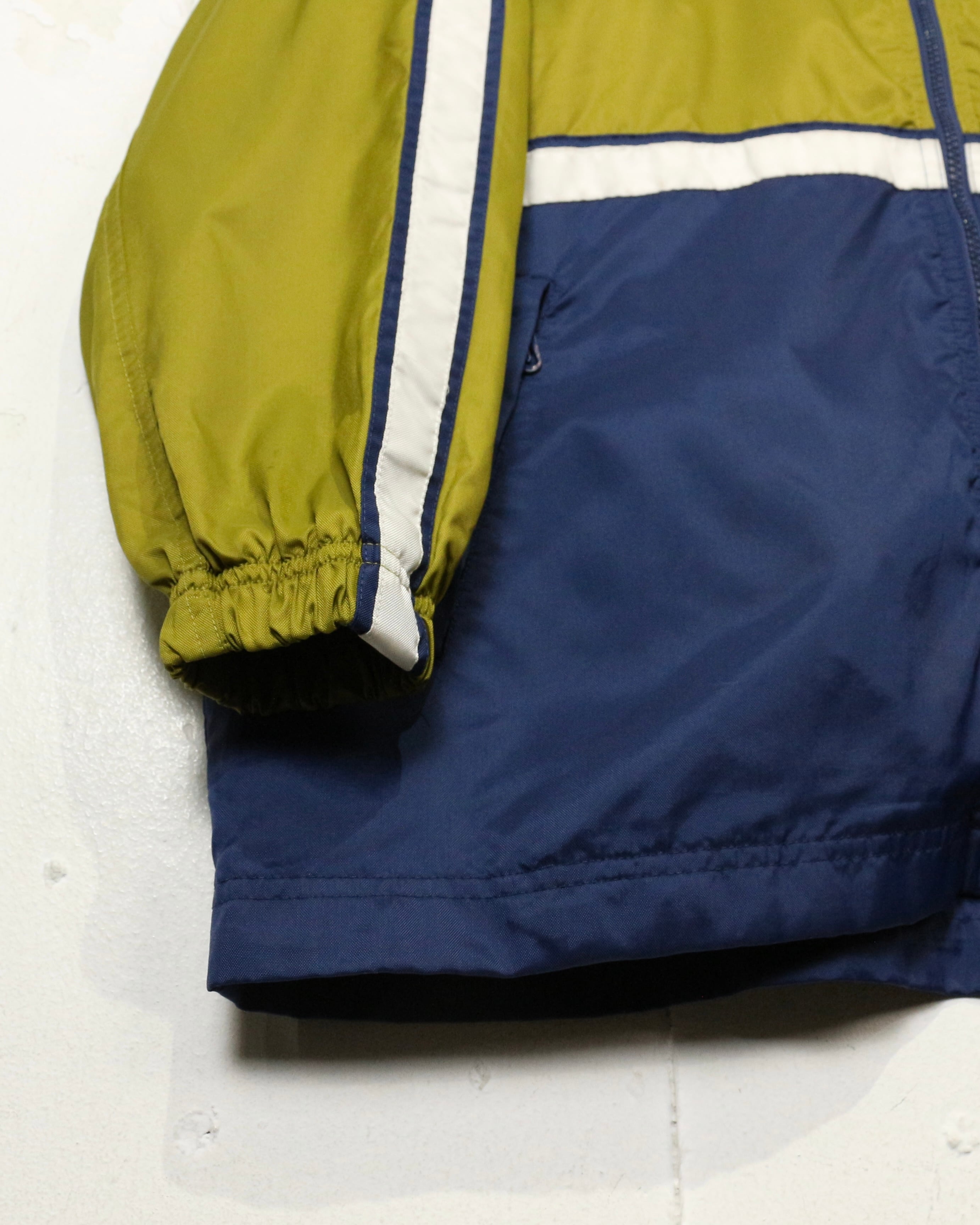 オリーブイエローをベースに、ネイビーの切り替えとホワイトのラインテープを走らせた好配色の1着。