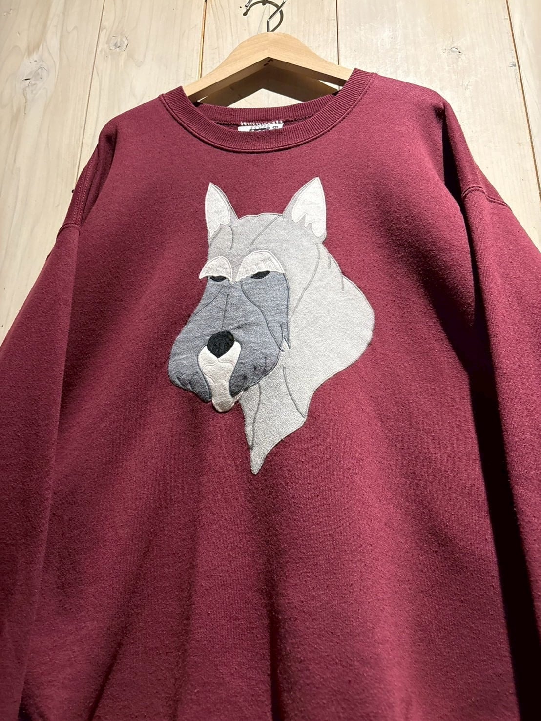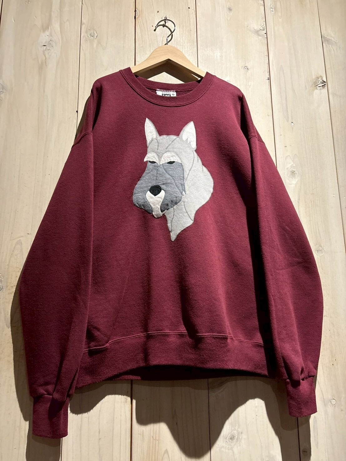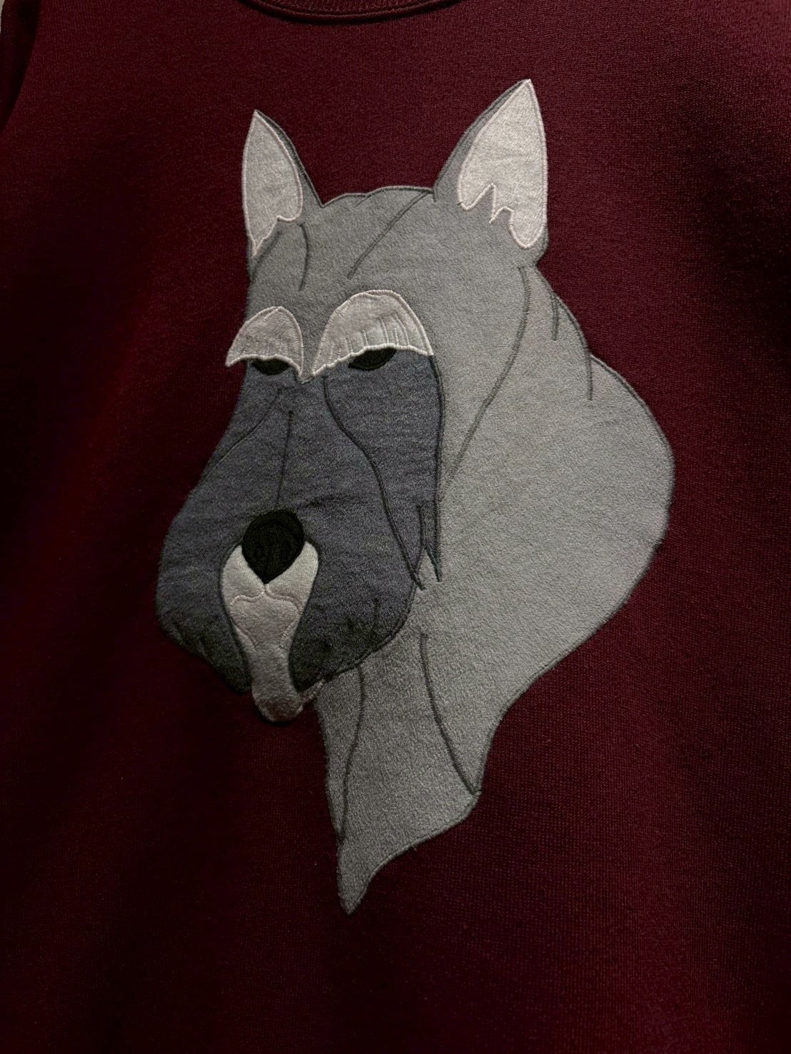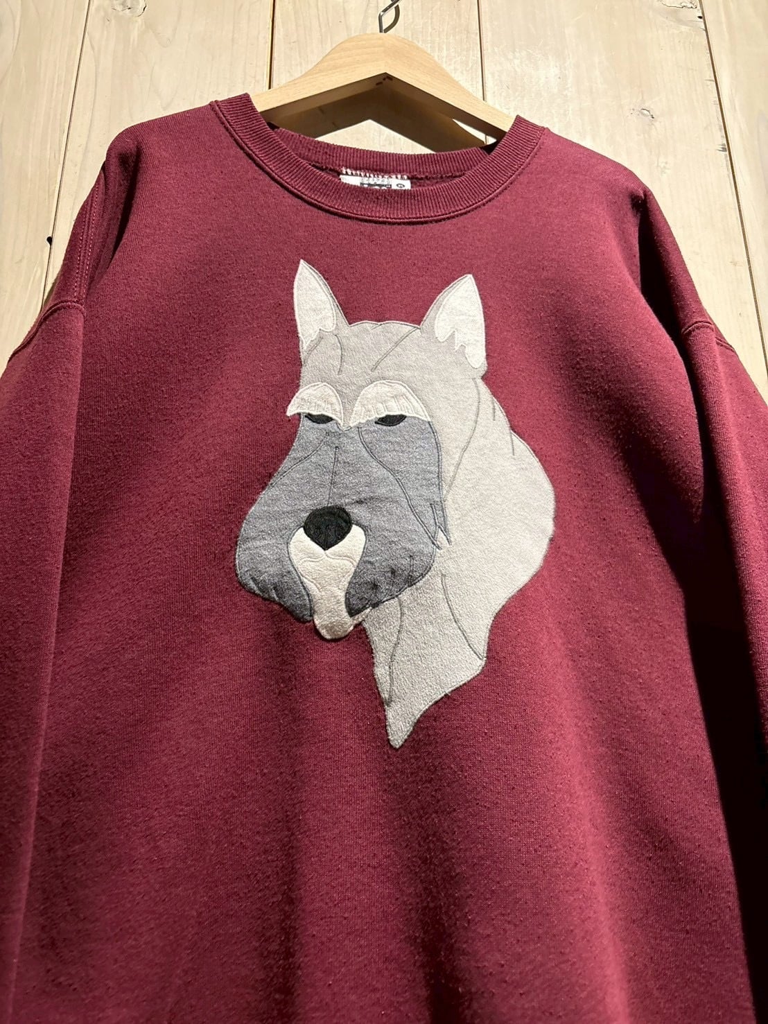 フロントには大胆なシュナウザーの立体ワッペン。グレー、ホワイトのフェルト地を重ねた仕様で、刺繍によるライン表現まで細かく作り込まれています。