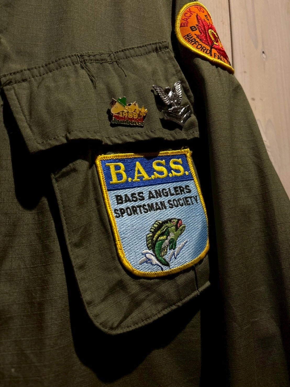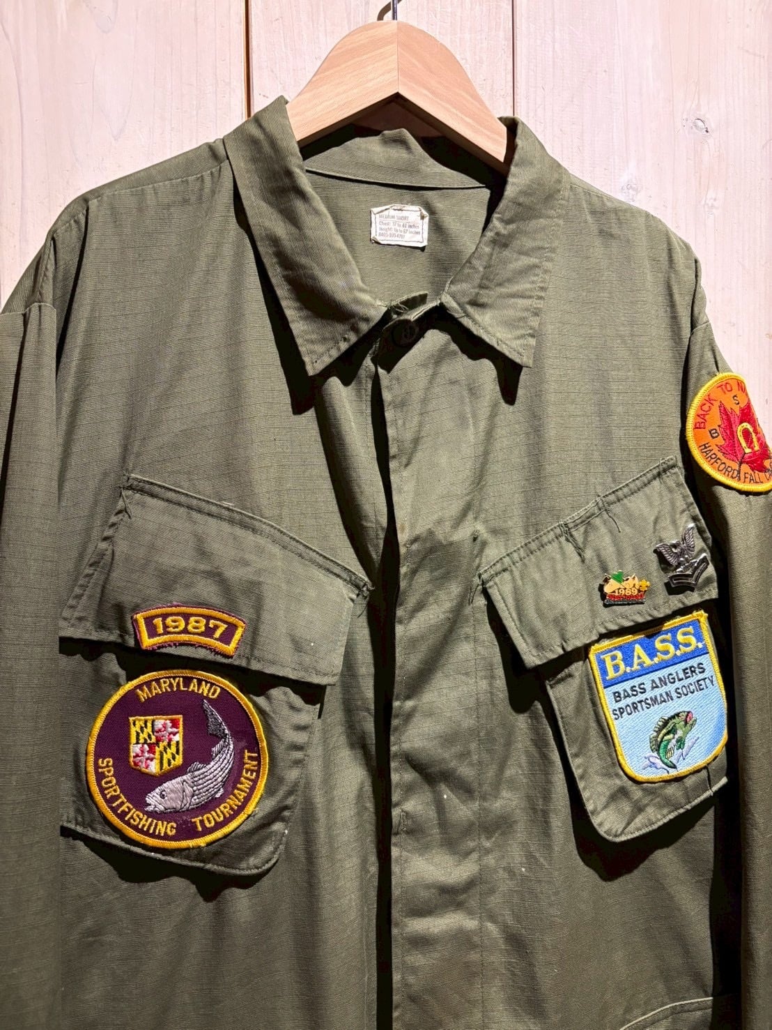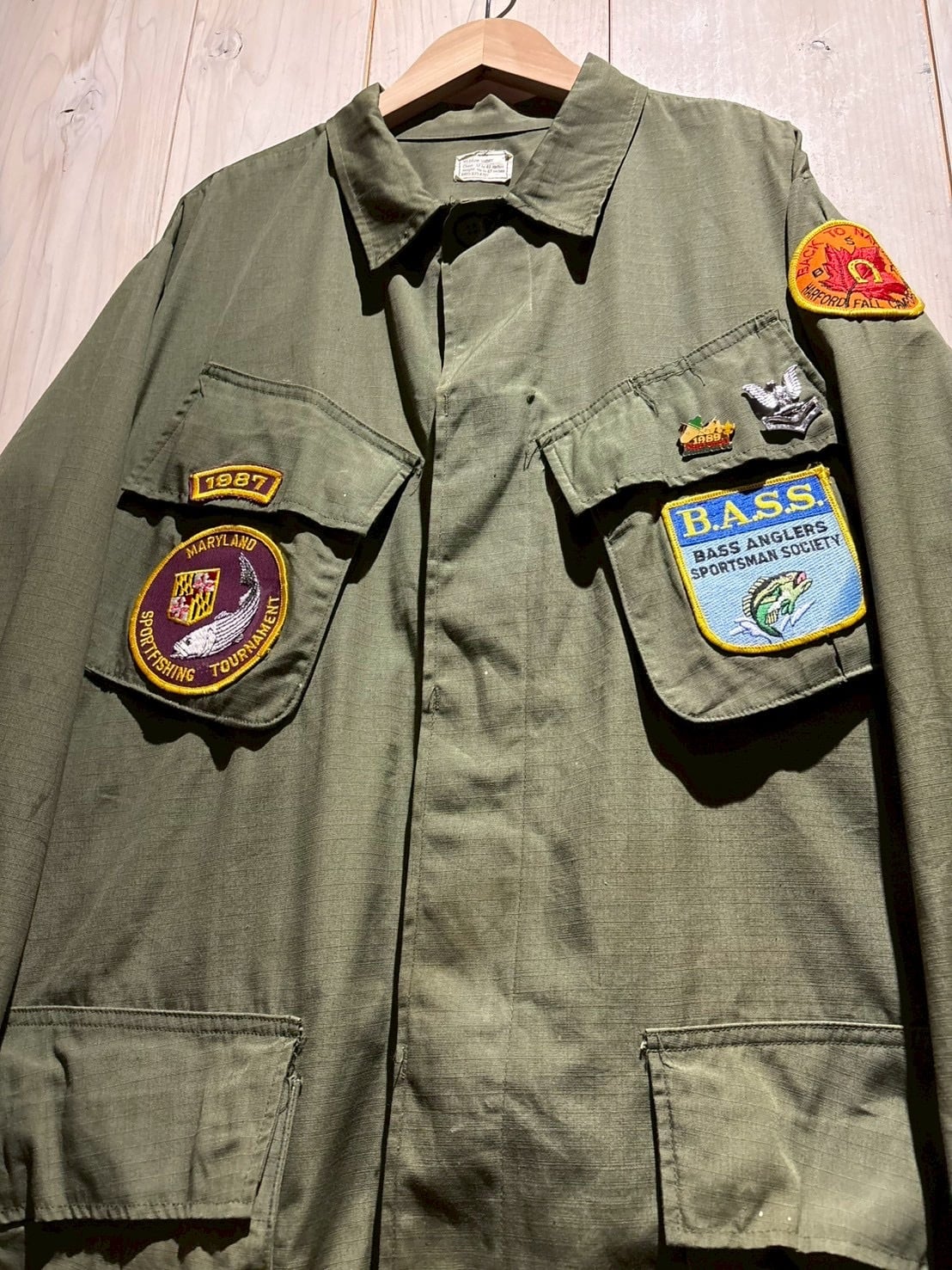 最大の特徴はフロントに大胆に配置されたワッペンカスタム。フィッシングカルチャーを象徴するパッチを左右にレイアウト、さらにピンズも加わり、ミリタリー×アウトドアが交差する唯一無二の表情へと昇華されています。