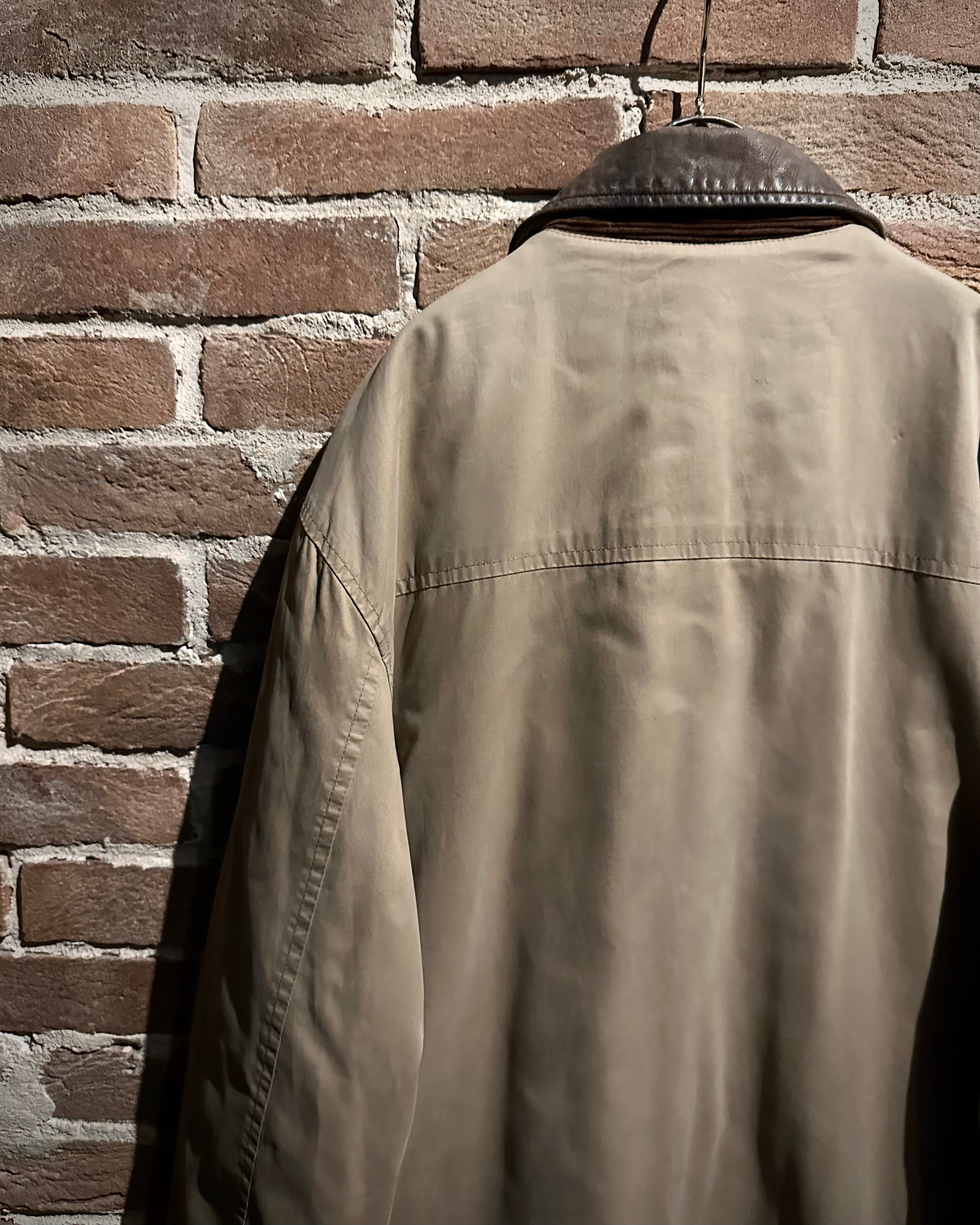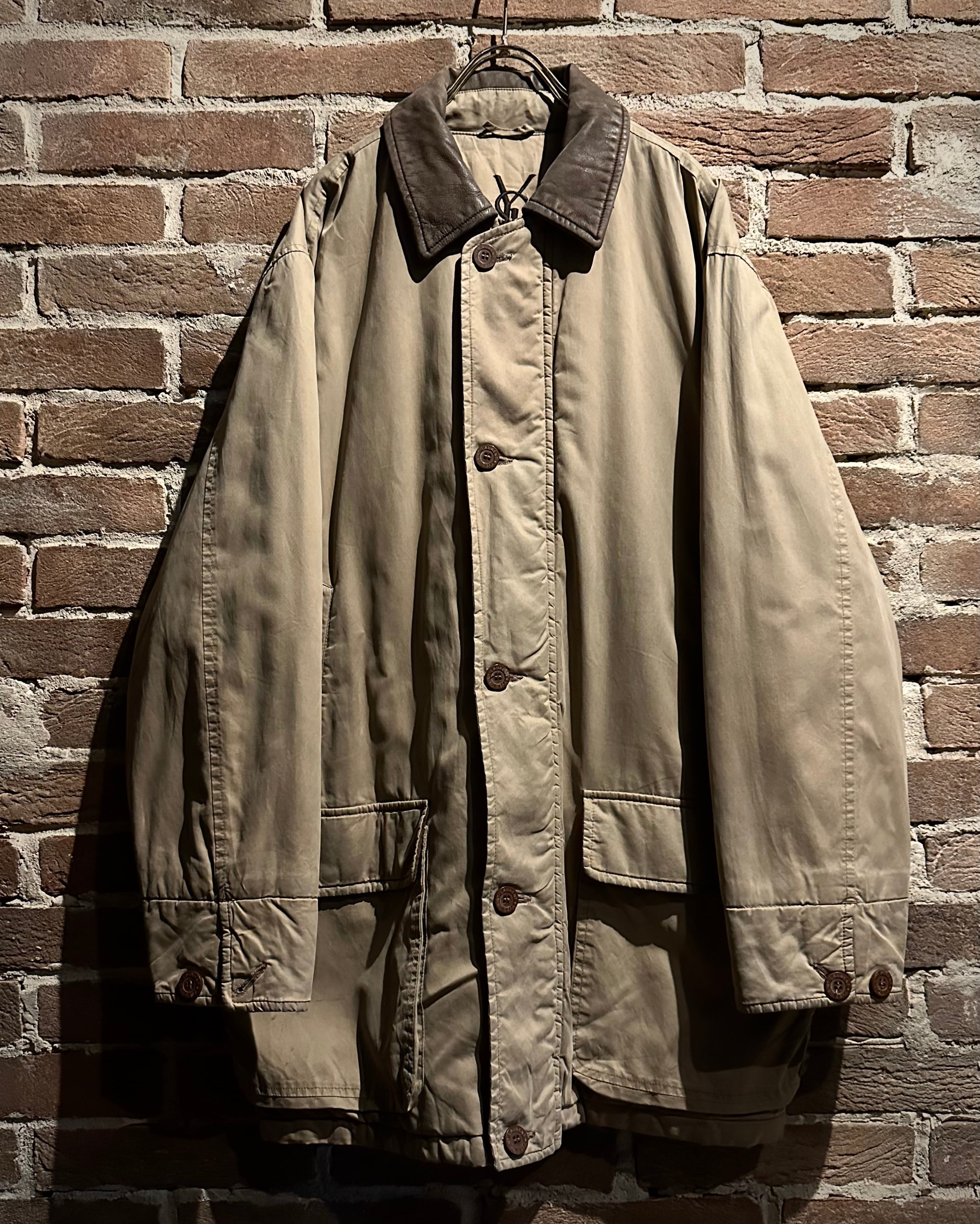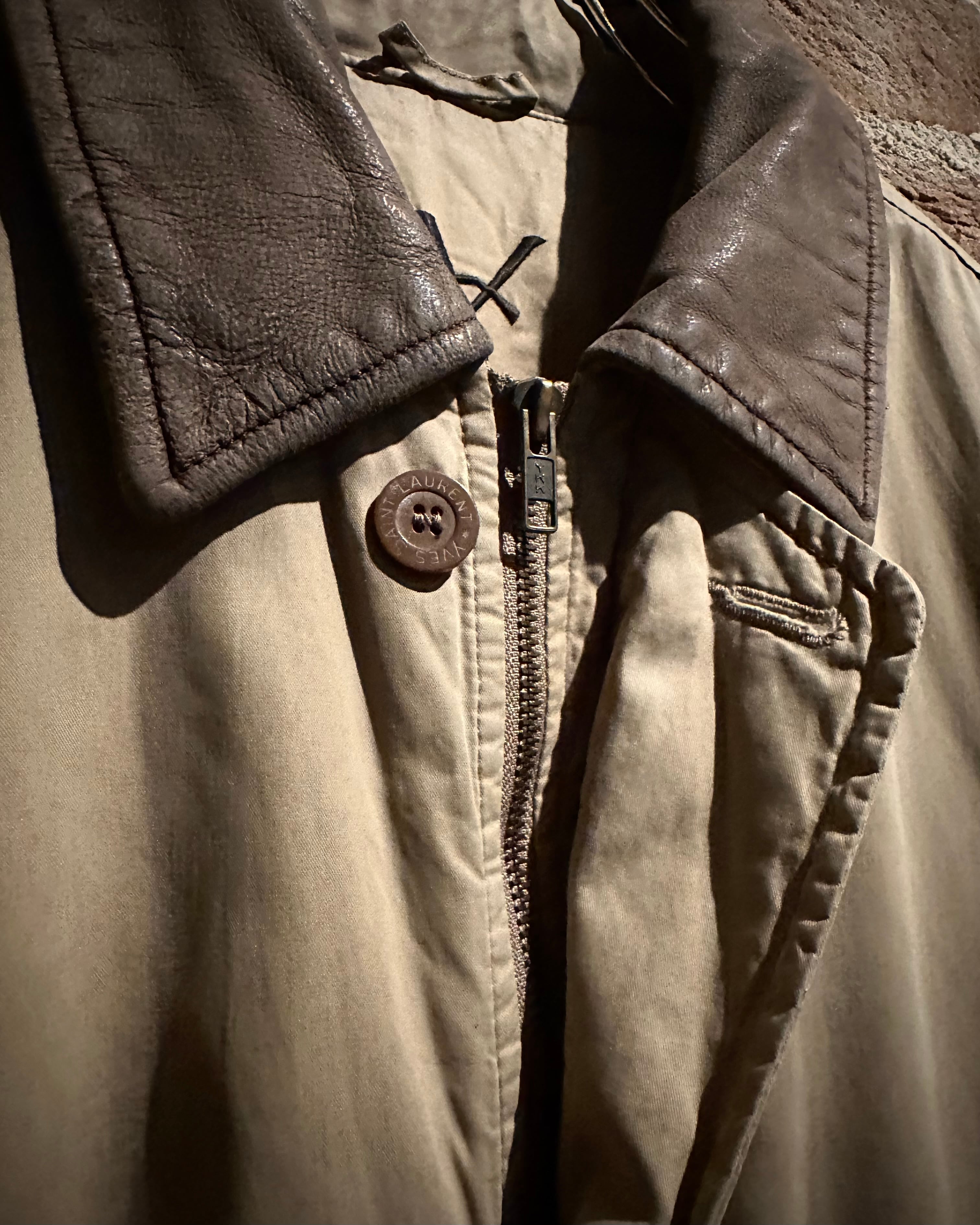 襟にはリアルレザーを切り替え、ダークブラウンの重厚な質感が全体を引き締める仕上がりに。フロントはボタン×ジップのダブルクロージャー仕様、刻印入りボタンなど細部まで抜かりない作り込み。ワーク由来ながらミニマルで洗練されたバランスにまとめられています。