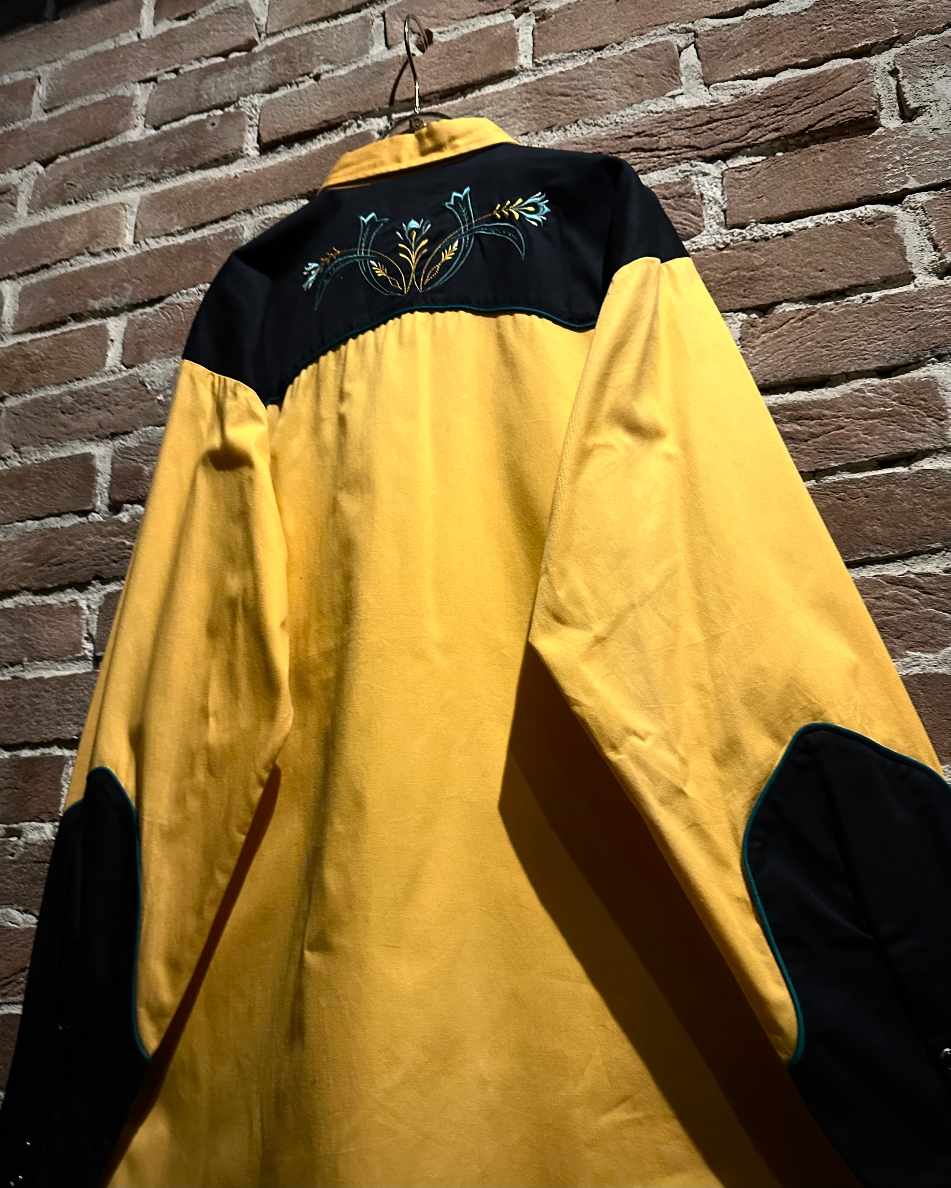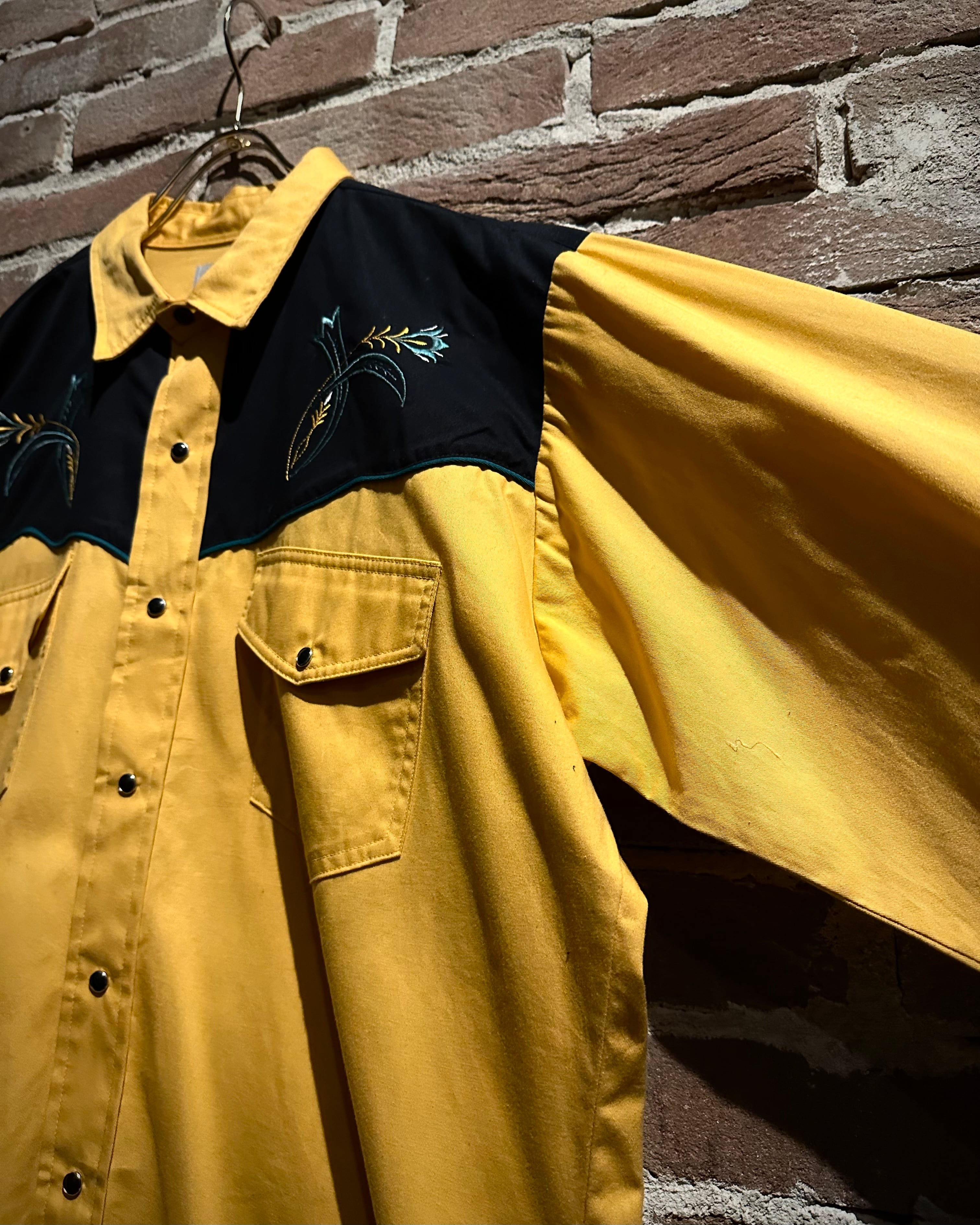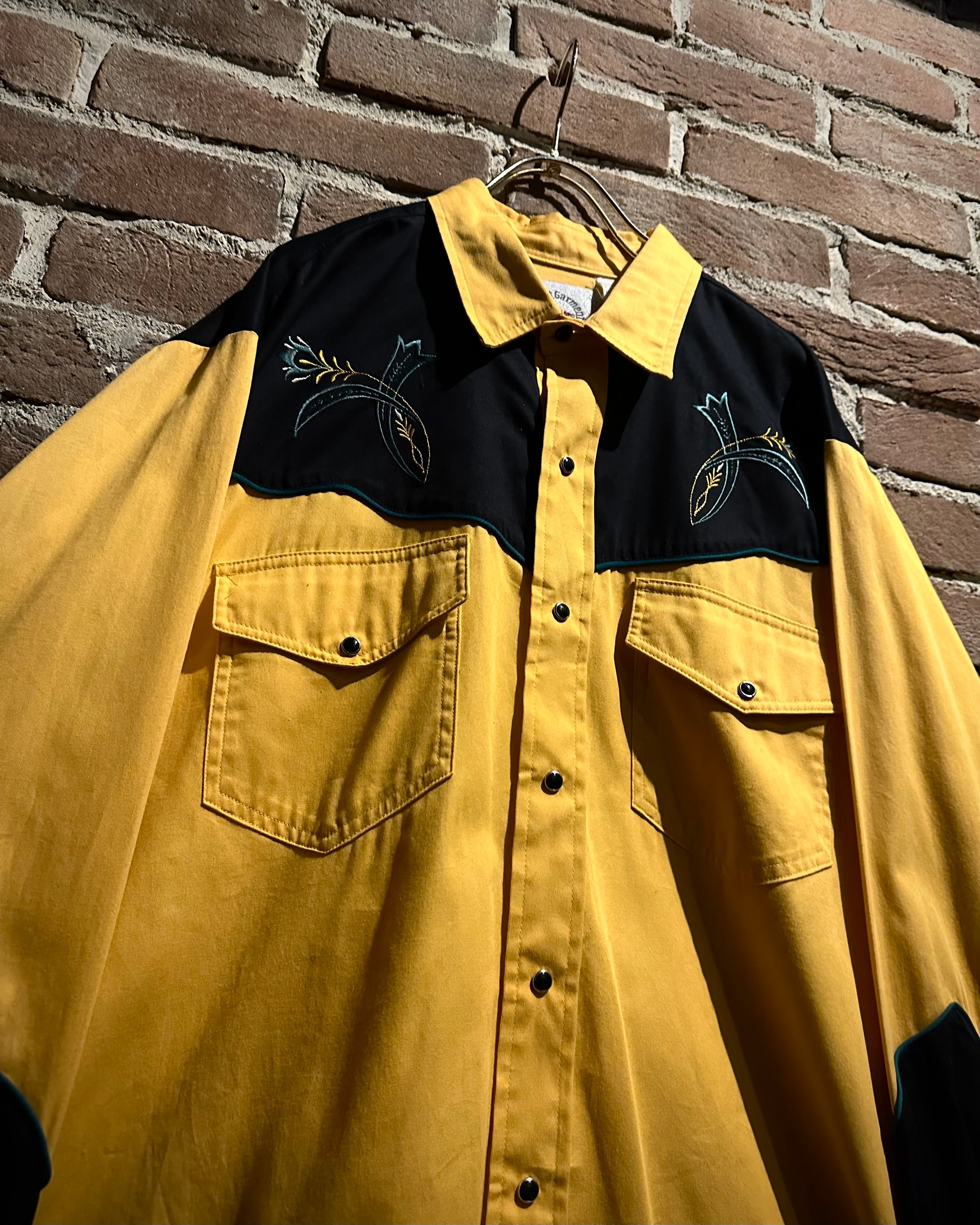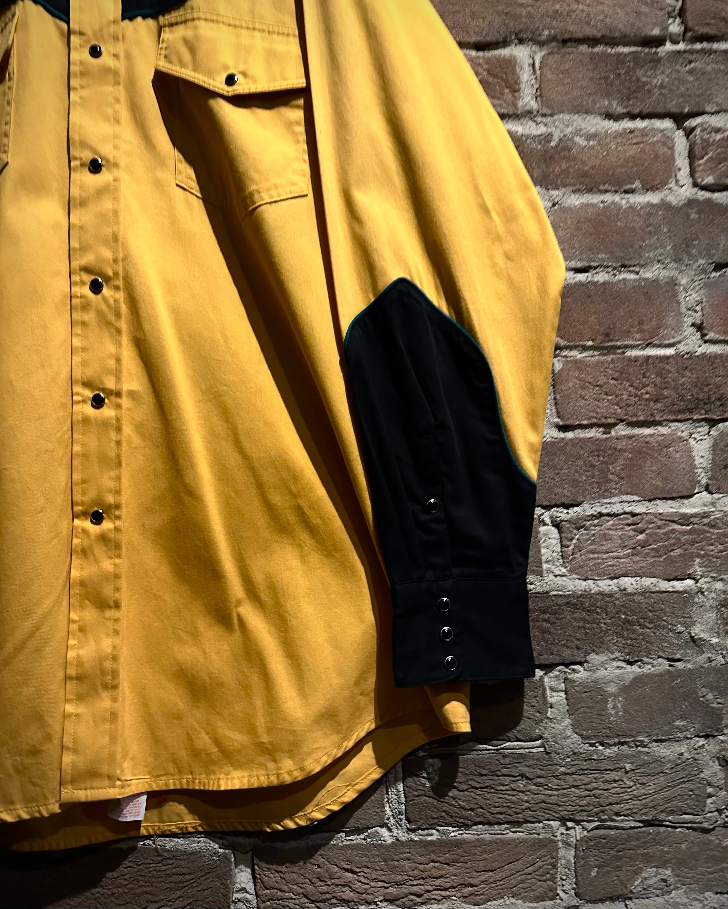パールスナップボタン、フラップ付き両胸ポケット、カーブを描くウエスタンヨークなど王道ディテールも抜かりなし。ビビッドイエロー×ダークトーンのコントラストが効いた、どこかモードな佇まいに仕上がっています。