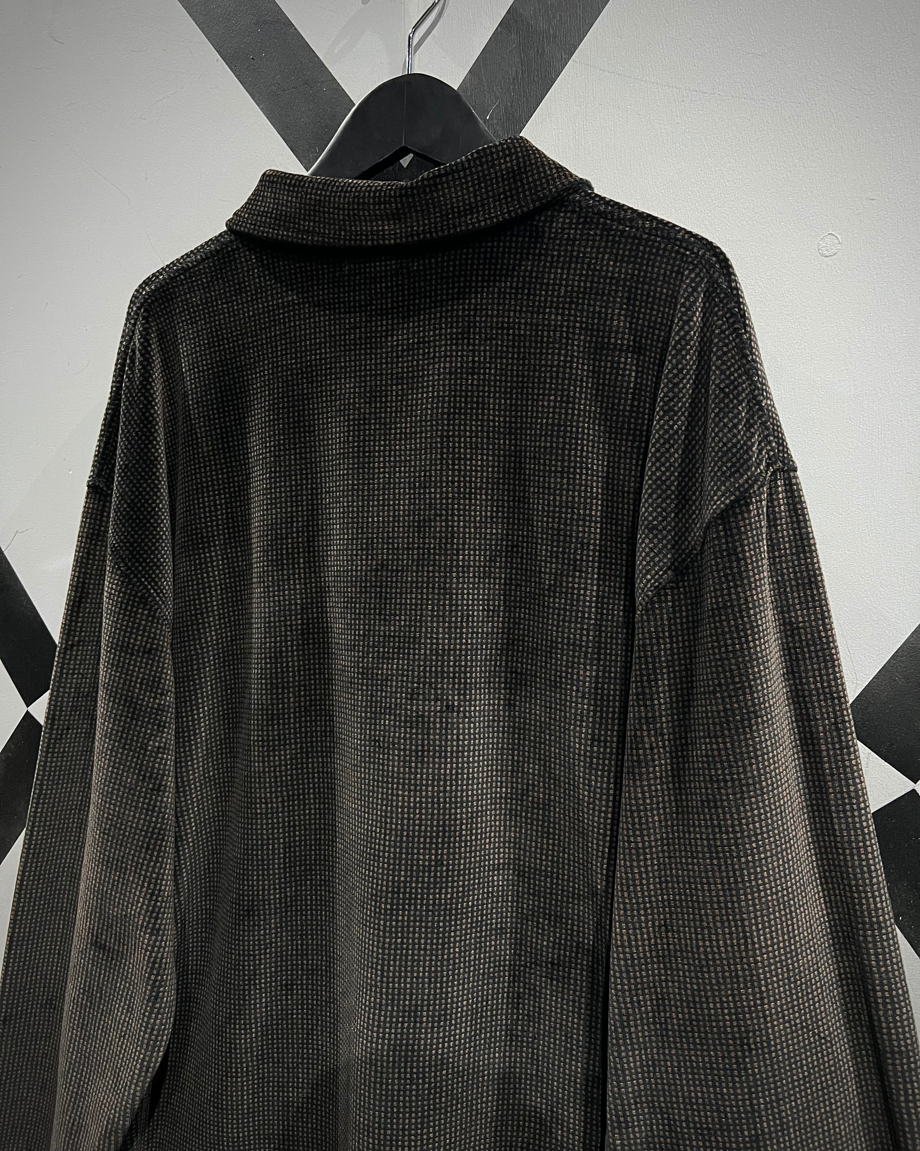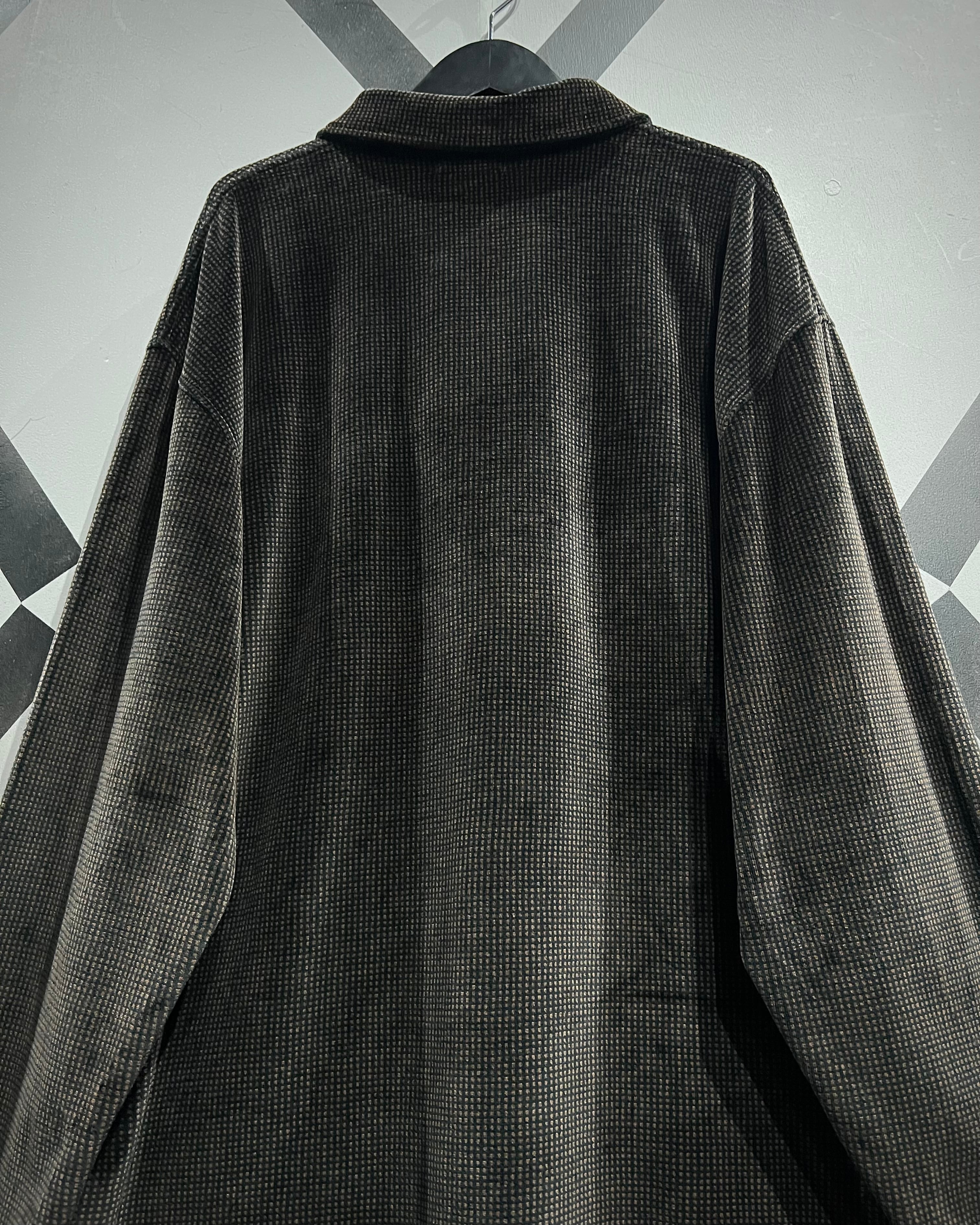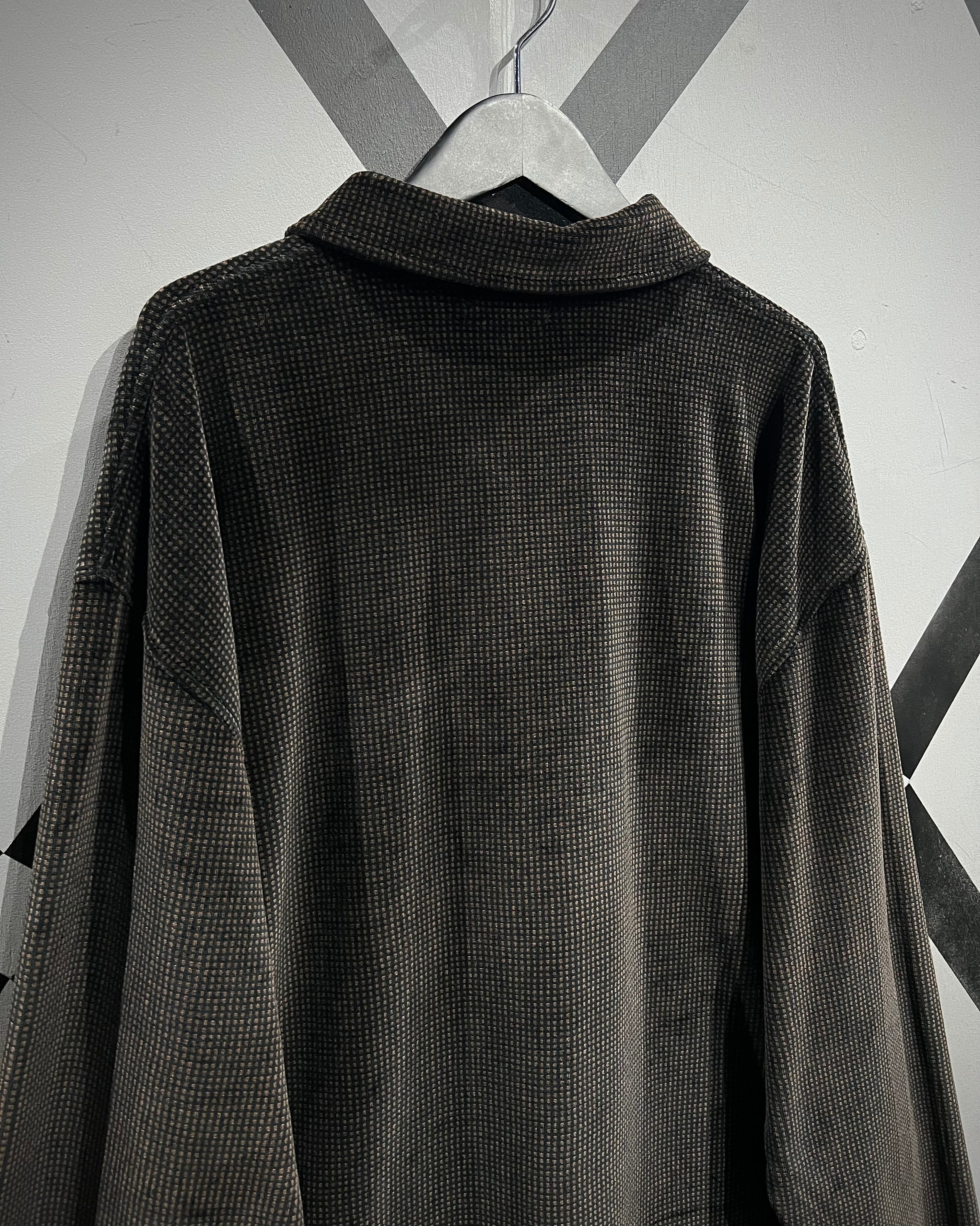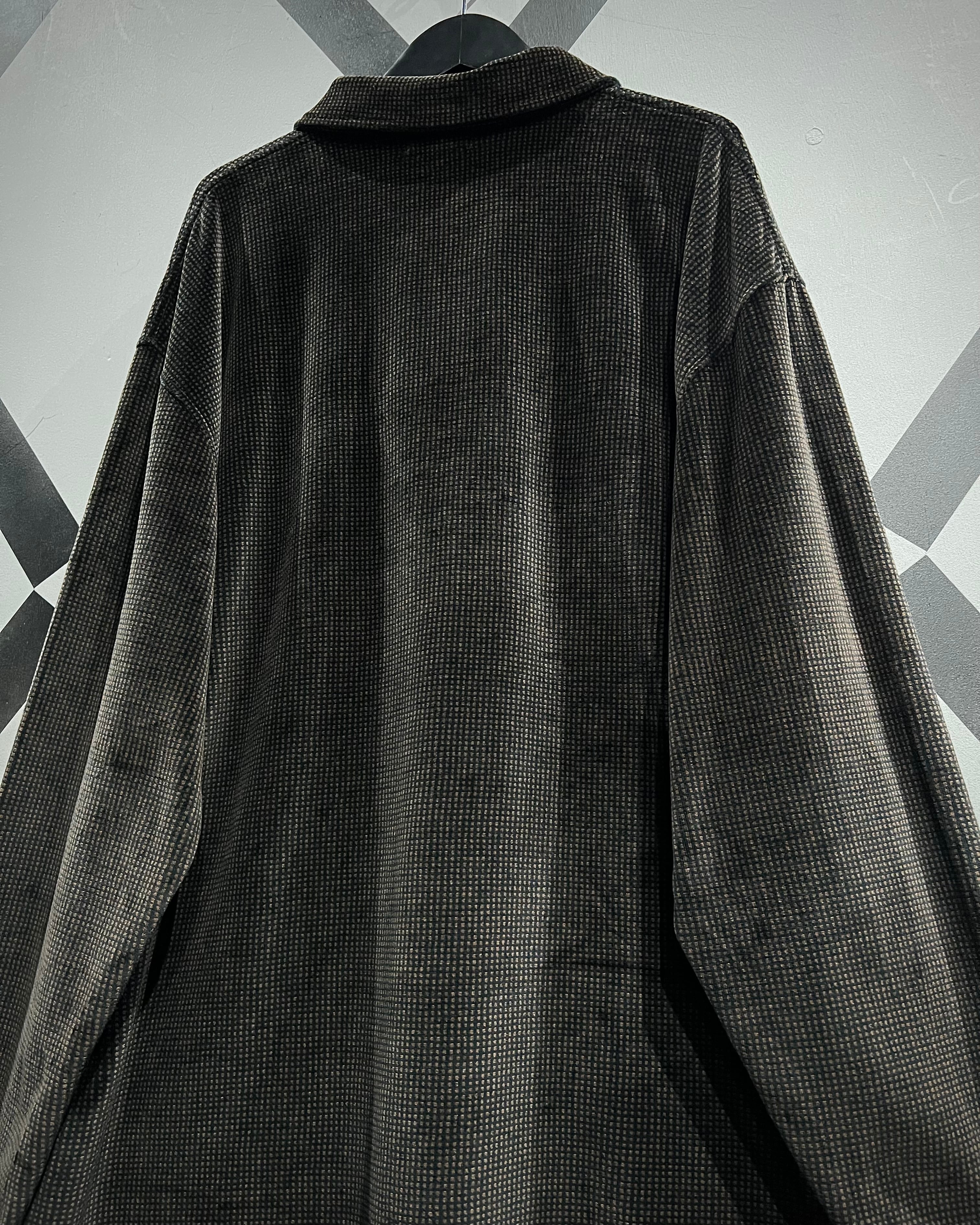 細かなブロックパターンを施したブラックベースのベロアに、ブラウンを重ねた奥行きある色味。光の当たり方で陰影が生まれる上品な質感が特徴です。