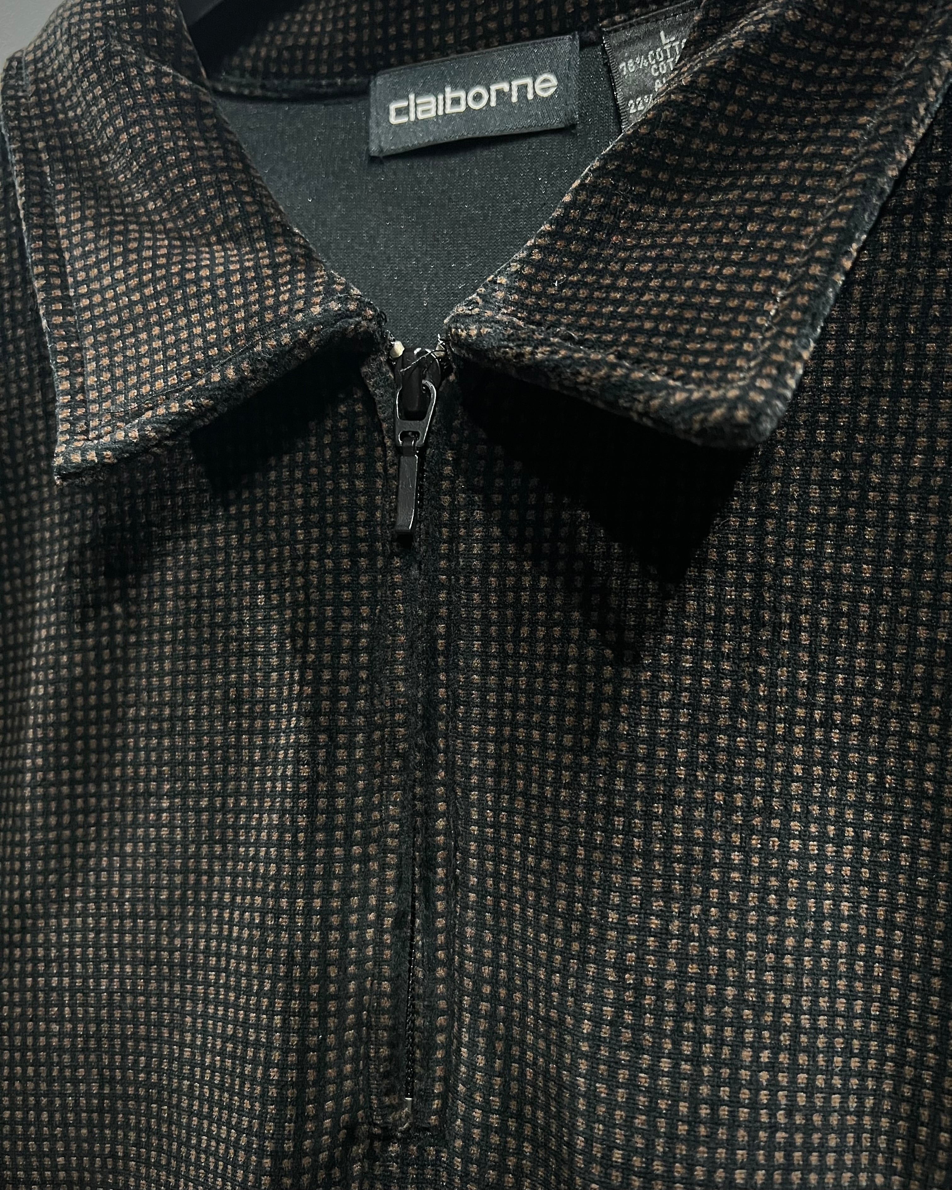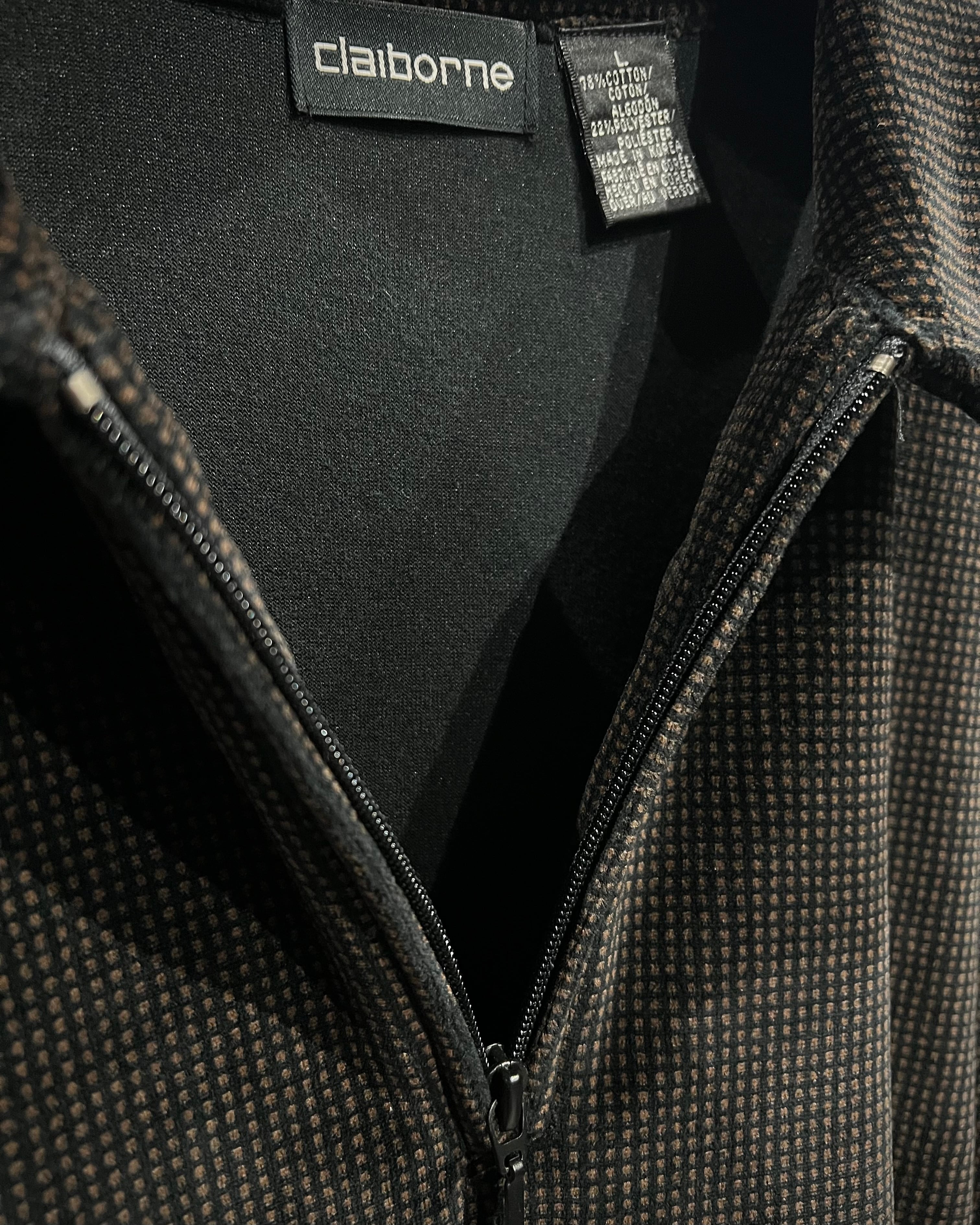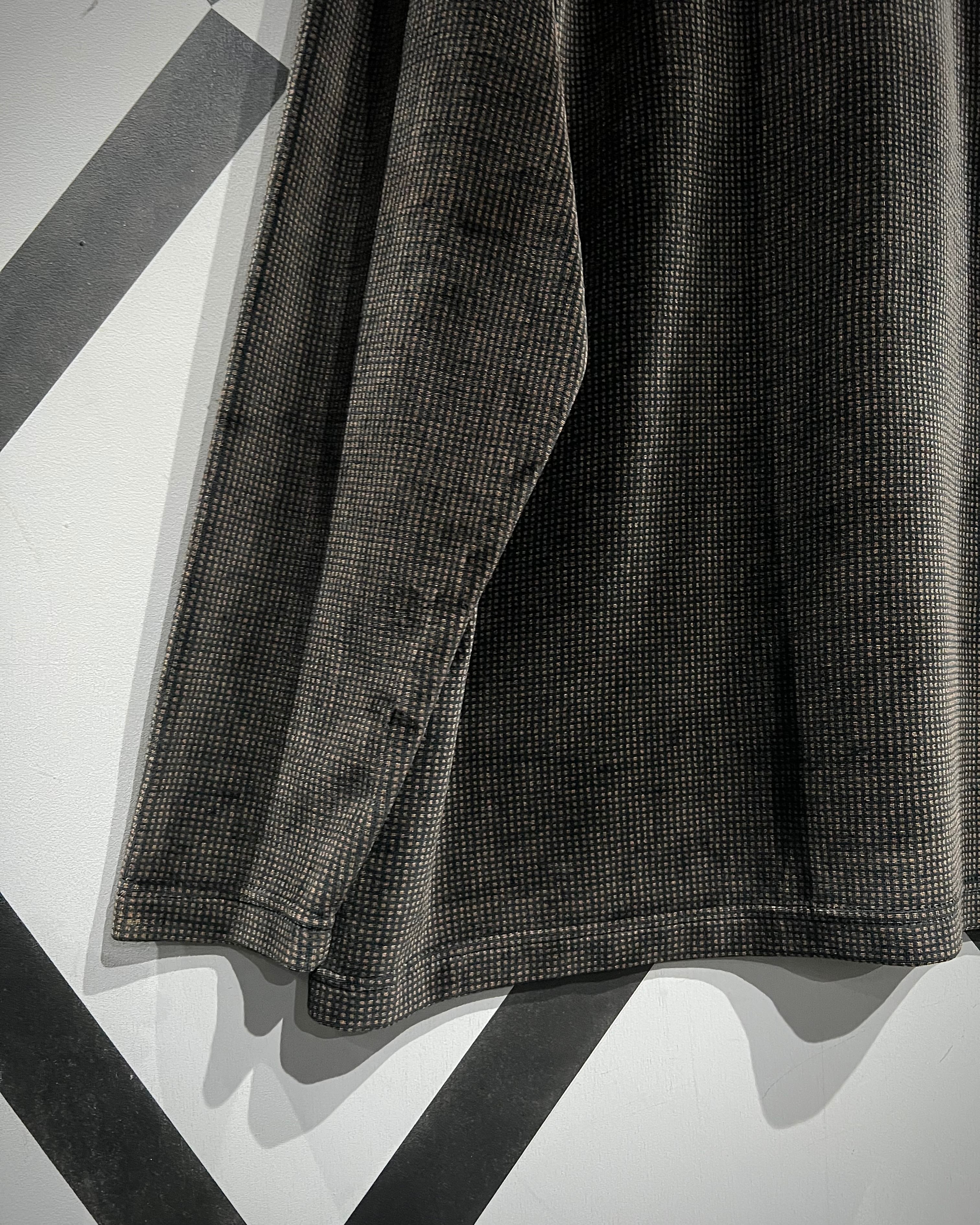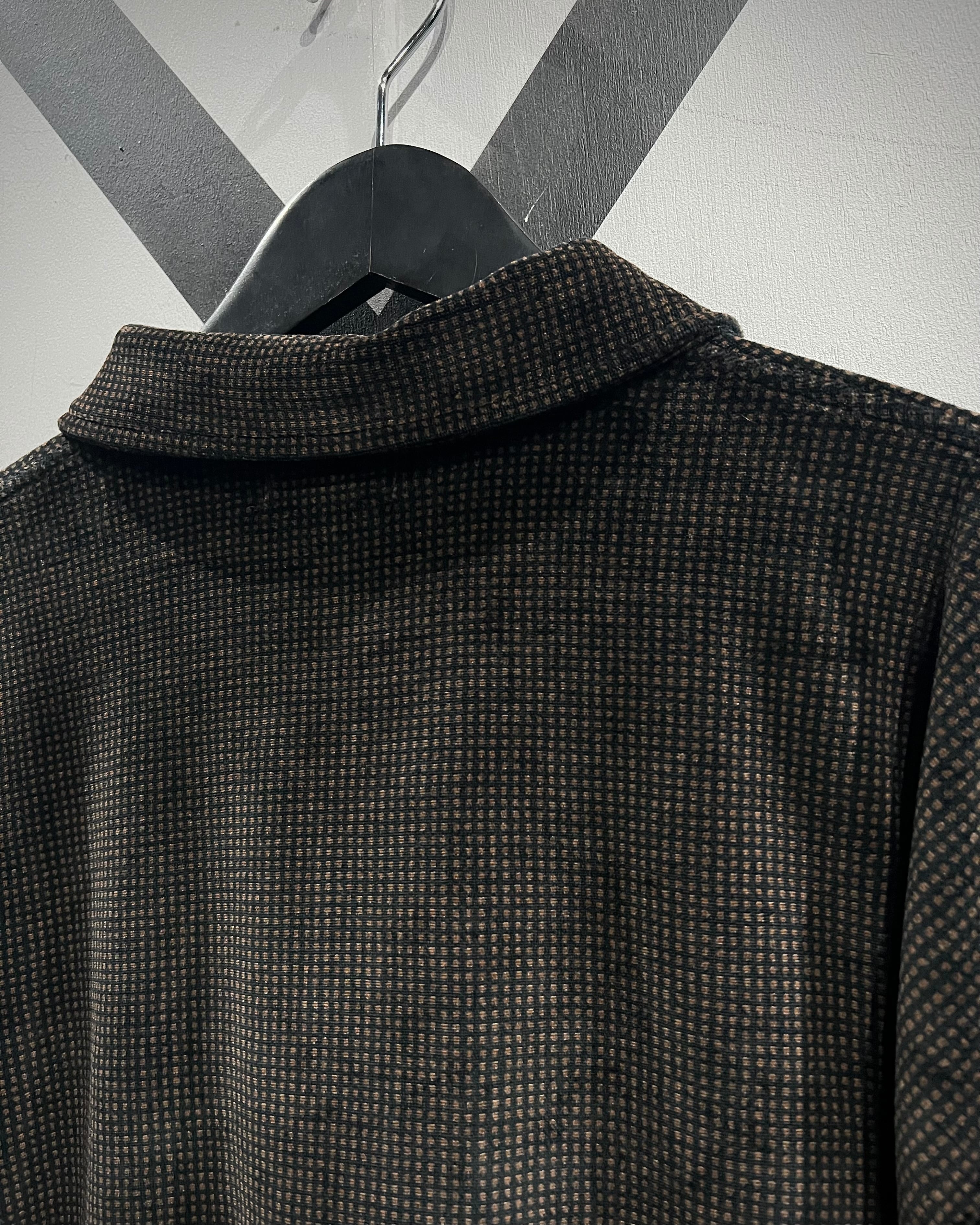 細かなブロックパターンを施したブラックベースのベロアに、ブラウンを重ねた奥行きある色味。光の当たり方で陰影が生まれる上品な質感が特徴です。