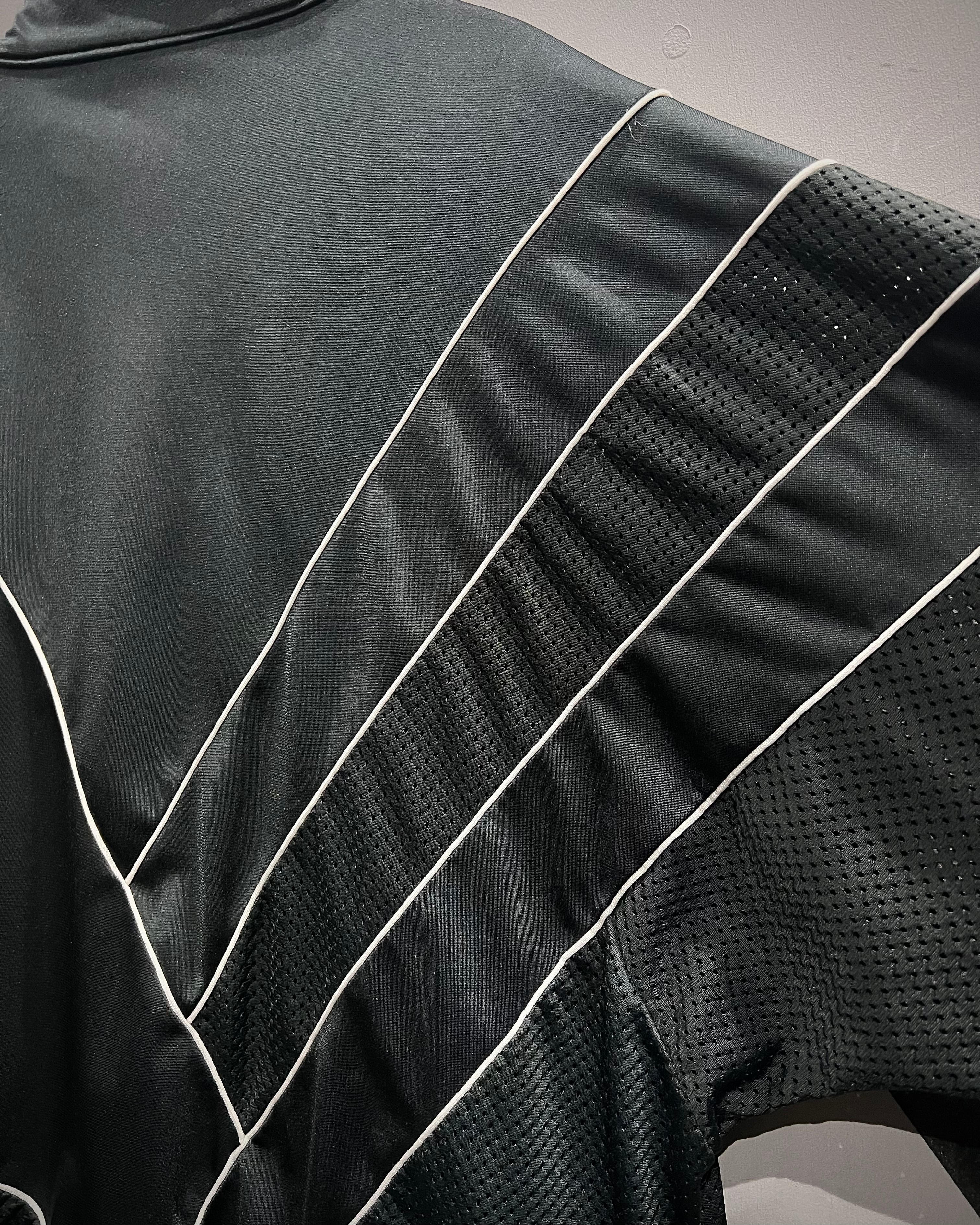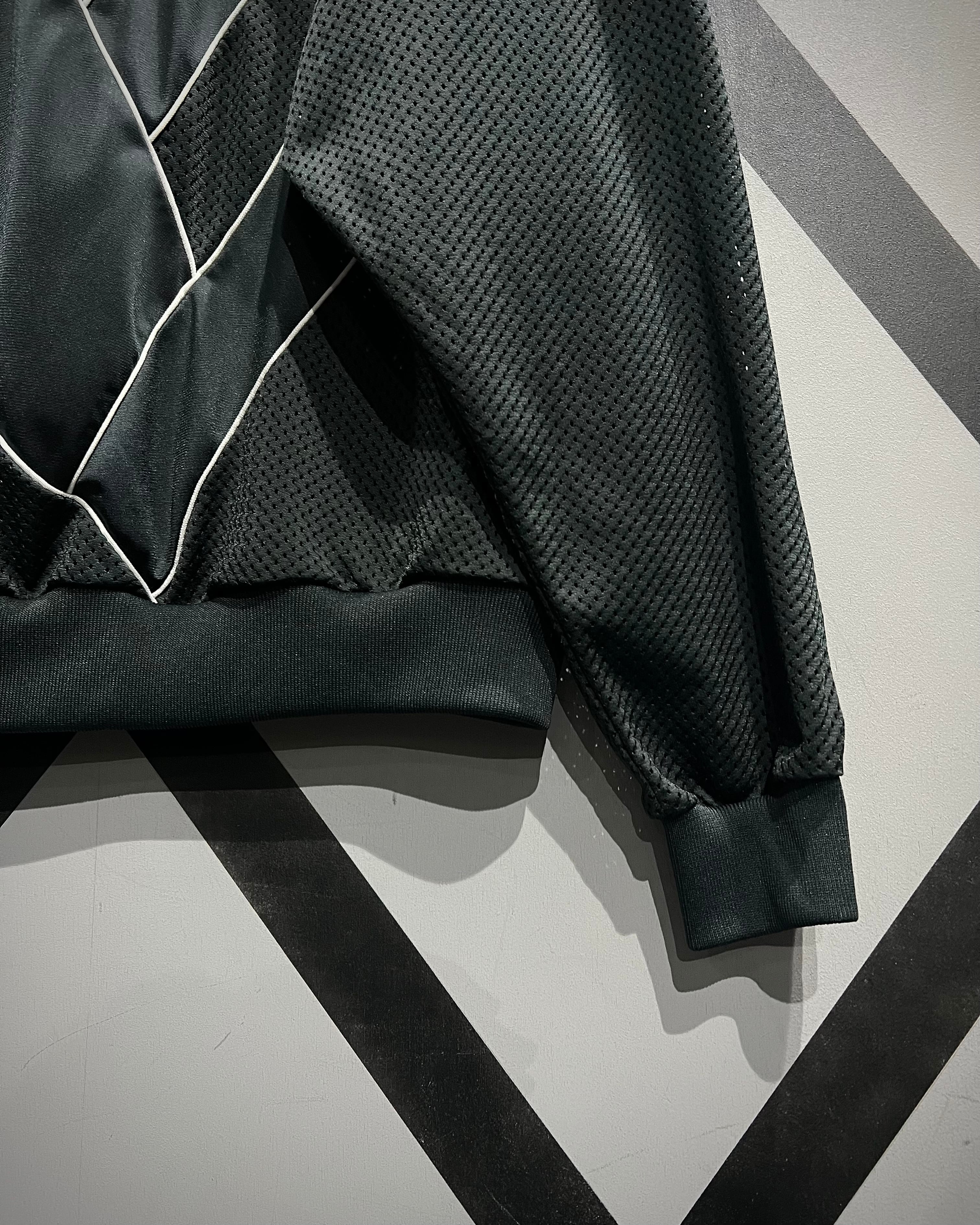 ブラックベースのボディに、光沢のあるジャージ素材と通気性に優れたメッシュを大胆にスイッチ。立体的なホワイトパイピングが随所に走り、どの角度から見てもグラフィカルな印象を与えるデザインに仕上がっています。