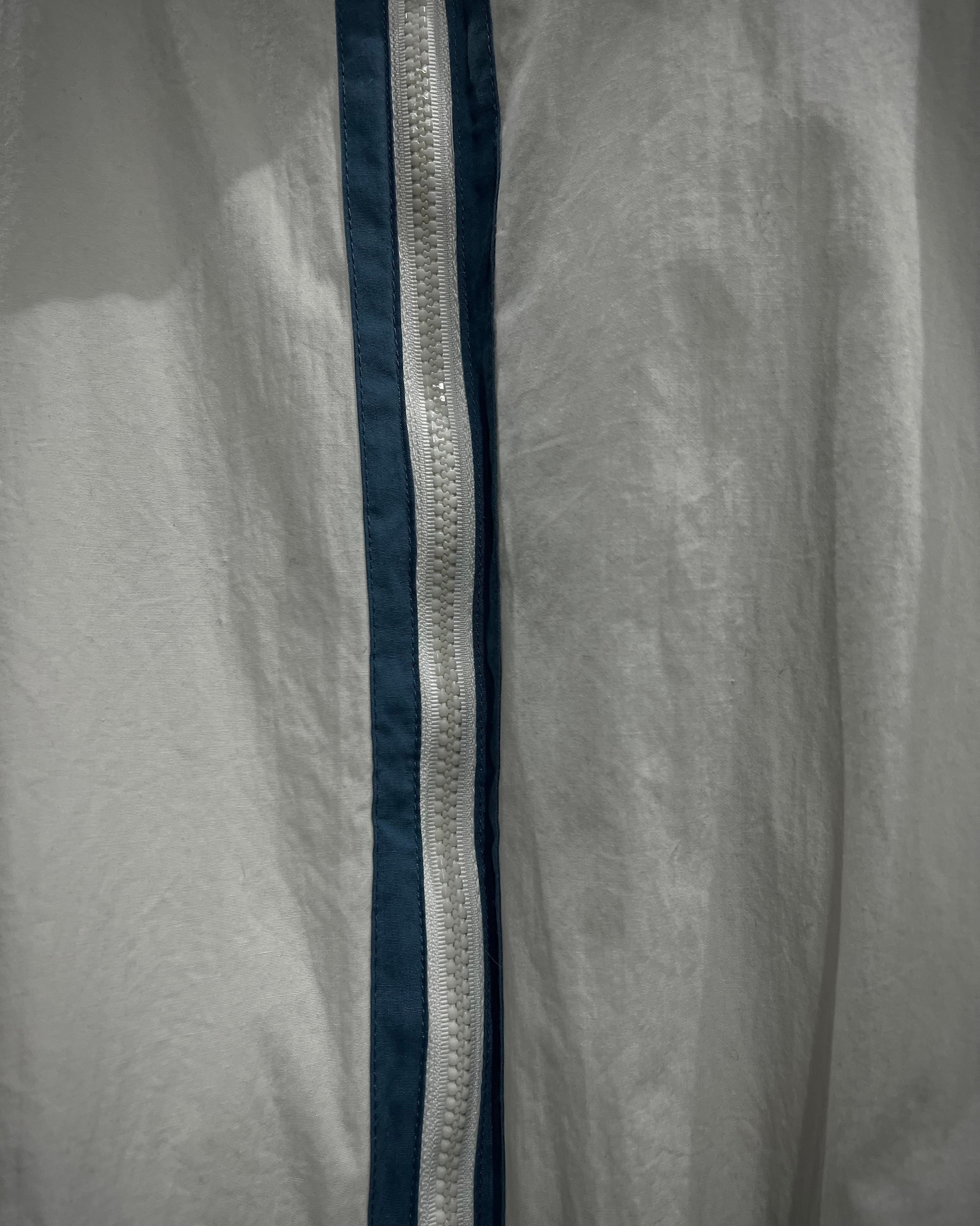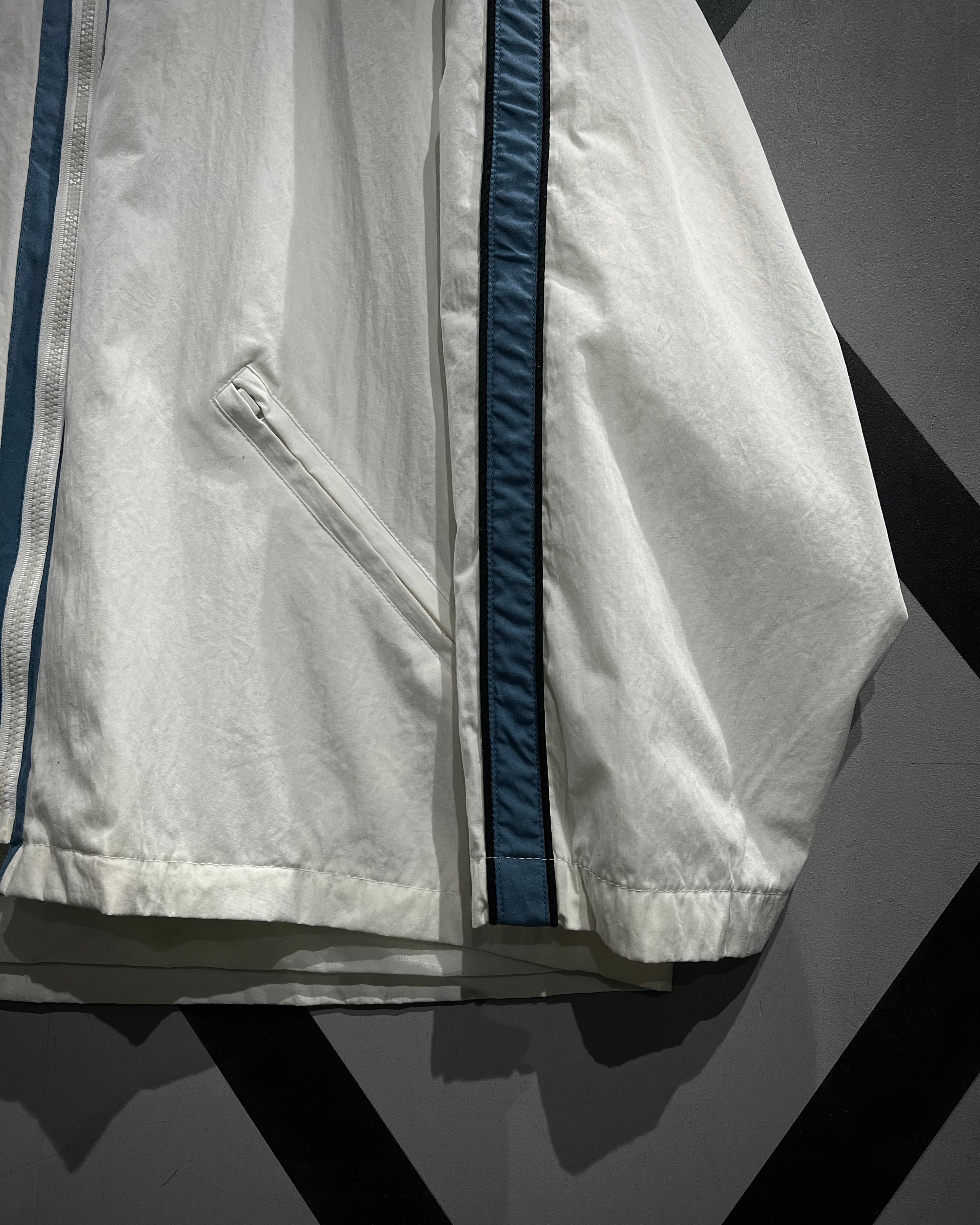 素材は軽量なポリ×コットンで、さらっと羽織れる快適さが魅力。フロントはジップアップ、両サイドにはジップポケットを完備し、実用性も十分。