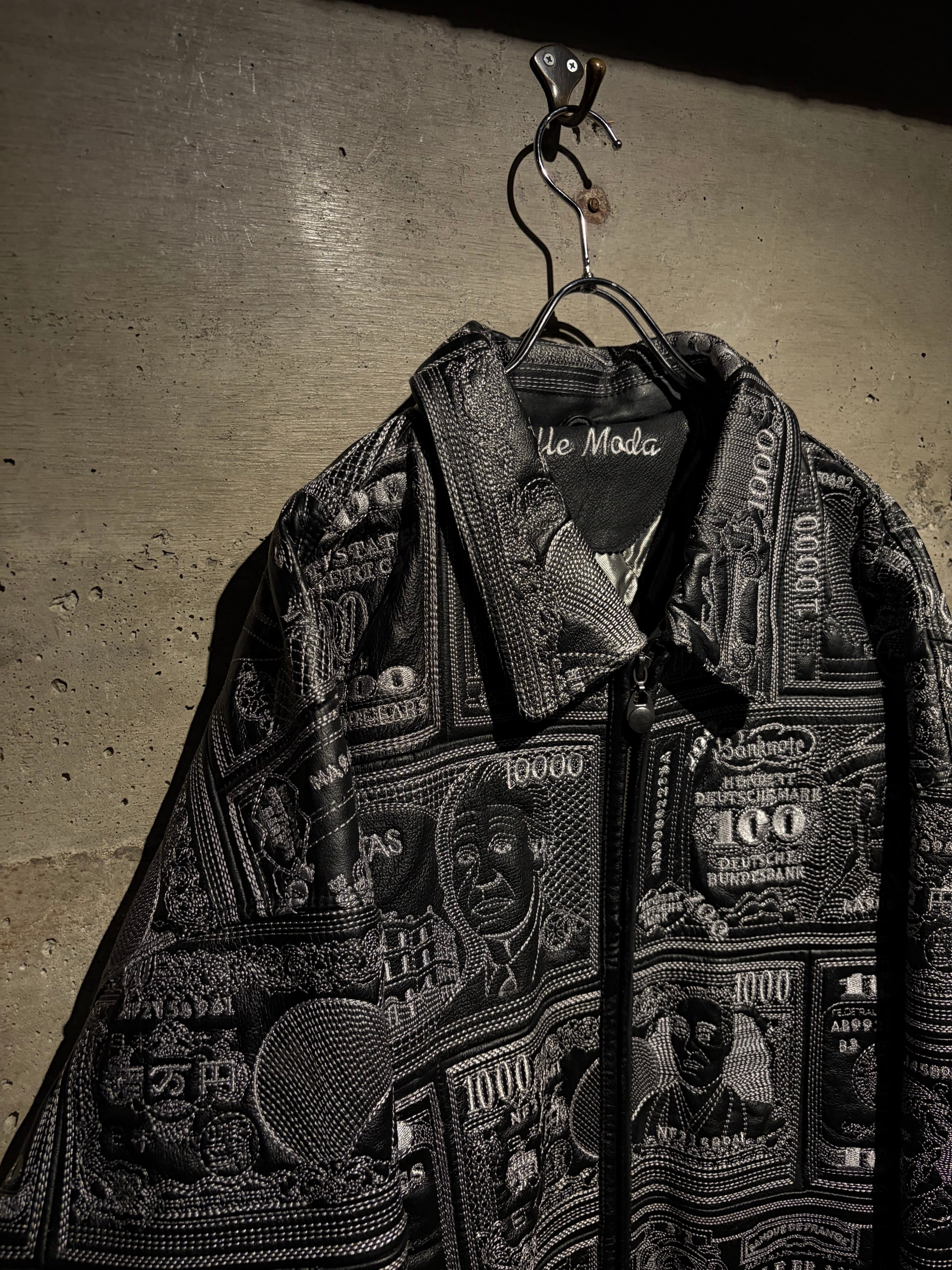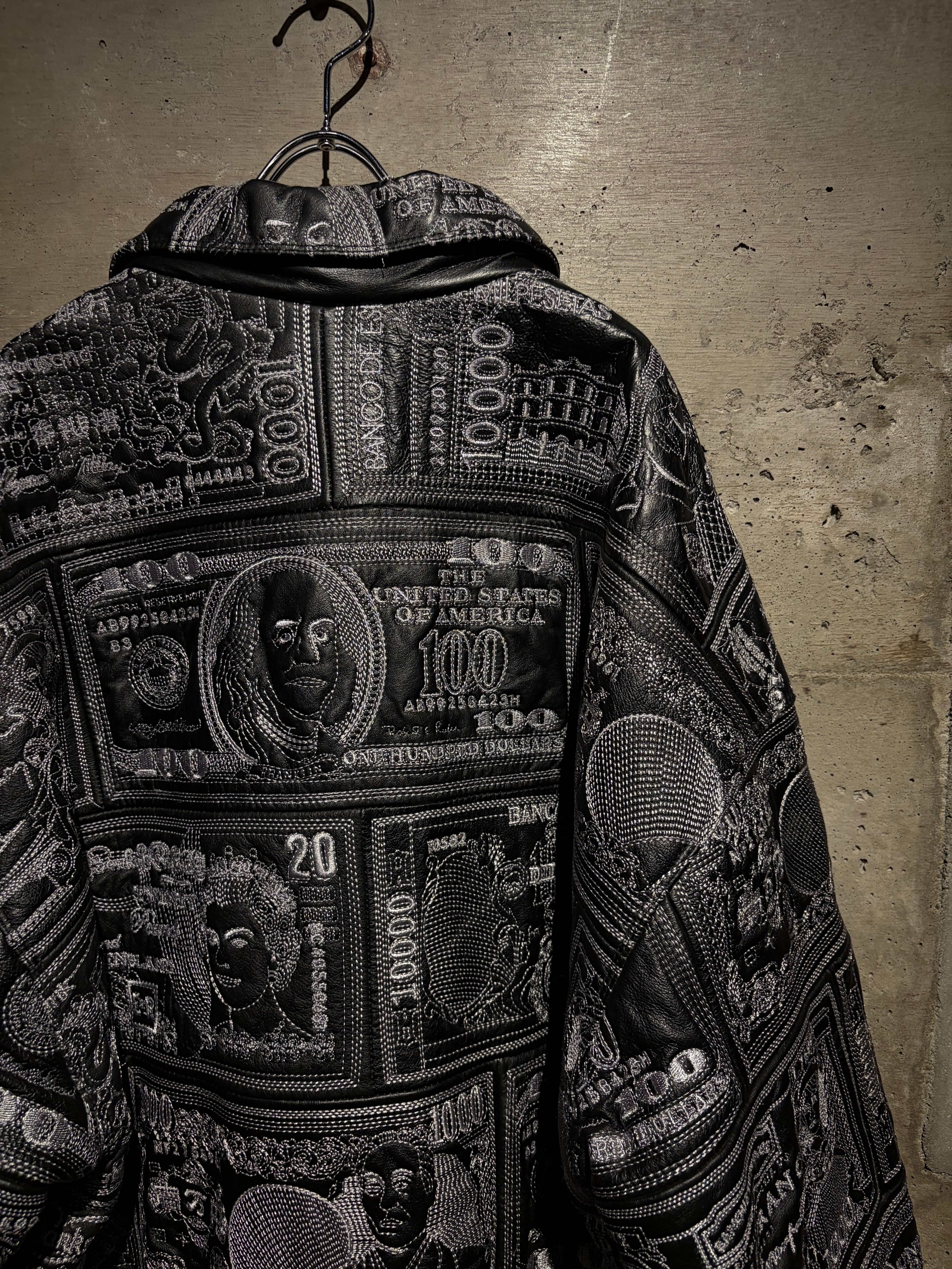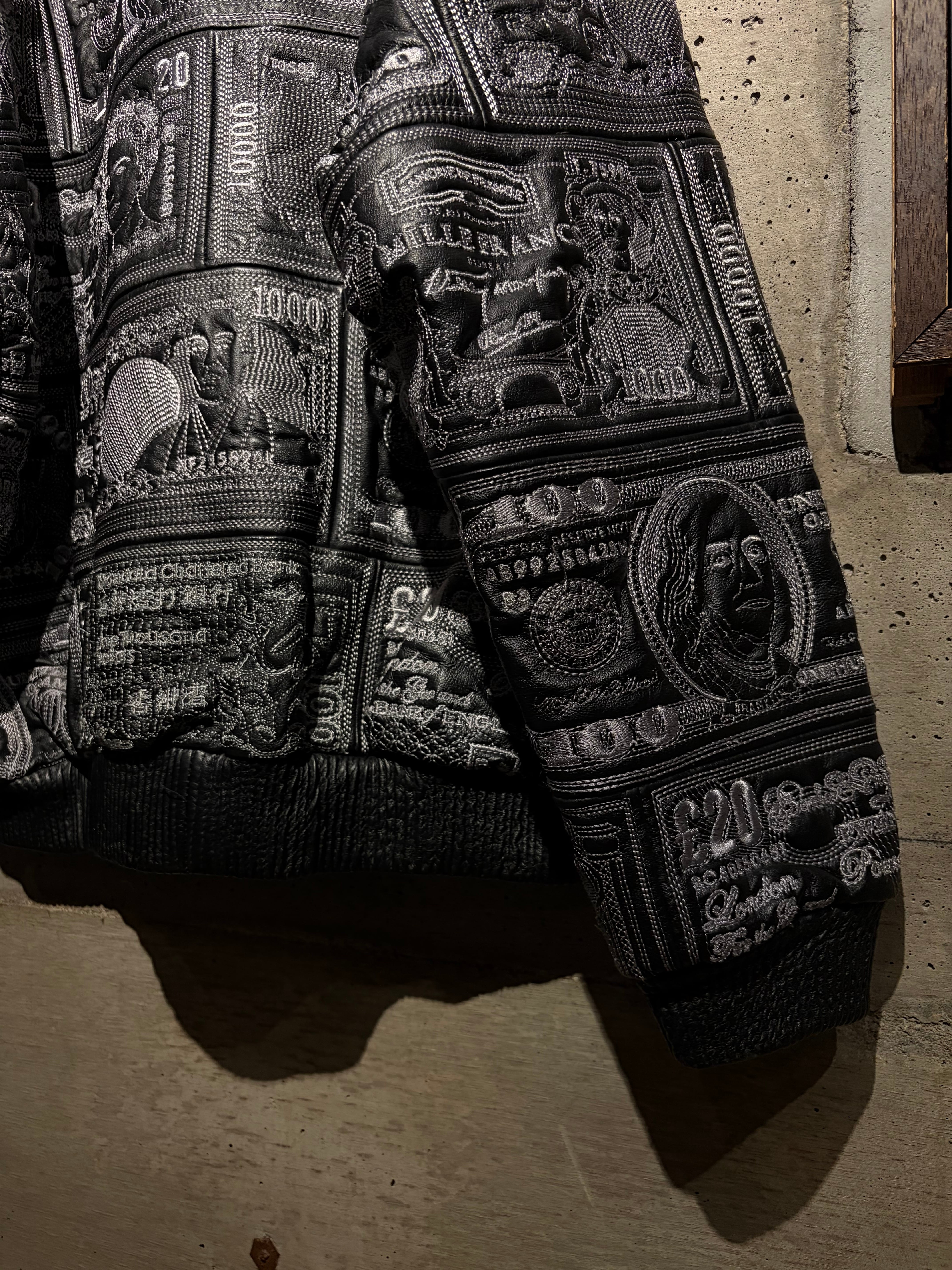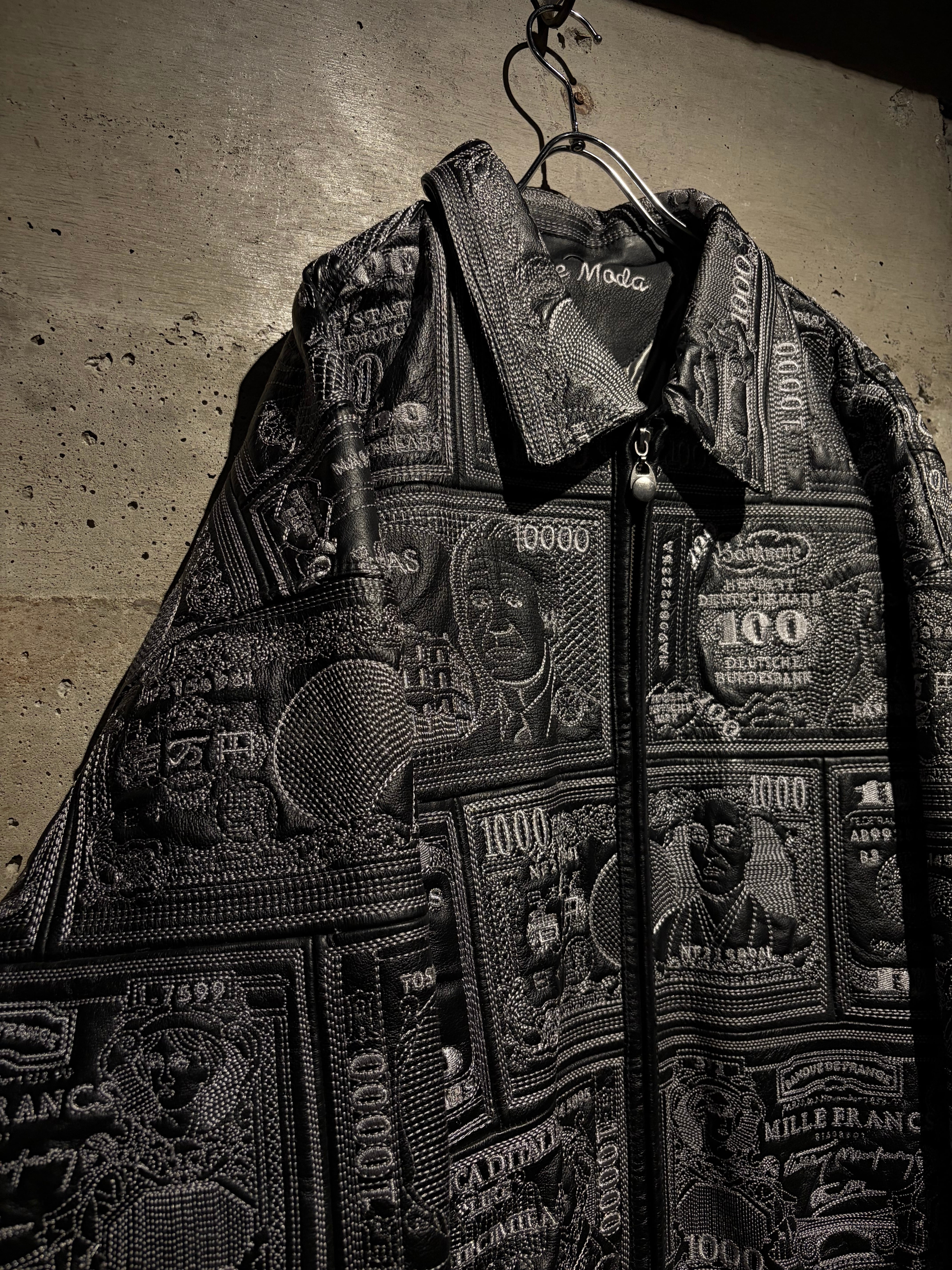 しなやかさとコシを併せ持つブラックレザーのボディをキャンバスに、様々な国の紙幣のデザインを総刺繍で落とし込んだスペシャルなレザージャケット。
