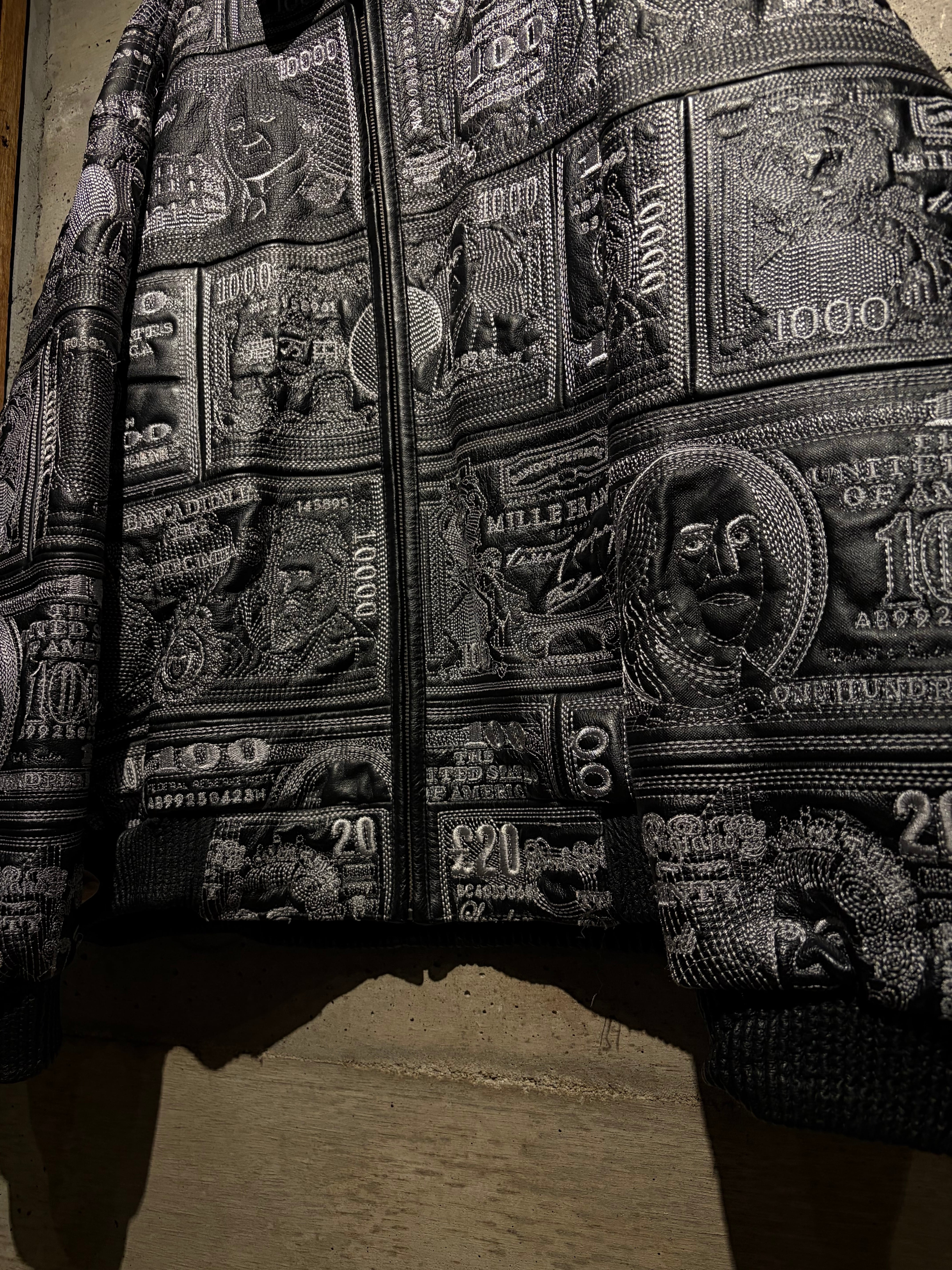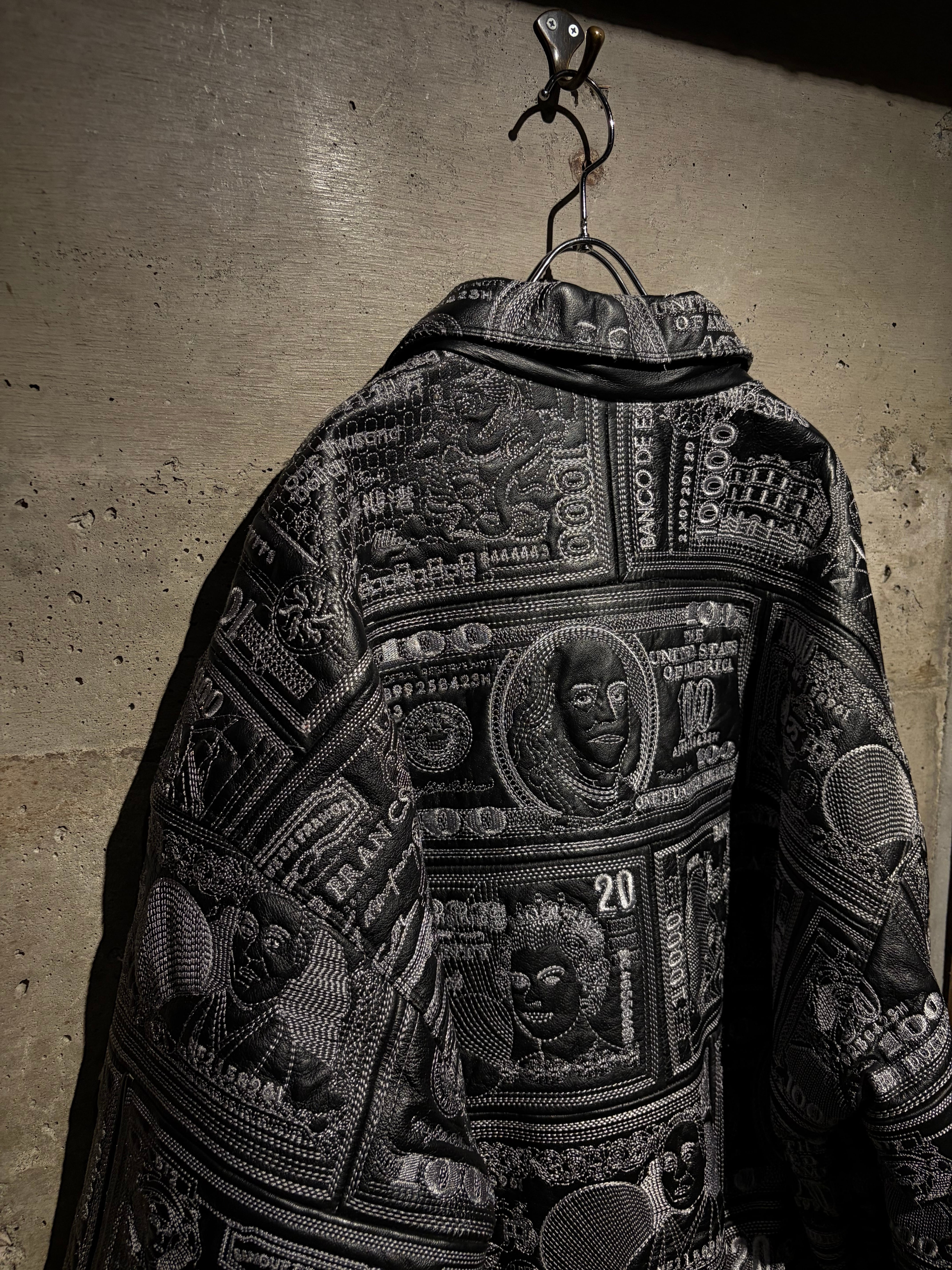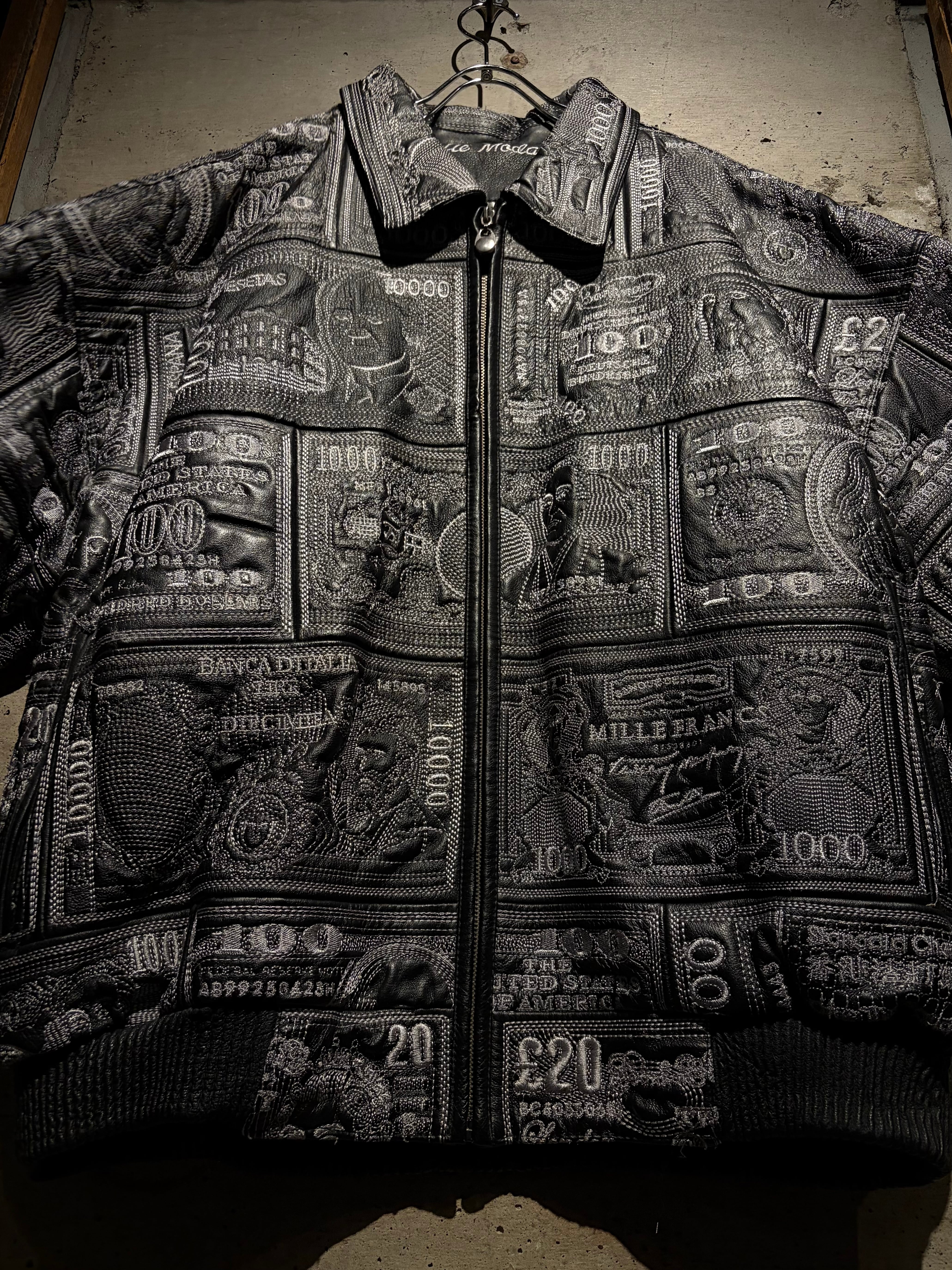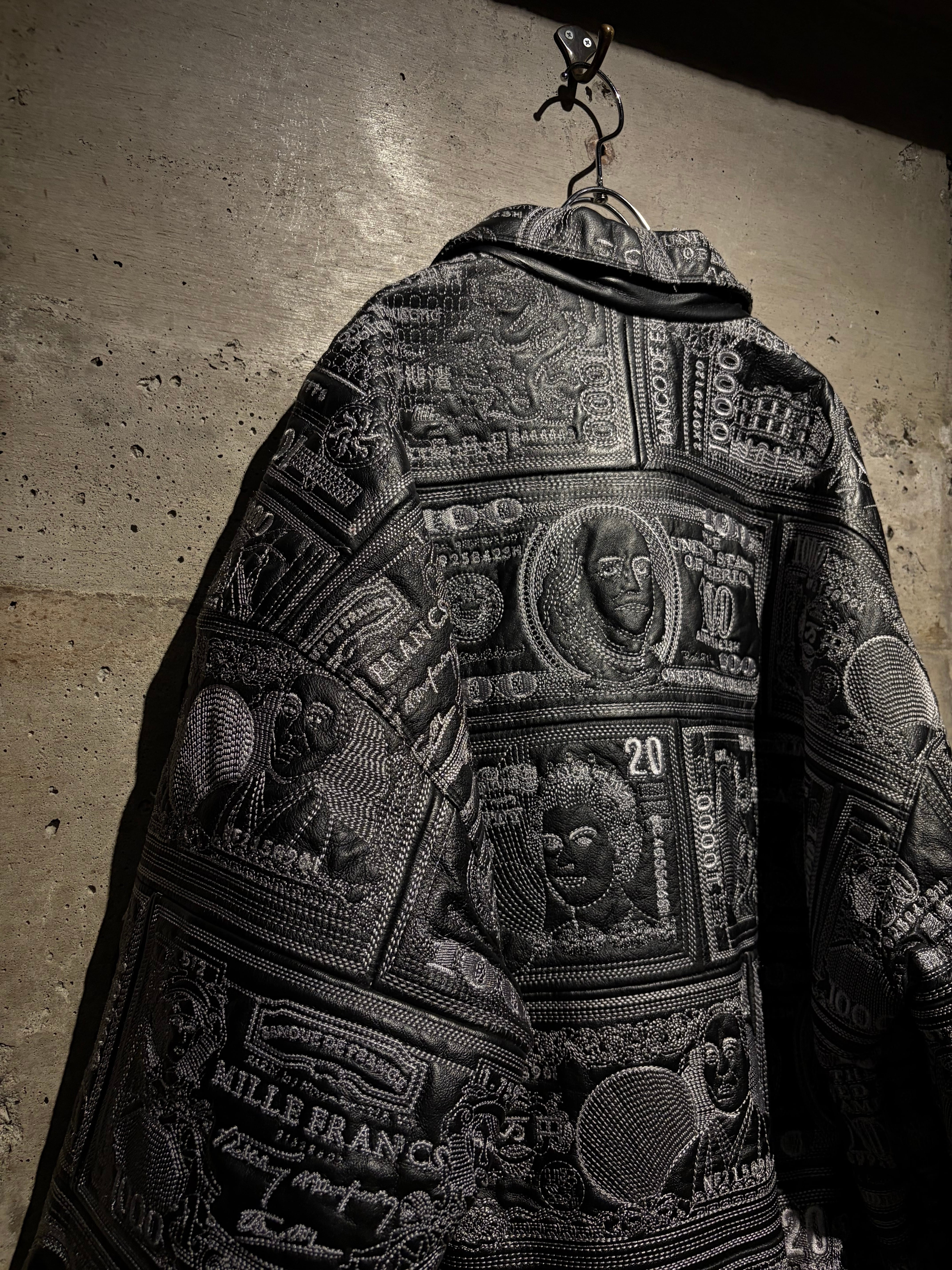 しなやかさとコシを併せ持つブラックレザーのボディをキャンバスに、様々な国の紙幣のデザインを総刺繍で落とし込んだスペシャルなレザージャケット。