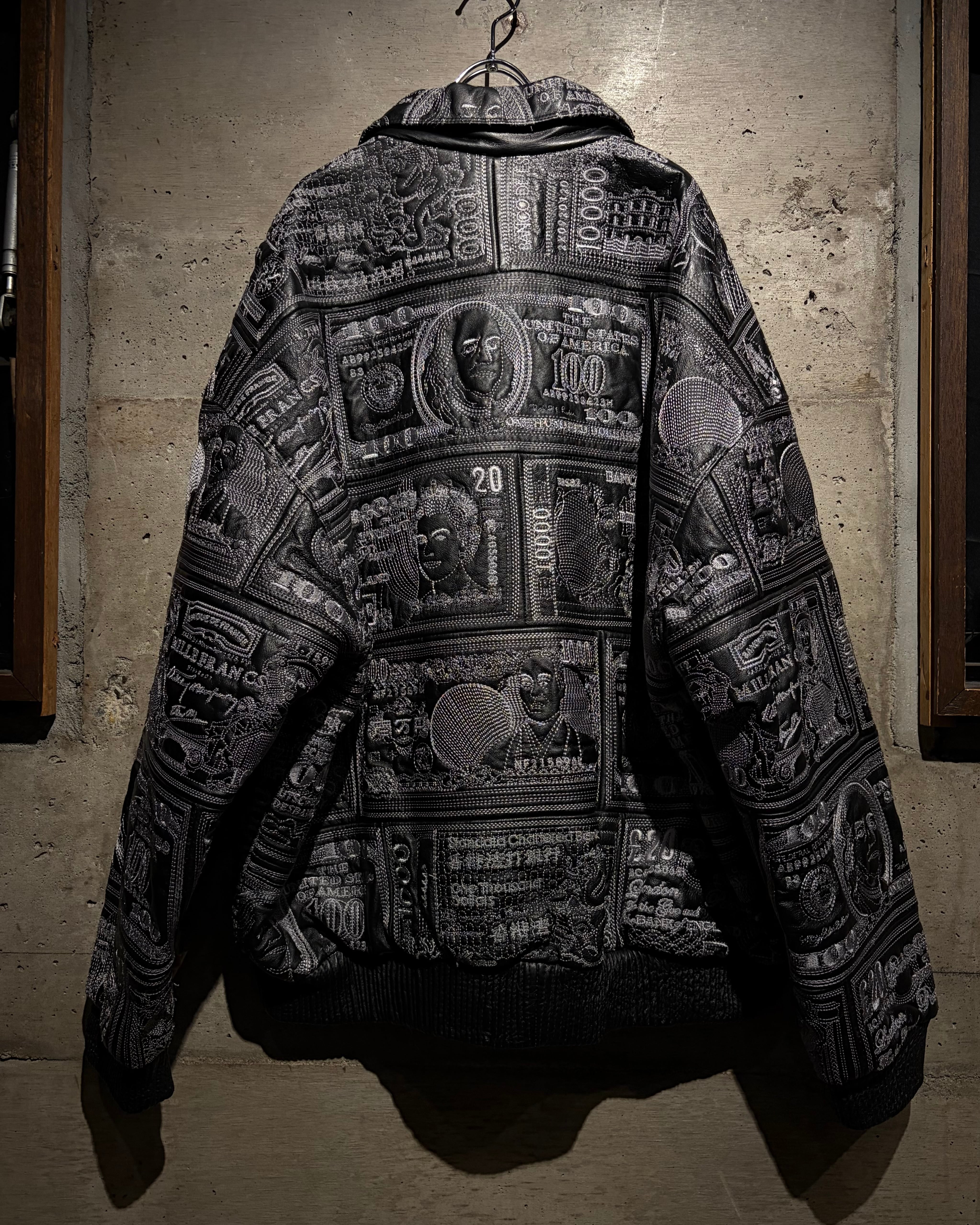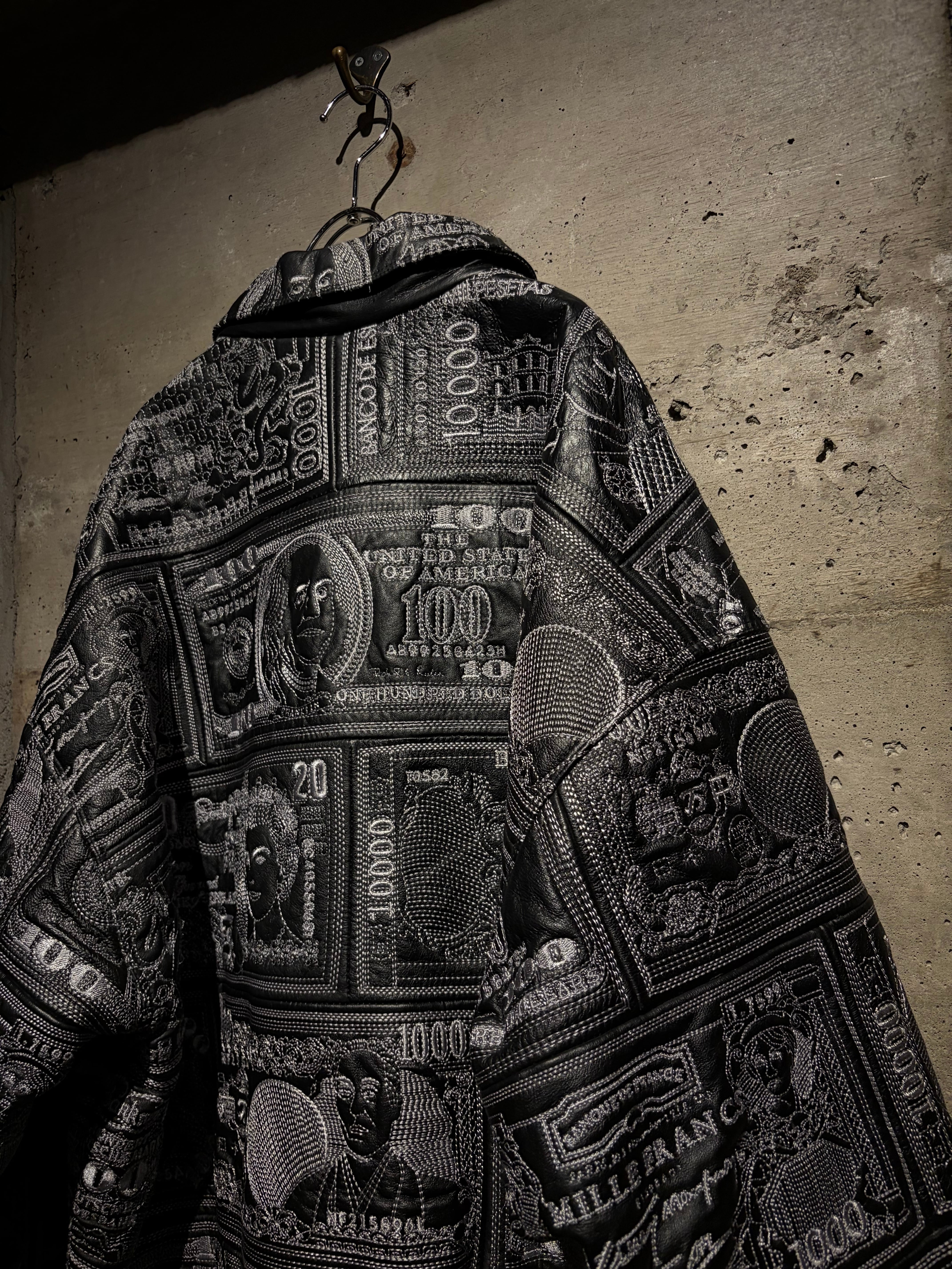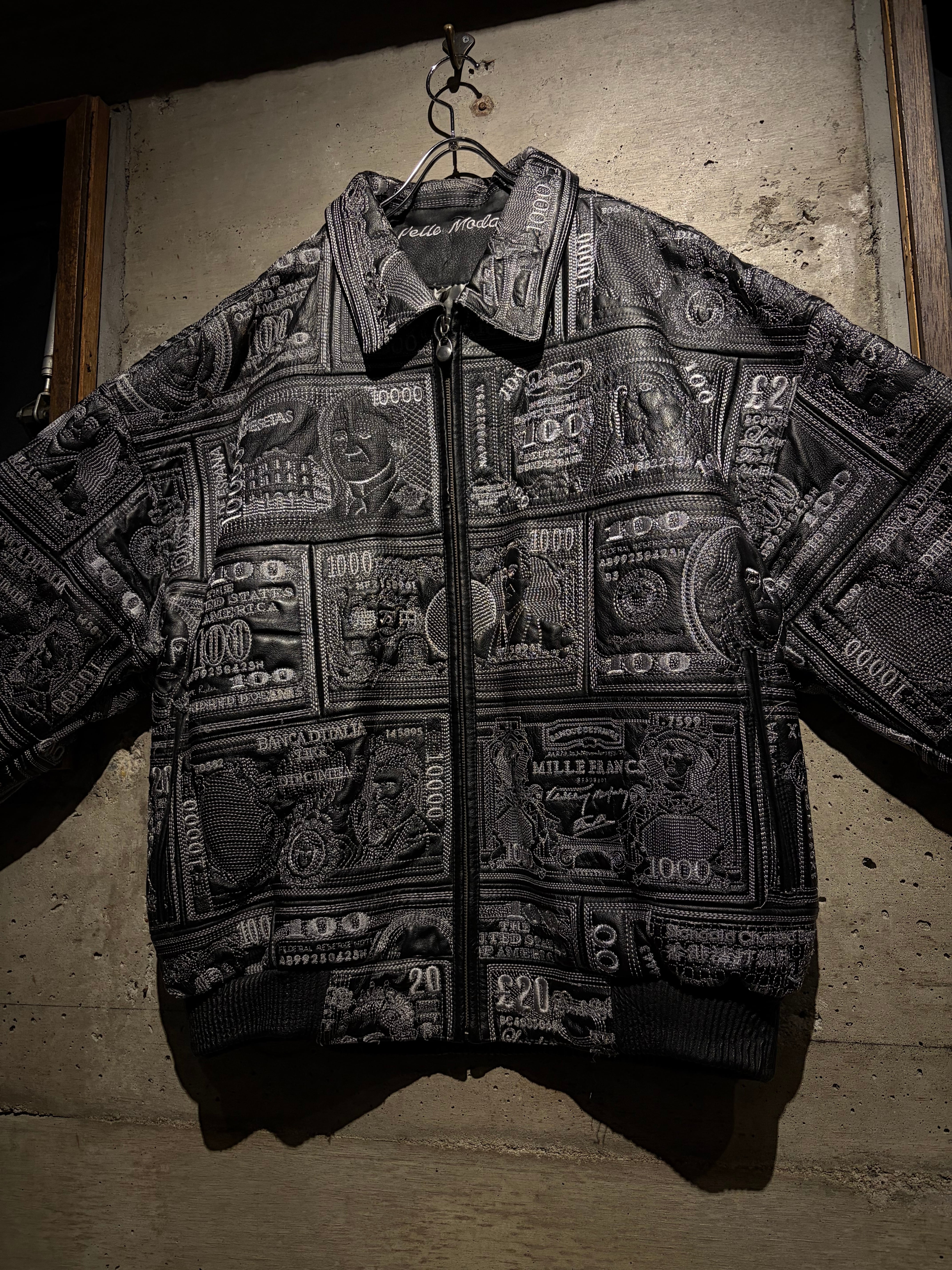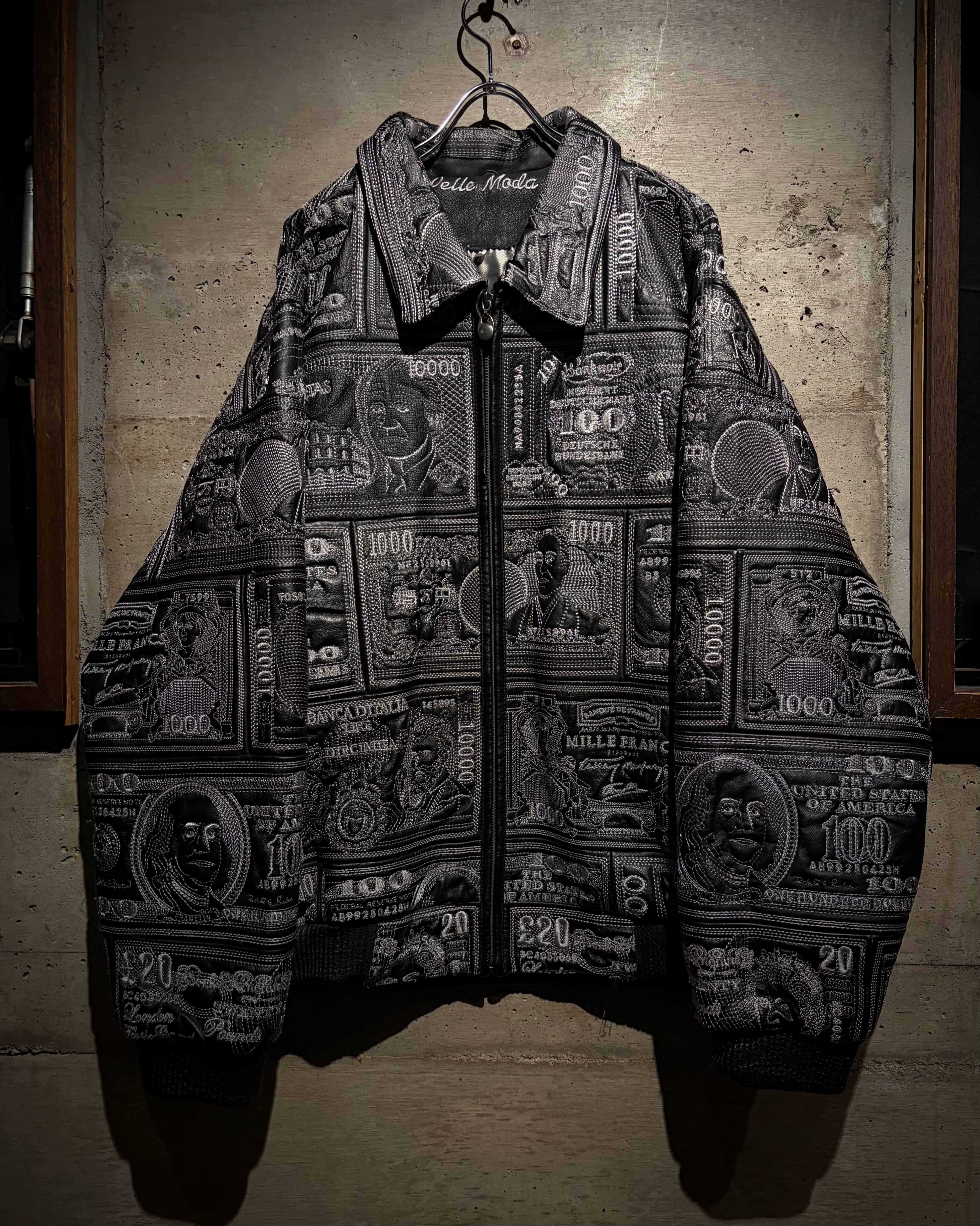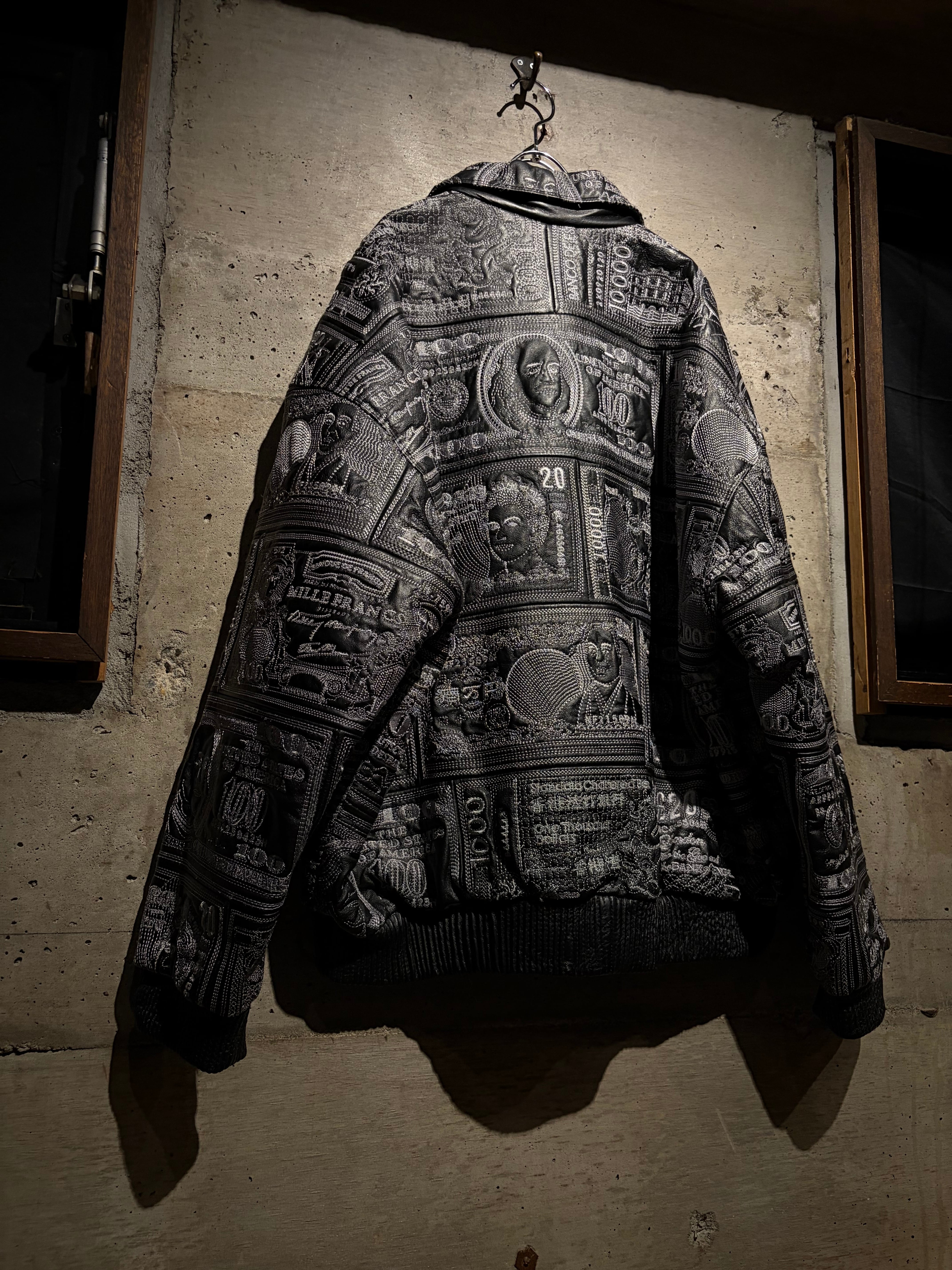しなやかさとコシを併せ持つブラックレザーのボディをキャンバスに、様々な国の紙幣のデザインを総刺繍で落とし込んだスペシャルなレザージャケット。