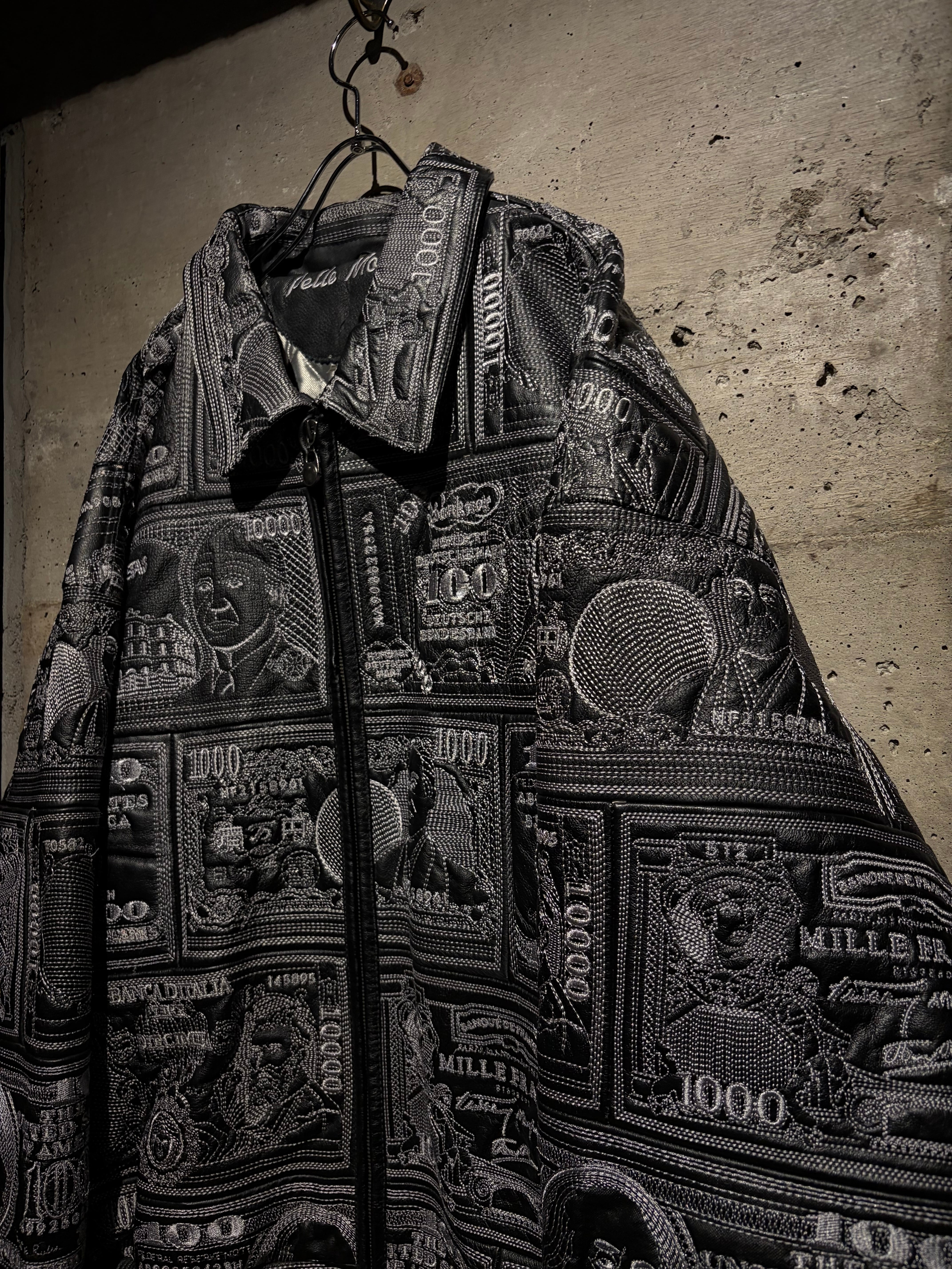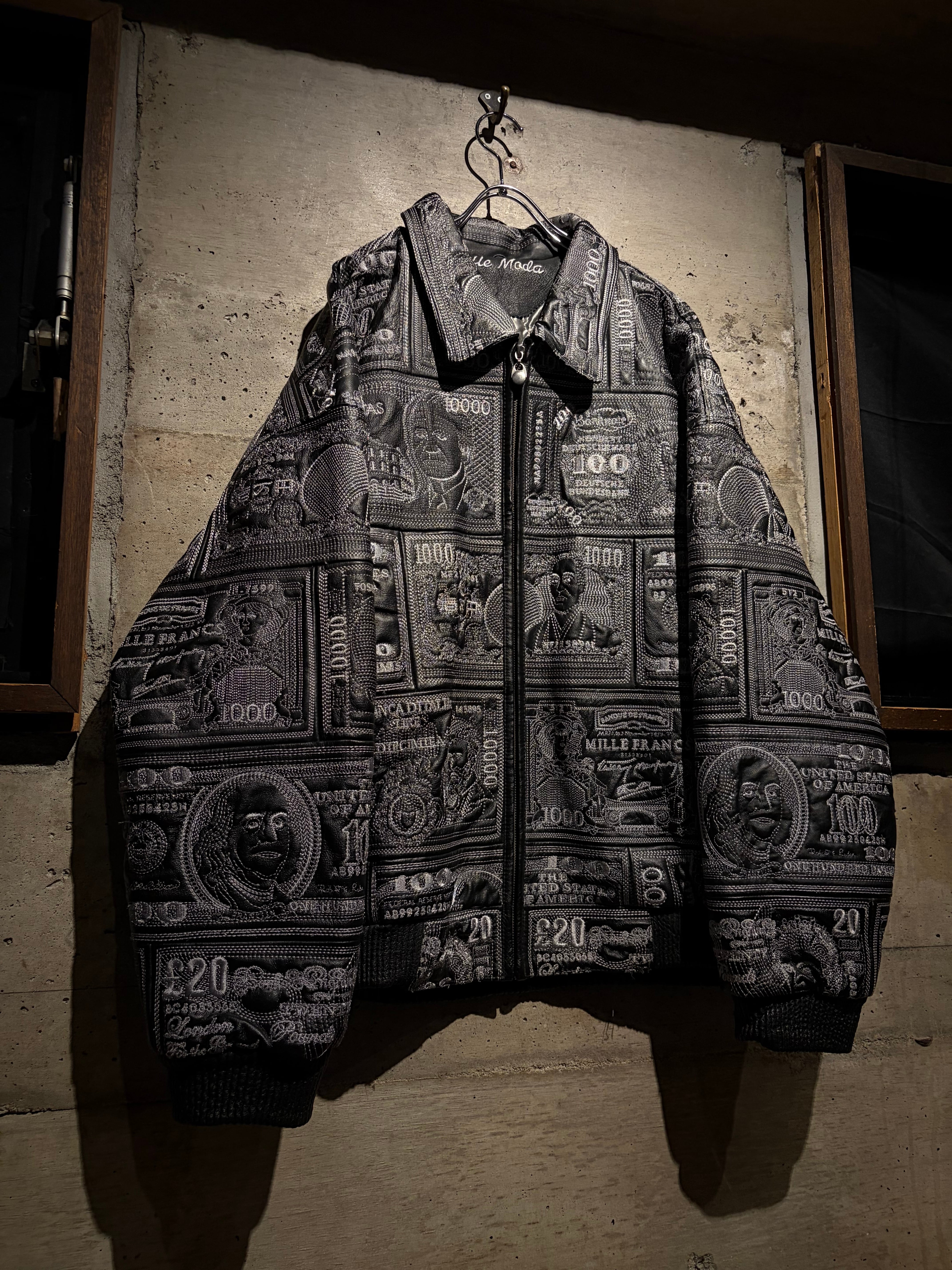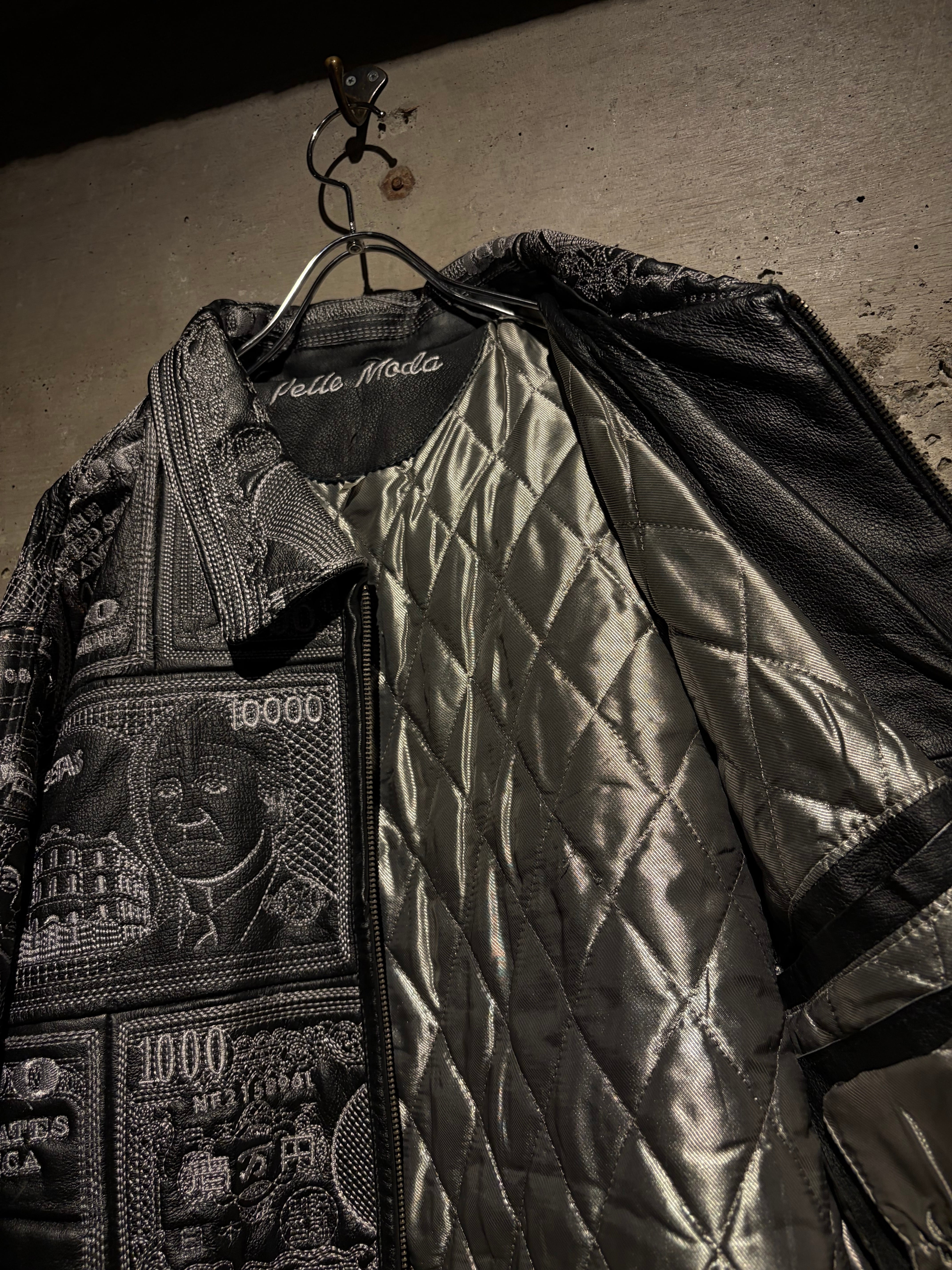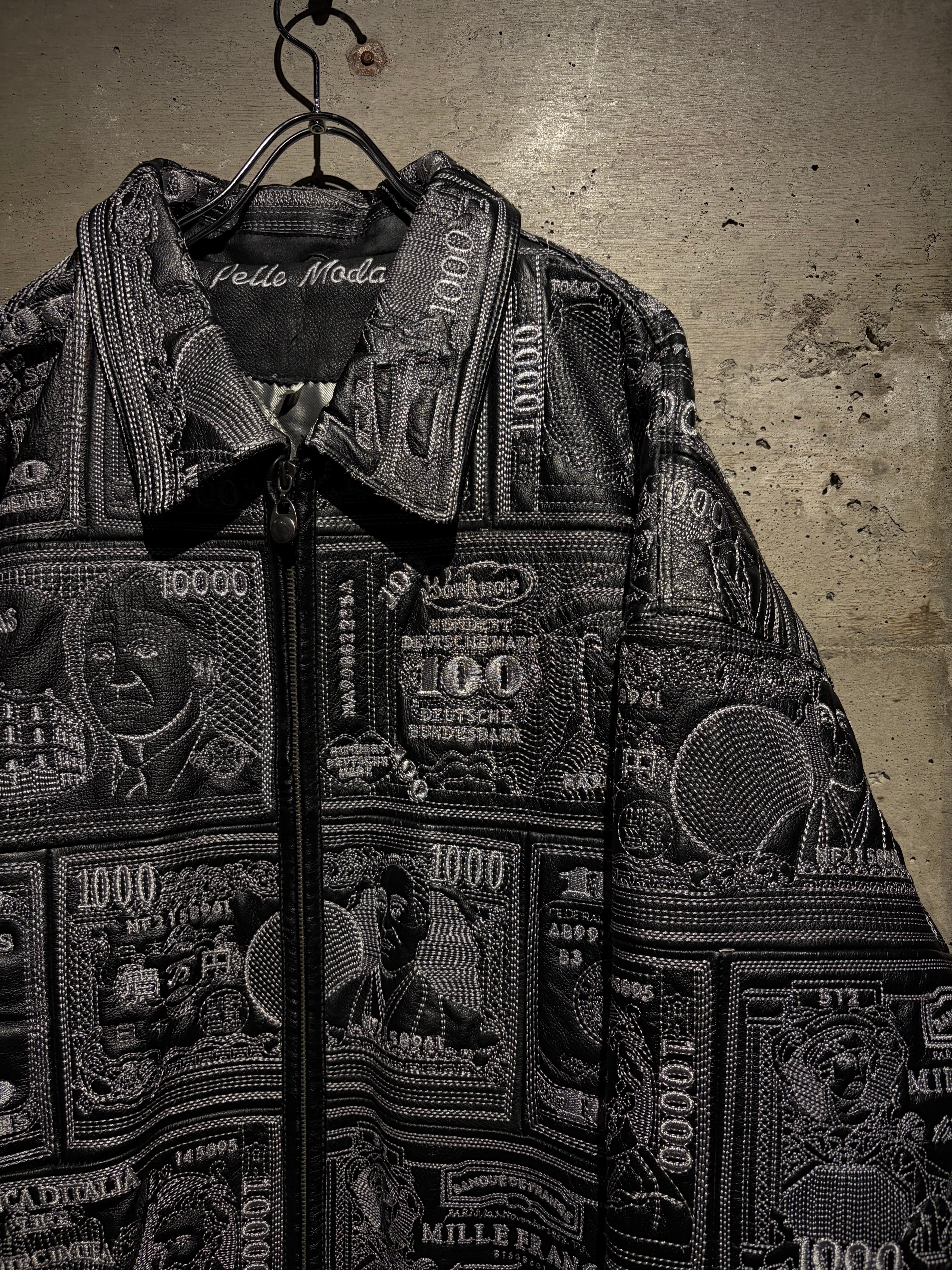 しなやかさとコシを併せ持つブラックレザーのボディをキャンバスに、様々な国の紙幣のデザインを総刺繍で落とし込んだスペシャルなレザージャケット。
