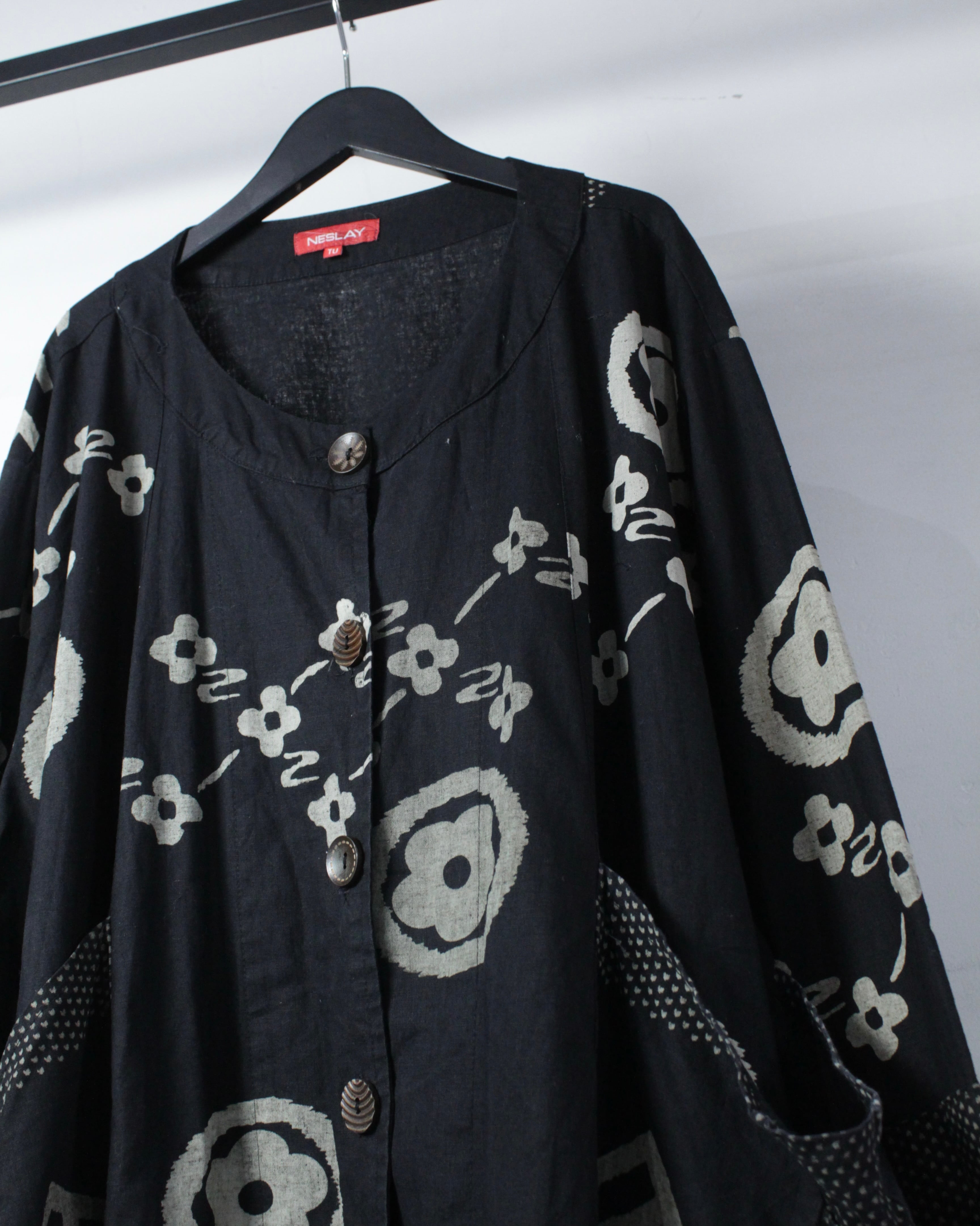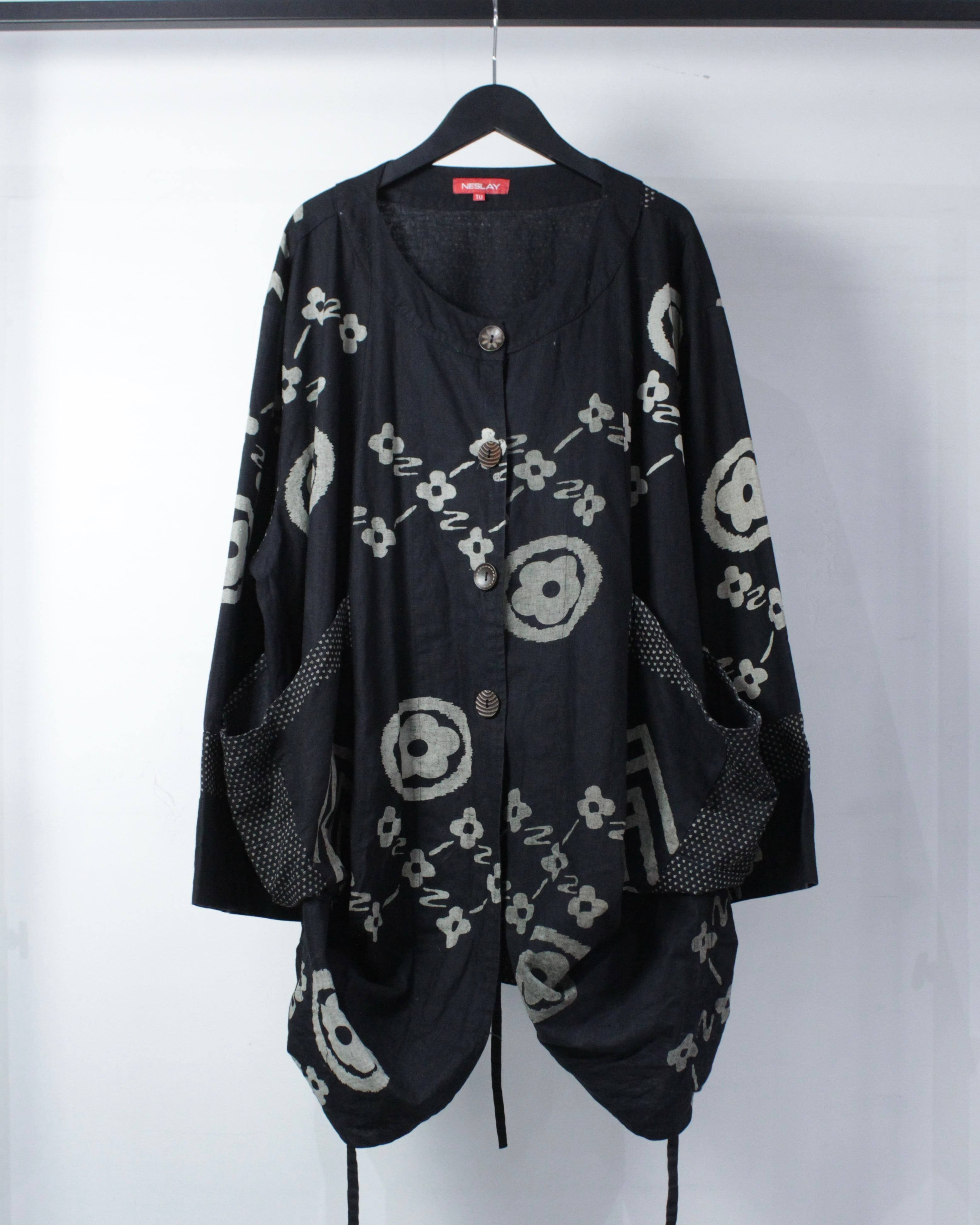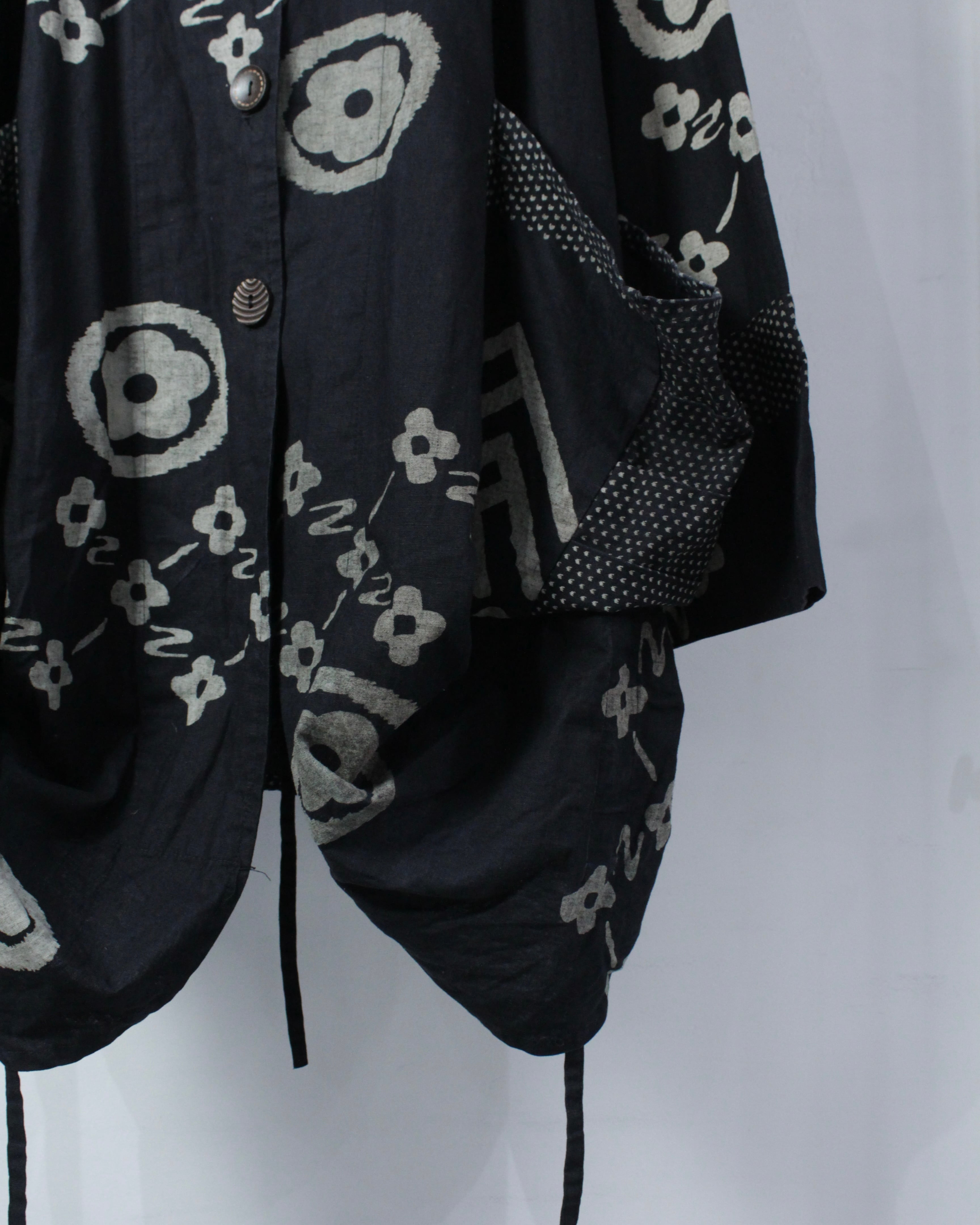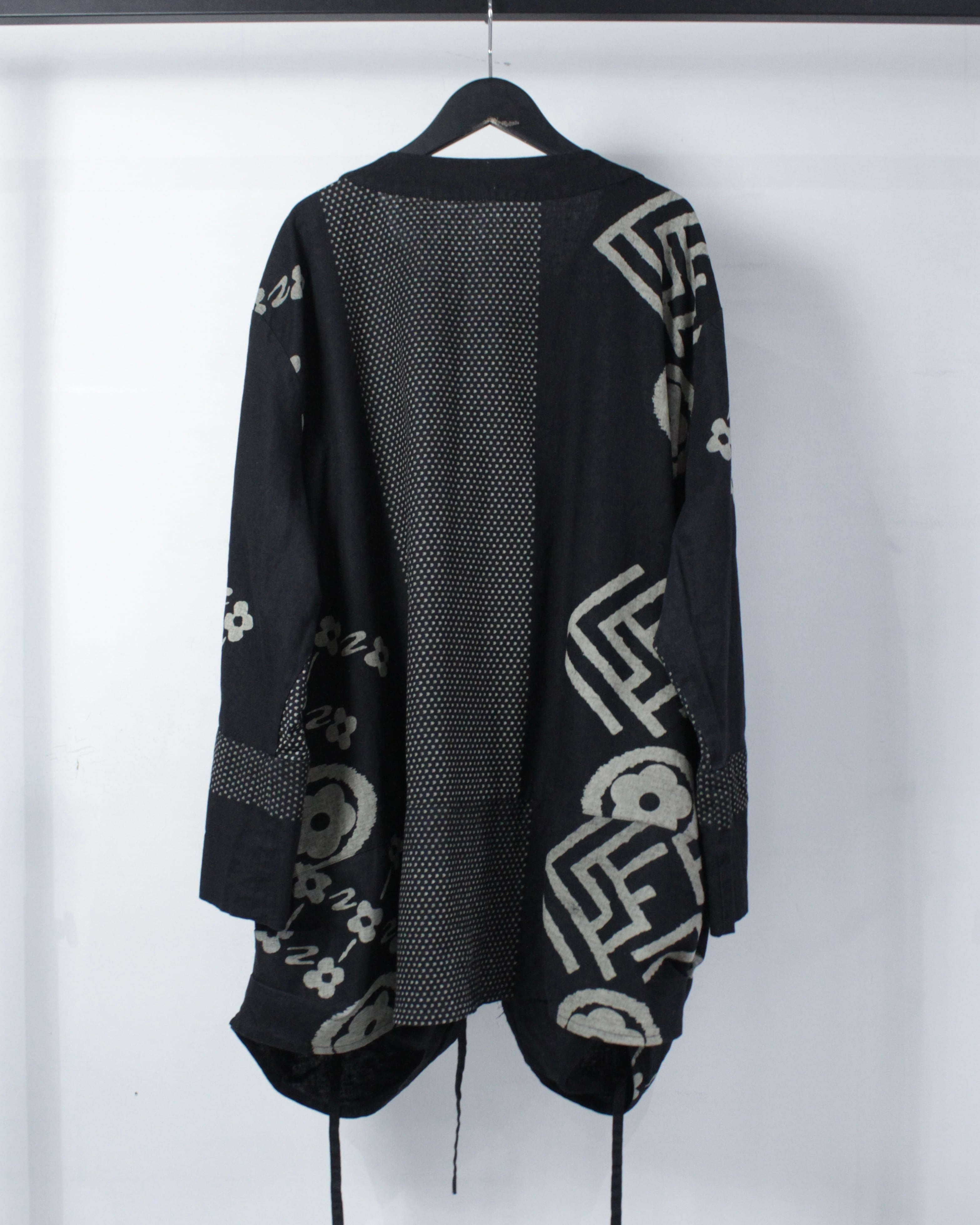 ブラックのボディに生成り調のフラワーパターンと紋様のようなデザインが映え、どこか民俗的でアート性を感じる佇まいに仕上がった1着。